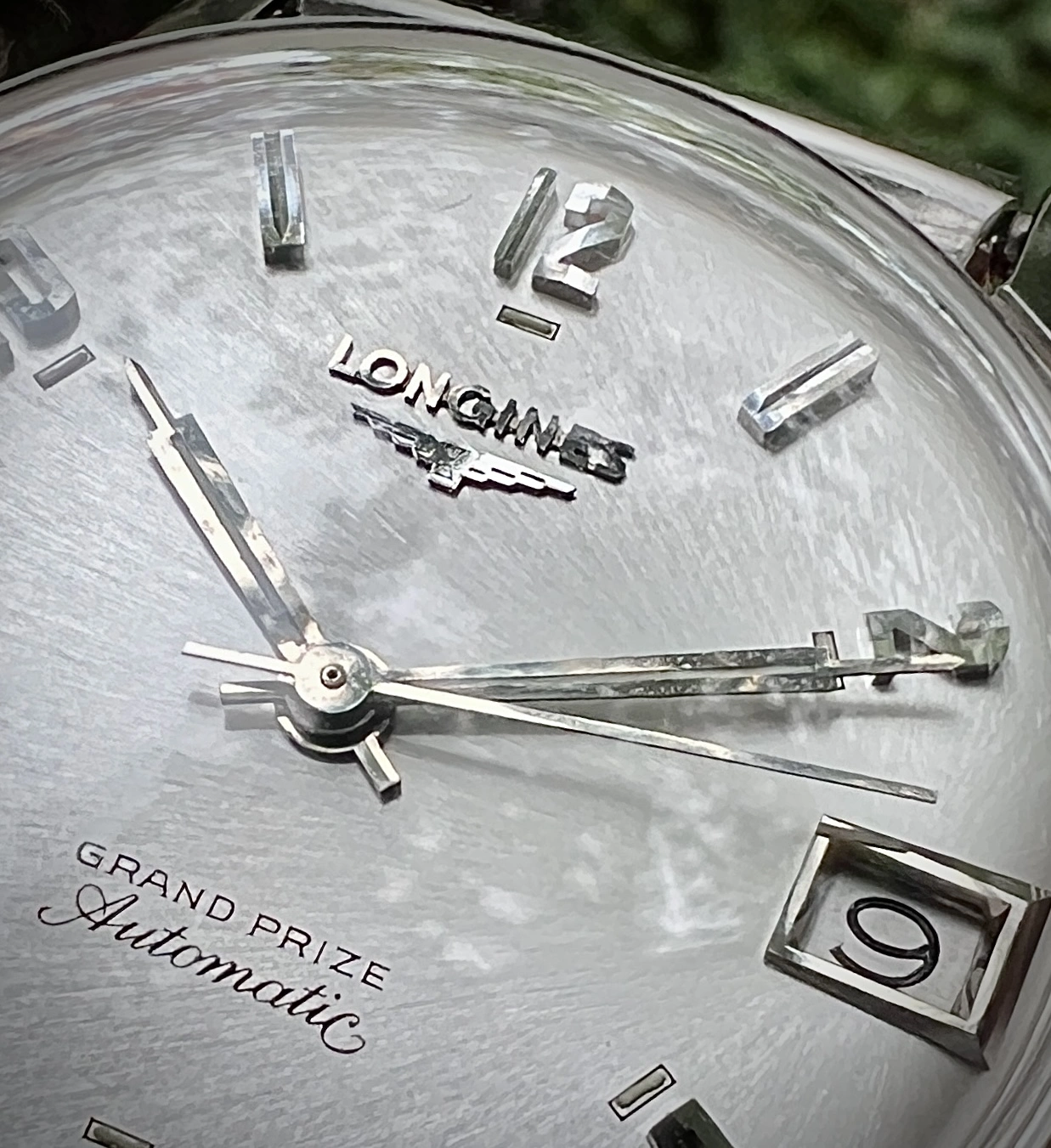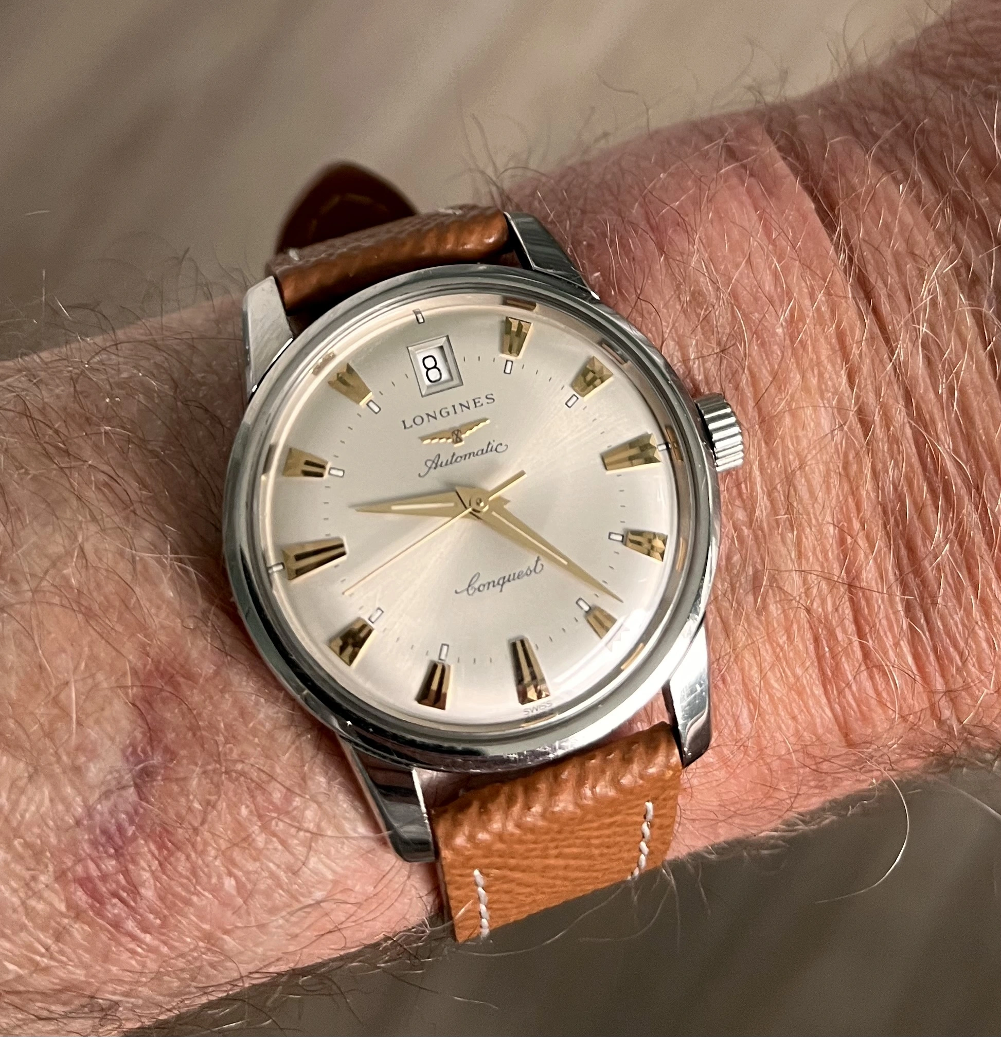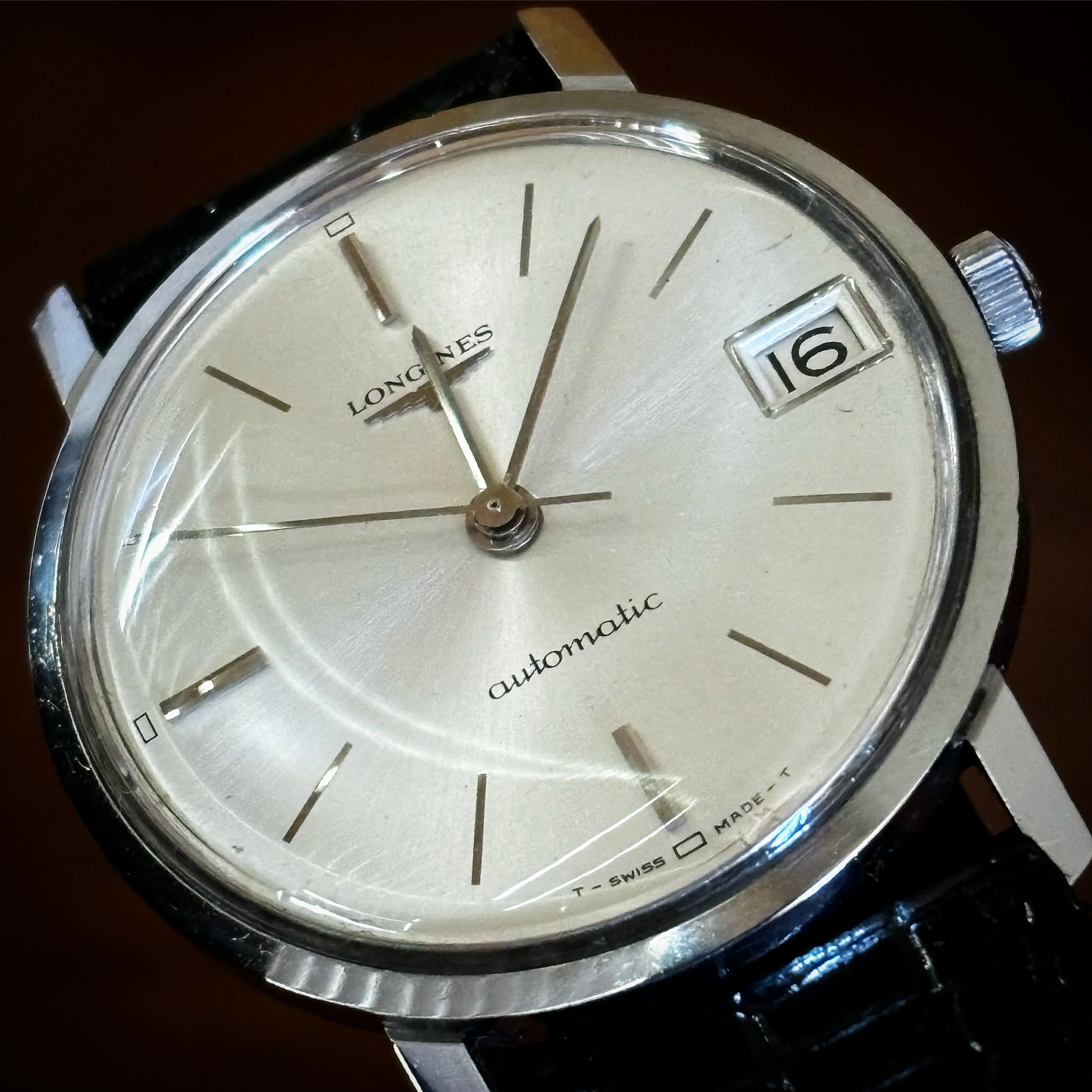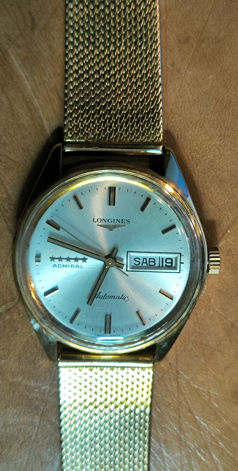 I usually alternate it with a dark brown original Longines strap with gold-plated buckle, but modern. The dial is silver, without having been retouched, and bears the mark “LONGINES”, with the anagram, below the “12”; the word “Automatic” in Embasy type, above the “6”; and 5 stars and the word ‘ADMIRAL’ at “9”. The original hands are “bastone” type and the hours also consist of golden “bastone” type indexes.