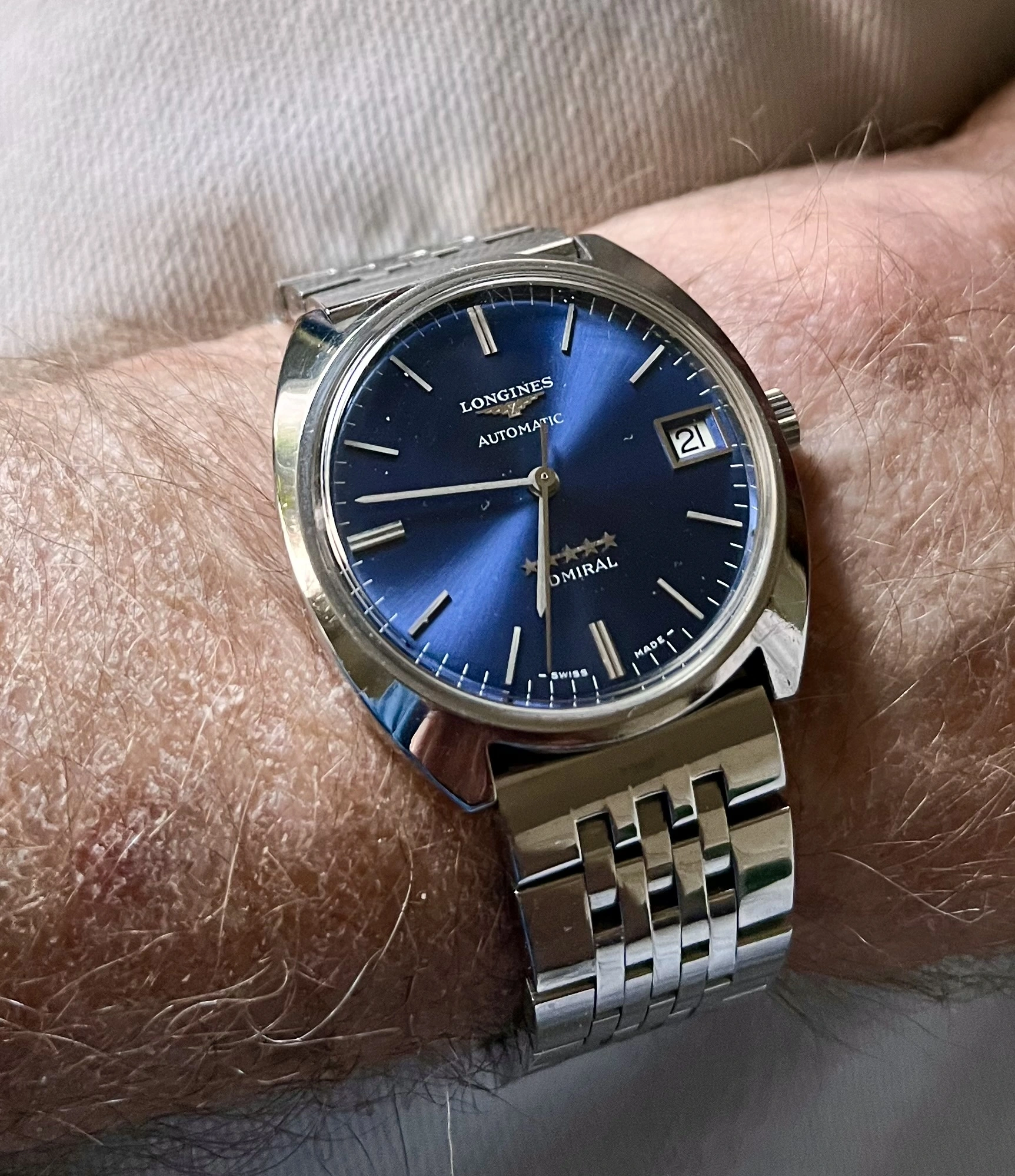 It is a Longines Admiral, model 8184A, with caliber 507 (Yeeeessssss, I know, I know, that there are Longines purists who pontificate that there are more “Longinesess” calibers, and they claim that this caliber is not as good/collectionable as the 50xx because Longines made it after the acquisition of Record and blah, blah, blah... I guess whoever says that is because they want to merit their calibers at the expense of demeriting others. Anyway...). The serial number allows us to place it at the end of 1969-1970. The caliber is a 507 (day, quickset date), 17-jewel, and original Longines, which runs at 19800 A/h and is based on a basic and previous caliber 503; it has also a power reserve of 44 hours.