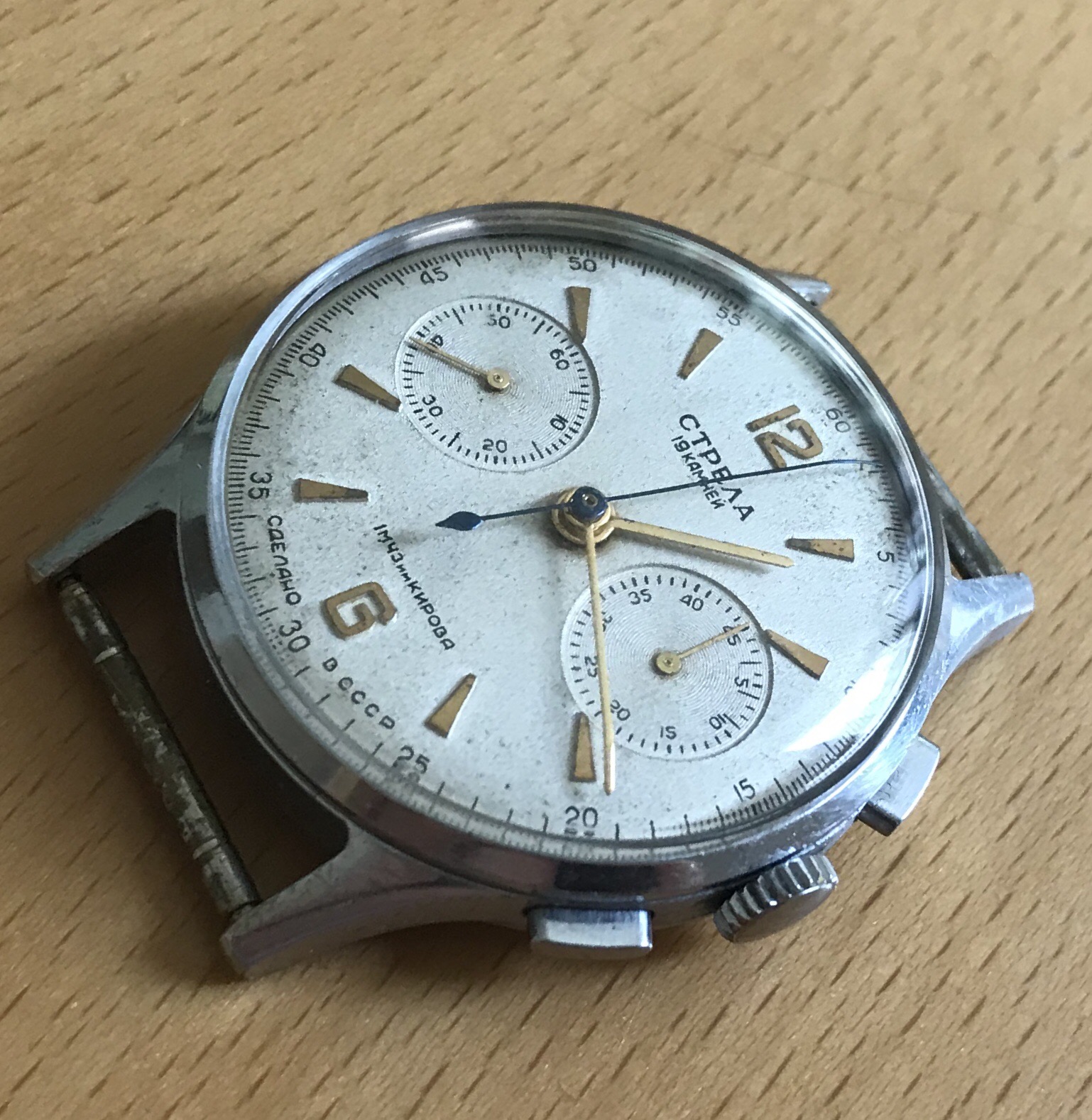 The Pobeda was as close as I could find to the first watch in space based on photos of the font and remains of the number 6. It ain't a beauty but it runs and seems period correct.