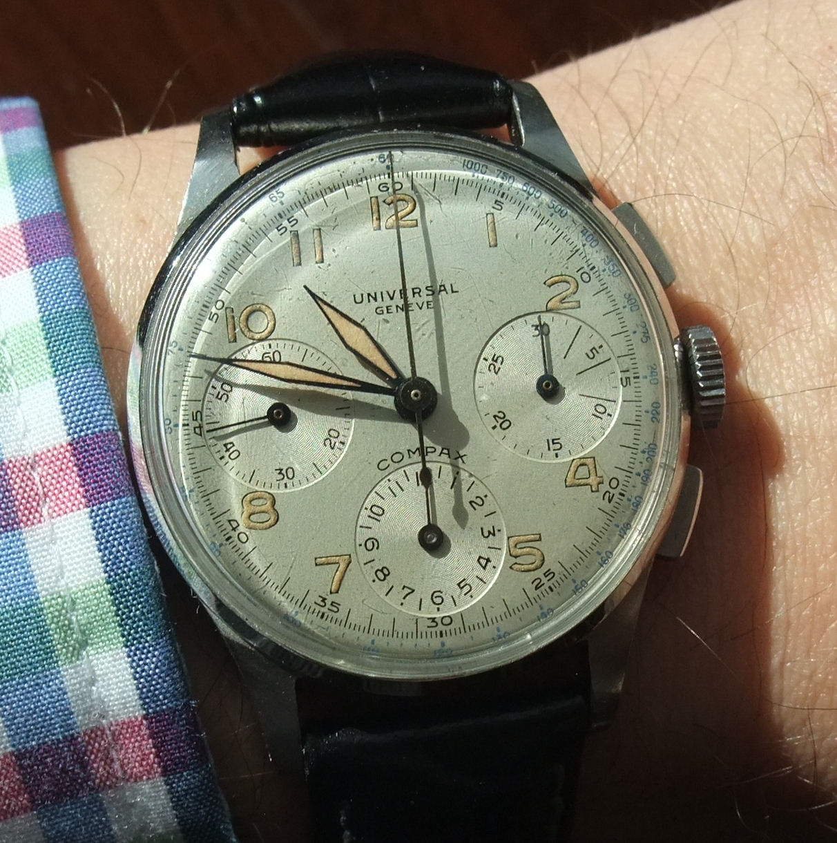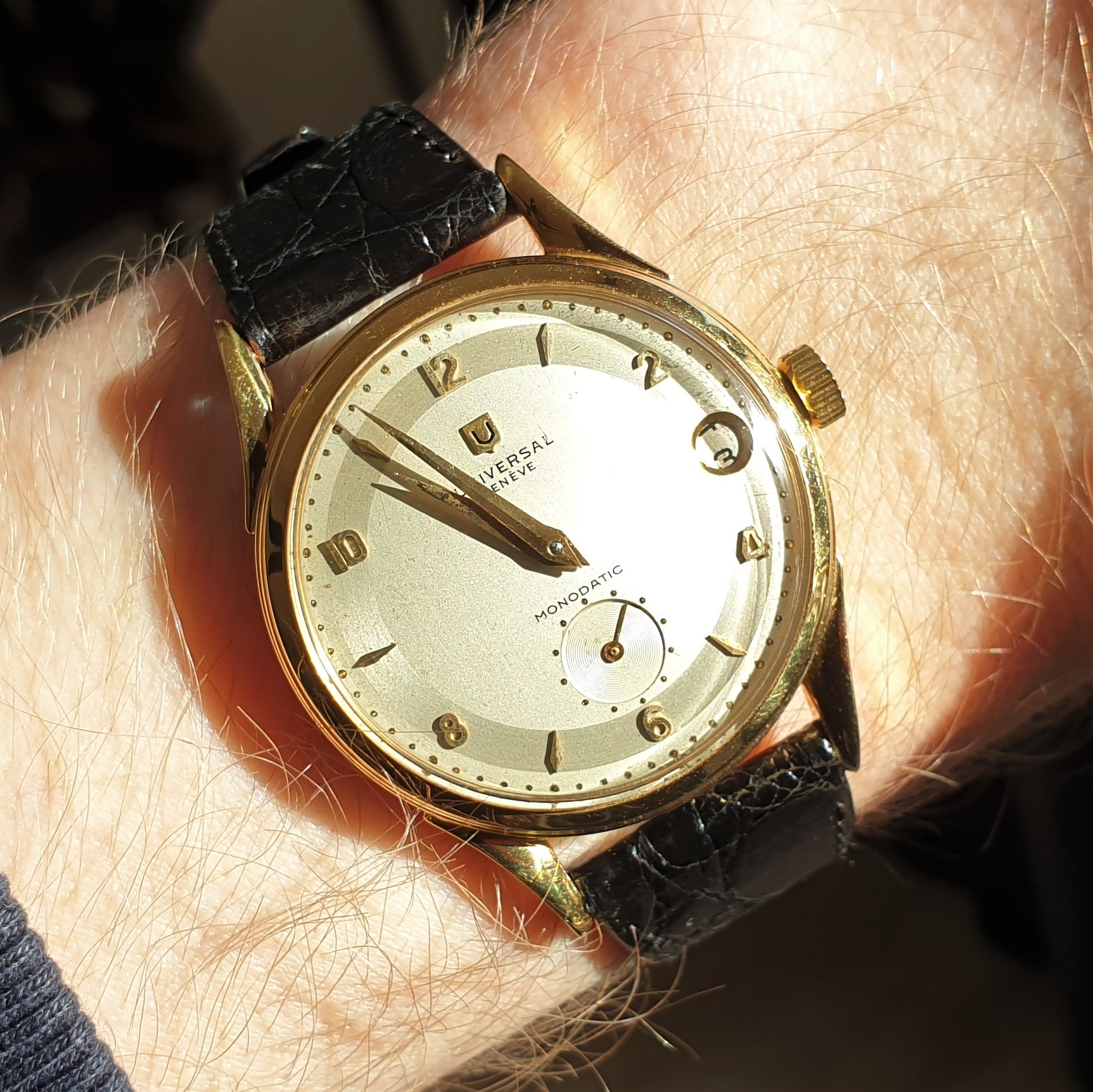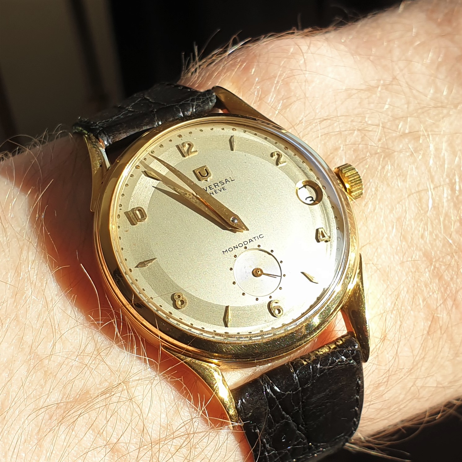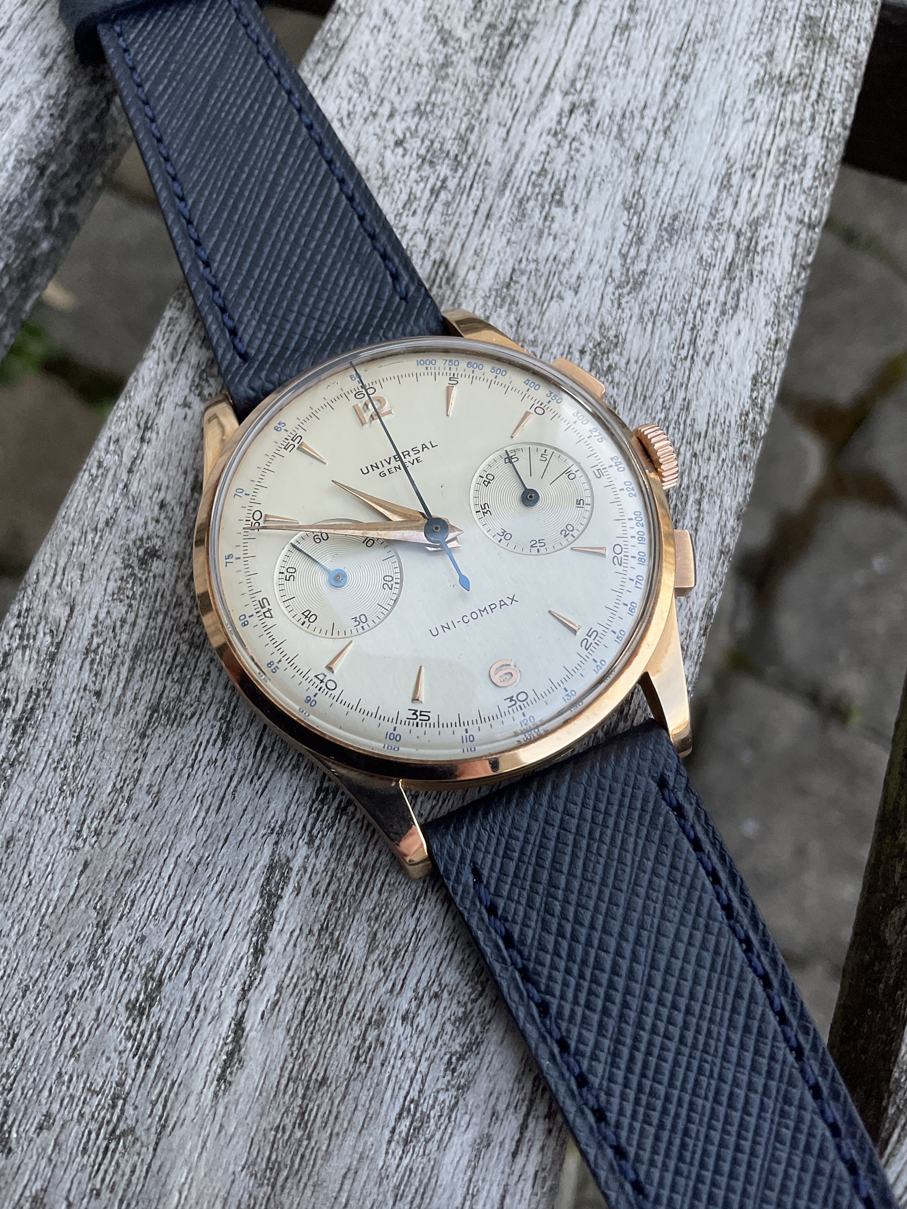 The serial on this one dates it to 1951/1952. Love the warmth of the 18k pink gold, in an oversized 37.5 mm case. As much as I love my various Tri-Compax, I have to admit it’s a pleasure to also have a piece that doesn’t require any complications to be set before strapping it onto the wrist and enjoying! Vintage Universal Geneve is simply the best.