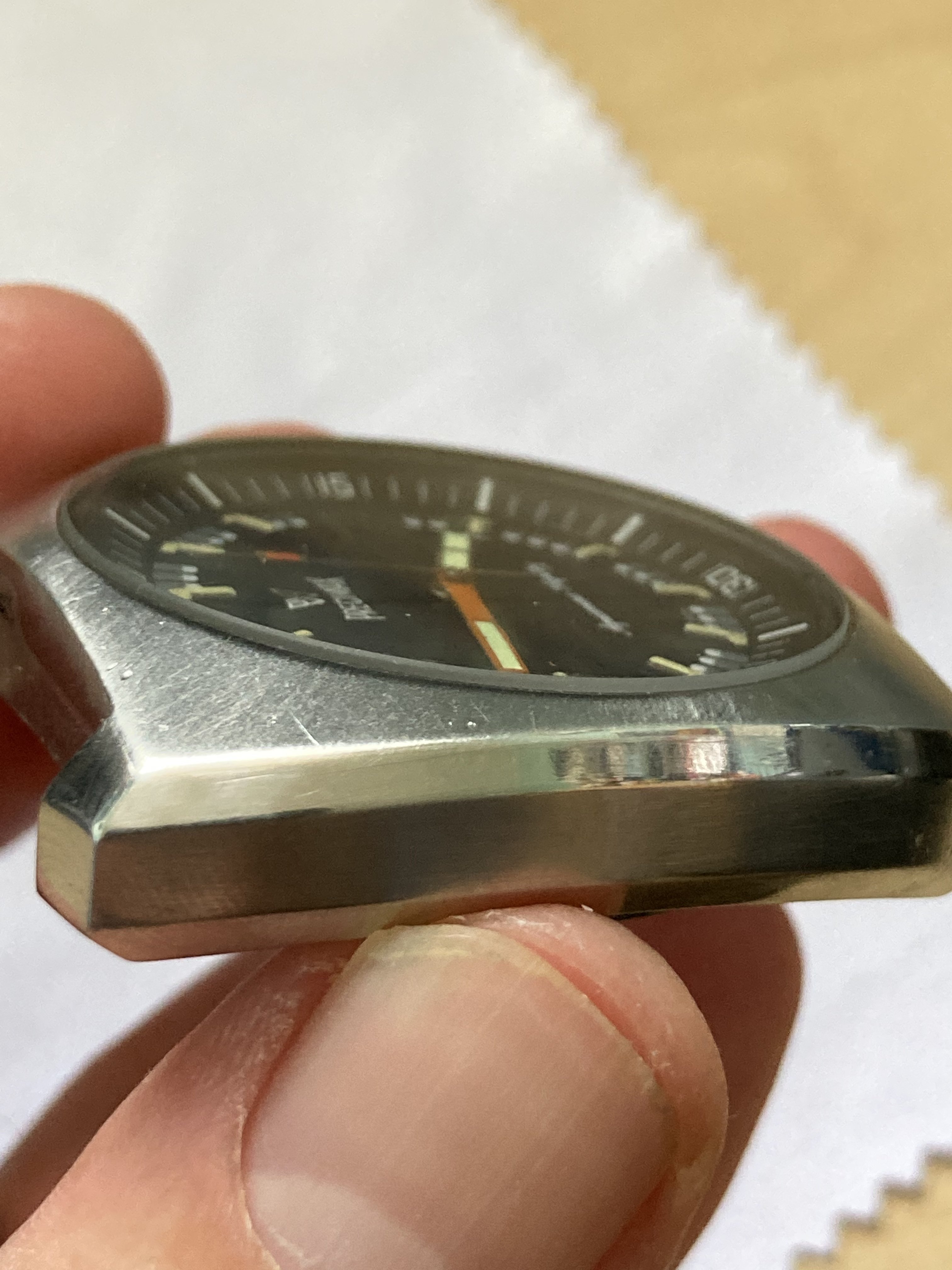 The case has a brushed finish and wear commensurate with the watch's age. However, in the hand, this is an attractive case and the dial is in excellent condition.