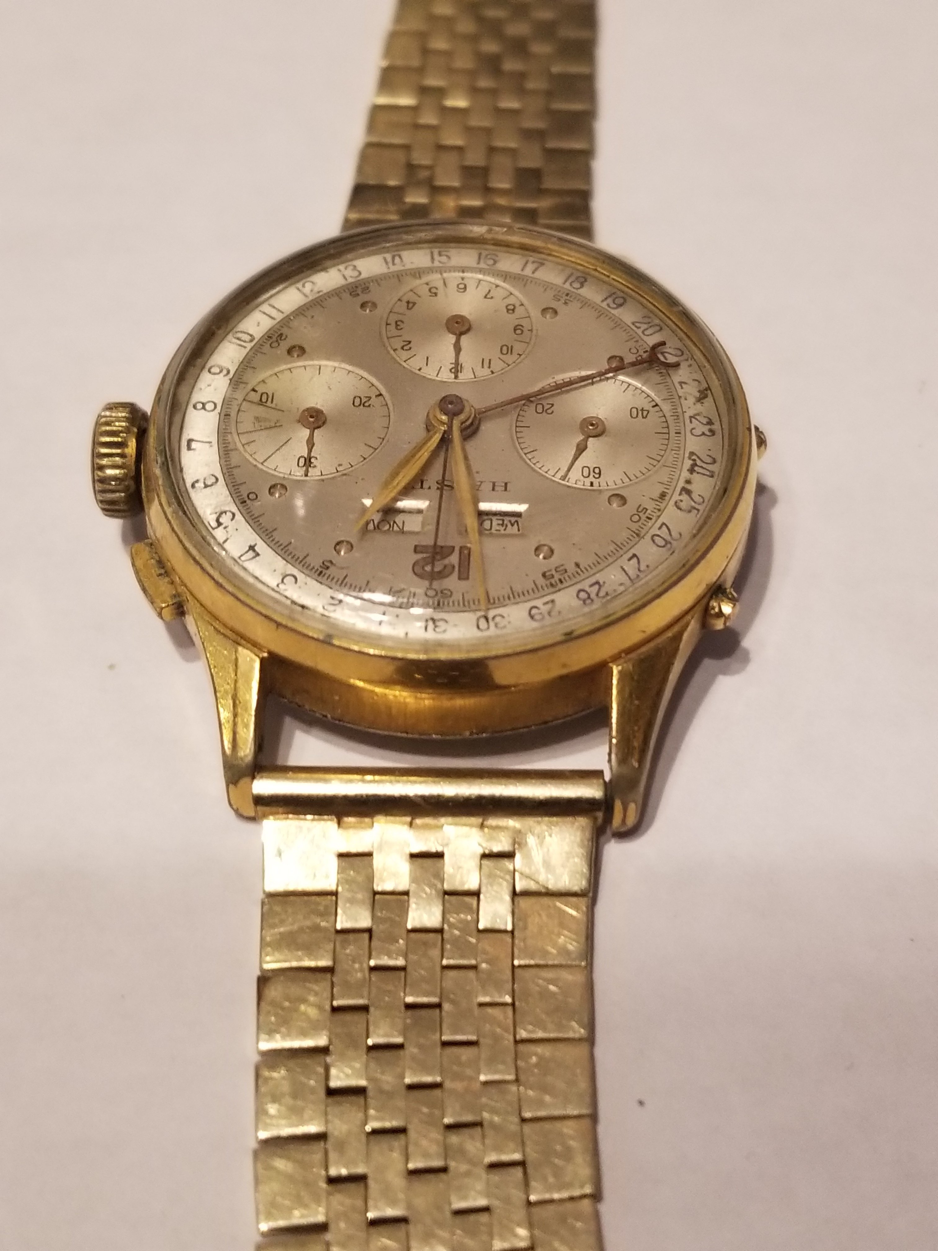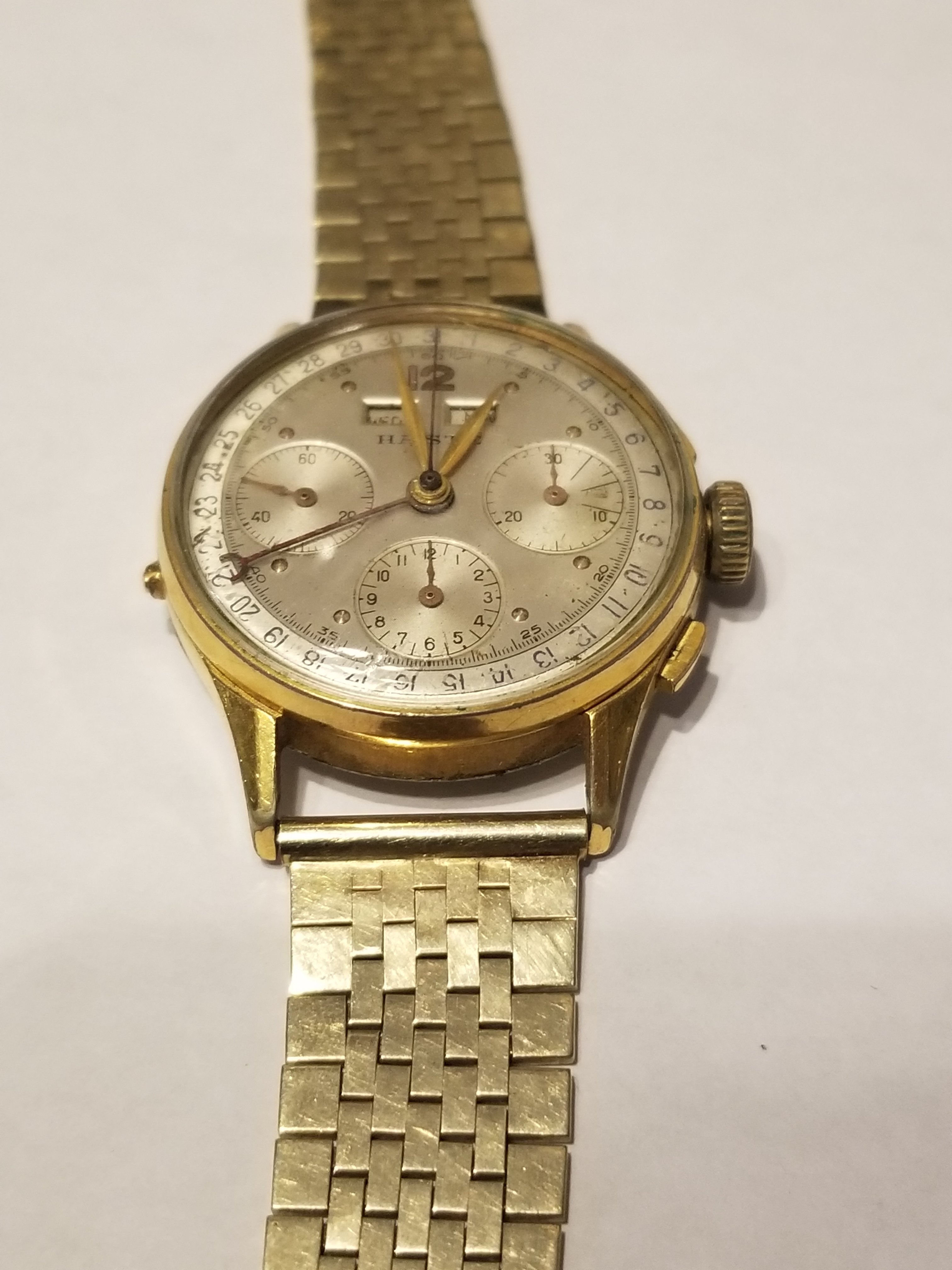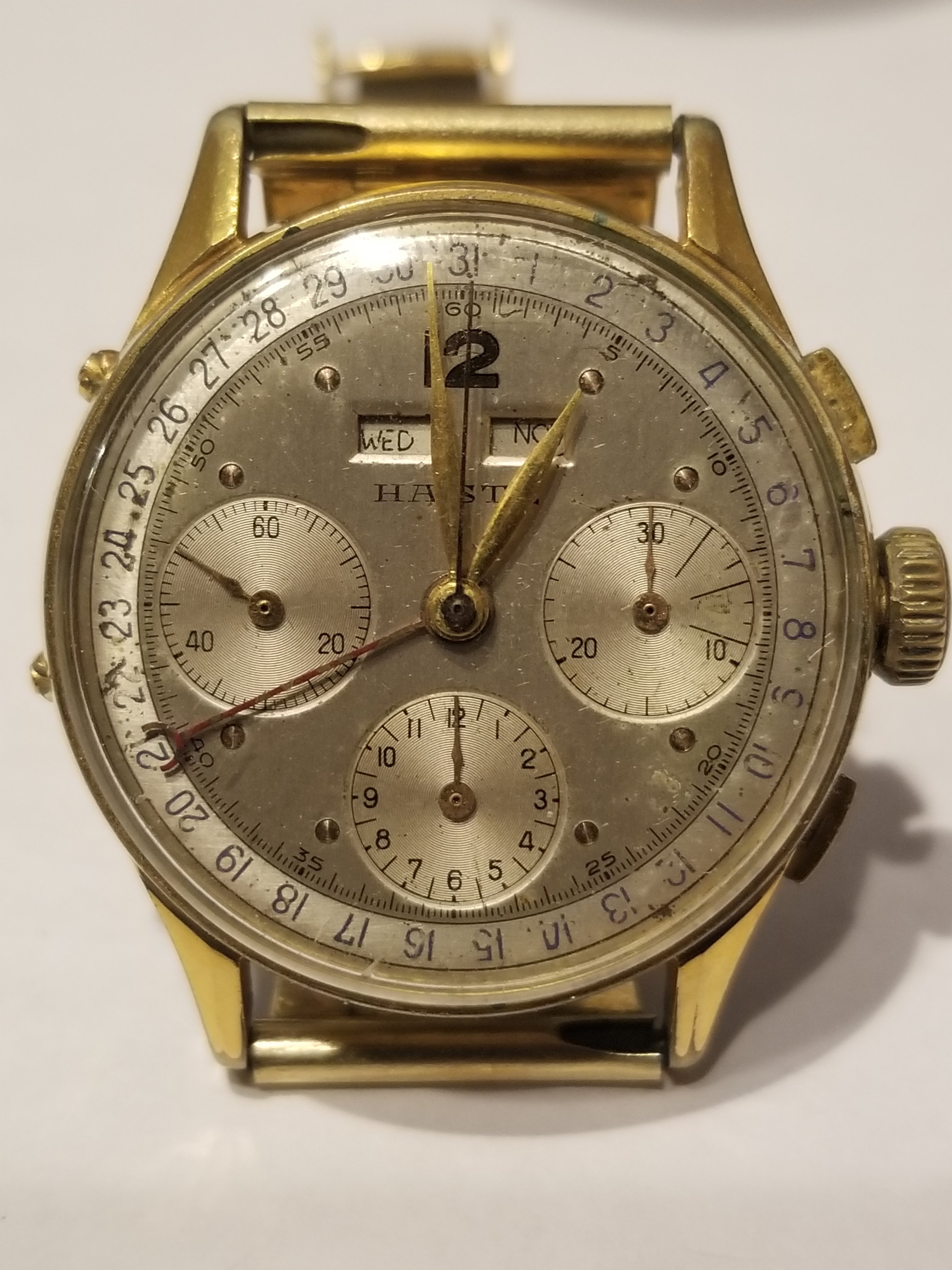 ·I hope this is the correct sub-forum for this question! I took my father's dress watch out today to give it some "exercise" and thought I'd ask some advice about it. I gave the watch, a Haste triple date chronograph with a Valjoux 72c a close look for the first time in many years and noticed several cosmetic condition issues. In addition to the cosmetics, I am wondering if I should go through the expense and effort to have it serviced even though all functions work well. First the service quandary arises from the knowledge that the watch hasn't been serviced in at least thirty years and may never have been opened since new. I wear the watch once or twice a year and I don't know how often he wore it in his lifetime. Should I have it lubed etc. if it gets so little wear? I know that watchmakers and parts are getting rarer with every passing year so that is a consideration. As for the cosmetics the plating on the case is worn on the lugs and is the base metal is visible which bothers me a little. The dial is in relatively good condition considering the age I think but I did notice that the paint of a couple numerals is flaking and is floating under the crystal. Are either of these conditions fixable? I know that "redials" affect value but would judicious touch up be a redial? Can cases be re-pated/restored? The watch will likely remain in the family as my son likes watches as well so value isn't the main consideration it is really a matter of preservation for future generations and wearability long term. As always thank you for input!
