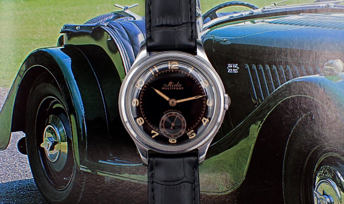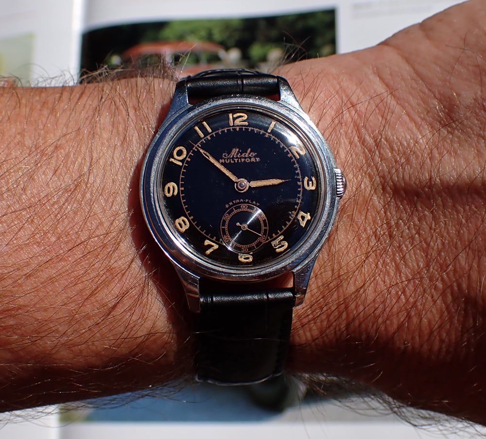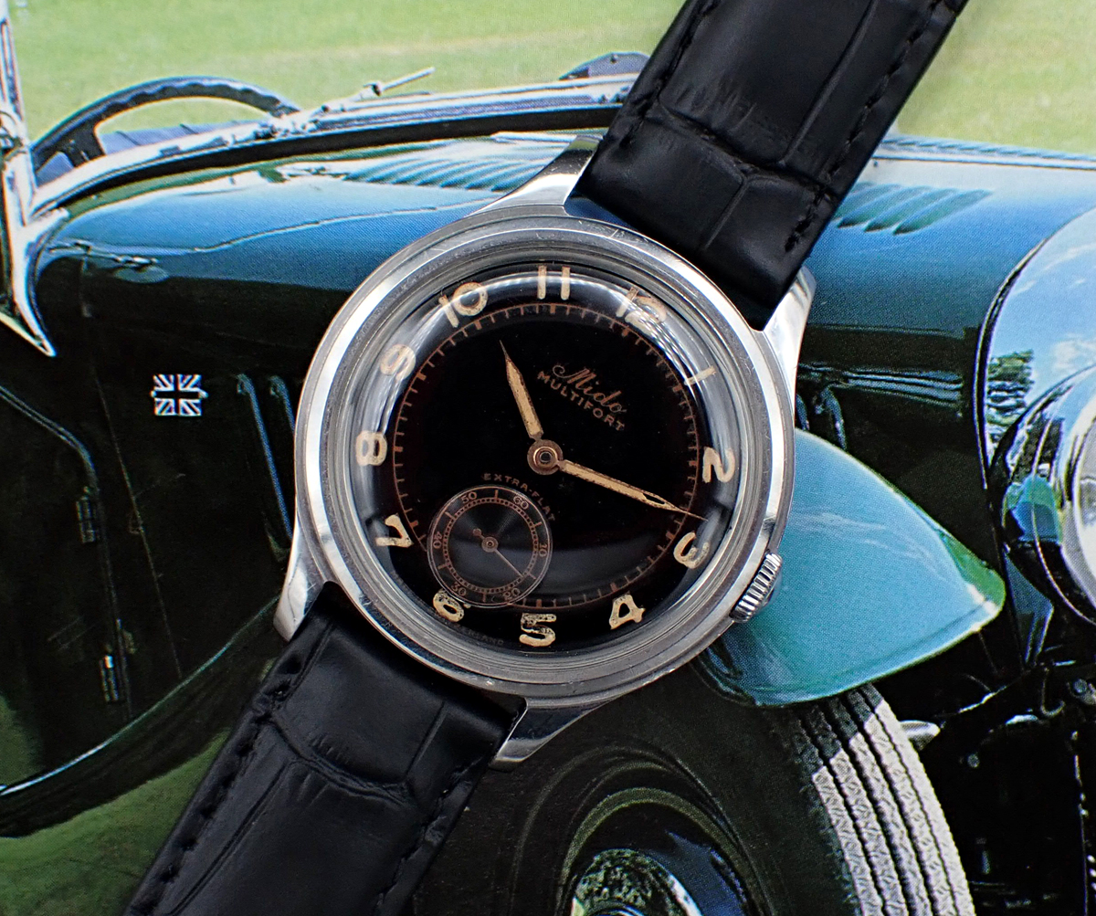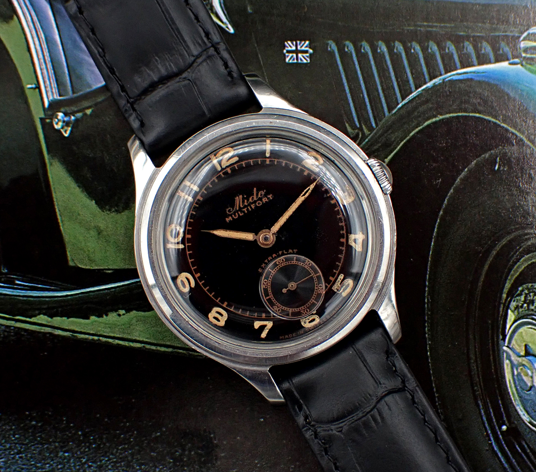 Up for sale is this handsome and uncommon 1940s-1950s Mido Multifort “Extra-Flat” manual winder with wonderful original gloss black dial in classically sized 34.5mm all-steel FB/Taubert et Fils case. This cool Multifort “Extra-Flat” also features an all-stainless steel screwed case manufactured by the famed case makers, FB/Taubert et Fils, which also made cases during this era for Patek Phillipe, Vacheron and Movado. This lovely midcentury Mido is powered by their high quality caliber 1200A with three adjustments. But the main attraction is the glossy black sub-seconds dial with “copper gilt” print and original radium radially positioned Arabic numerals showing lovely patina. Overall, this great little Mido is in Very Good unpolished vintage condition with a black dial that really pops on the wrist and a wearable size that a lot of vintage Midos don’t possess (it’s the same diameter as a Rolex Date, for comparison). A really nice bit of genuine vintage style & quality for not a lot of money in today’s market.