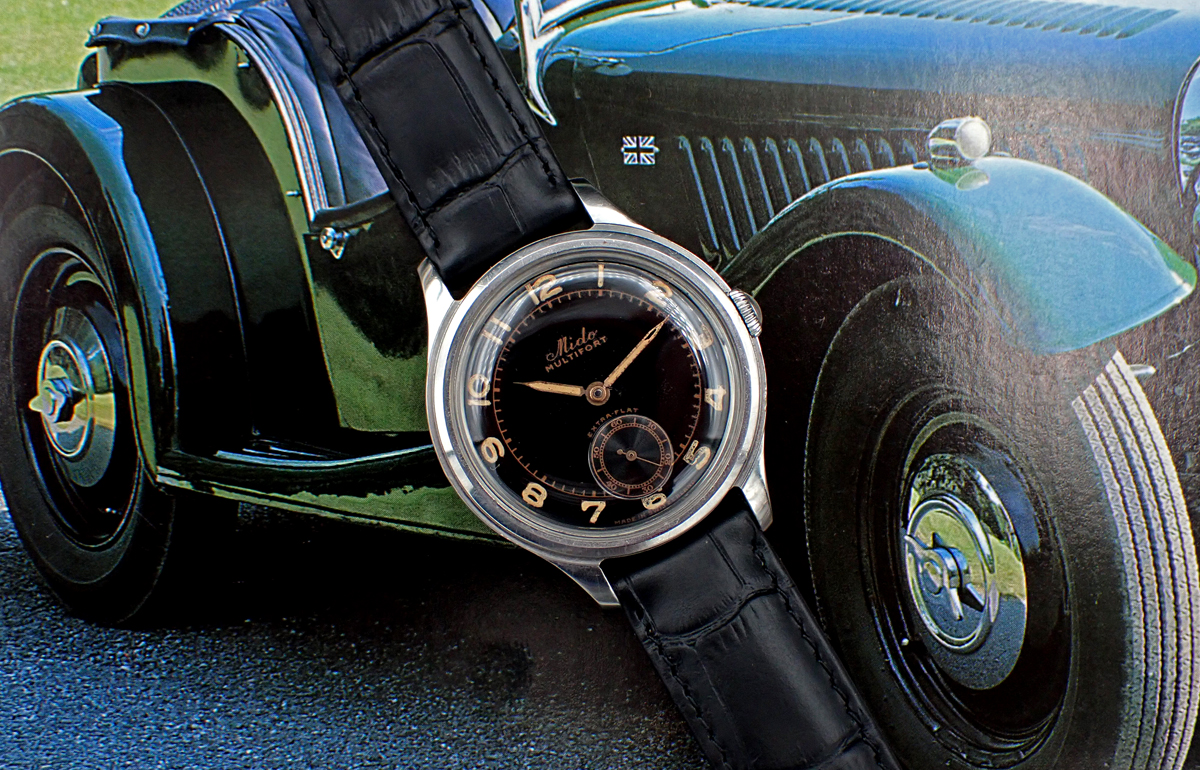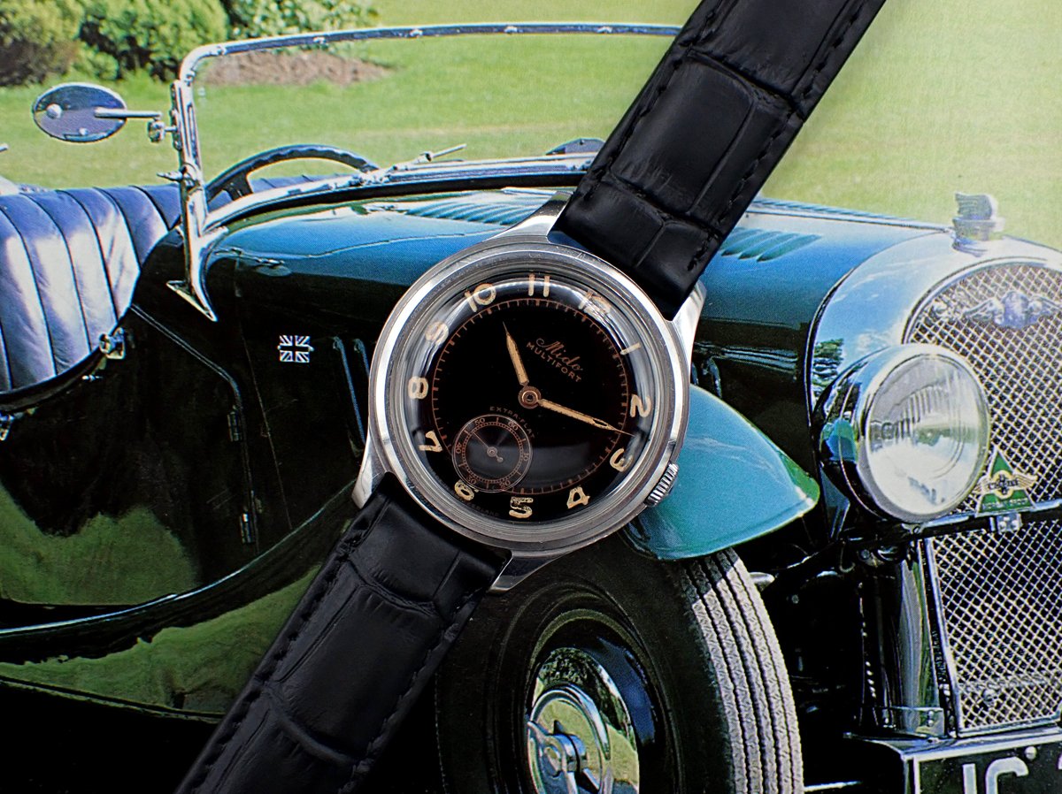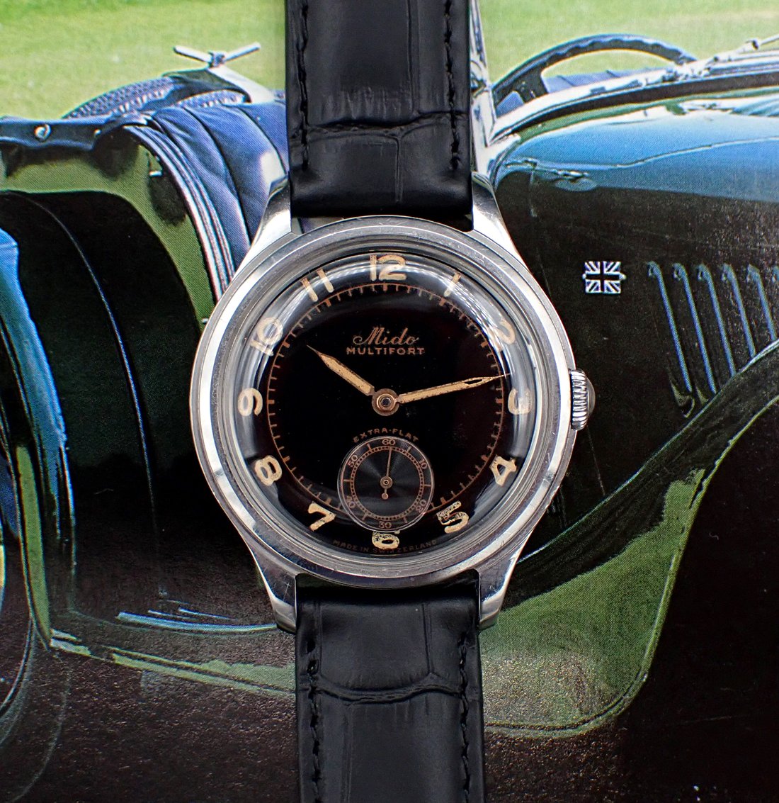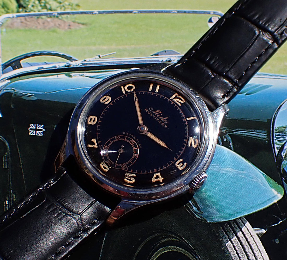 Up for sale is this handsome and uncommon 1940s-1950s Mido Multifort “Extra-Flat” manual winder with wonderful original gloss black dial in classically sized 34.5mm all-steel FB/Taubert et Fils case. This cool Multifort “Extra-Flat” also features an all-stainless steel screwed case manufactured by the famed case makers, FB/Taubert et Fils, which also made cases during this era for Patek Phillipe, Vacheron and Movado. This lovely midcentury Mido is powered by their high quality caliber 1200A with three adjustments. But the main attraction is the glossy black sub-seconds dial with “copper gilt” print and original radium radially positioned Arabic numerals showing lovely patina. Overall, this great little Mido is in Very Good unpolished vintage condition with a black dial that really pops on the wrist and a wearable size that a lot of vintage Midos don’t possess (it’s the same diameter as a Rolex Date, for comparison). A really nice bit of genuine vintage style & quality for not a lot of money in today’s market.