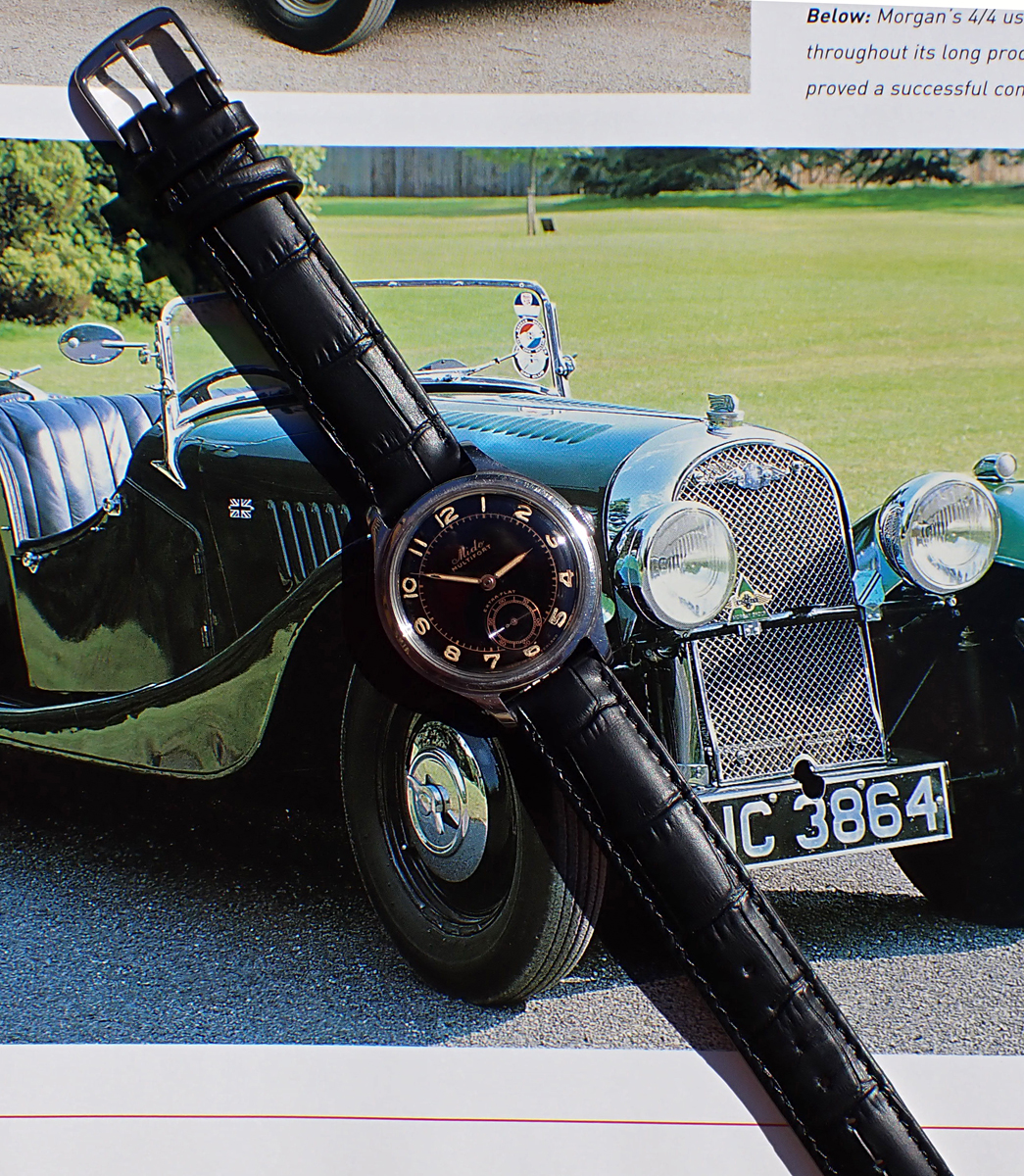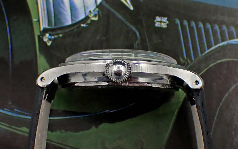 STRAP: This cool Multifort comes on a new generic black leather band with croc pattern and unsigned steel buckle. Interestingly, this watch takes straps with 16mm ends, which cleverly makes it "wear bigger."