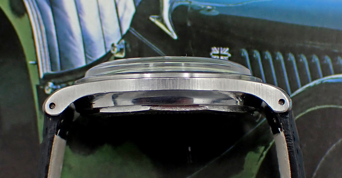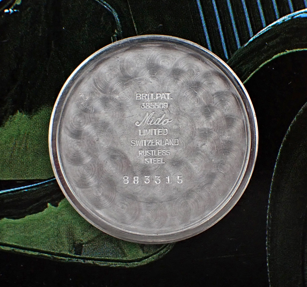 CASE & CASEBACK: The two-piece, all-steel screwback case measures 34.5mm wide not including crown x 41mm long and only 10mm thick to the top of the crystal, living up to its Extra-Flat moniker. The FB/Taubert et Fils-manufactured case features downward, sweeping lugs that taper to 16mm, adding to the impression of a larger watch, as well as a characteristic recessed “mushroom” crown and substantial screw back. It shows no polish that I can detect, as evidenced by the facets on the formed bezel, the sharp vertical brushing of the sides and the undistorted lug holes. The watch has clearly been worn in its long life and has acquired some minor nicks and dings through the years - still Very Good overall vintage condition. The polygon-style water resistant screw-in case back shows some scrapes and scratches - likewise Very Good external cosmetic condition. All the litany of period exterior nomenclature is super crisp and present and the inner caseback is corrosion-free and also has all the correct Mido hallmarks of the era. Additionally, the number stamped between the "6" lugs matches the last four digits inside the caseback.