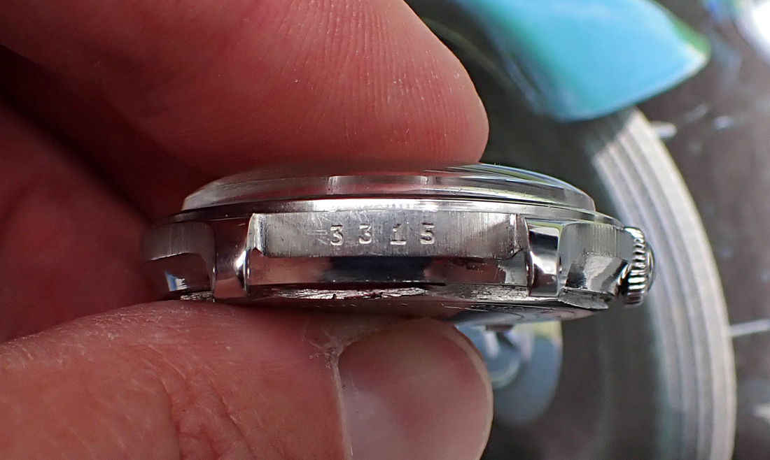 CROWN: Original recessed, broad "mushroom" knurled crown is Very Good with only some light marks. These sorts of crowns are characteristic of FB cases and make winding and time-setting very easy. It does both of those jobs exactly as designed.