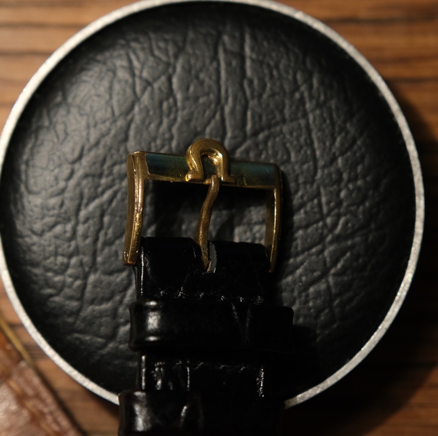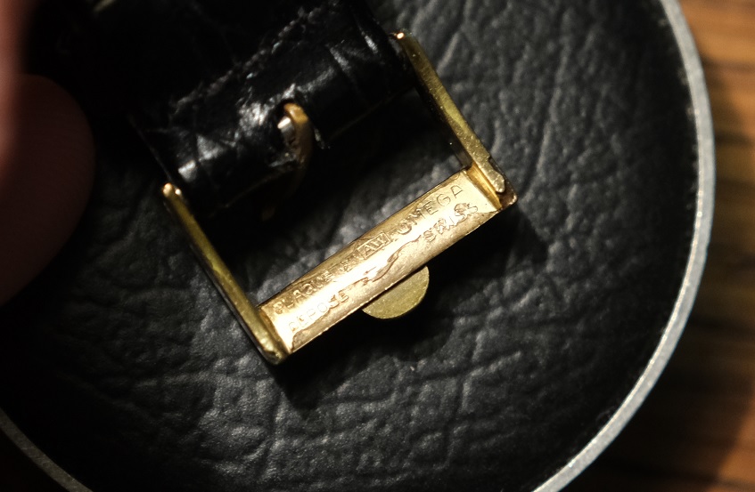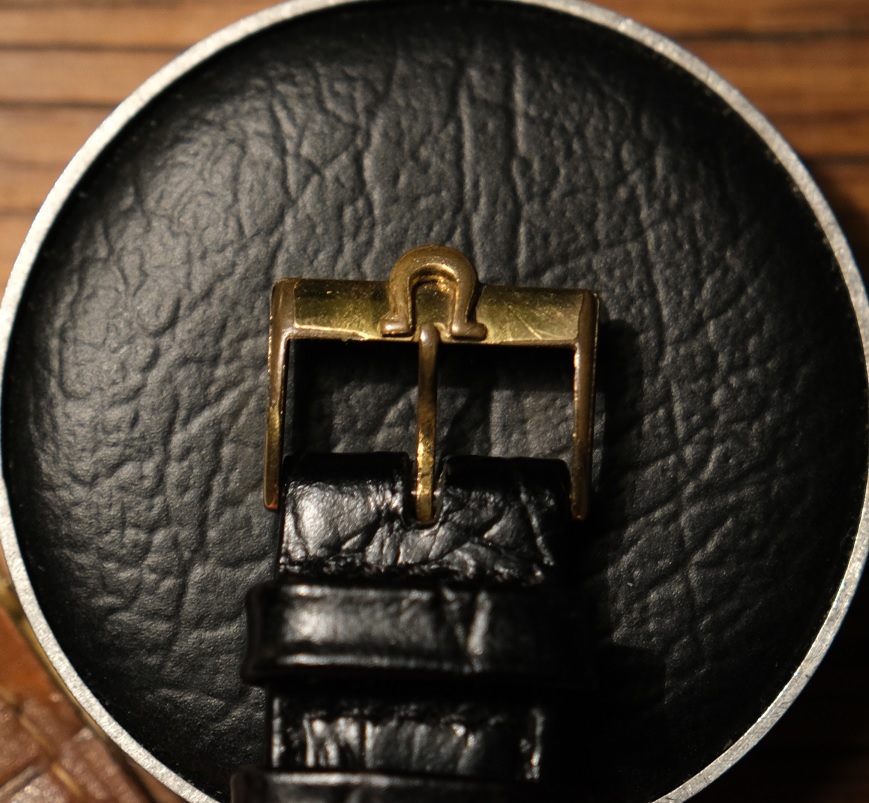 Bracelet: Mint original Omega black leather strap with a vintage gold plated Omega buckle.
