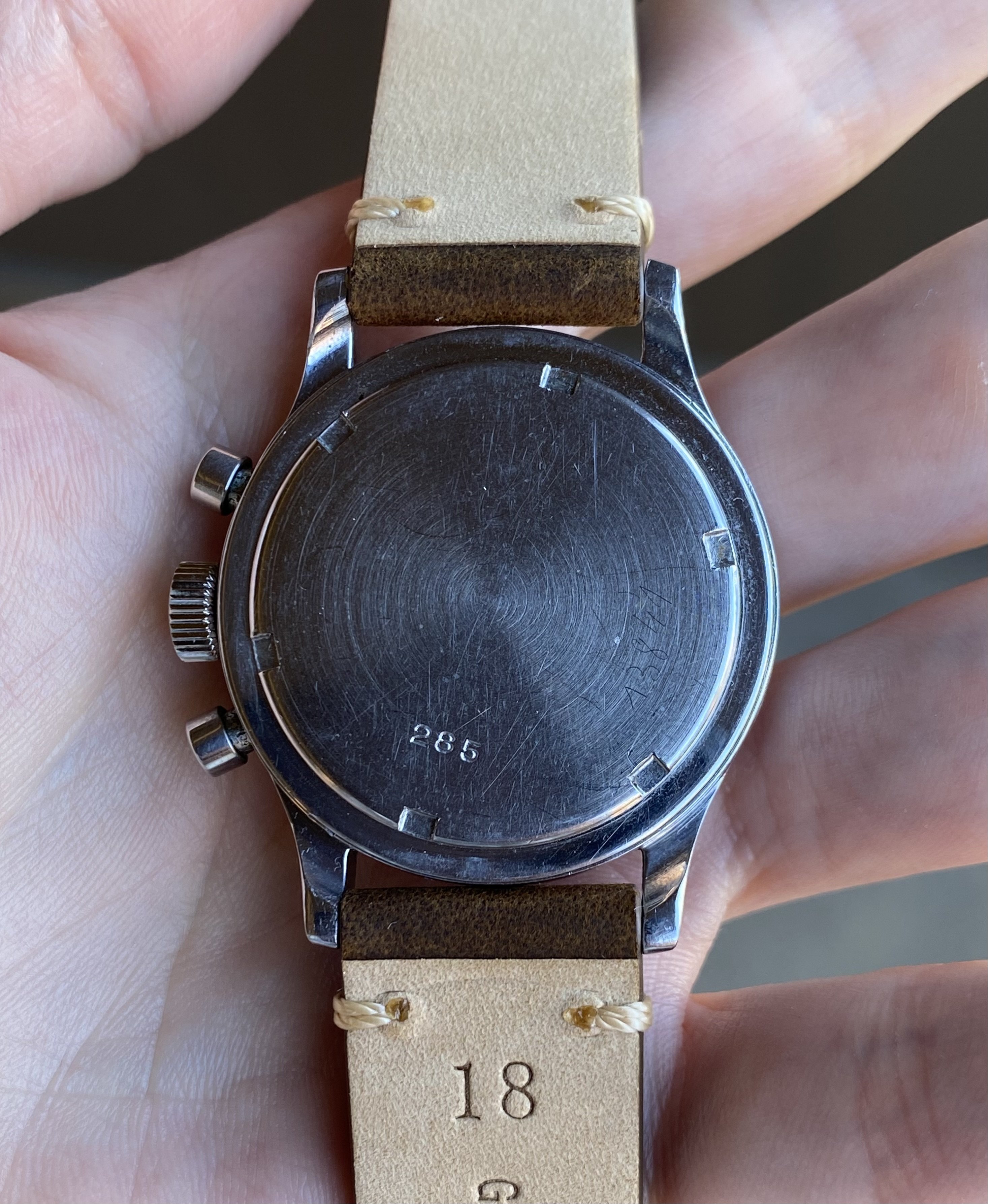 Case: Original 35mm stainless steel case is in nice condition. It may have been lightly polished but the bevels remain clear. There’s some scratches and a very light etching of a number on the outside of the caseback (I didn’t see it until I took photos for this listing..).