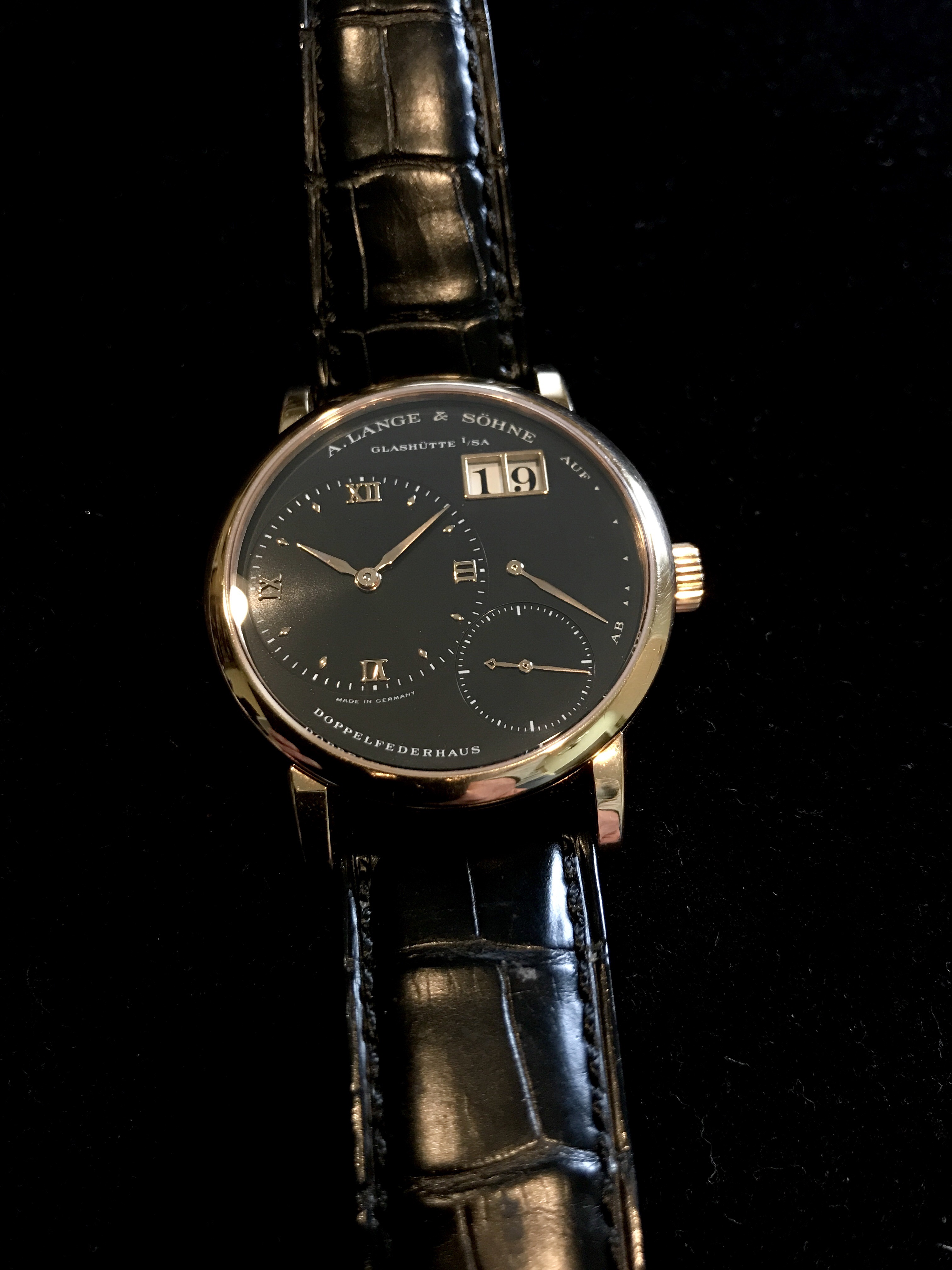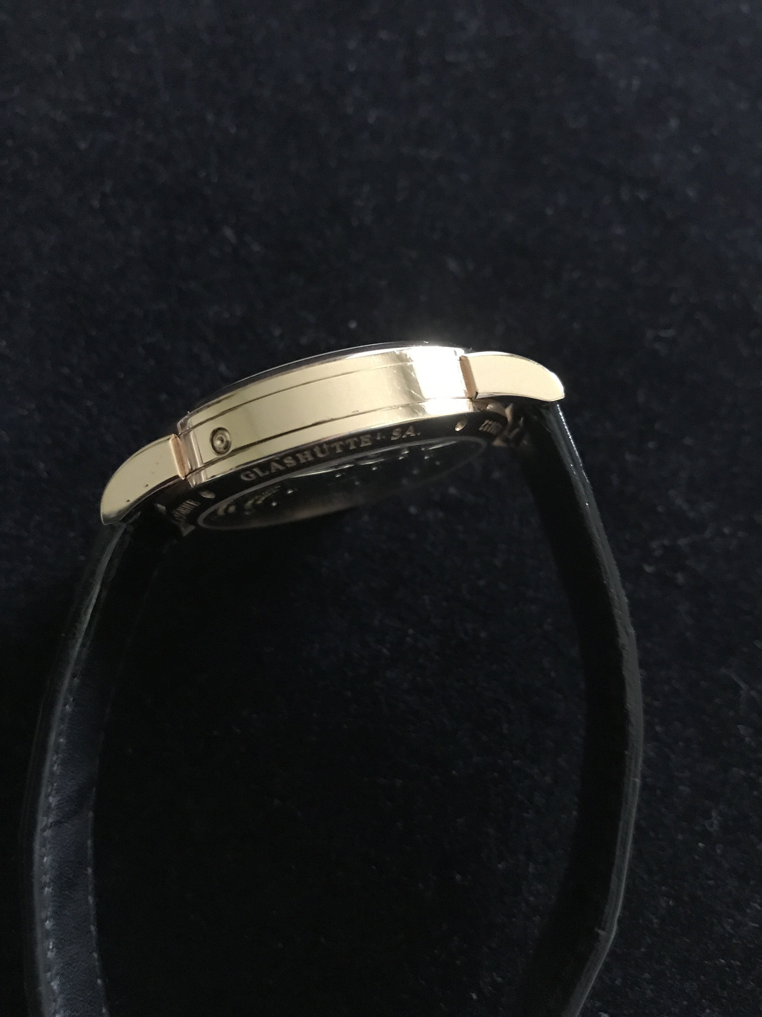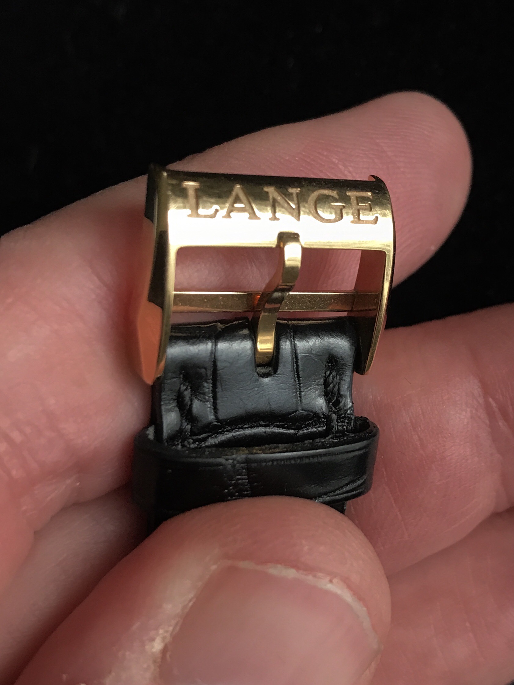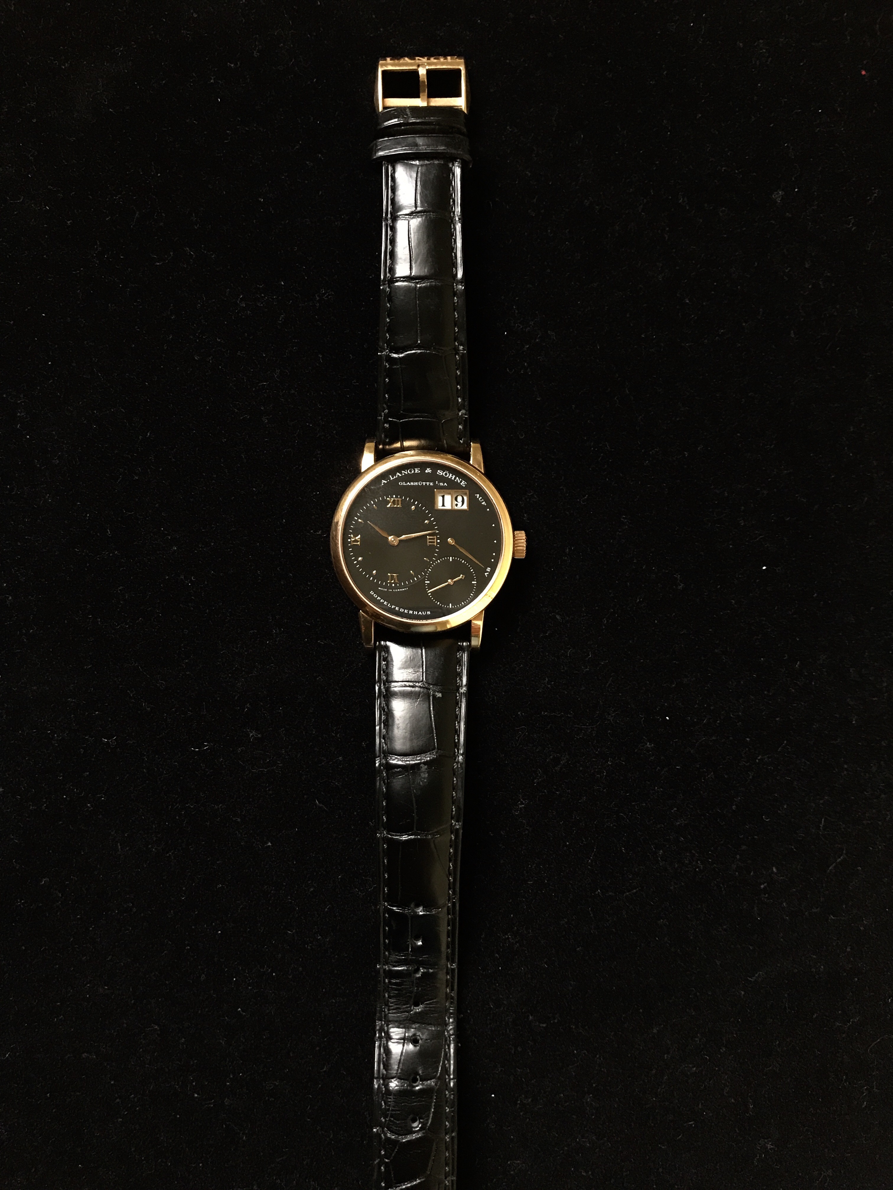 Case is 36.1mm wide (without the crown) and 9.5mm thick. Deep hallmarks (see photo), and unpolished. Sapphire crystal and display back, showing off the gorgeous movement, a manual wind caliber L901.0. Dial includes “Big Date,” along with a 72-hour power reserve indicator, and small seconds. Watch comes with original everything - Lange black crocodile strap (shows some wear, but still in very good shape), rose gold Lange-signed buckle, rose gold pusher, inner and outer boxes in great condition, and owners manual with a warranty card from Wempe NYC dated March, 2006. Service history is unknown (my father doesn't recall having it serviced), and always recommended, but the watch seems to be keeping excellent time.