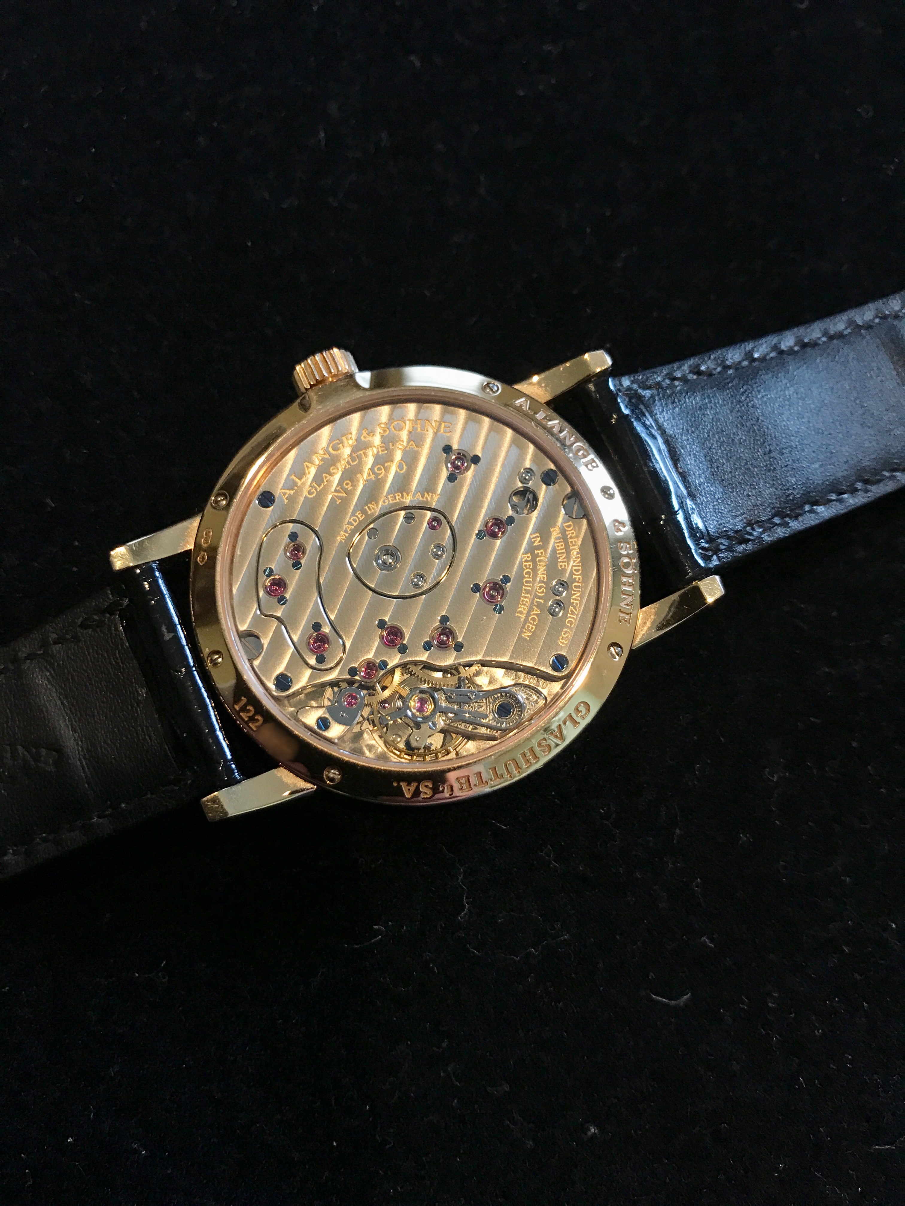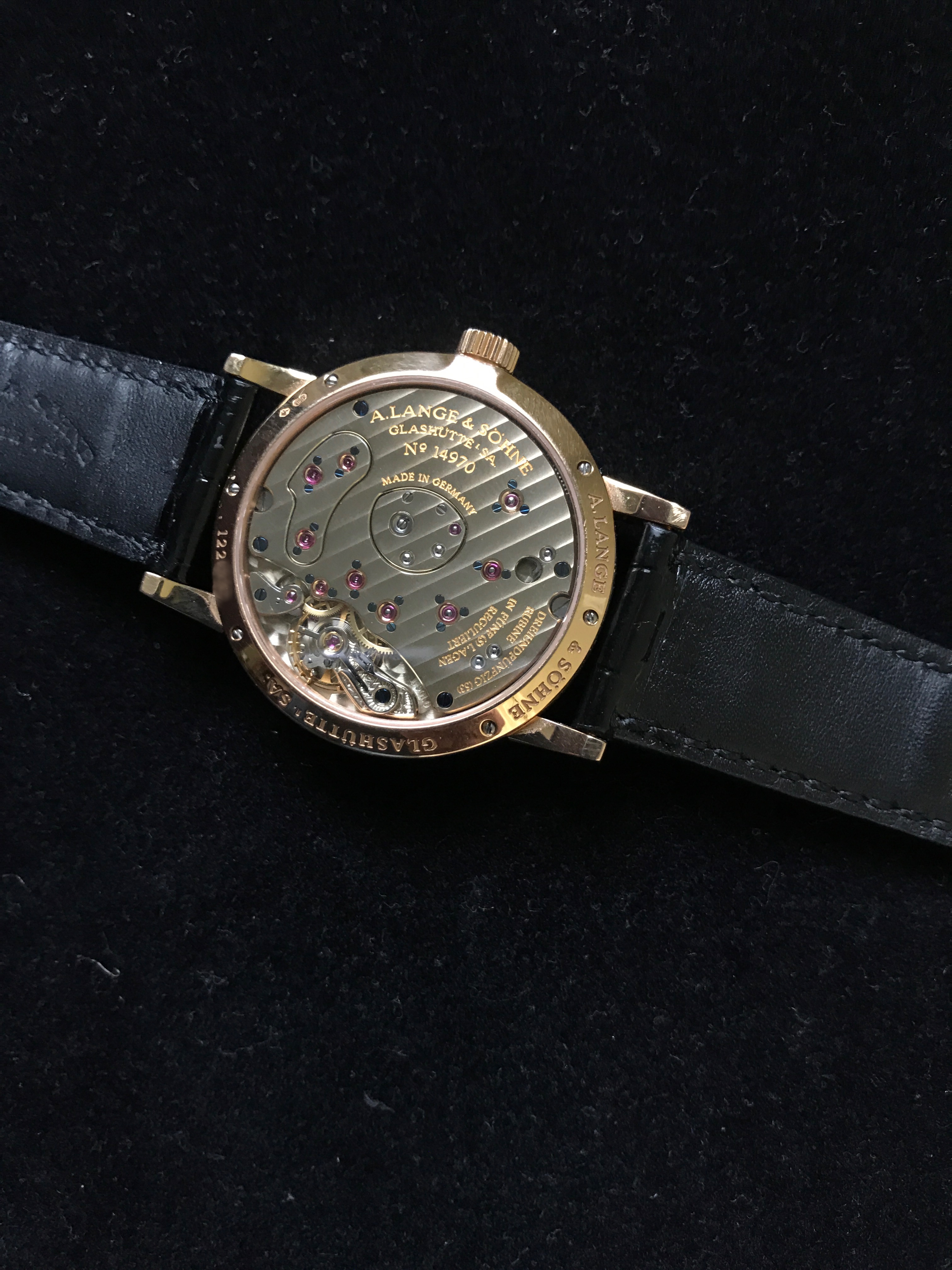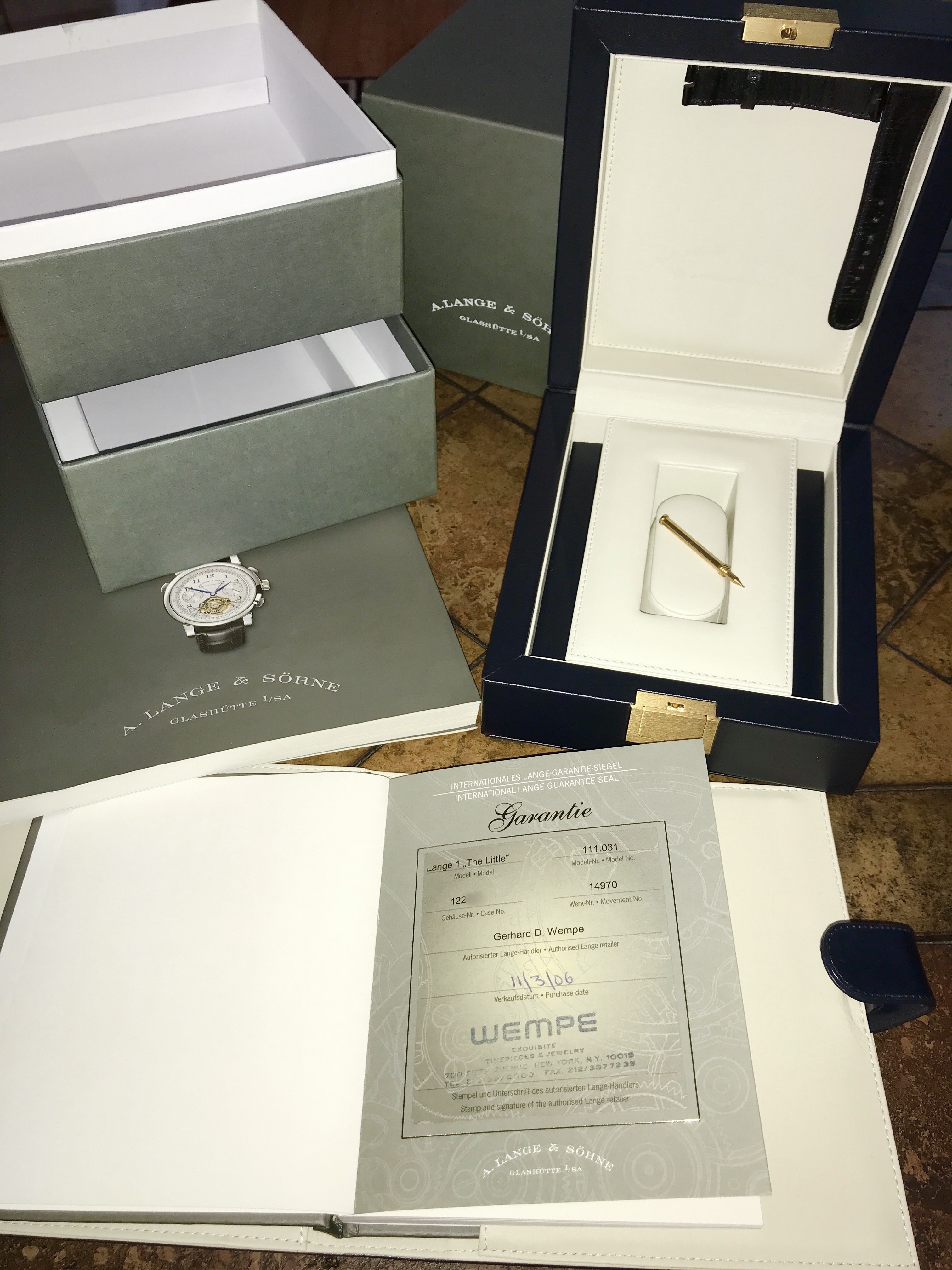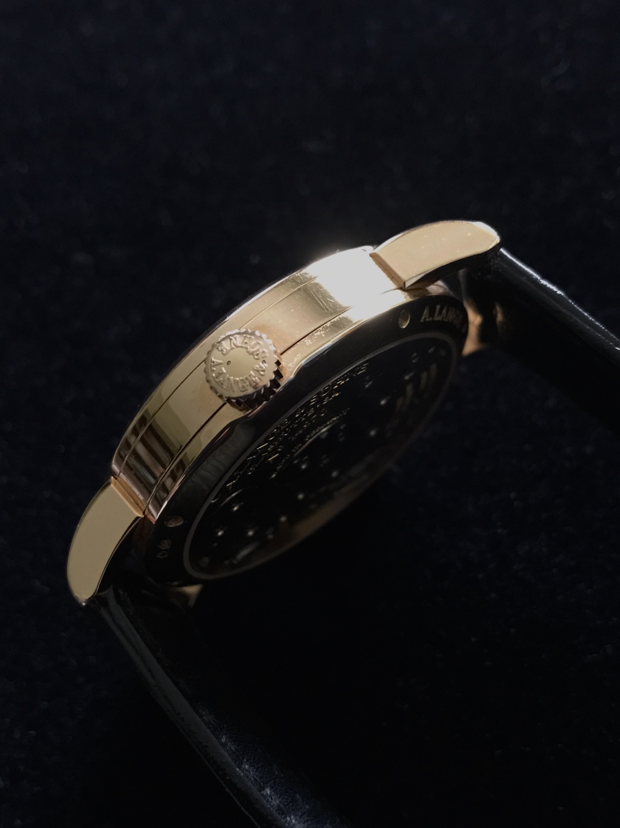 Case is 36.1mm wide (without the crown) and 9.5mm thick. Deep hallmarks (see photo), and unpolished. Sapphire crystal and display back, showing off the gorgeous movement, a manual wind caliber L901.0. Dial includes “Big Date,” along with a 72-hour power reserve indicator, and small seconds. Watch comes with original everything - Lange black crocodile strap (shows some wear, but still in very good shape), rose gold Lange-signed buckle, rose gold pusher, inner and outer boxes in great condition, and owners manual with a warranty card from Wempe NYC dated March, 2006. Service history is unknown (my father doesn't recall having it serviced), and always recommended, but the watch seems to be keeping excellent time.