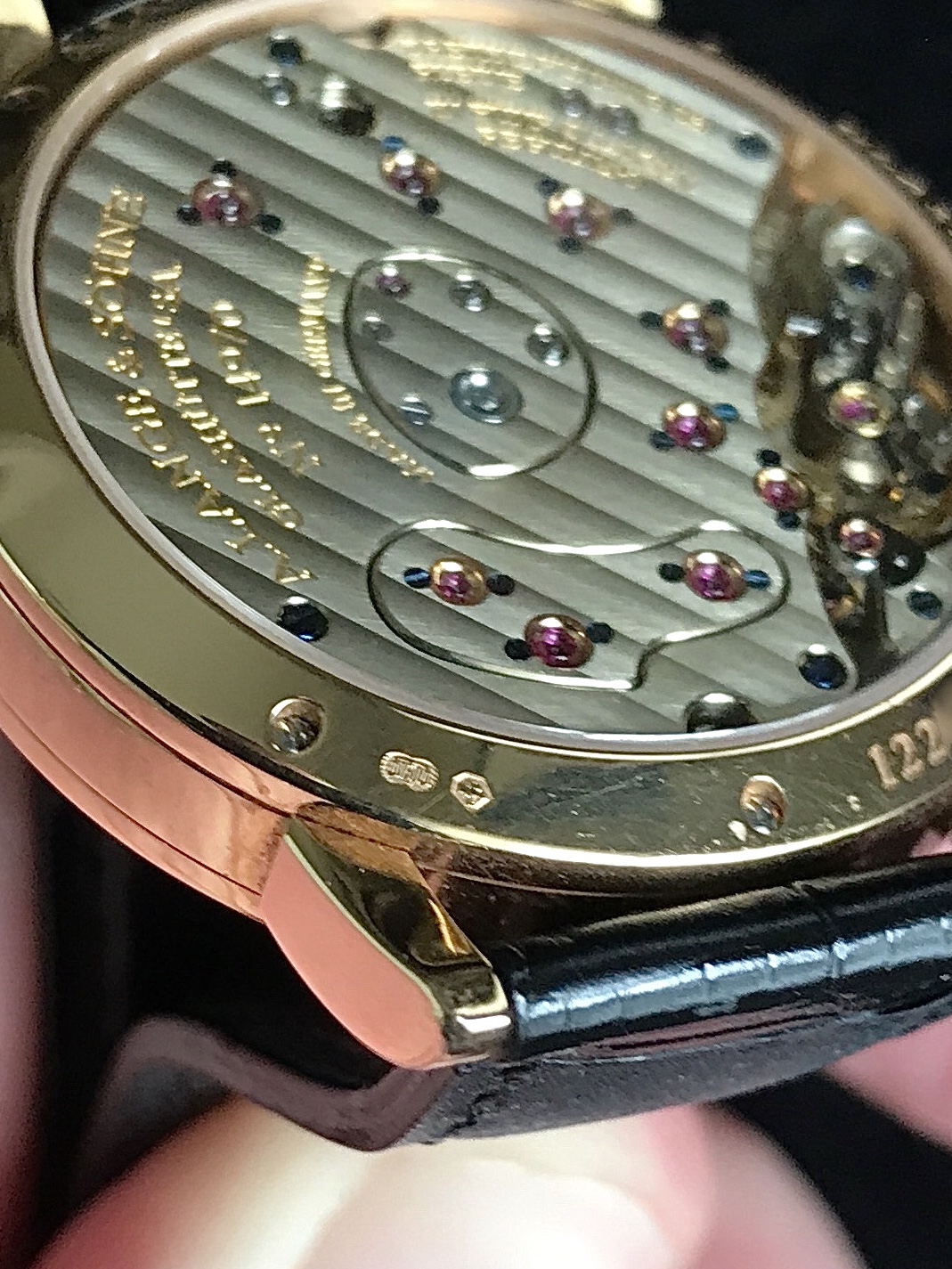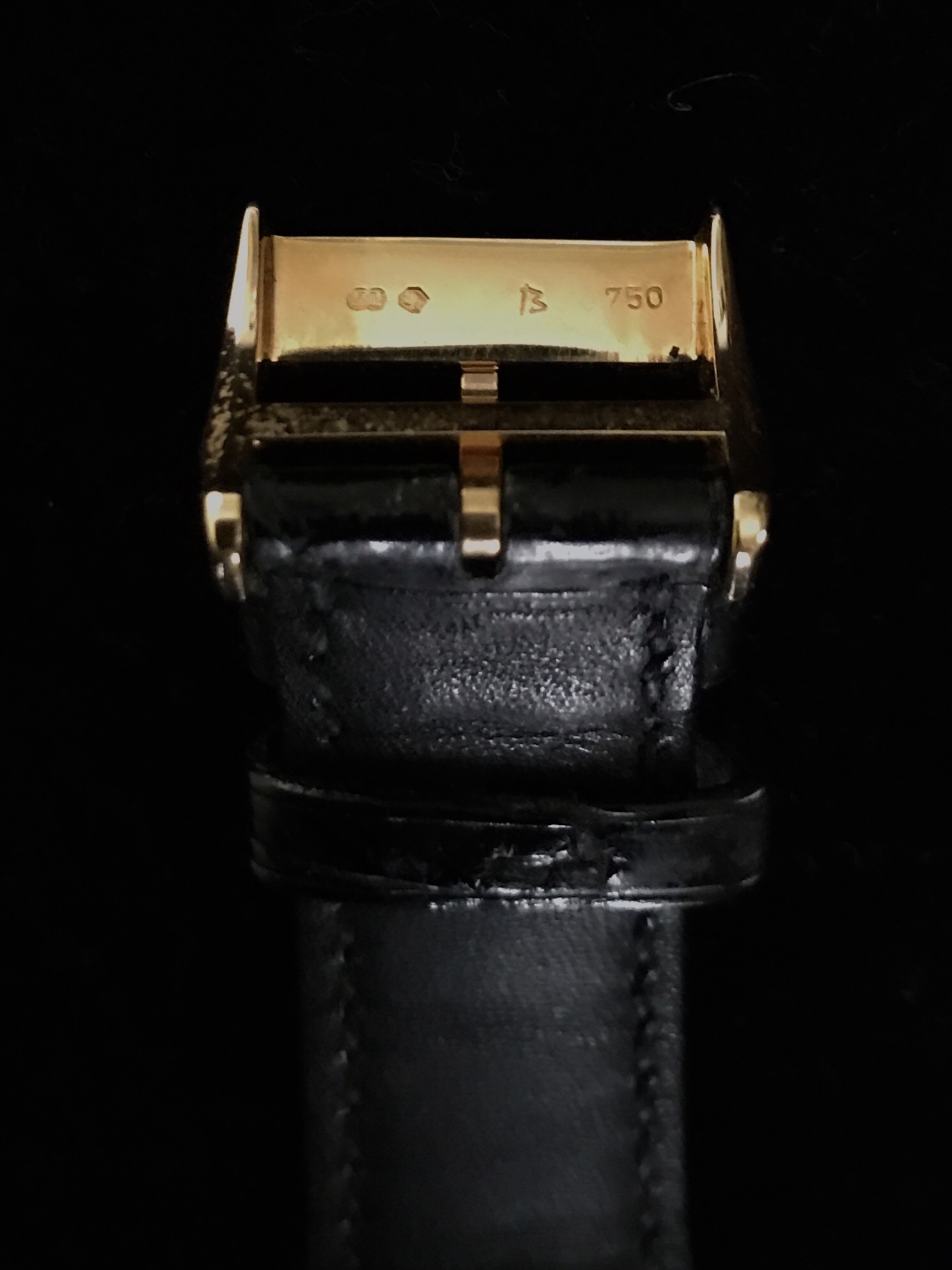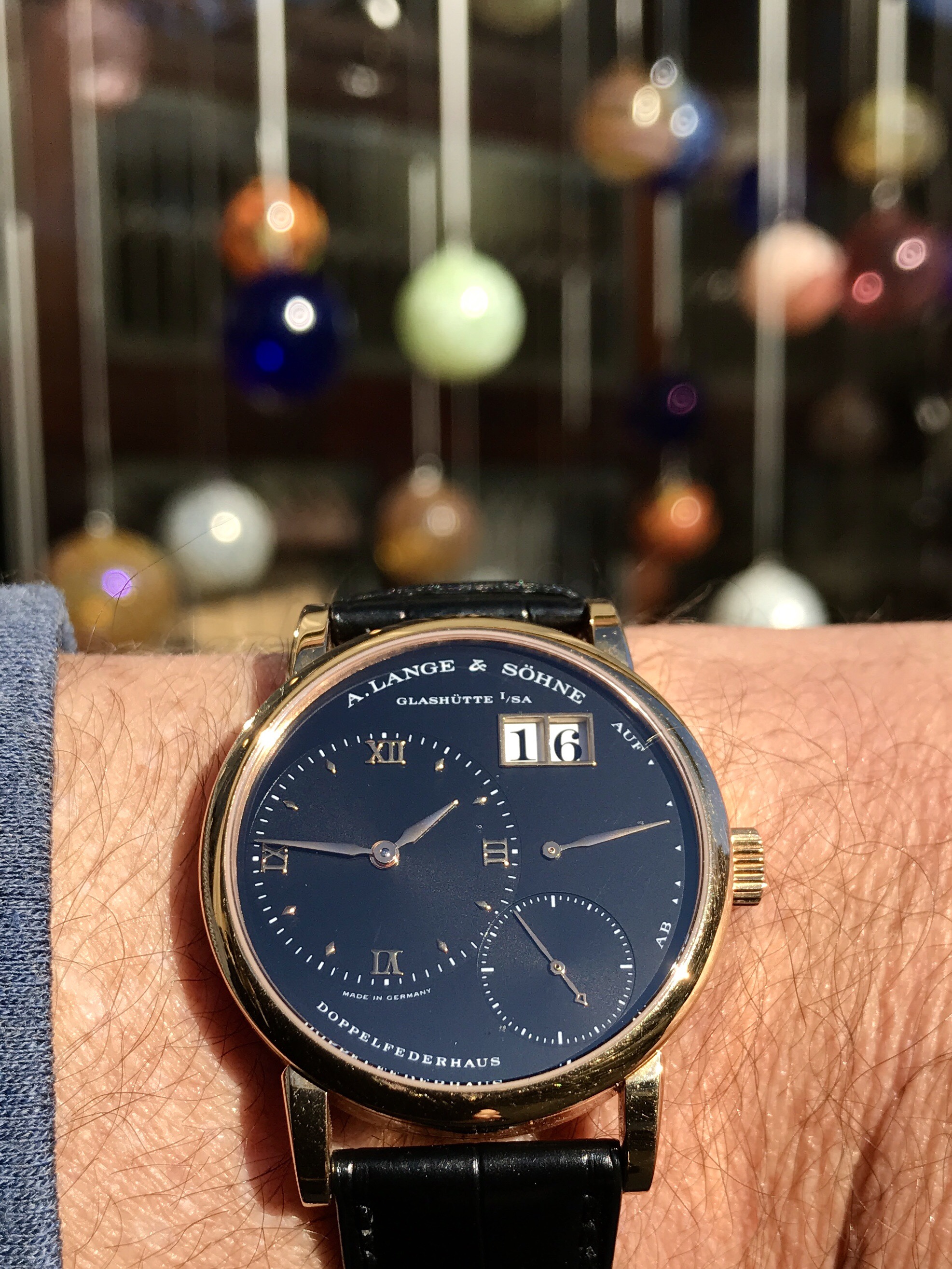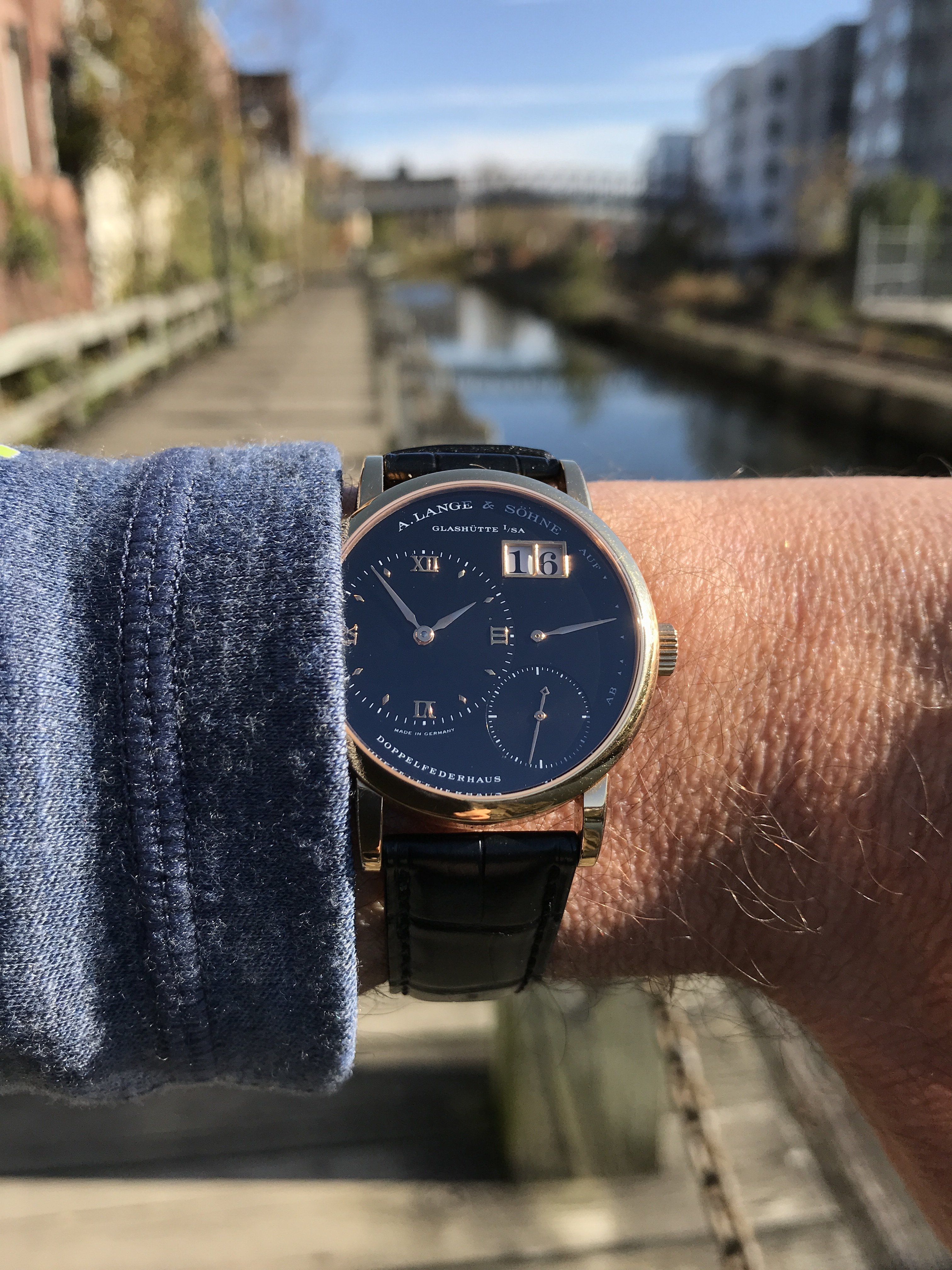 Case is 36.1mm wide (without the crown) and 9.5mm thick. Deep hallmarks (see photo), and unpolished. Sapphire crystal and display back, showing off the gorgeous movement, a manual wind caliber L901.0. Dial includes “Big Date,” along with a 72-hour power reserve indicator, and small seconds. Watch comes with original everything - Lange black crocodile strap (shows some wear, but still in very good shape), rose gold Lange-signed buckle, rose gold pusher, inner and outer boxes in great condition, and owners manual with a warranty card from Wempe NYC dated March, 2006. Service history is unknown (my father doesn't recall having it serviced), and always recommended, but the watch seems to be keeping excellent time.
