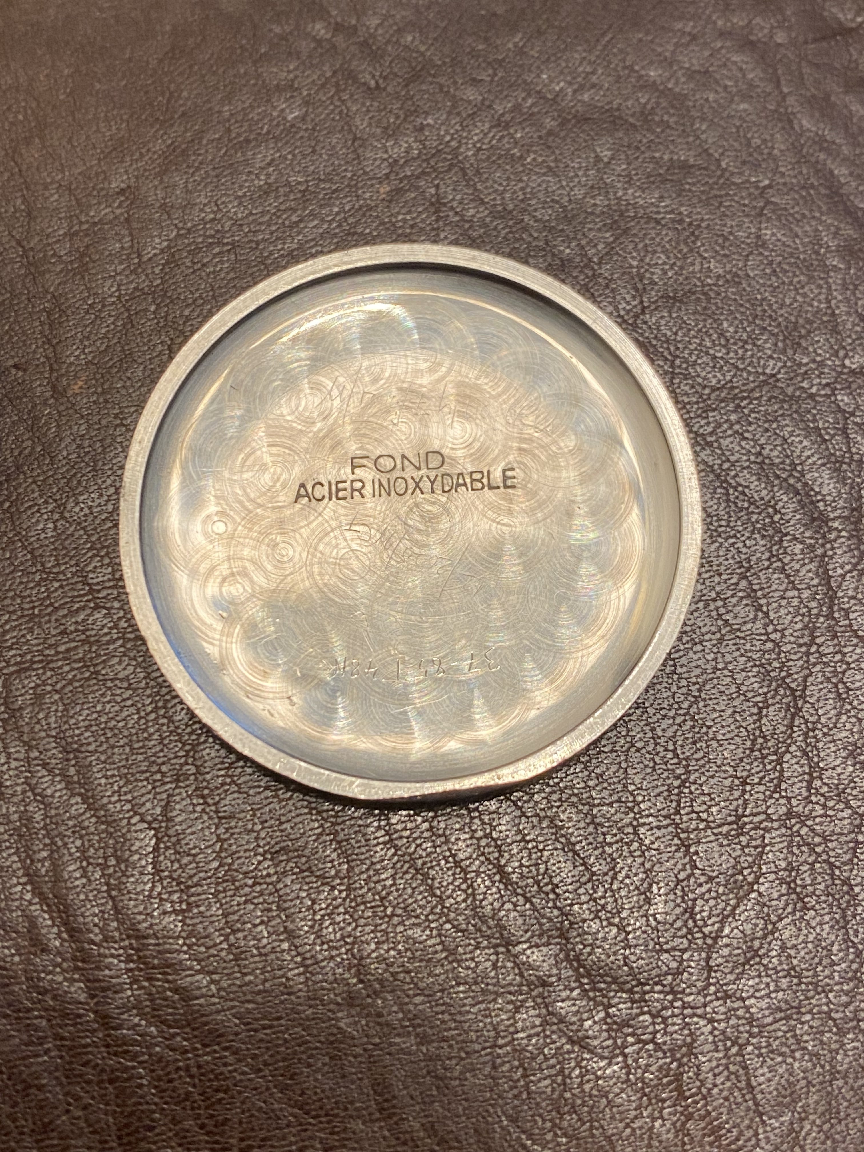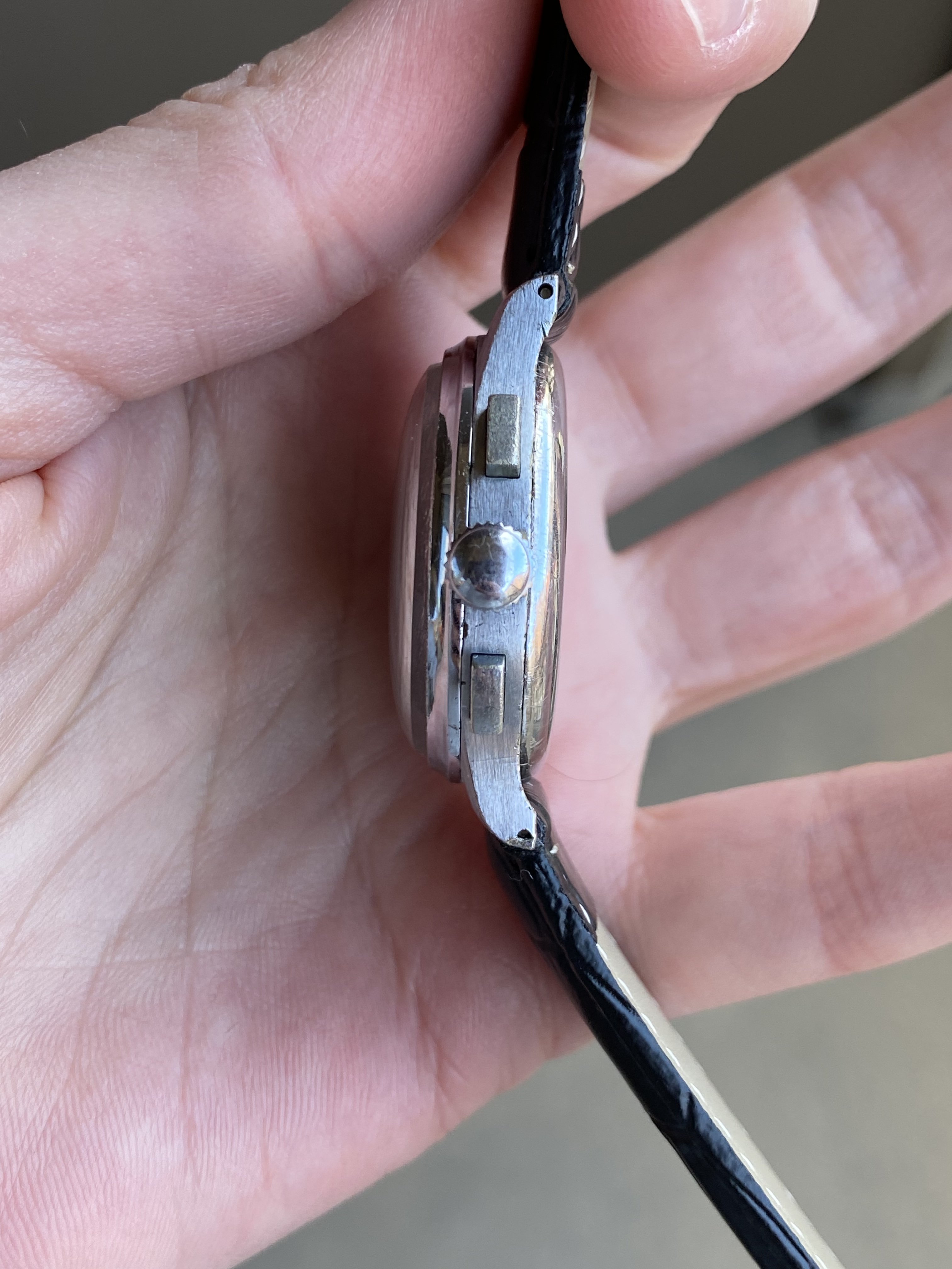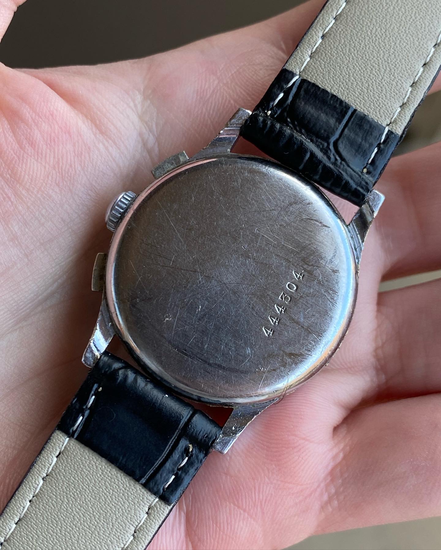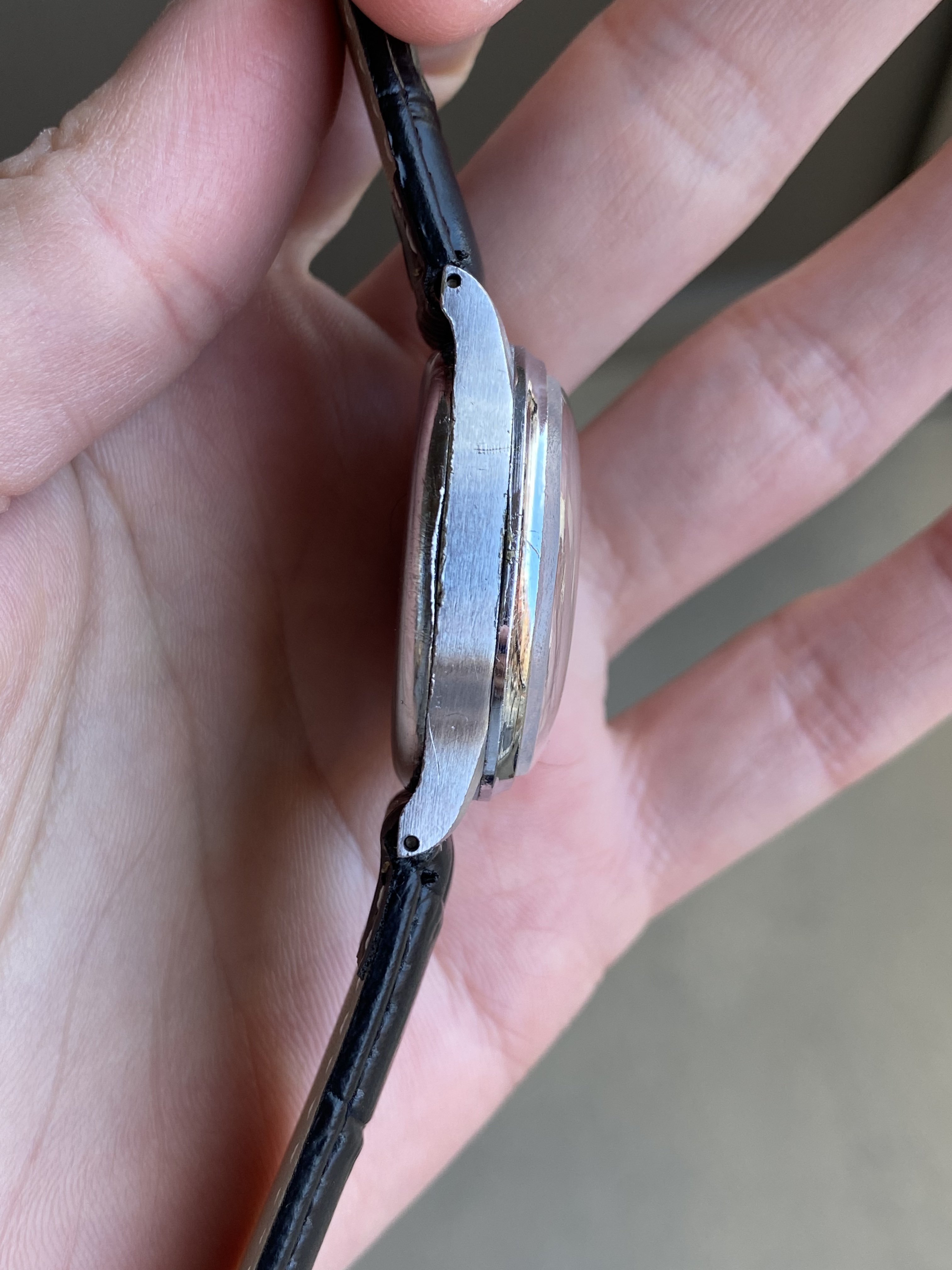 Case: The original 32.5mm chromed case (steel back) is in nice, unpolished condition. The only noticeable wear is a ding on the end of the bottom right lug; it’s visible only from the side and the lug itself doesn’t appear to be bent. No reference number on the case is correct for this era. It’s possible the crown is a later replacement (I’m unsure what the originals looked like).