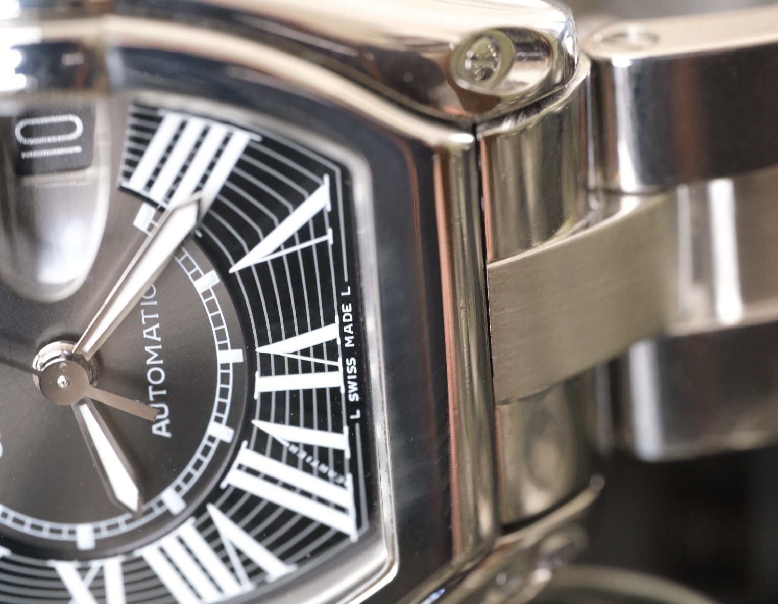 DIAL: The lesser seen black and gray Roman dial with classic Cartier Roman numerals. The center of the dial looks black in some light and then turns to this gunmetal gray… add in the concentric circles and it’s just plain sexy! A super clean example, all protected under that sweet sapphire crystal with integrated date bubble!