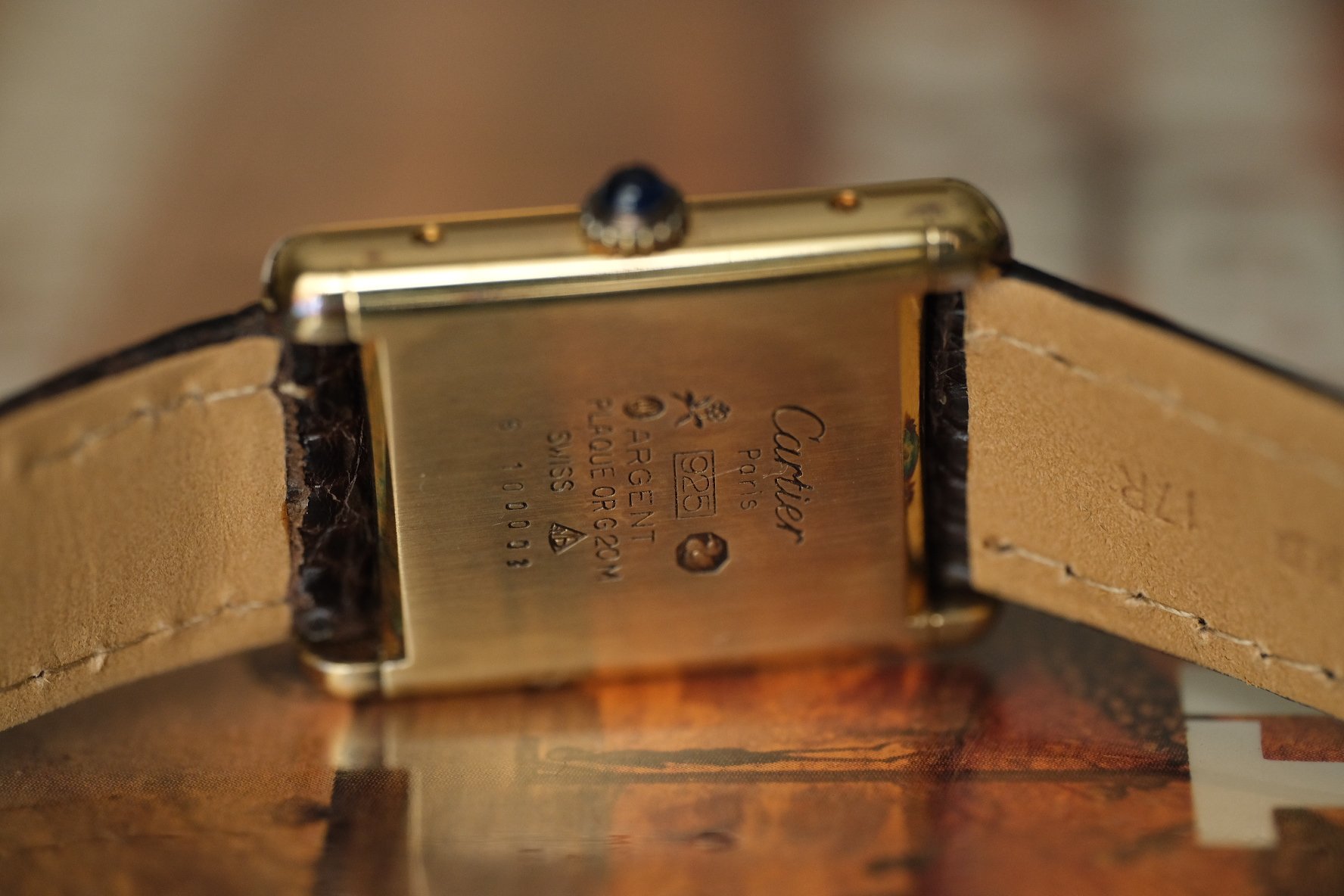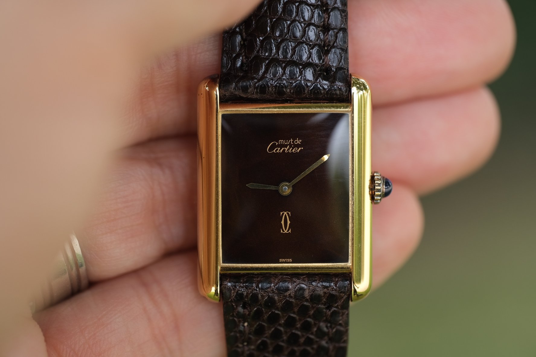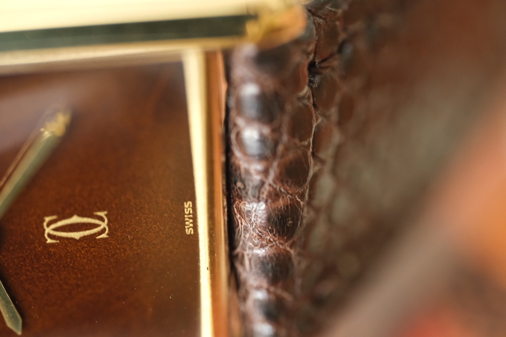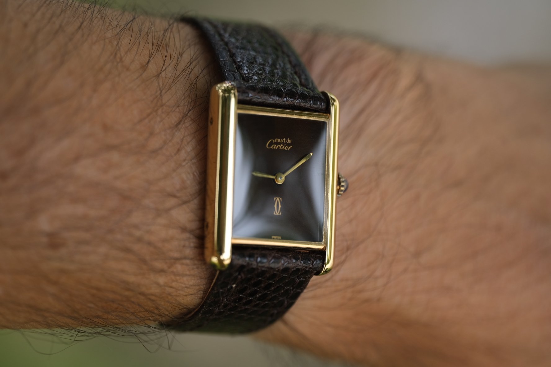 CASE: This is the vintage men’s version, measuring in at 23.5MM x 30.5MM. A small and classy watch, equally suitable as a midsize or unisex swatch. Pictured on my 6.6 inch wrist, it wears beautifully. The Vermeil case, a Cartier staple of gold over sterling silver, has light wear throughout, as to be expected given the age. This example has none of the plating loss usually found on these! And of course that sweet crown with the classic Cartier cabochon!