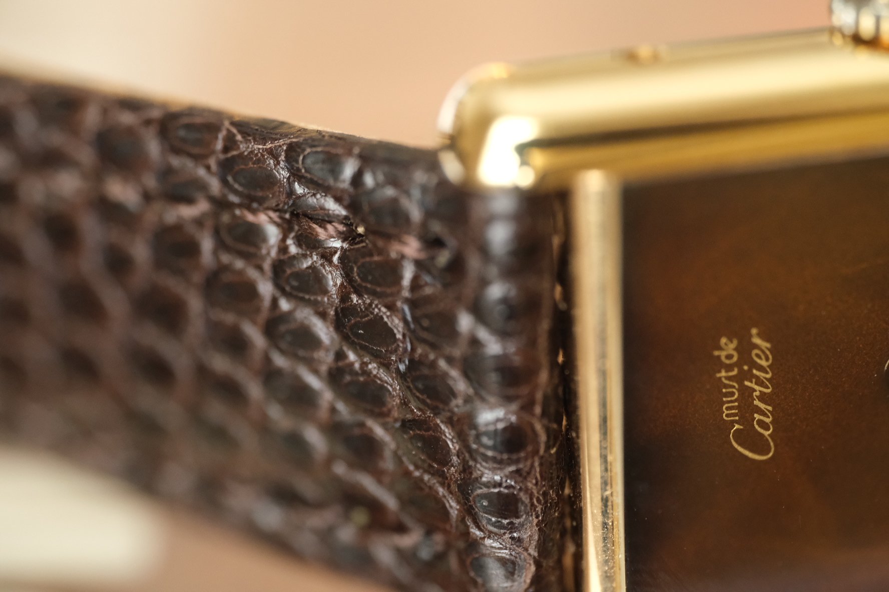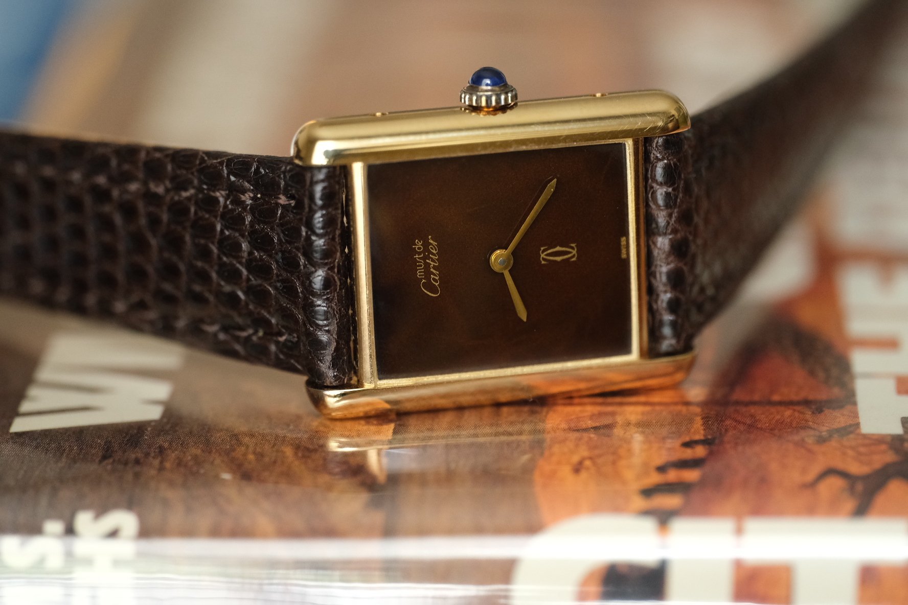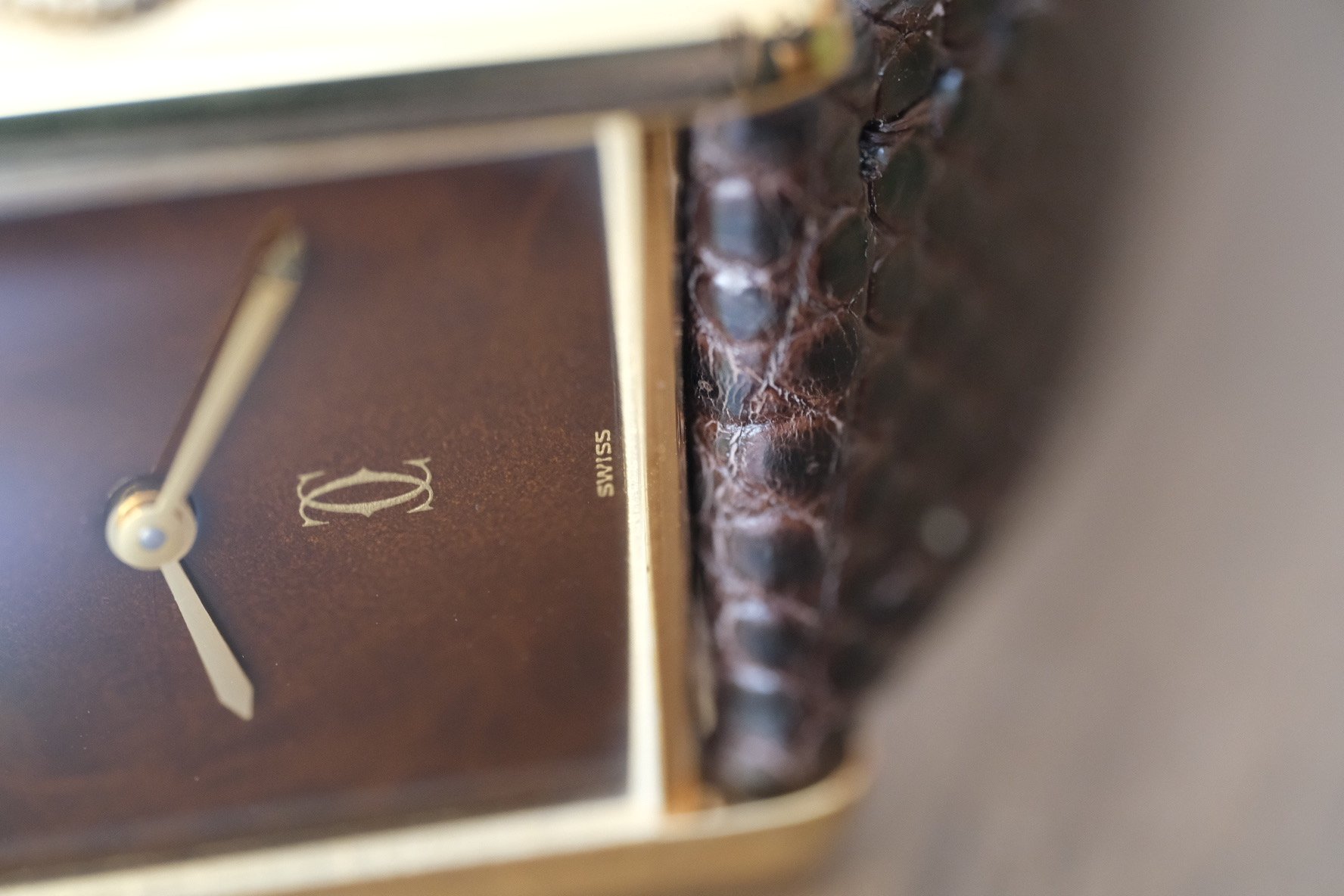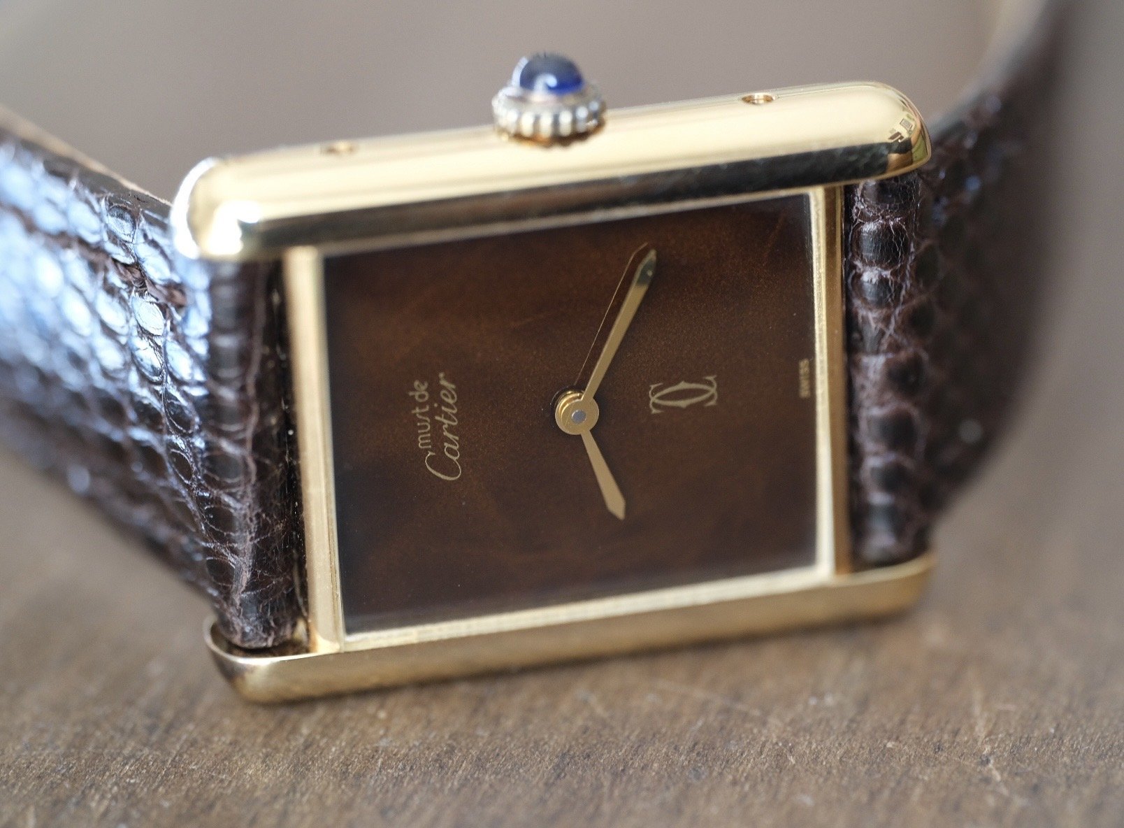 This is an absolutely STUNNING example of the classic Cartier Tank with a rare brown marble/tortoise dial. When the light hits it’s absolutely incredible! Just placed on a brand new dark brown lizard strap for the perfect combo!