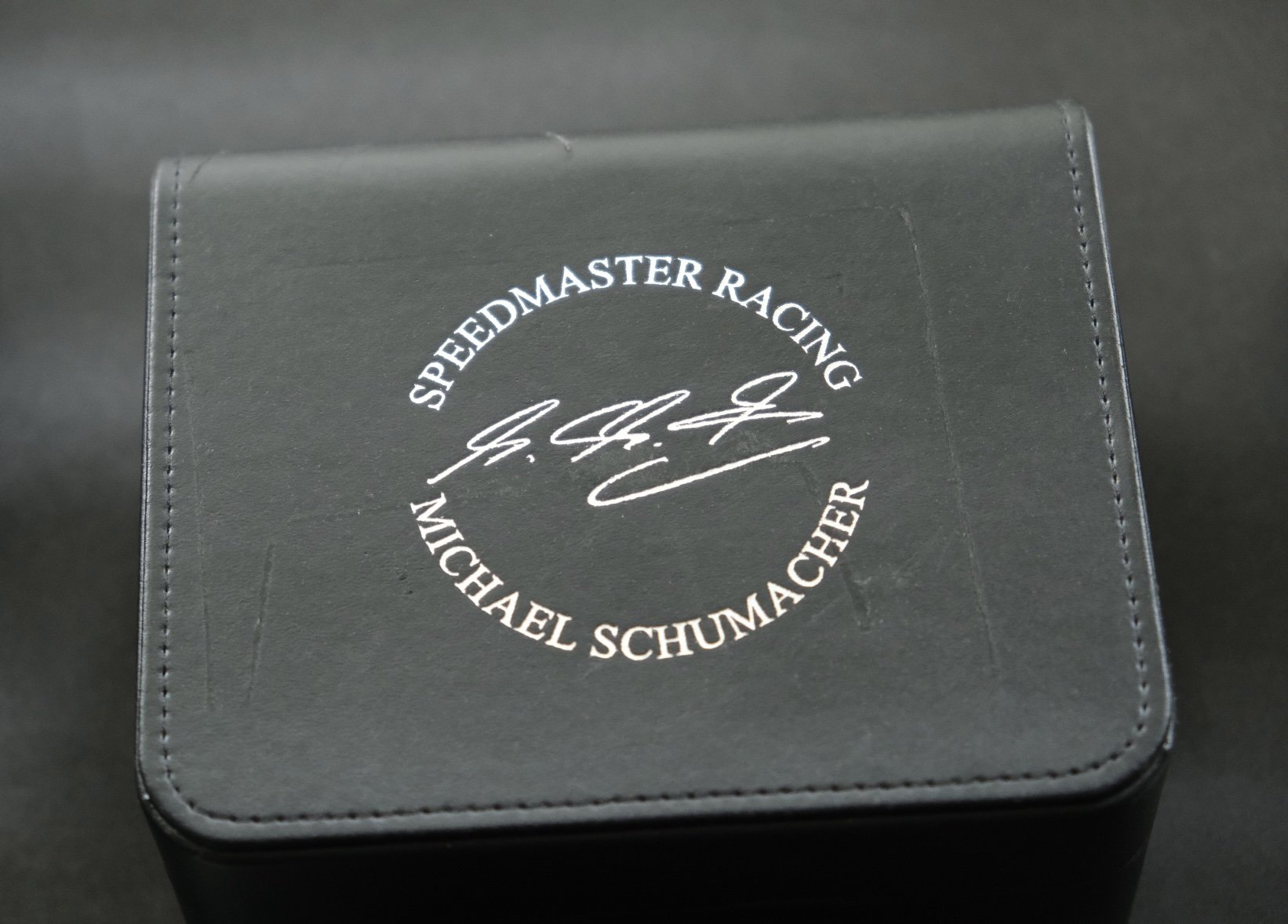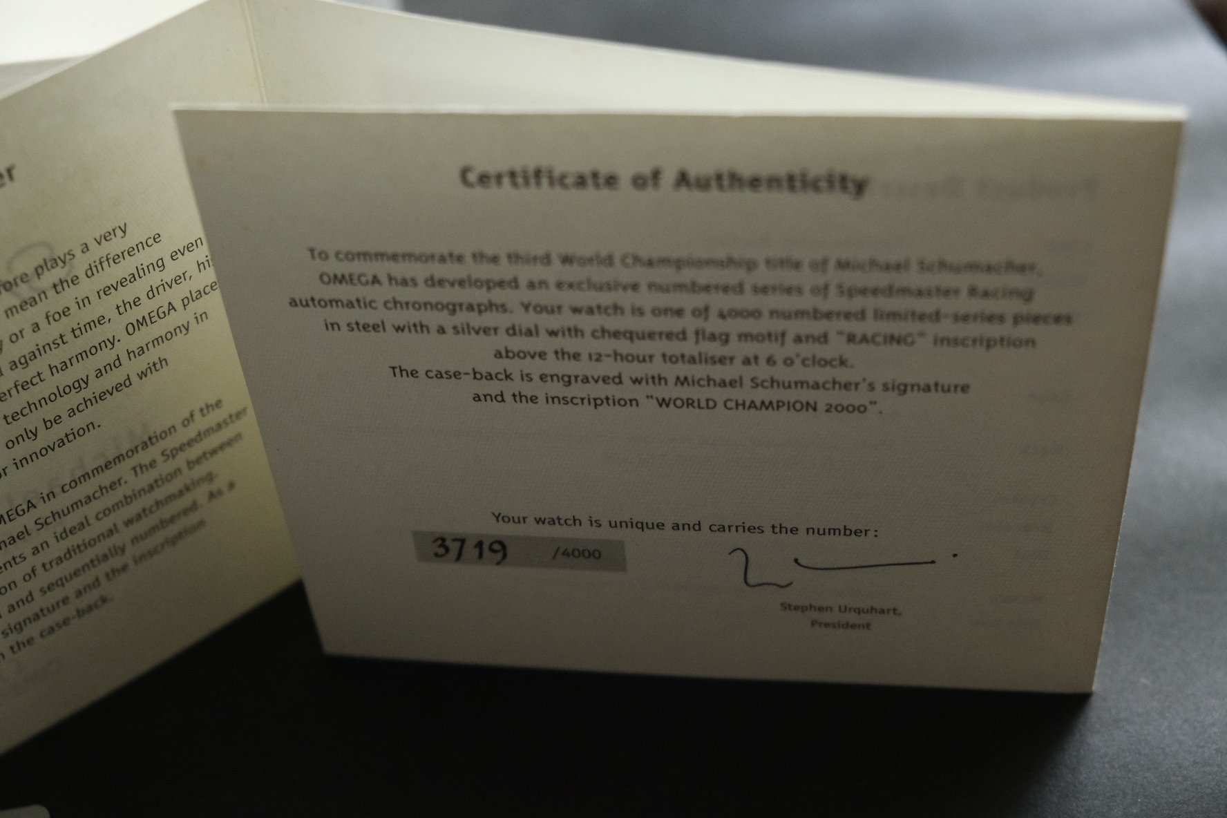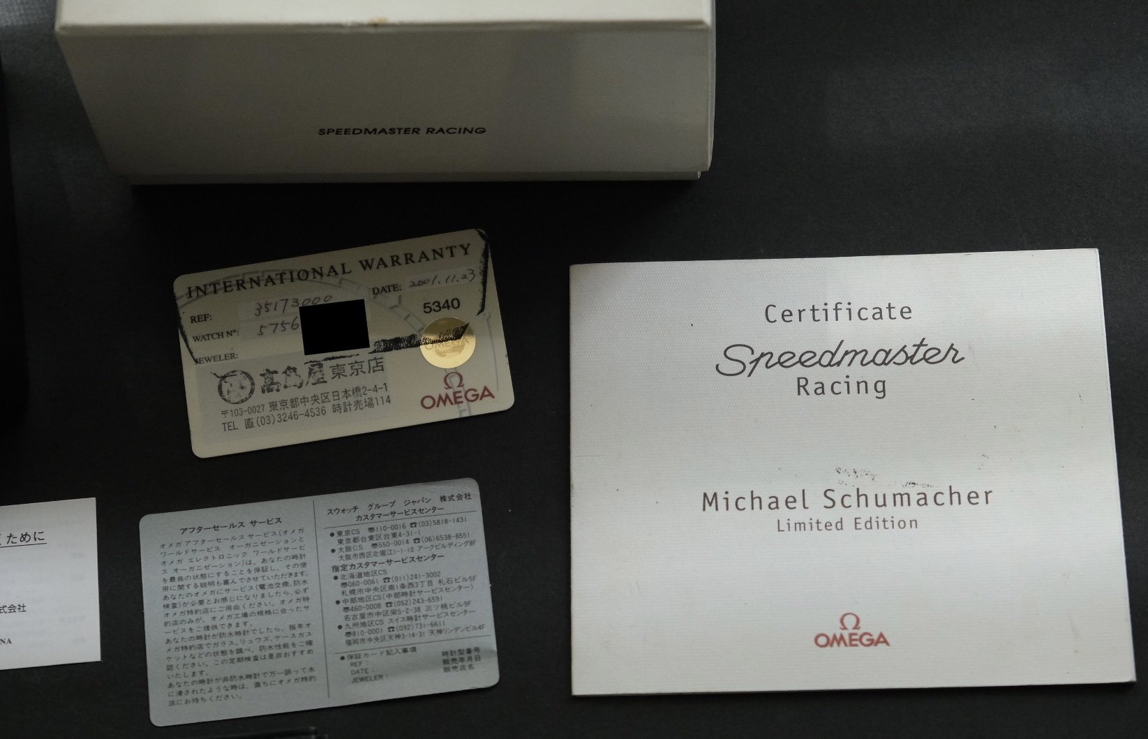 ACCESSORIES: This example comes with EVERYTHING! Has all of the paperwork, the card dated to 2001, the original double Schumacher boxes (light wear as expected on both) the numbered Shumacher certificate, even the original Omega black paperwork holder specific to this release - just an awesome set!