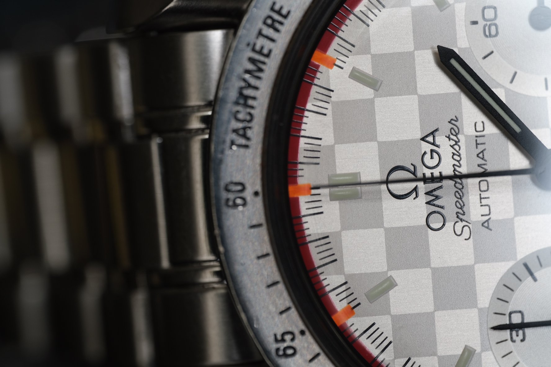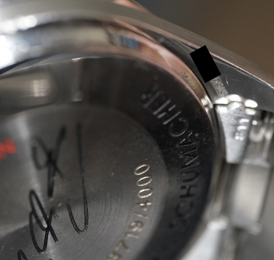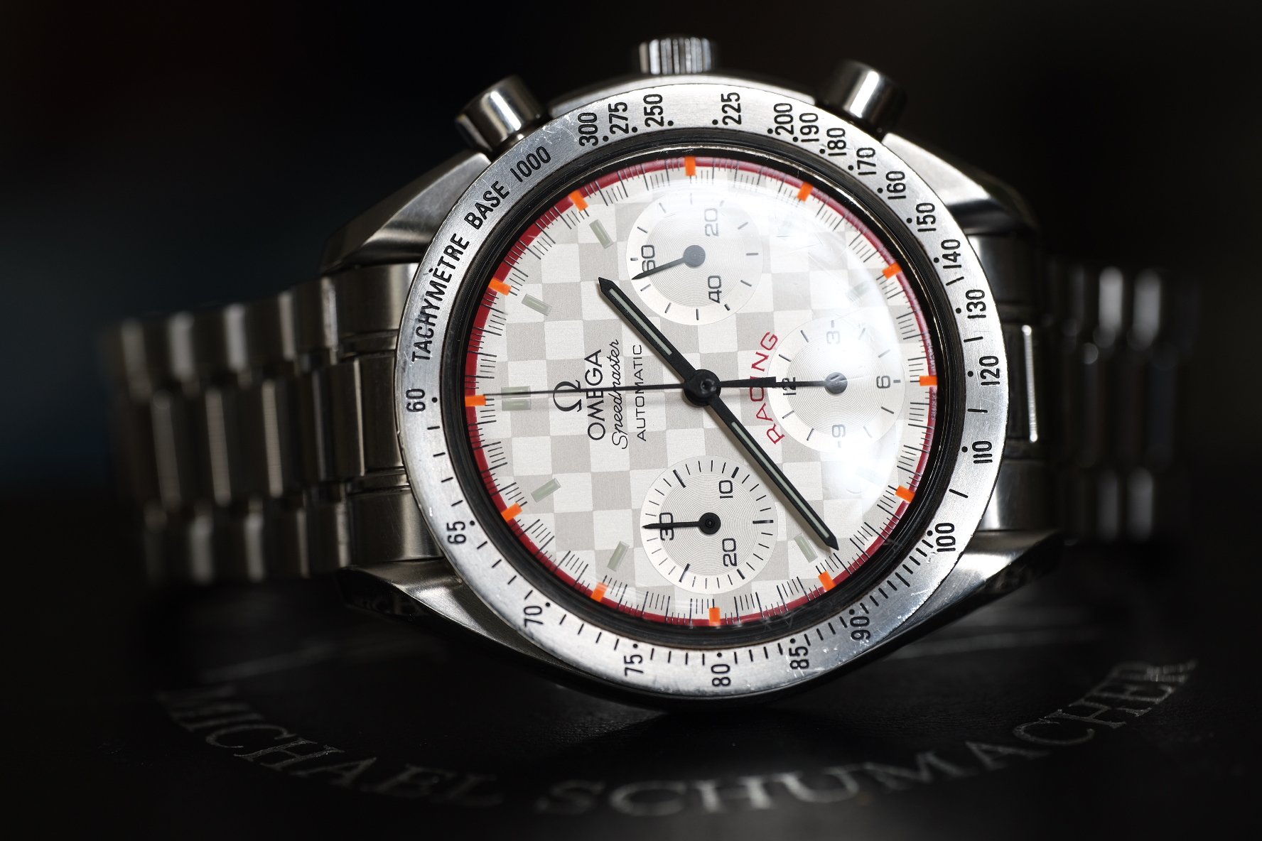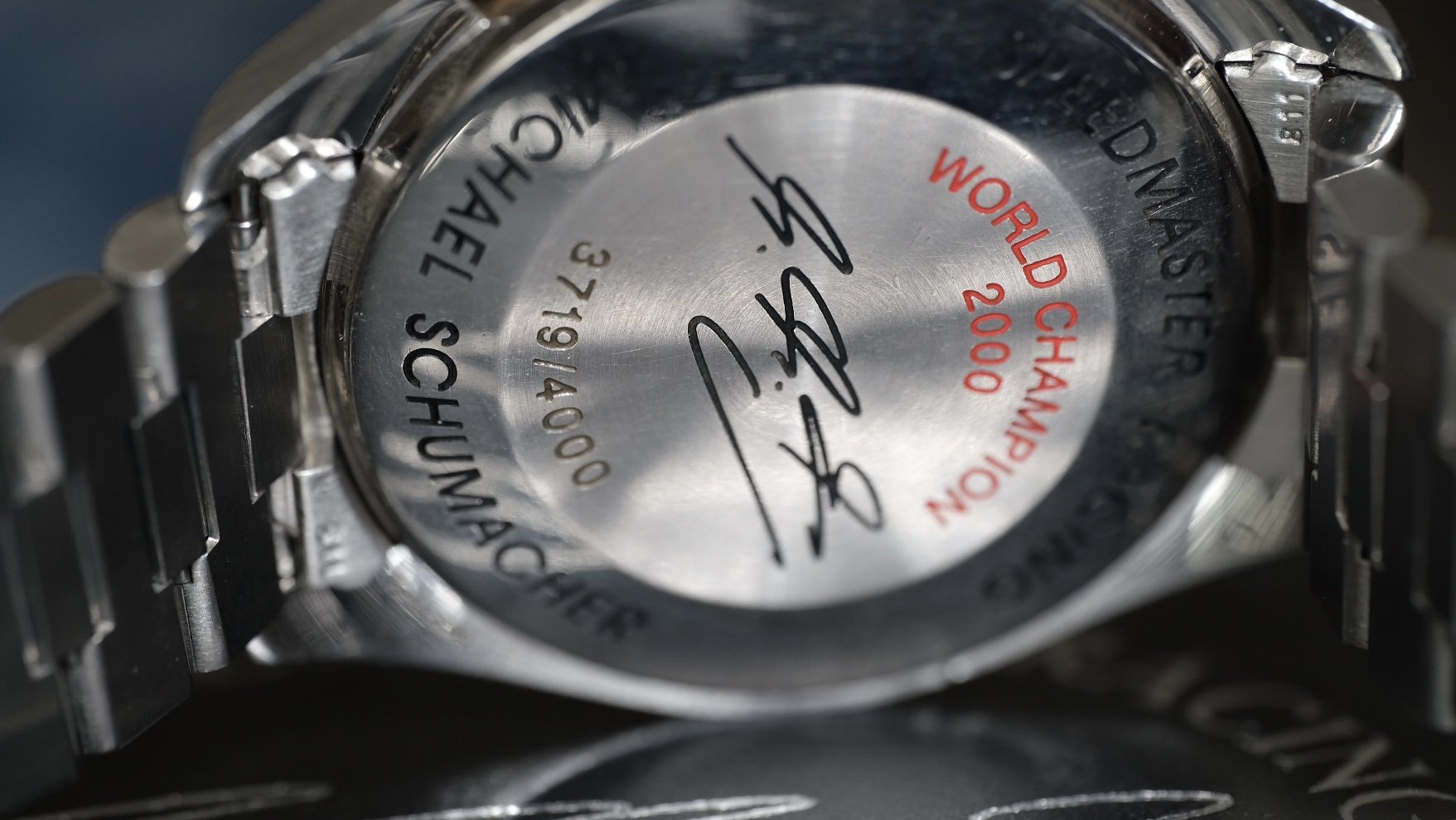 ACCESSORIES: This example comes with EVERYTHING! Has all of the paperwork, the card dated to 2001, the original double Schumacher boxes (light wear as expected on both) the numbered Shumacher certificate, even the original Omega black paperwork holder specific to this release - just an awesome set!