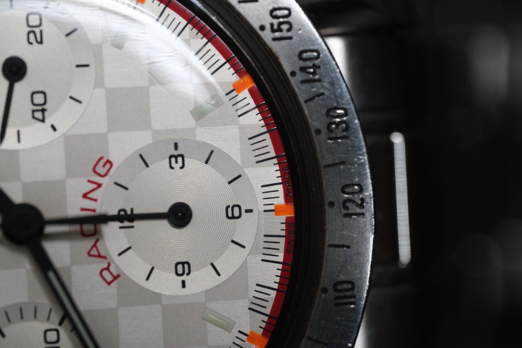 DIAL: Such a cool dial! Sometimes it’s silver, sometimes it’s off white depending on the light/angle, with that incredible racing checkered design and that pop of color! And all in fantastic condition!
