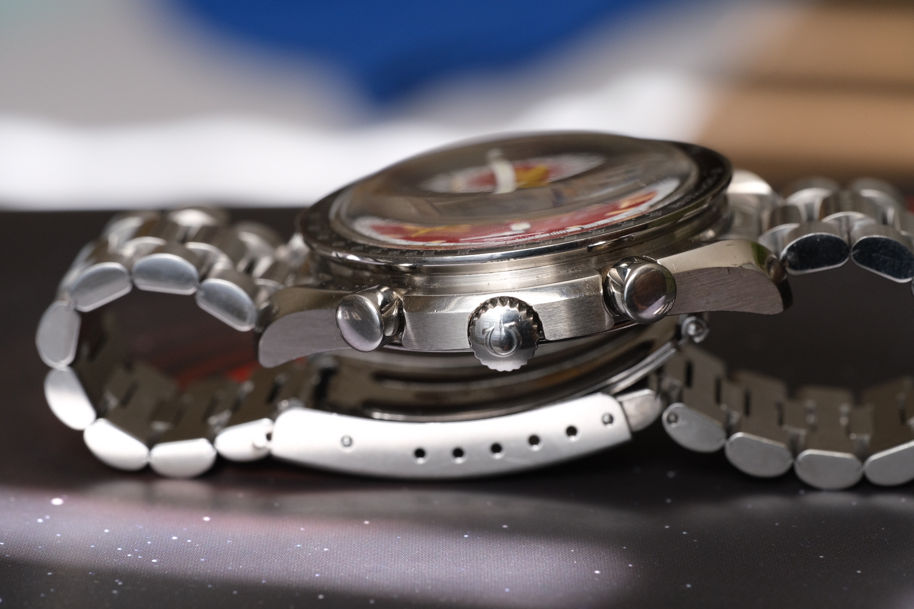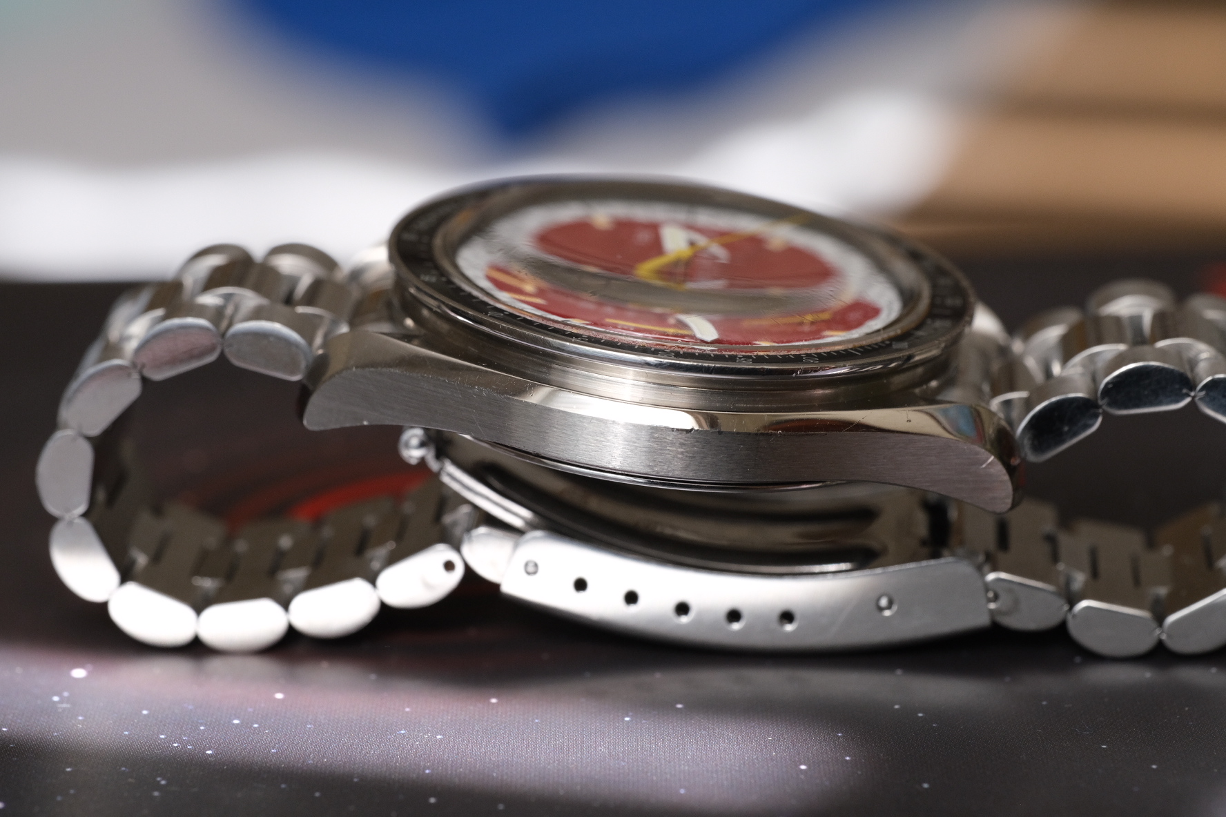 DIAL: STUNNER! Goes from bright Ferrari red to a darker almost maroon depending on the light. With the yellow and white accents, add in that crazy aged to perfection lume and it’s a thing of beauty!