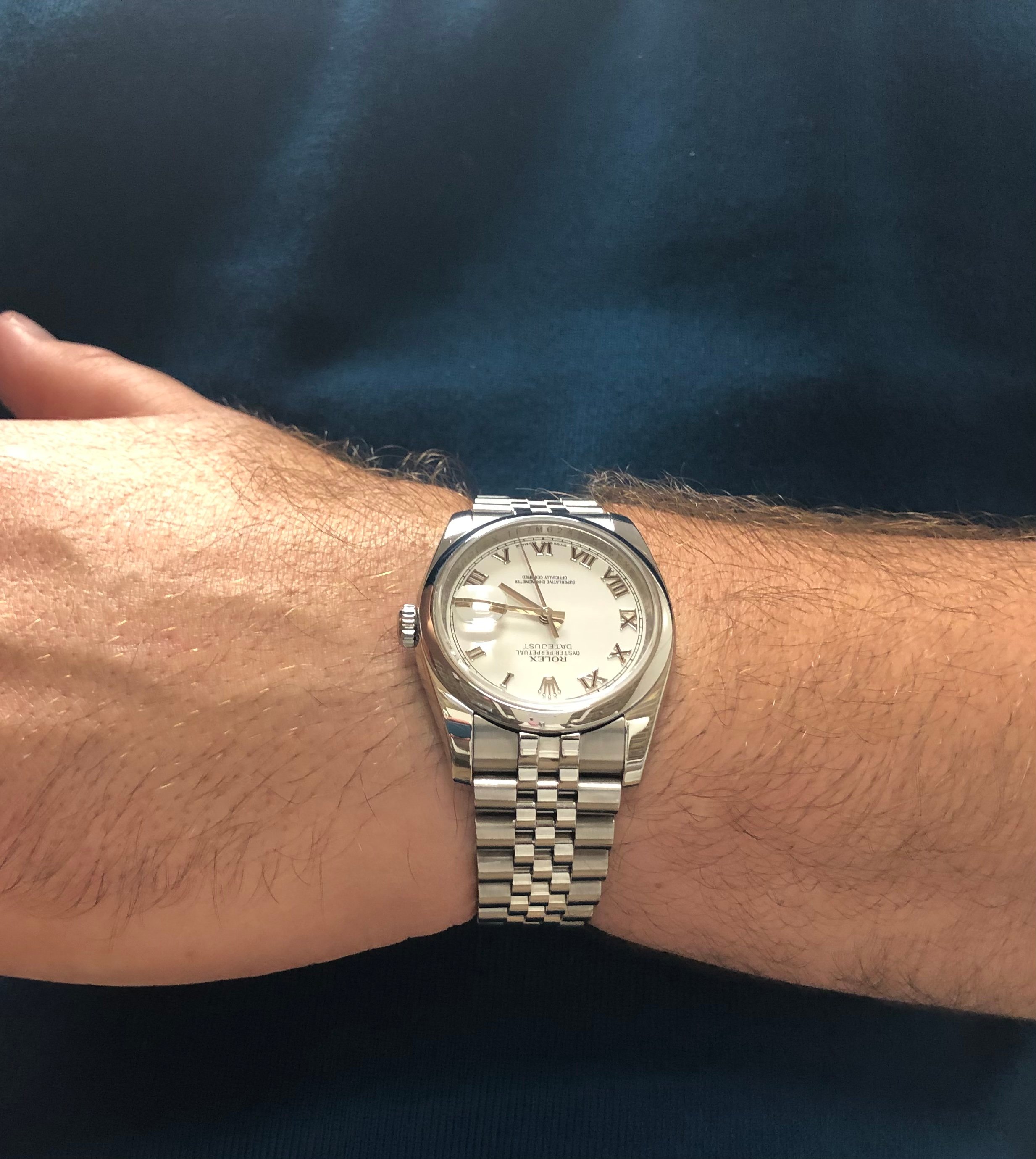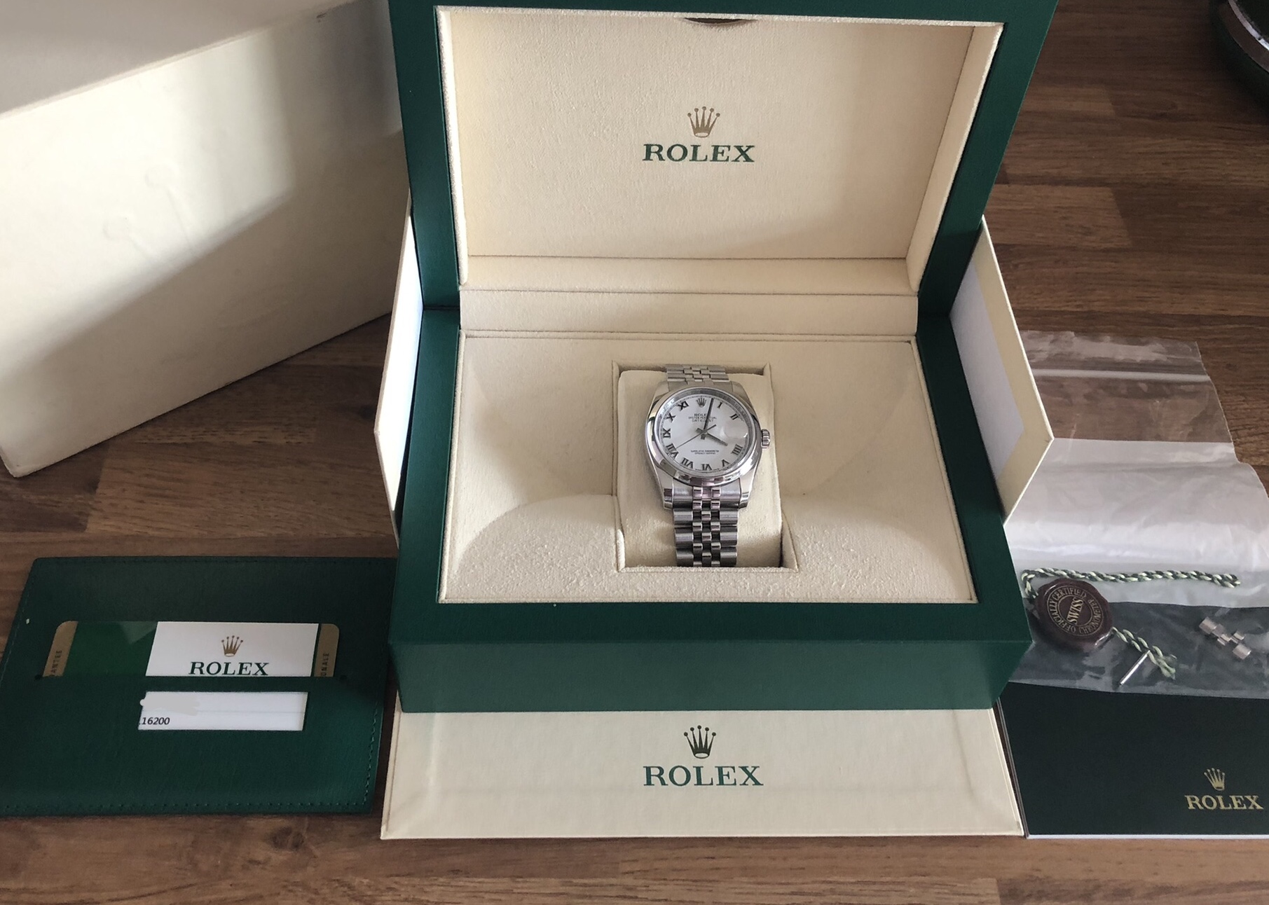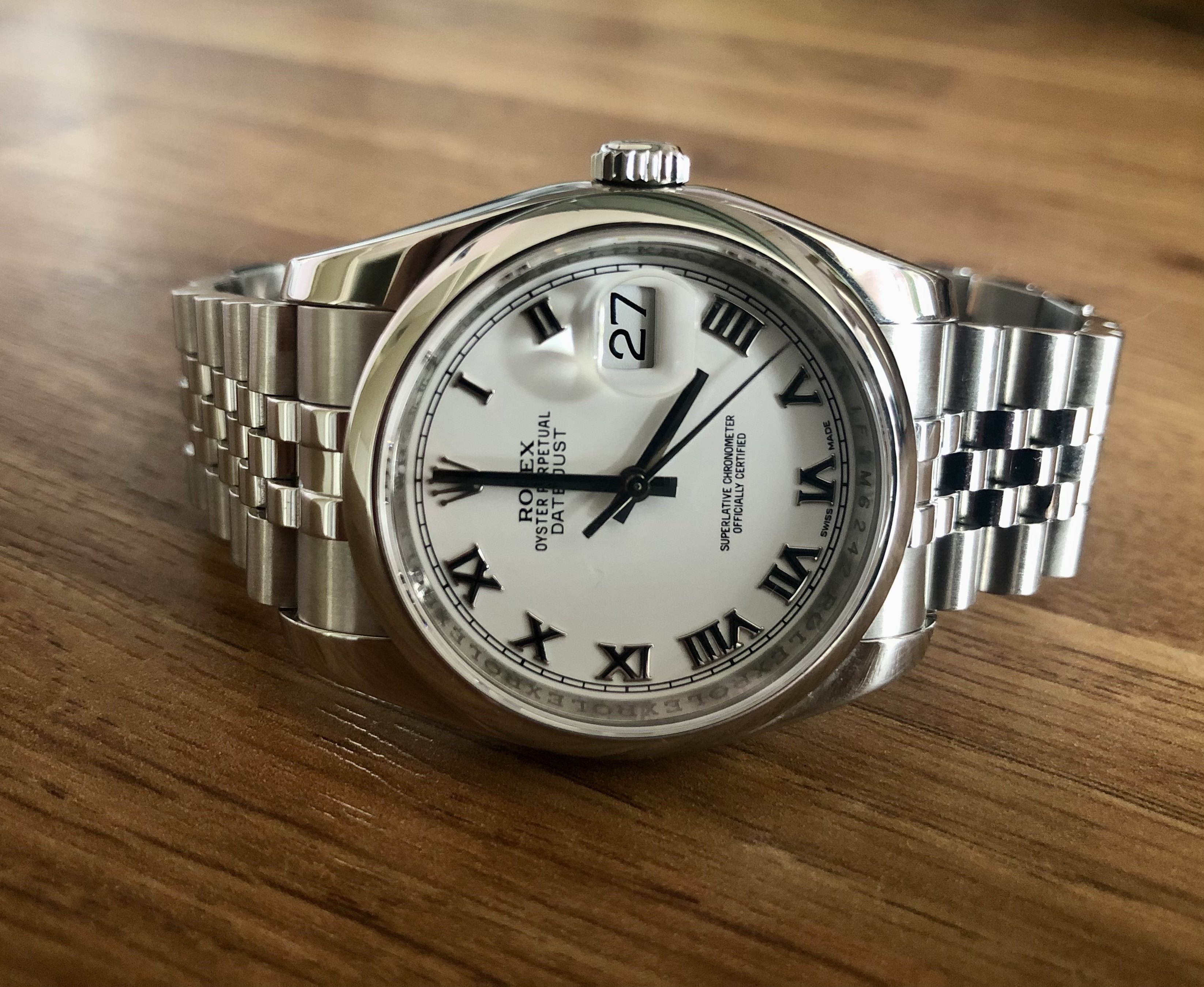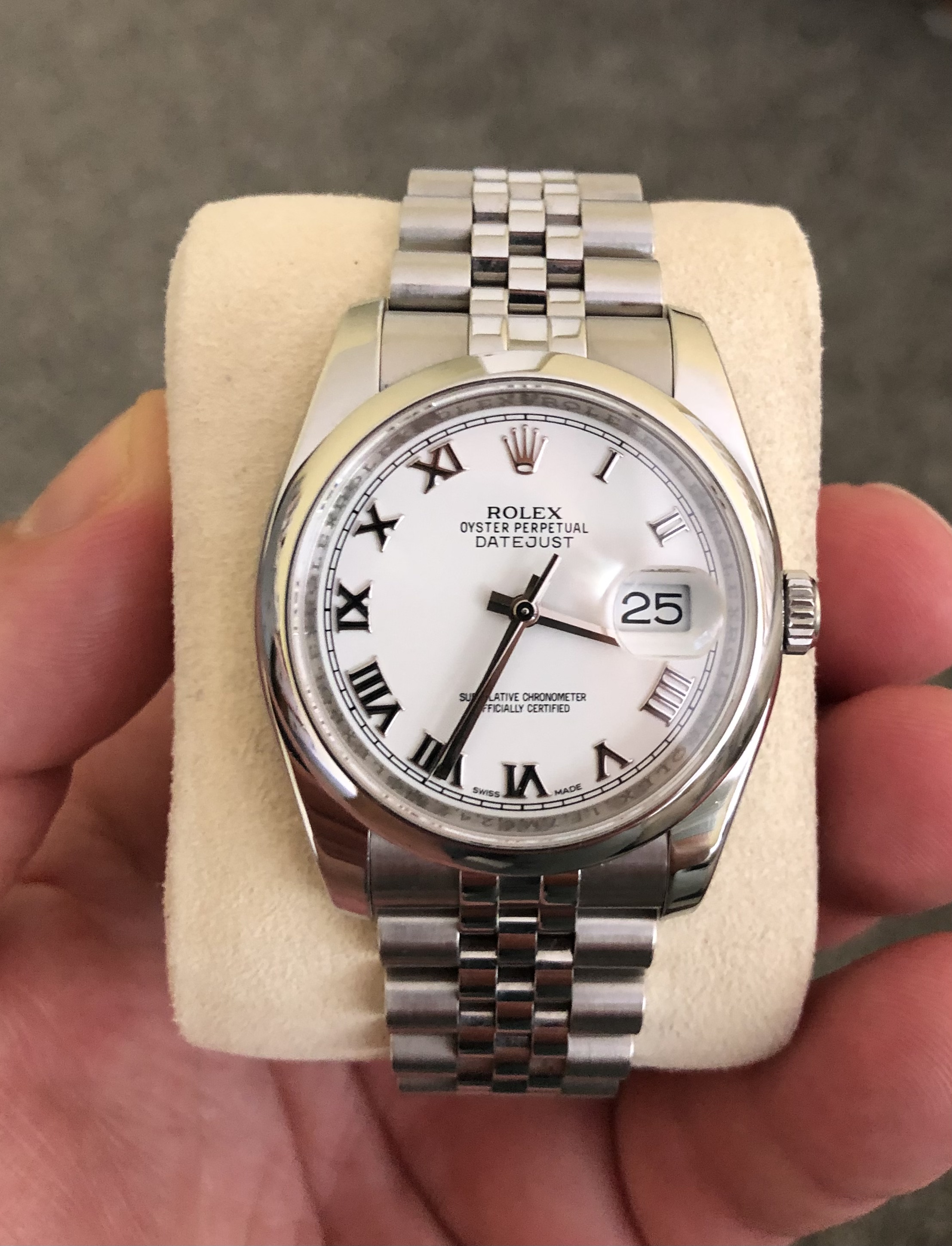 ·A stunning white dial DateJust 36mm from 2014, model 116200, Cal 3135, quick set with white gold Roman numerals and hands. Case in excellent condition. Has seen a polish in its life but still beautiful and priced to reflect this. Smooth bezel with no scratches. Scratch free sapphire crystal. Jubilee bracelet with concealed clasp in excellent condition. Spare link, full box and papers and swing tags.