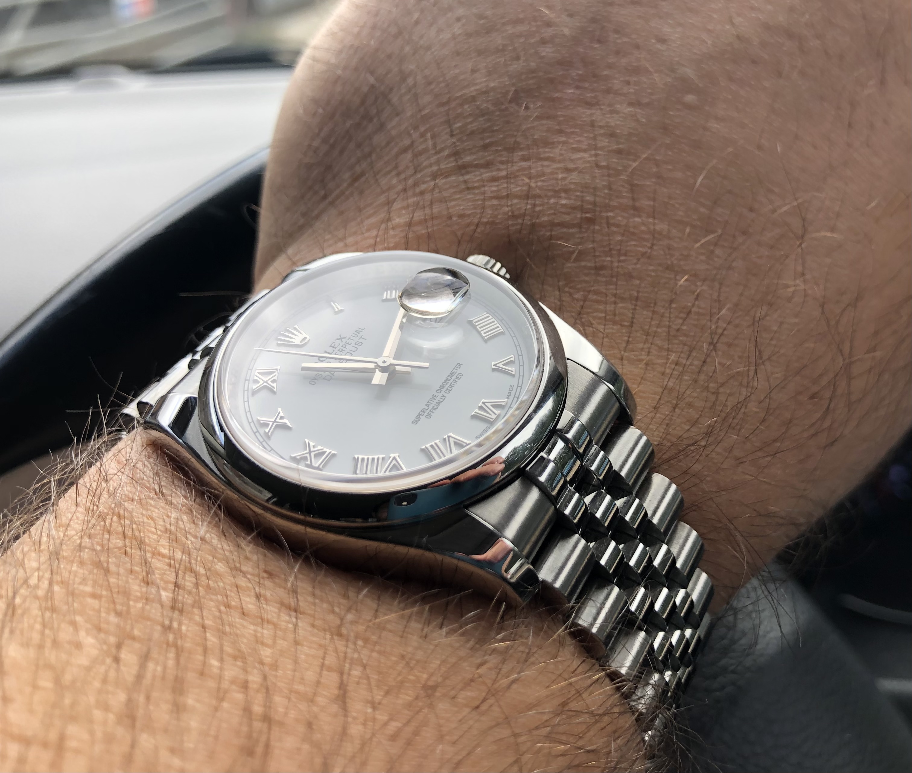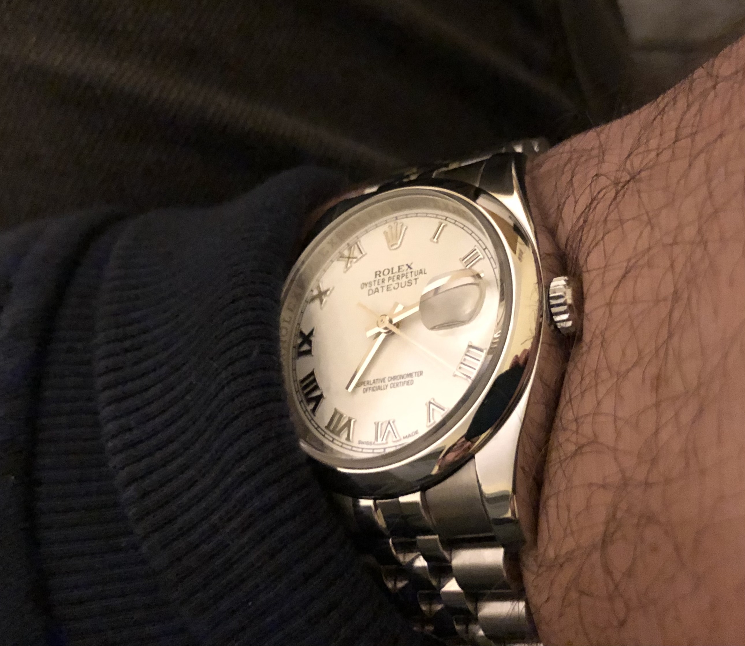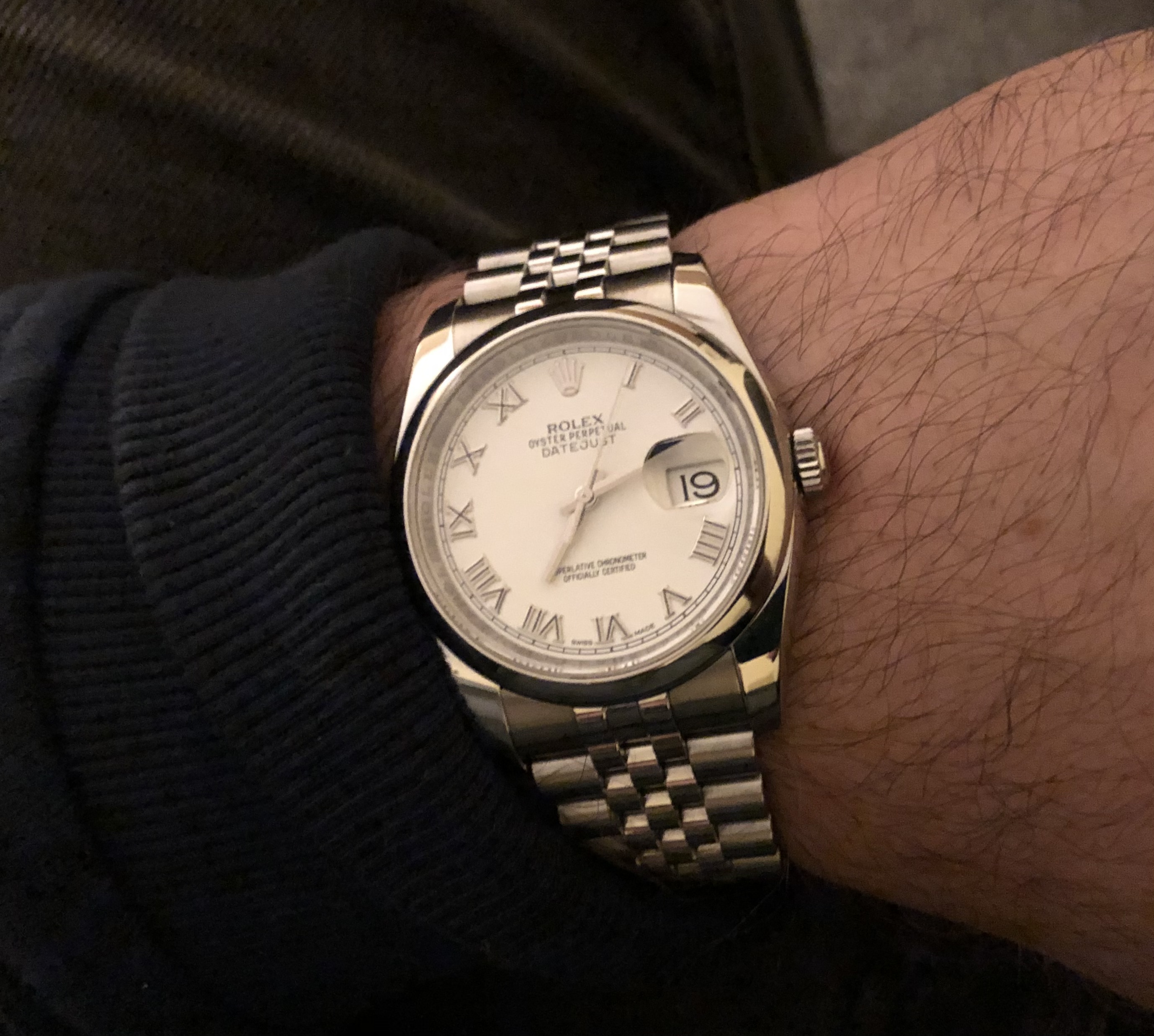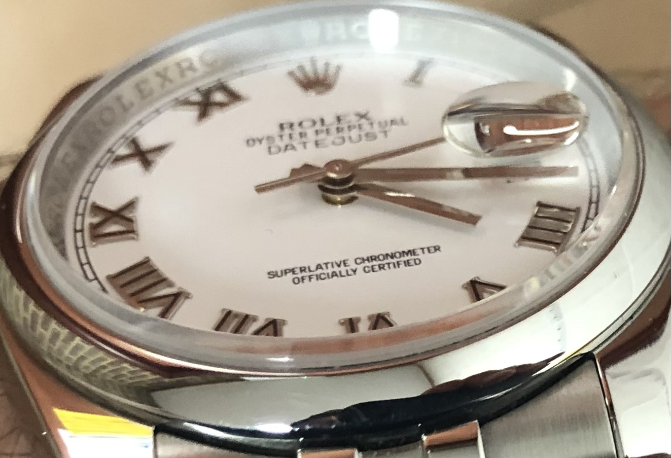 ·A stunning white dial DateJust 36mm from 2014, model 116200, Cal 3135, quick set with white gold Roman numerals and hands. Case in excellent condition. Has seen a polish in its life but still beautiful and priced to reflect this. Smooth bezel with no scratches. Scratch free sapphire crystal. Jubilee bracelet with concealed clasp in excellent condition. Spare link, full box and papers and swing tags.