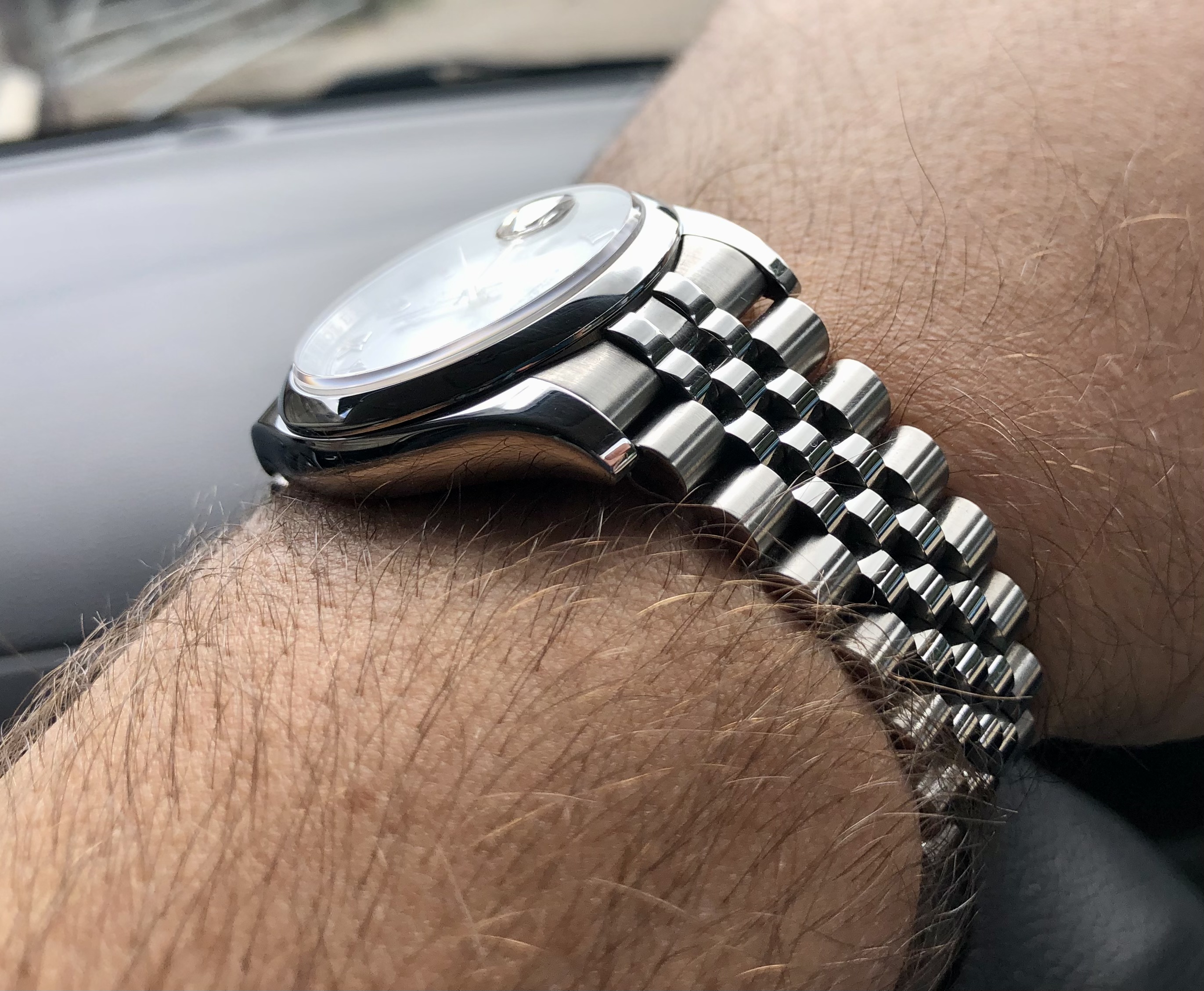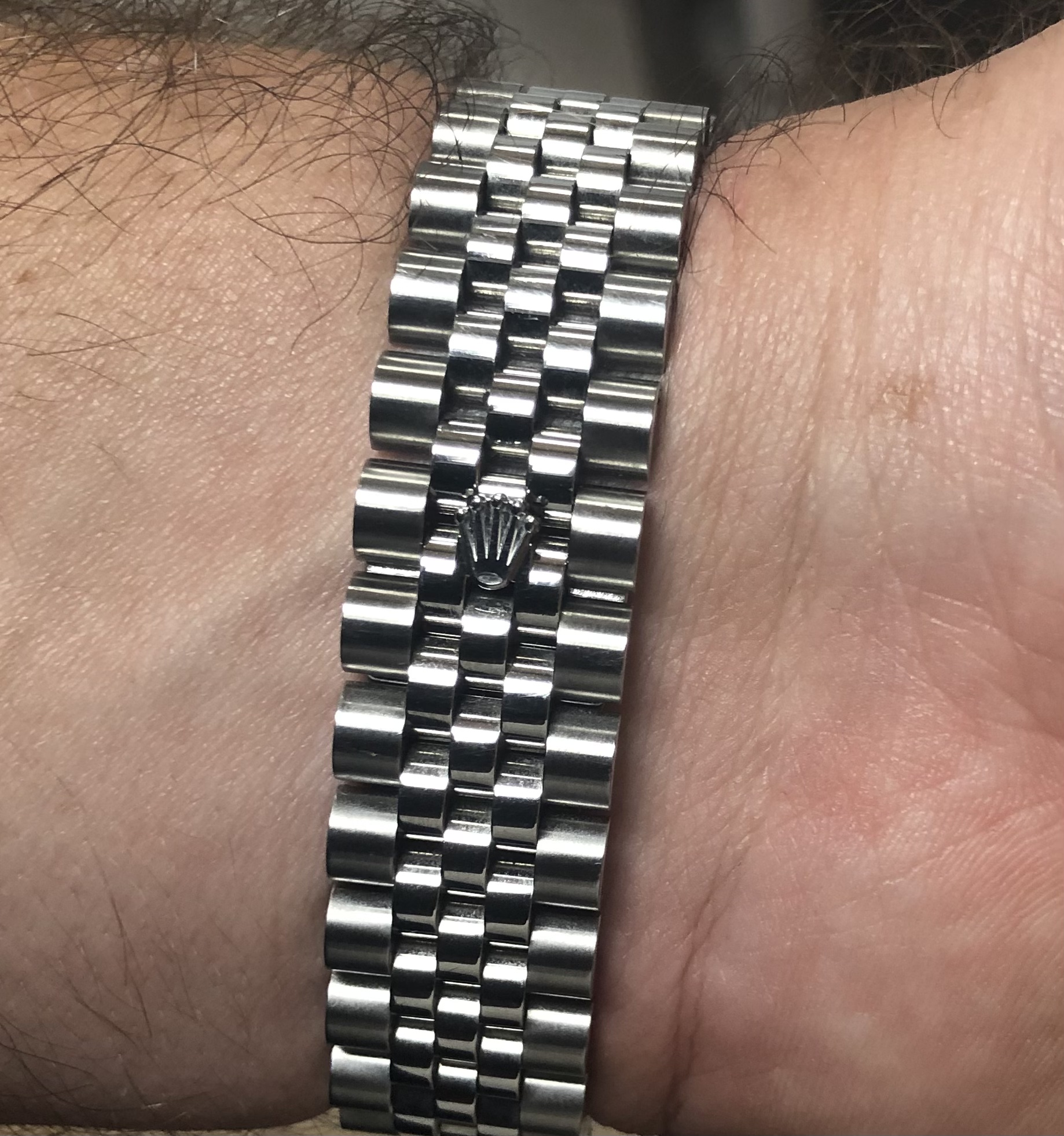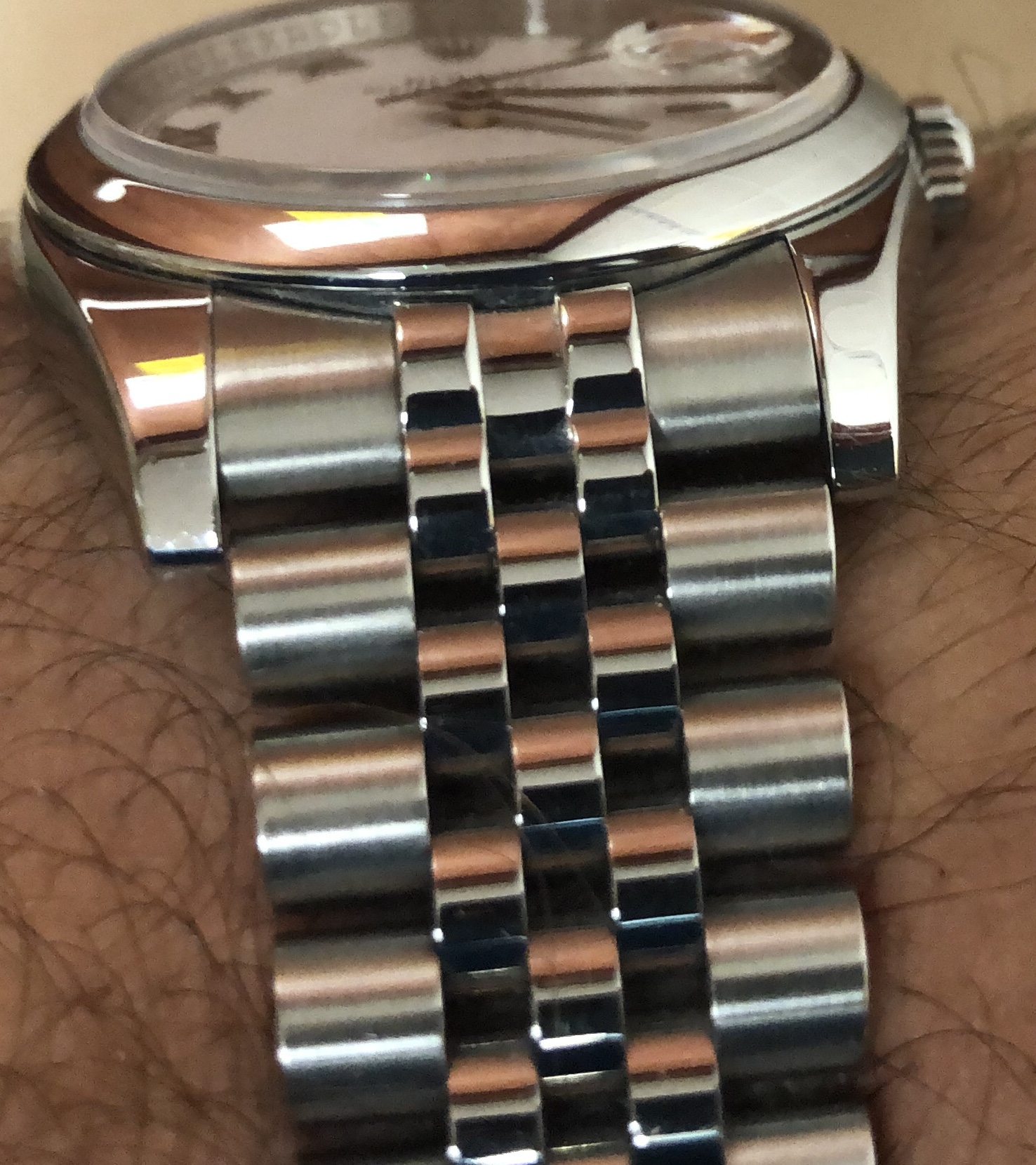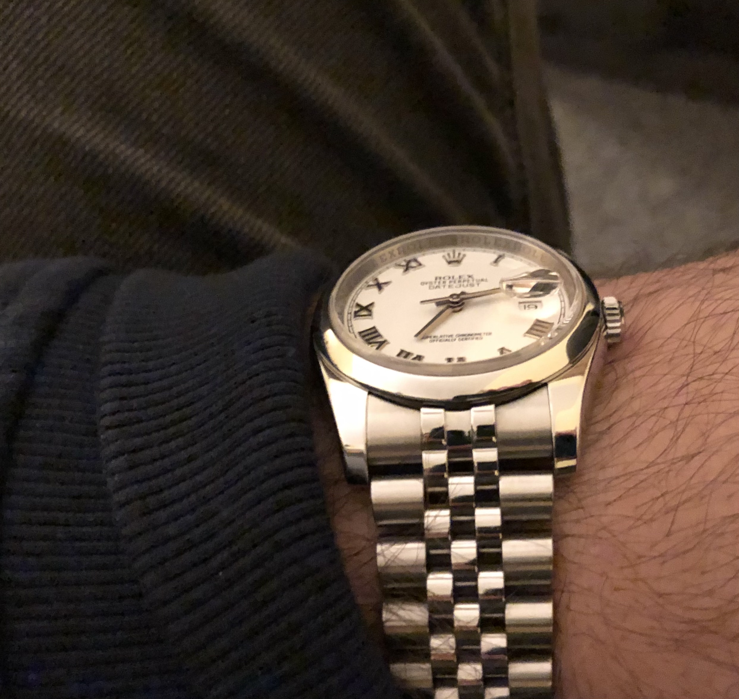 ·A stunning white dial DateJust 36mm from 2014, model 116200, Cal 3135, quick set with white gold Roman numerals and hands. Case in excellent condition. Has seen a polish in its life but still beautiful and priced to reflect this. Smooth bezel with no scratches. Scratch free sapphire crystal. Jubilee bracelet with concealed clasp in excellent condition. Spare link, full box and papers and swing tags.
