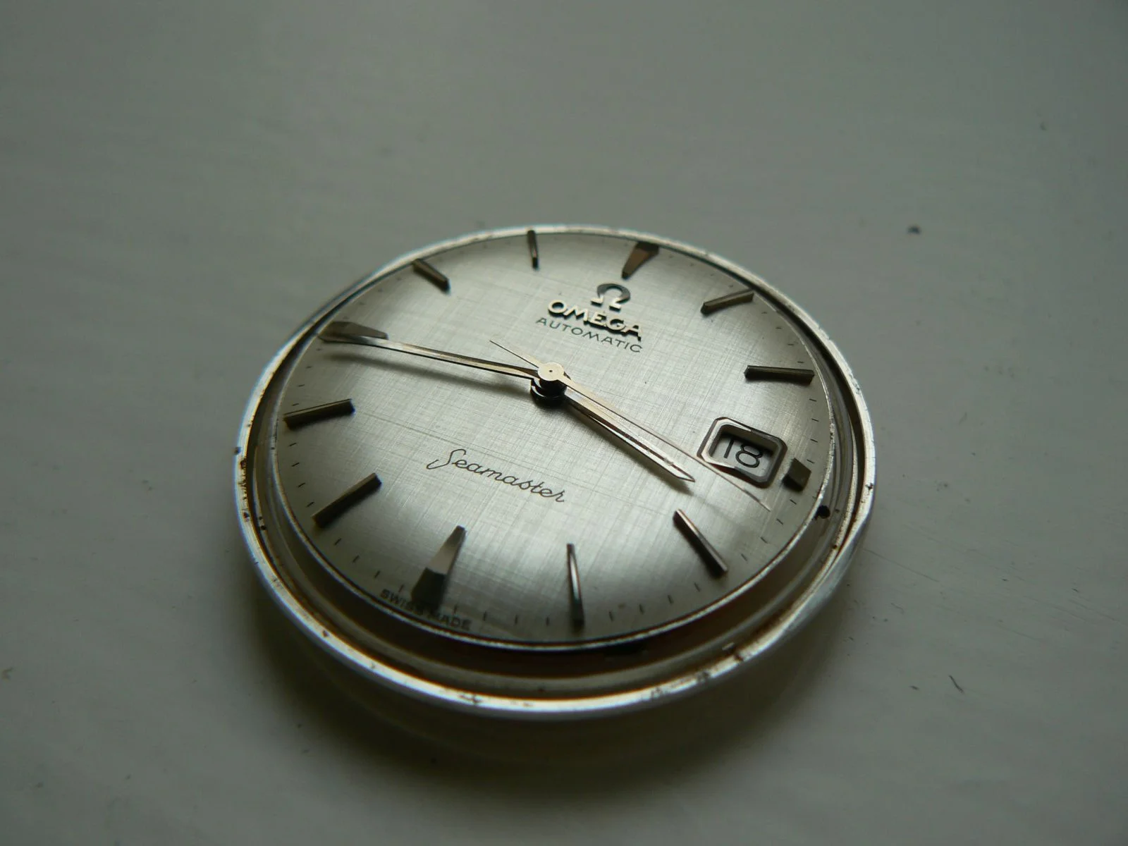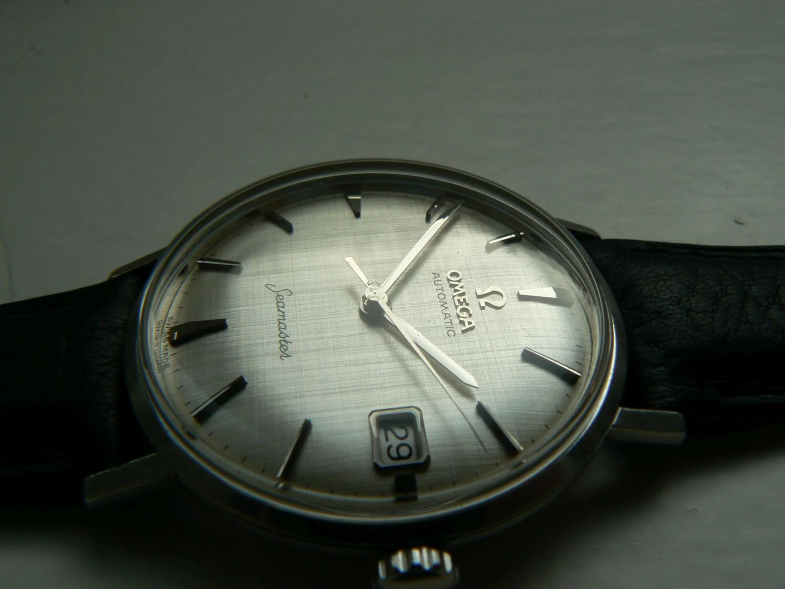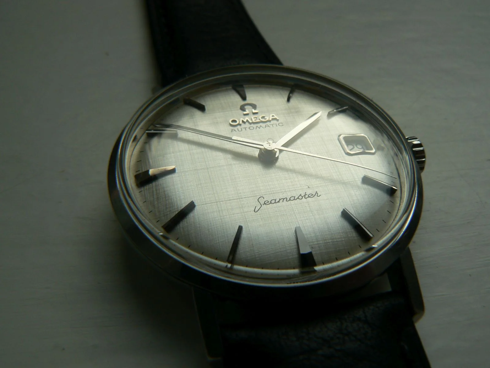 The dial is white colored in good condition with rare texture effect, so-called "linen dial", silver colored raised indices, and hands. Original Omega crown and new original Omega glass are fitted.