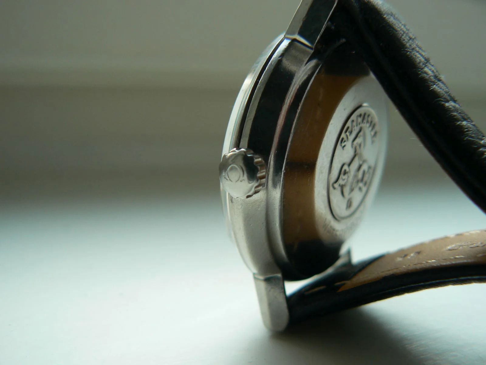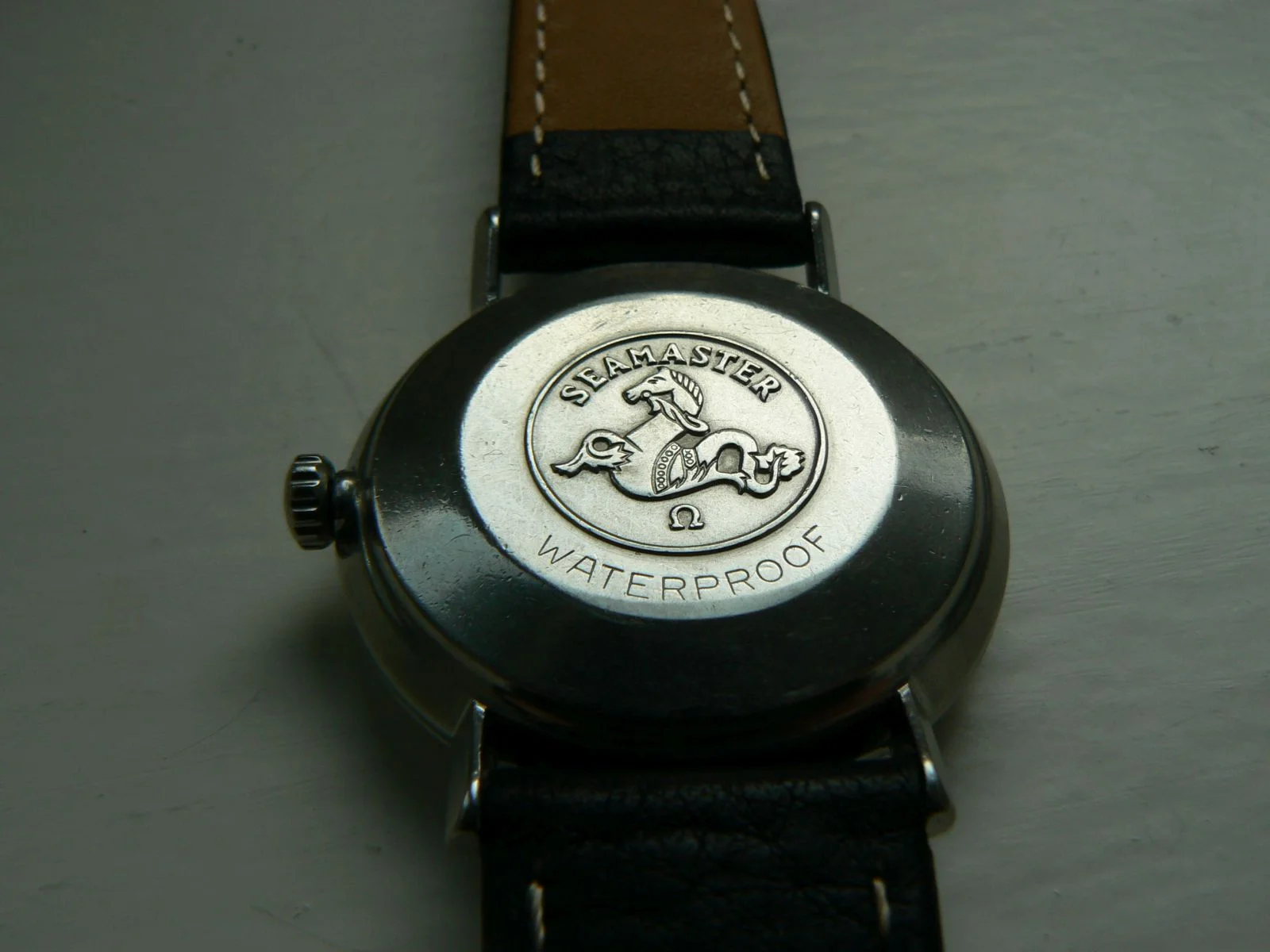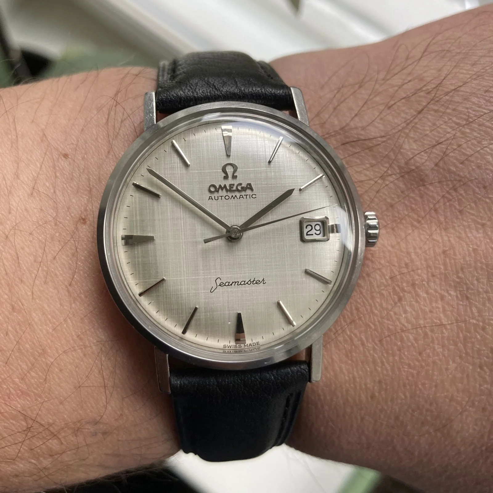 The dial is white colored in good condition with rare texture effect, so-called "linen dial", silver colored raised indices, and hands. Original Omega crown and new original Omega glass are fitted.