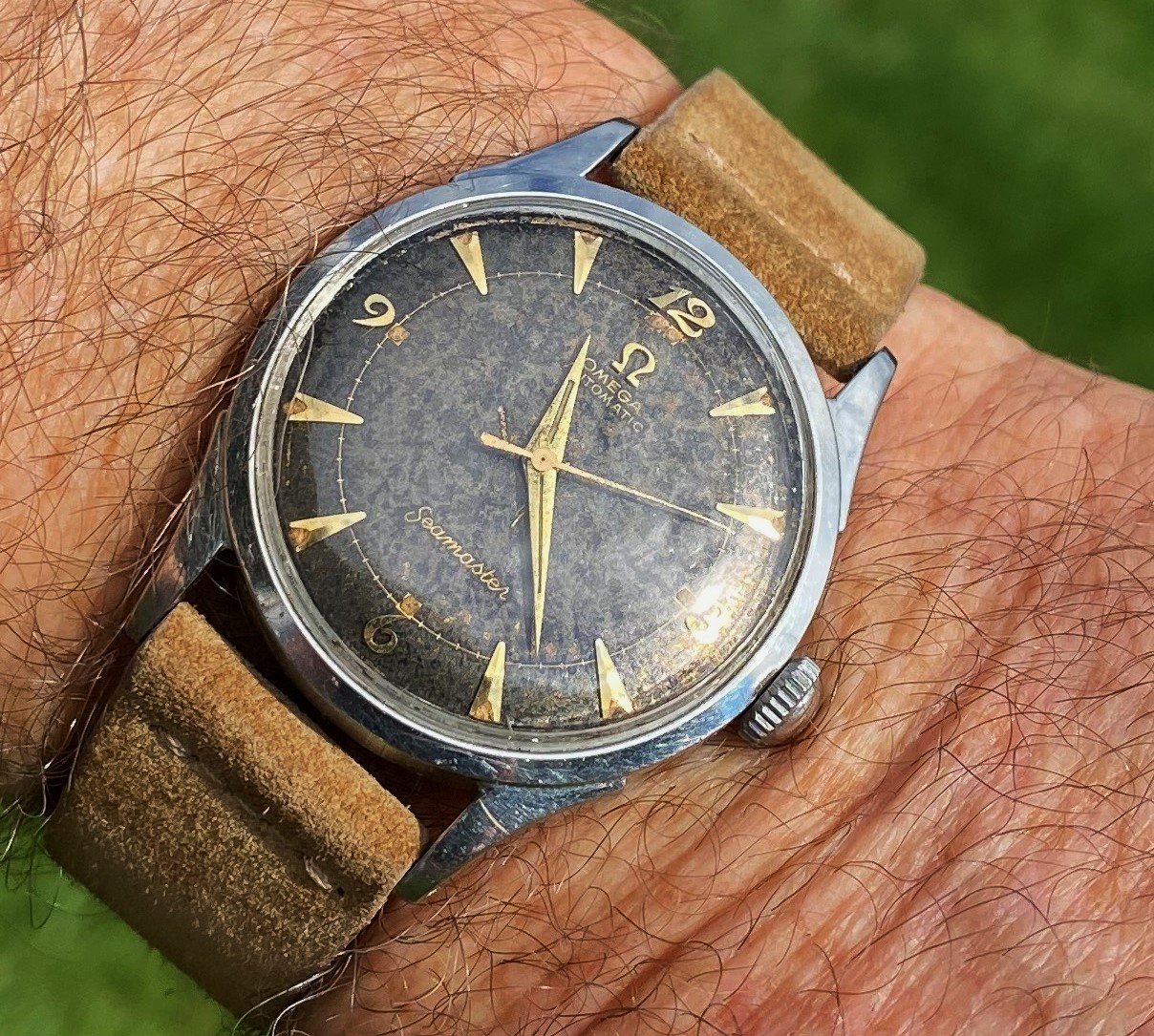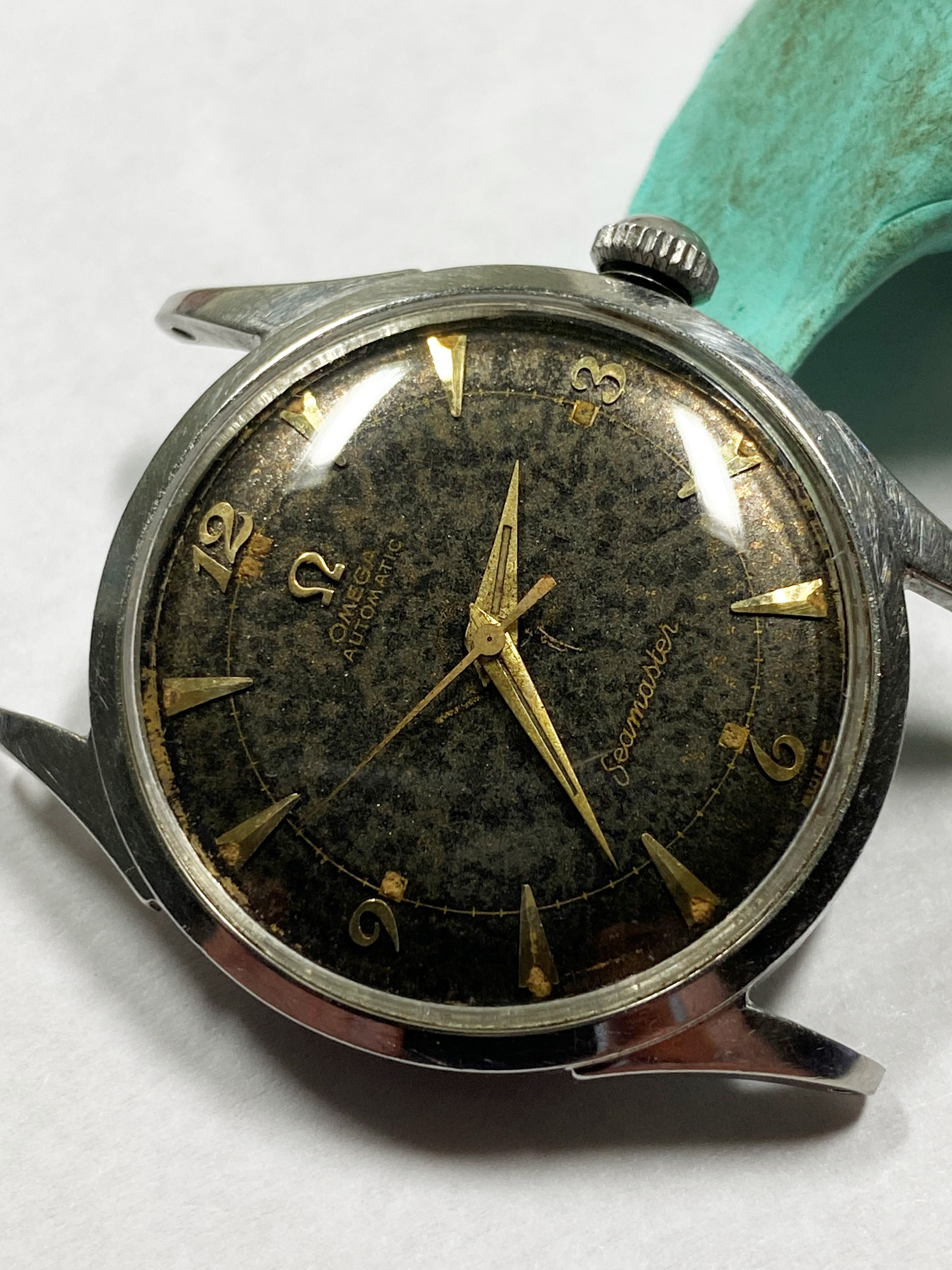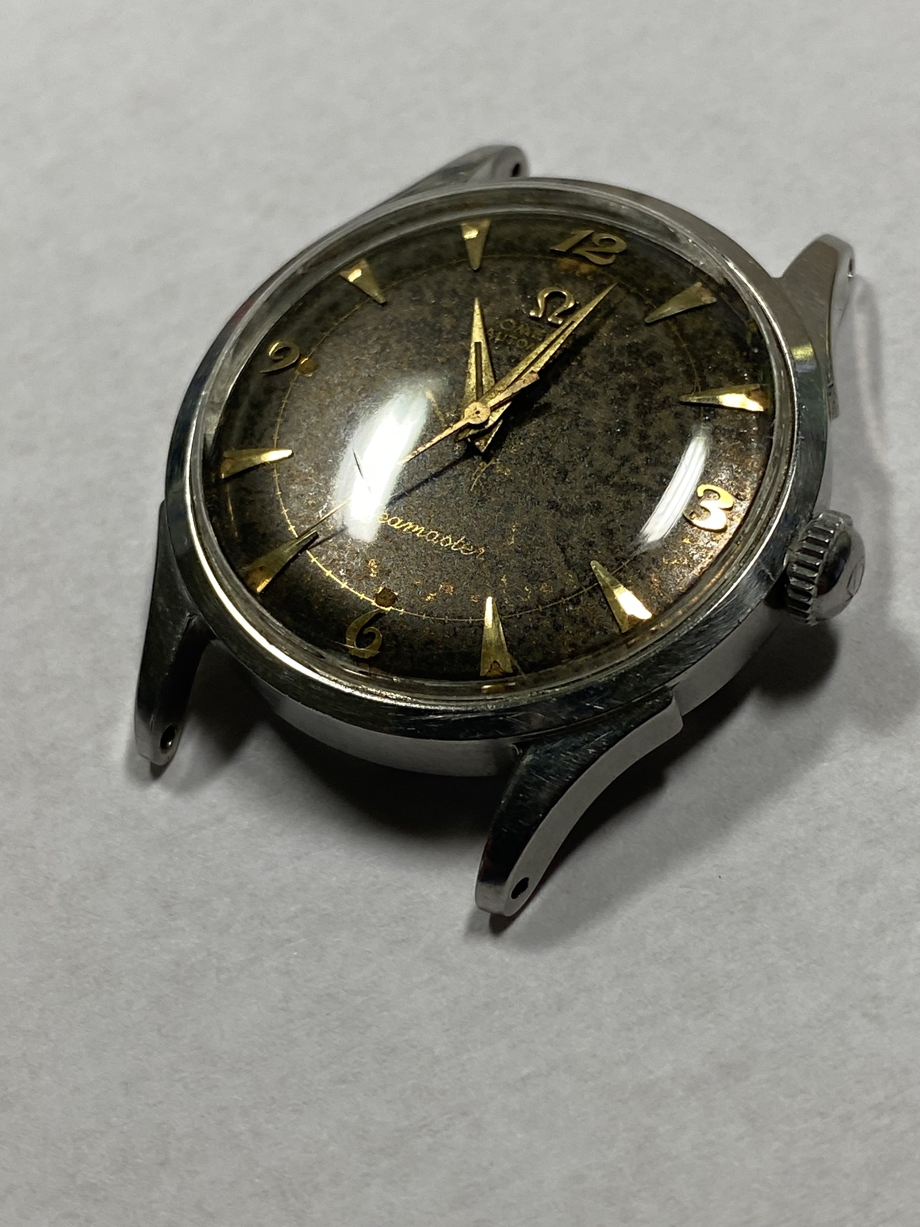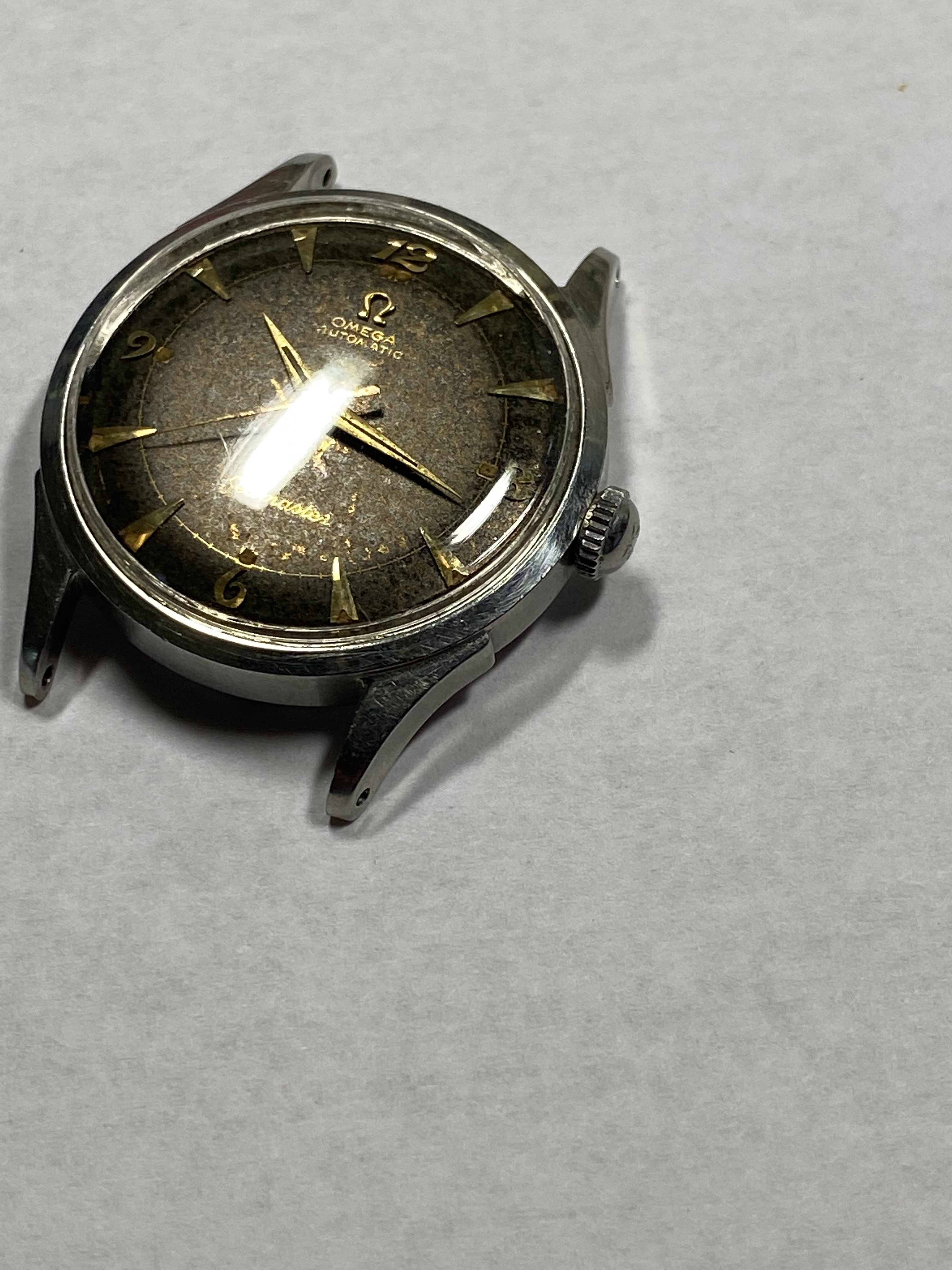 Case: Chamfers are sharp. Plenty of superficial scuffing but nothing egregious. Crown appears original. Crystal probably a replacement as I cannot find the Omega logo in the center.