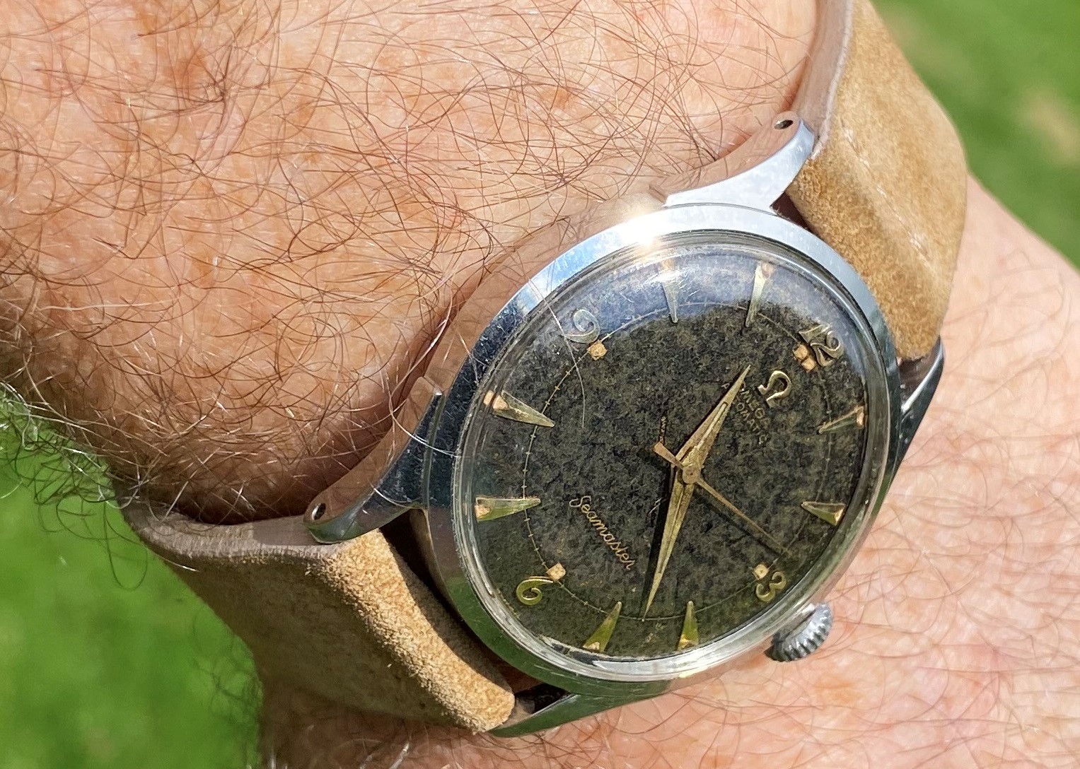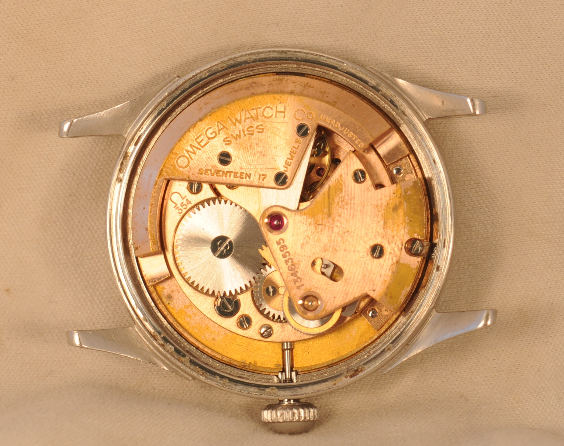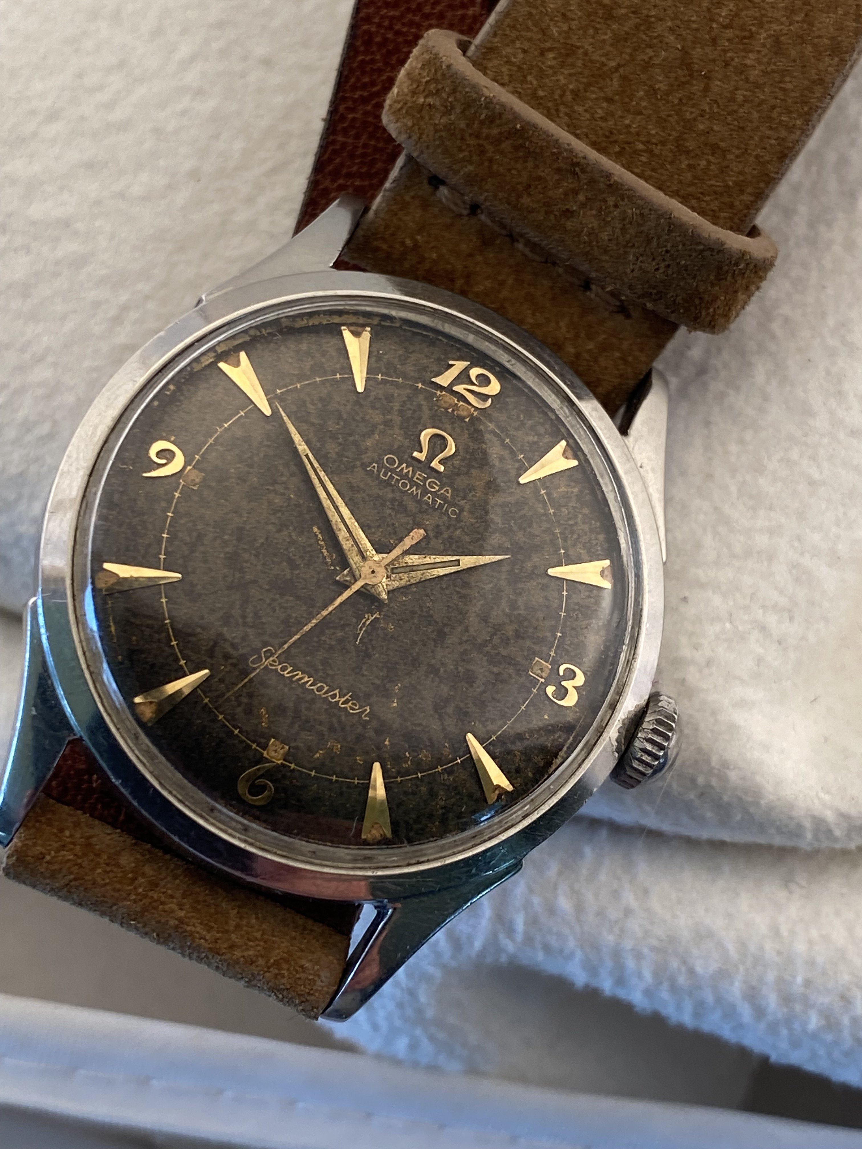 Case: Chamfers are sharp. Plenty of superficial scuffing but nothing egregious. Crown appears original. Crystal probably a replacement as I cannot find the Omega logo in the center.