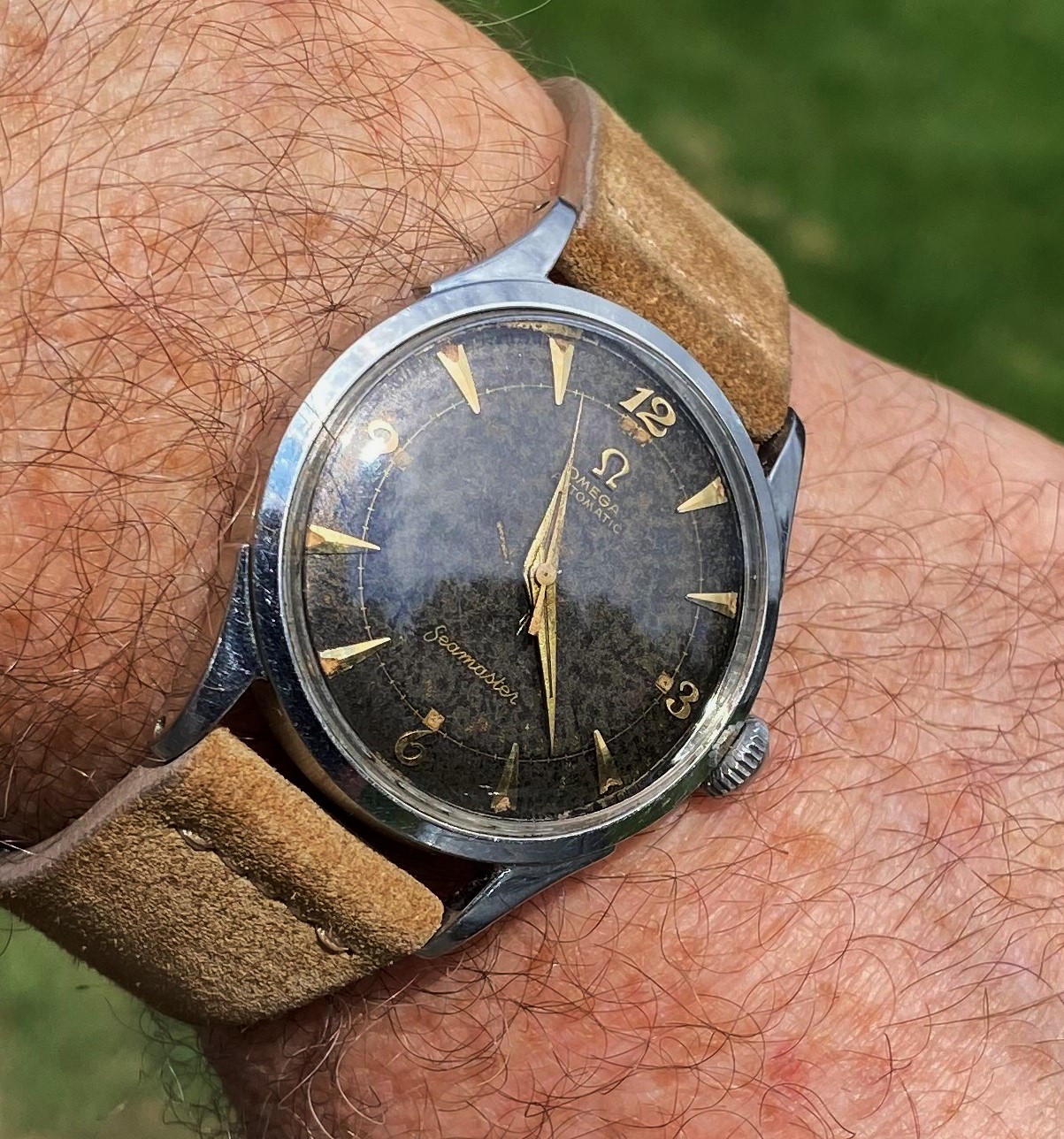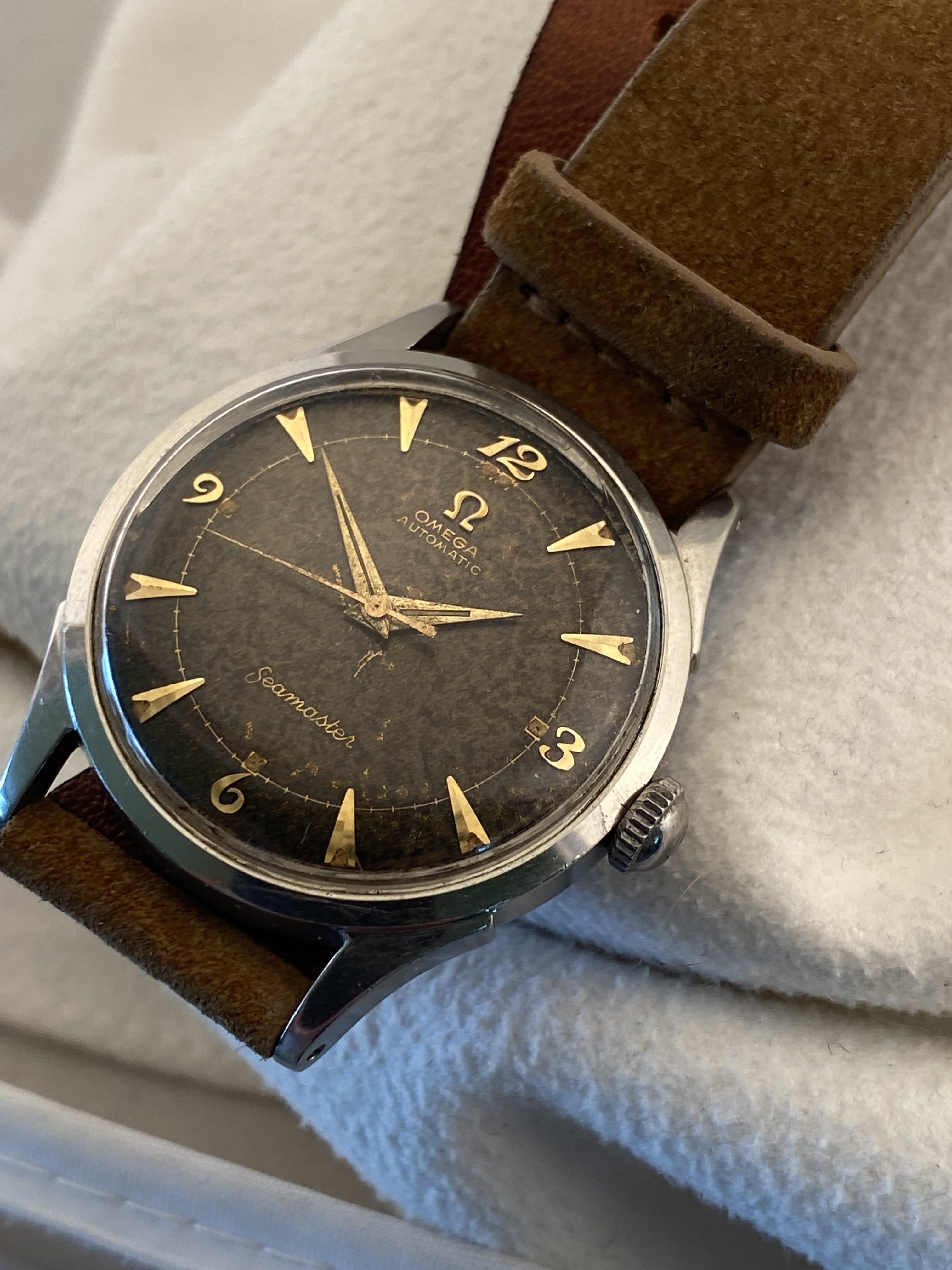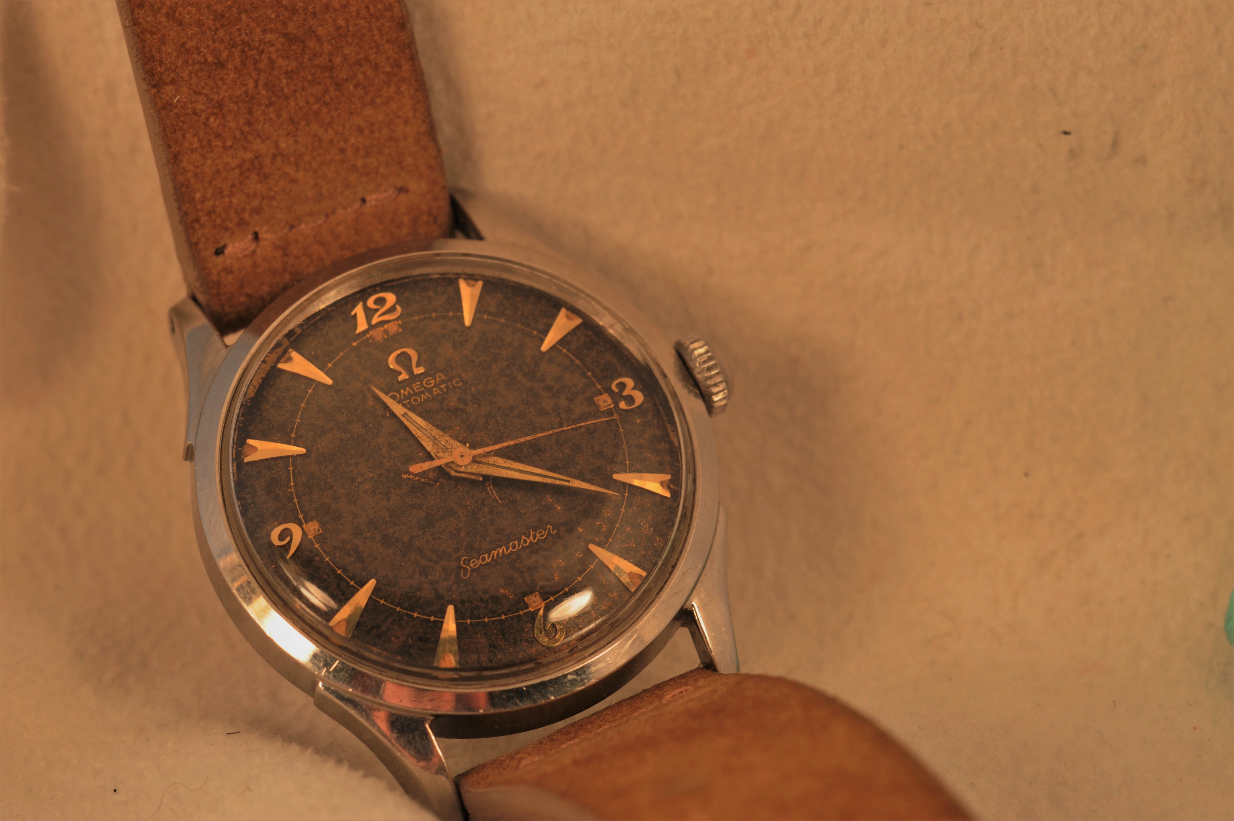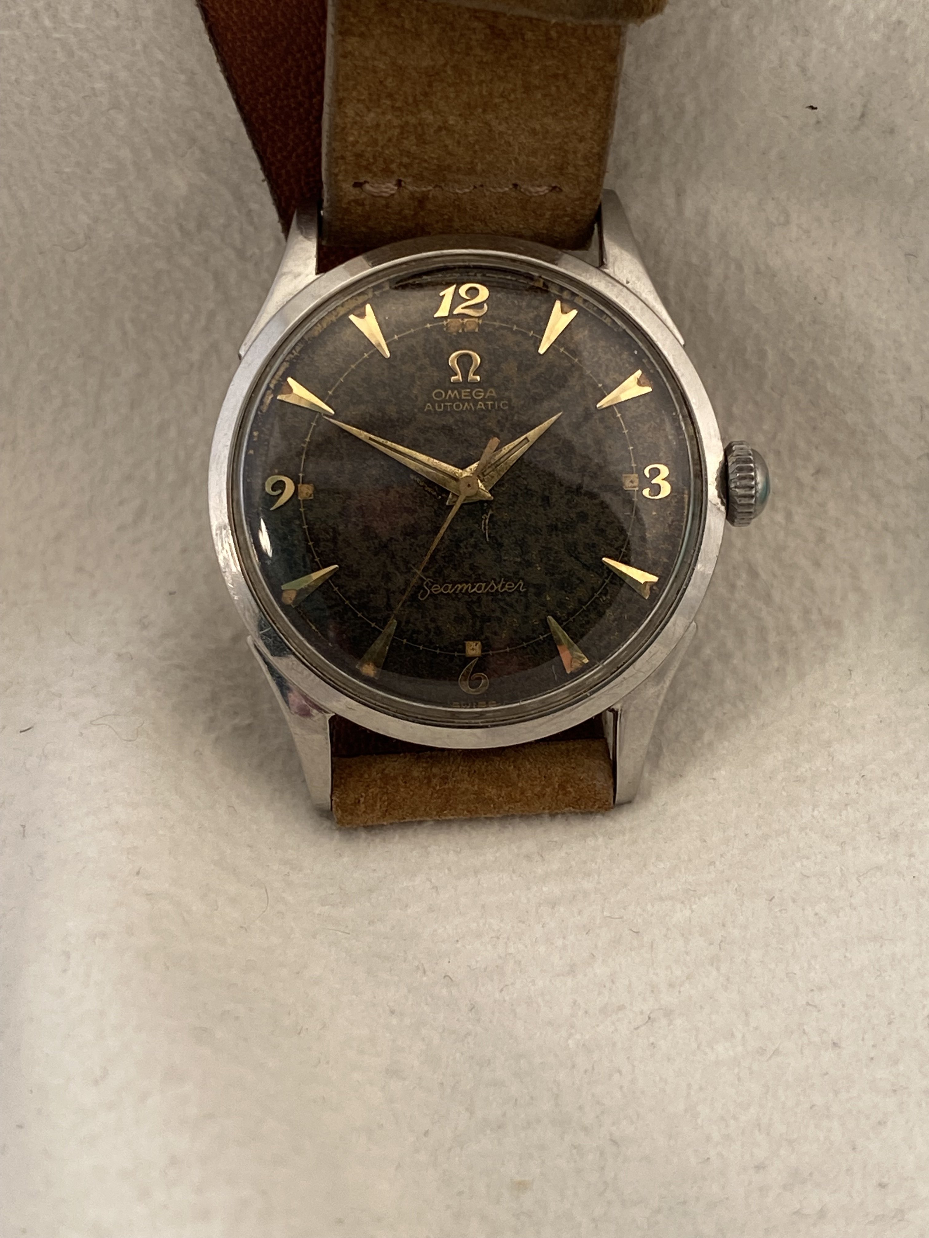 Case: Chamfers are sharp. Plenty of superficial scuffing but nothing egregious. Crown appears original. Crystal probably a replacement as I cannot find the Omega logo in the center.