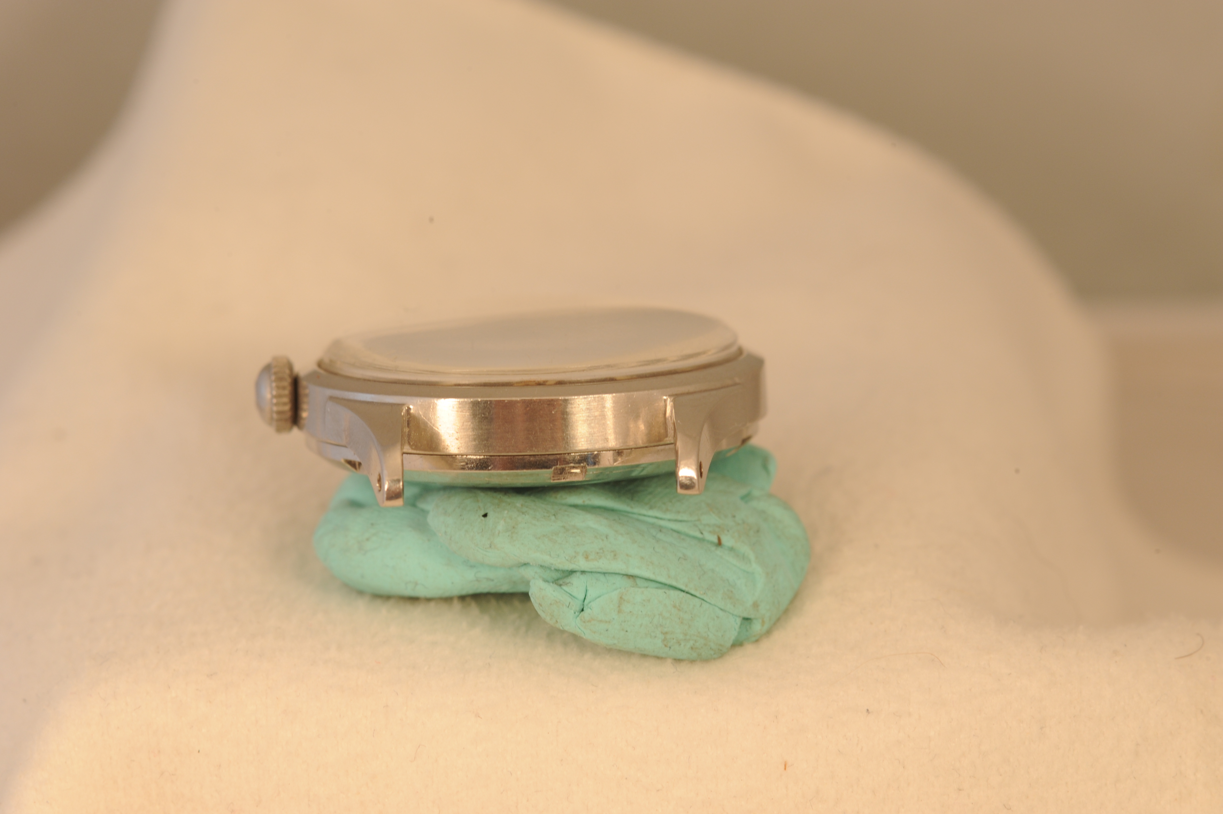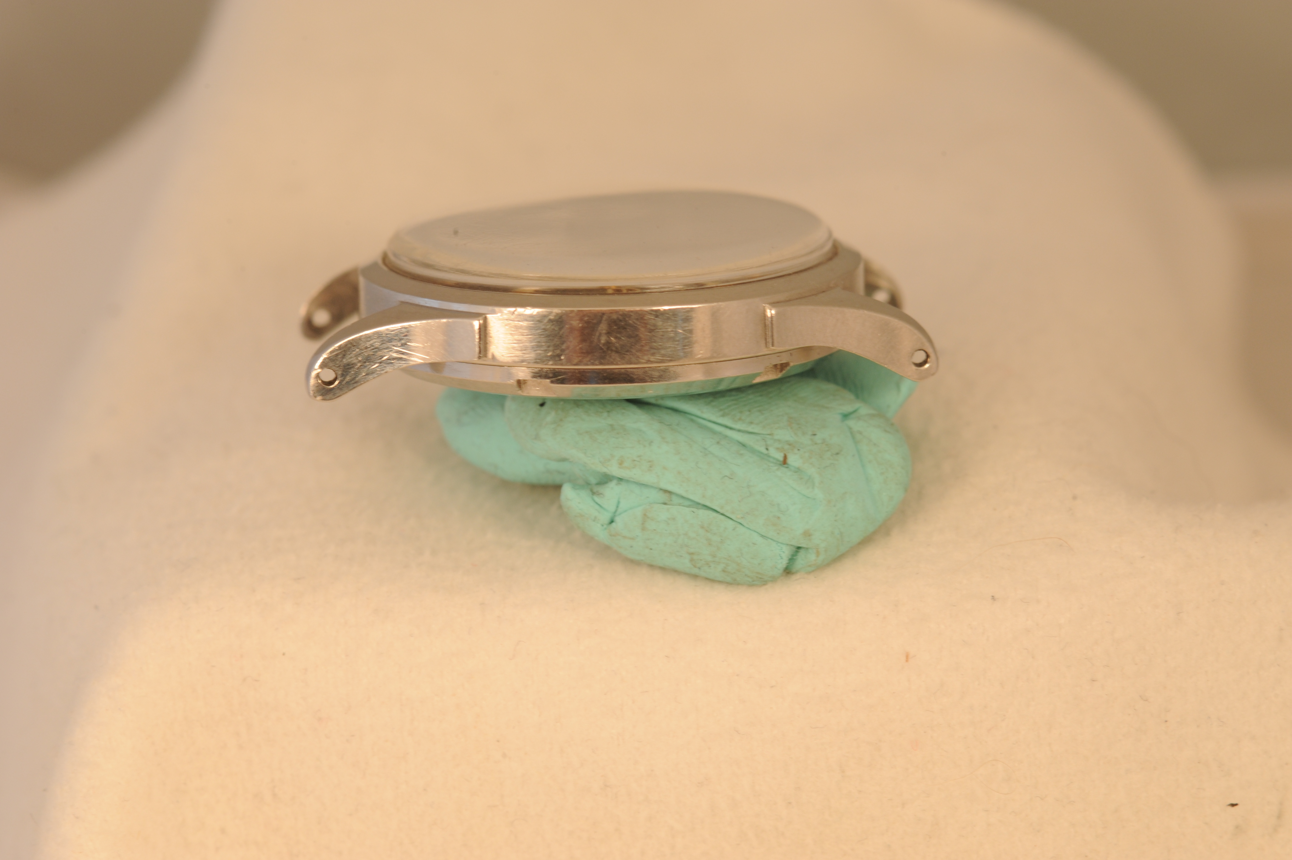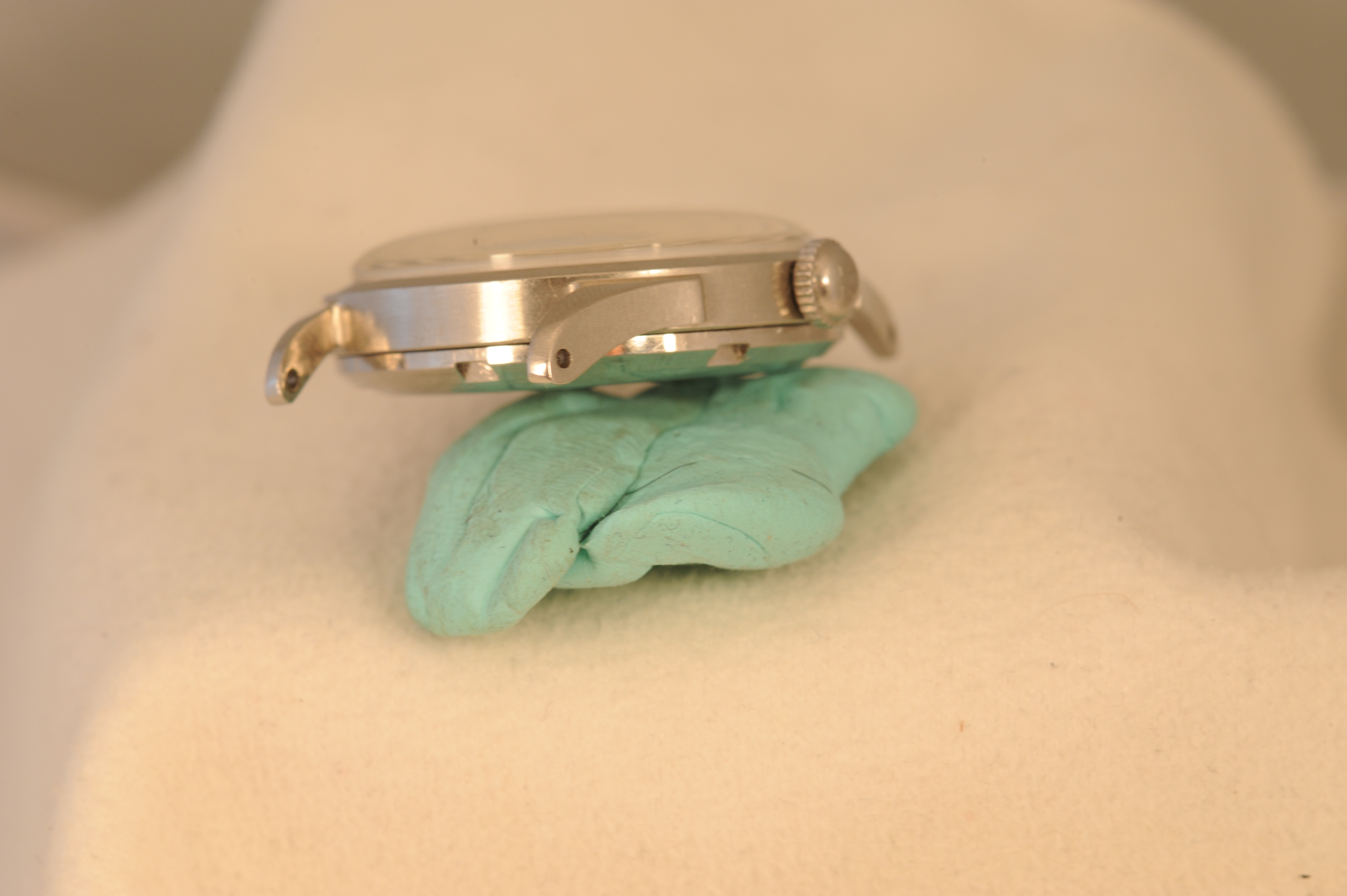 Dial: Stunning and appears nearly flawless when viewing from straight on. I have shown it in different angles and lighting to outline the scrapes in the lacquer that go down to the gilt. These are at the bottom of the dial and are easily seen under high magnification and the right angle. They literally disappear when viewed with naked eye. There are two small scrapes near the hand stack which can be seen under loupe and at different angles, one at 9:00 the other at 5:30. They can be seen with naked eye, but are tiny, and are greatly amplified int the pics, and in no way detract from the appearance of this dial. Lume plots intact. Lacquer loss noted at periphery of dial at 9:00 through 12:00. I guarantee this is invisible unless you are using loupe at the correct angle. All in all a simply gorgeous dial whose flaws are exaggerated in my pics..