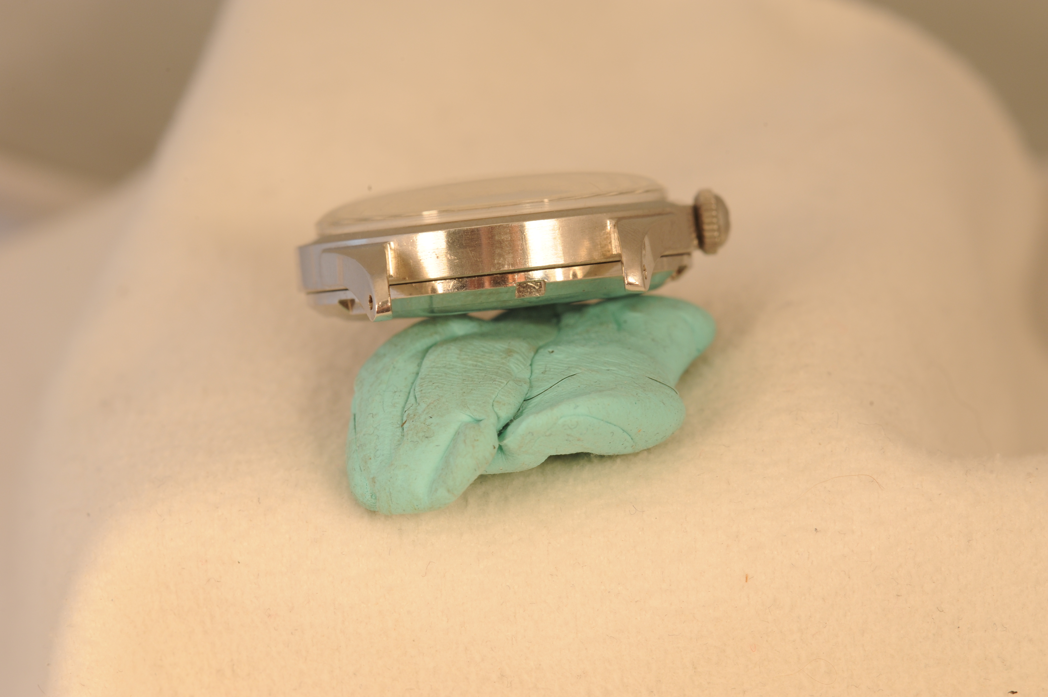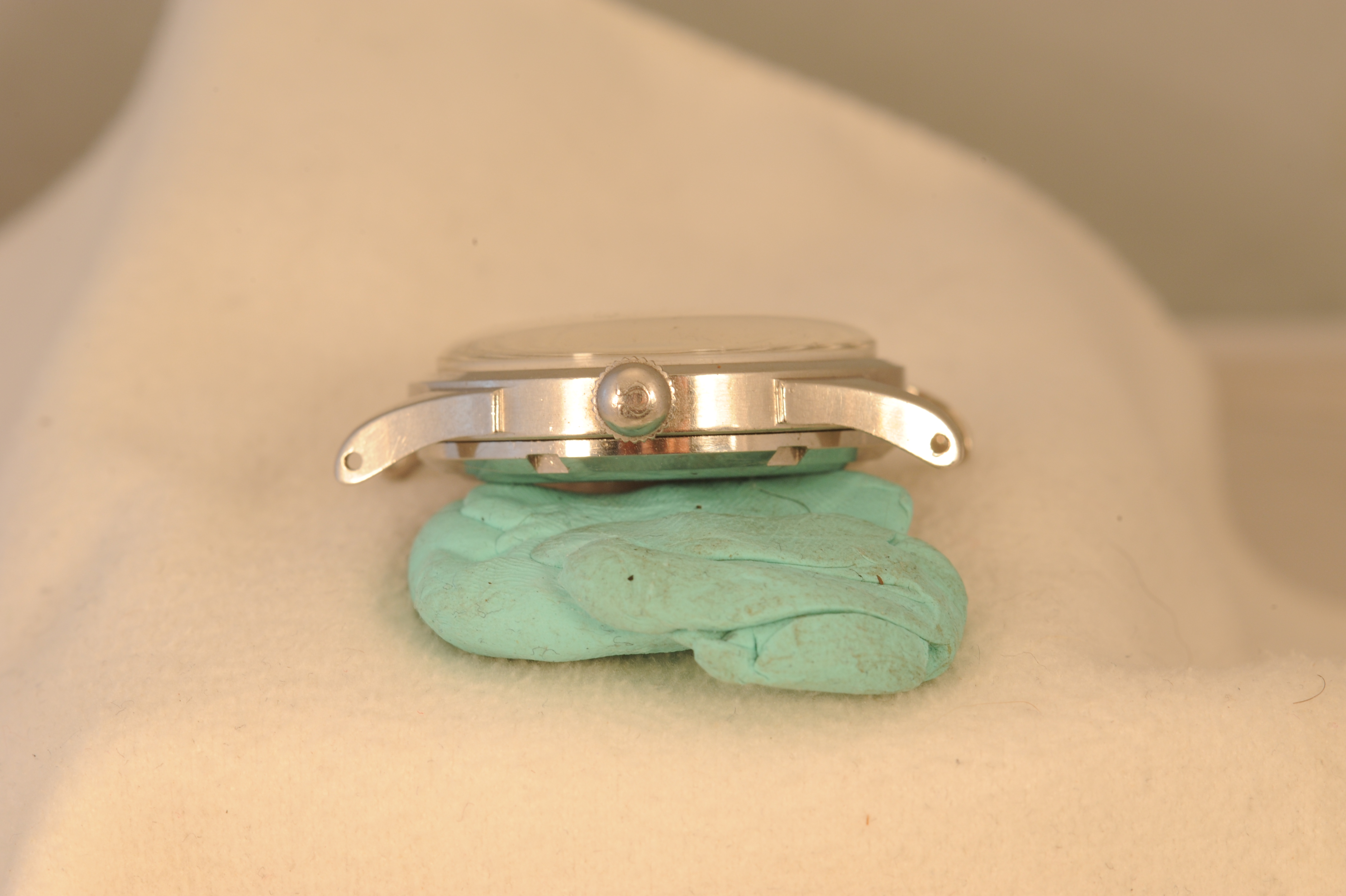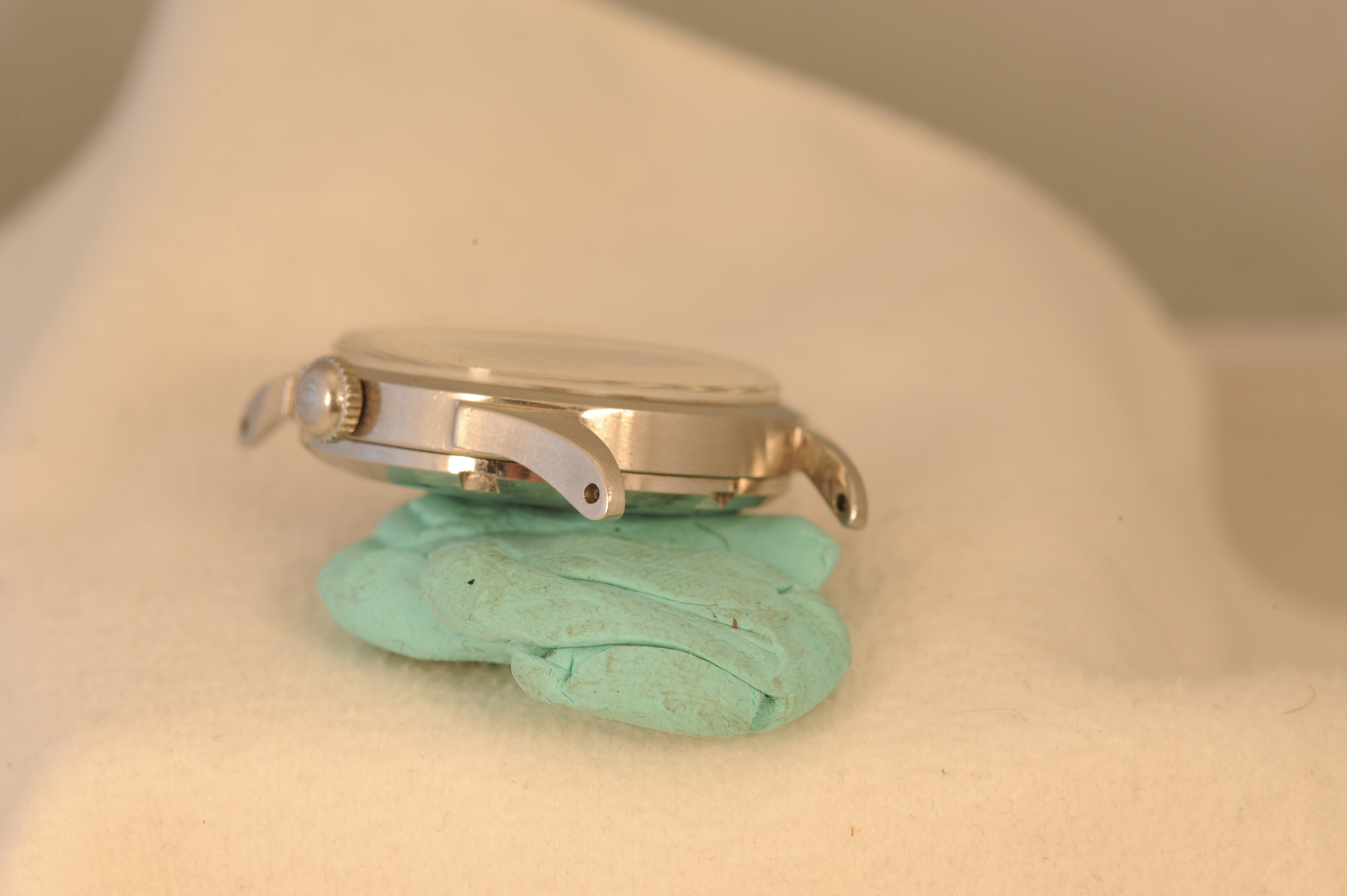 Dial: Stunning and appears nearly flawless when viewing from straight on. I have shown it in different angles and lighting to outline the scrapes in the lacquer that go down to the gilt. These are at the bottom of the dial and are easily seen under high magnification and the right angle. They literally disappear when viewed with naked eye. There are two small scrapes near the hand stack which can be seen under loupe and at different angles, one at 9:00 the other at 5:30. They can be seen with naked eye, but are tiny, and are greatly amplified int the pics, and in no way detract from the appearance of this dial. Lume plots intact. Lacquer loss noted at periphery of dial at 9:00 through 12:00. I guarantee this is invisible unless you are using loupe at the correct angle. All in all a simply gorgeous dial whose flaws are exaggerated in my pics..