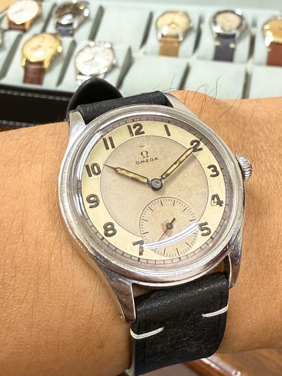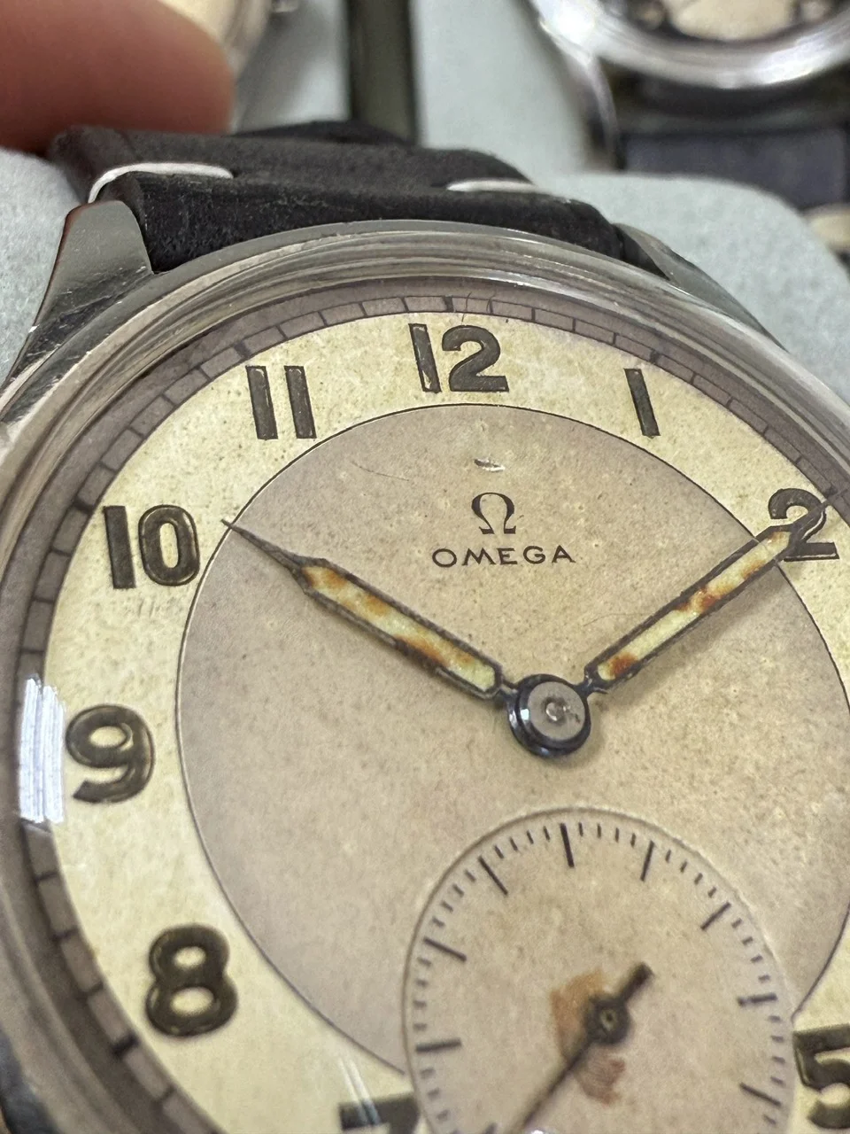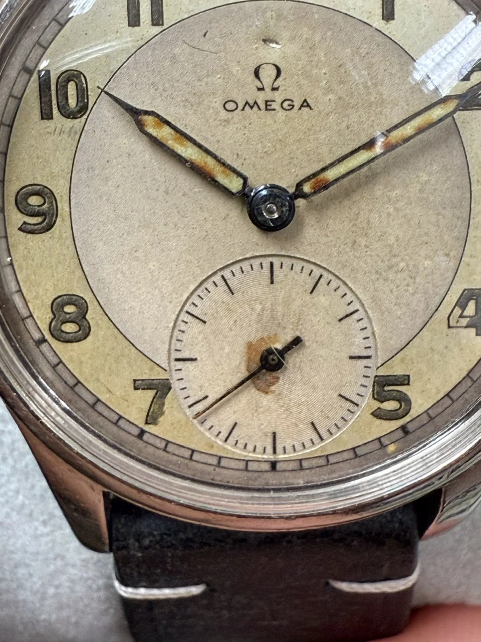 - Dial: Original two tones creamy dial; arabic hour markers with radium lume; syringe hands with lume (seems like original radium lume on hands has been replaced, the color of hands matches perfectly with the dial IMO). Small second at 6. There are two noticeable marks on the dial: one dent near the Omega logo and one stain at the small second hand.