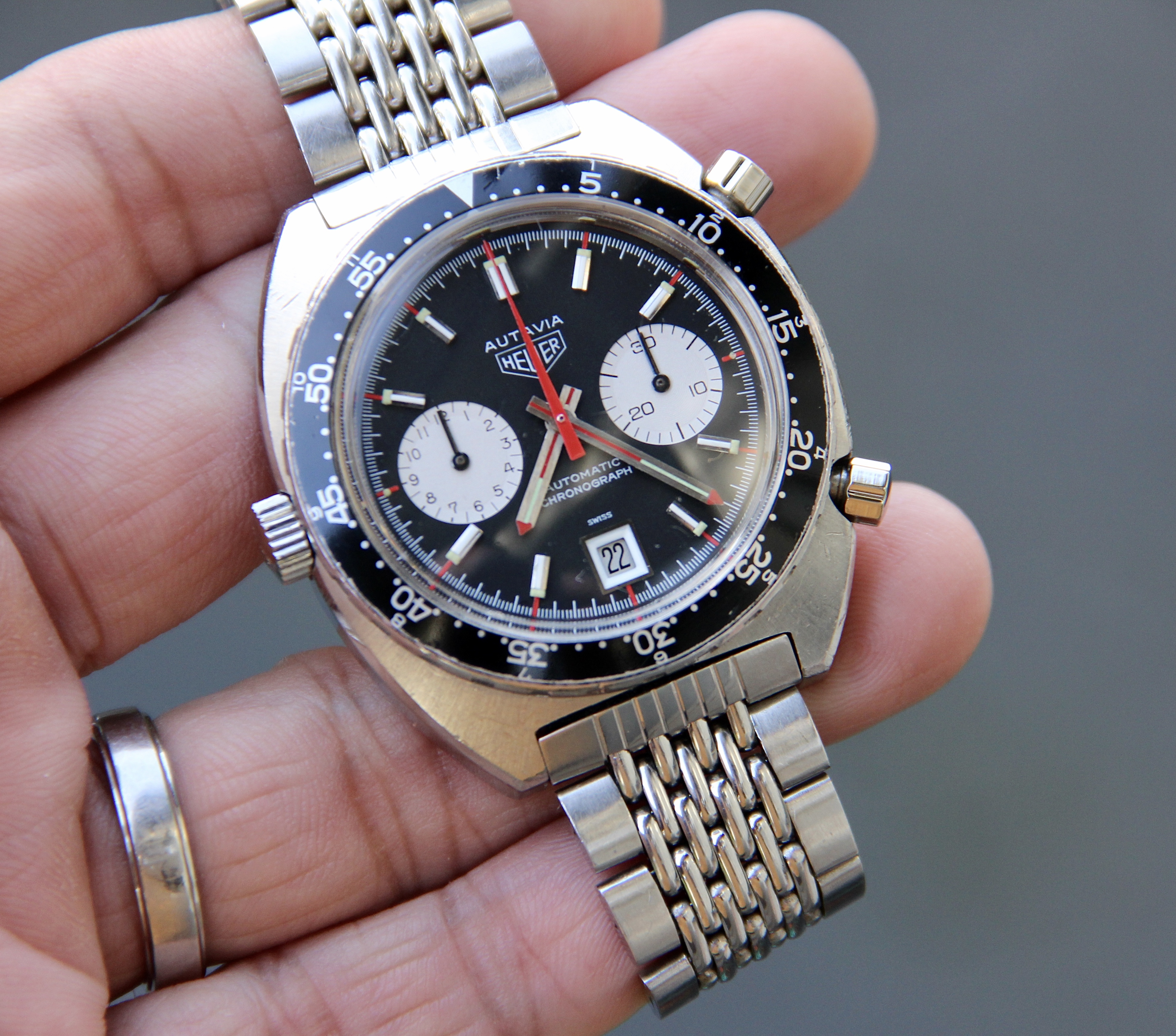 Up for sale today is my Heuer Autavia ref 1163 in stainless steel. This is a slightly earlier version as it precedes the more common Viceroy promotion model 1163V. The watch comes on its original and seldom seen Gay Freres bracelet.