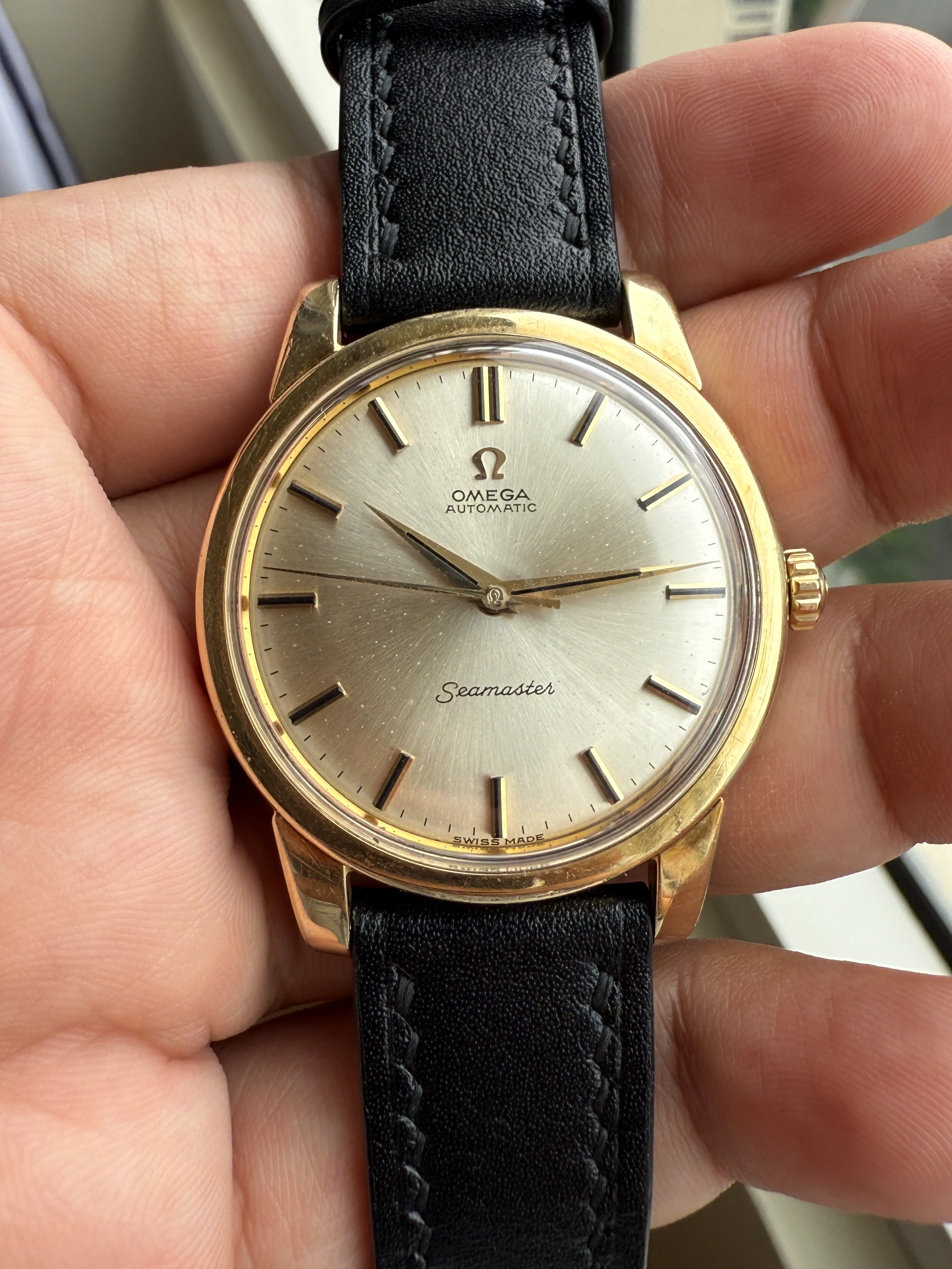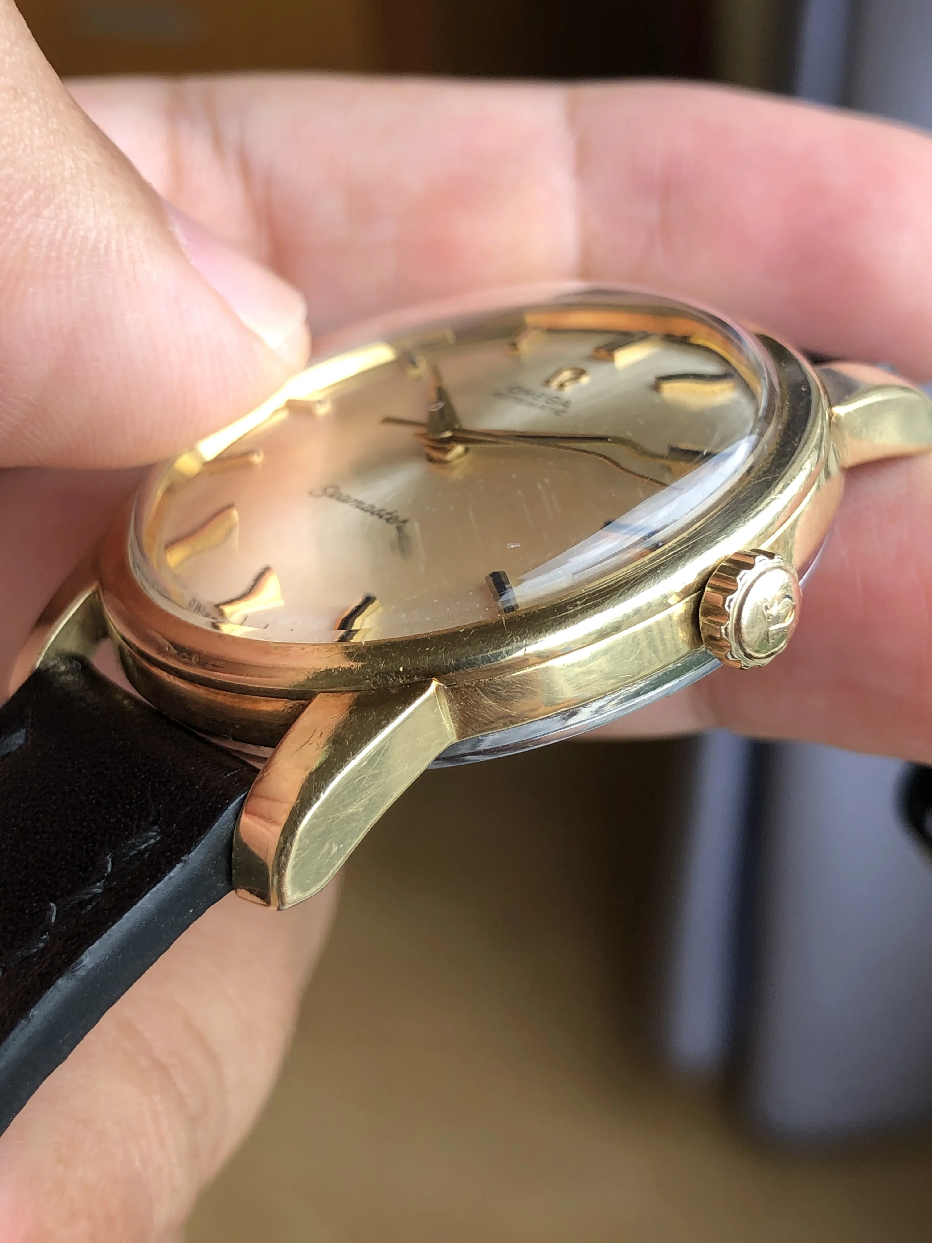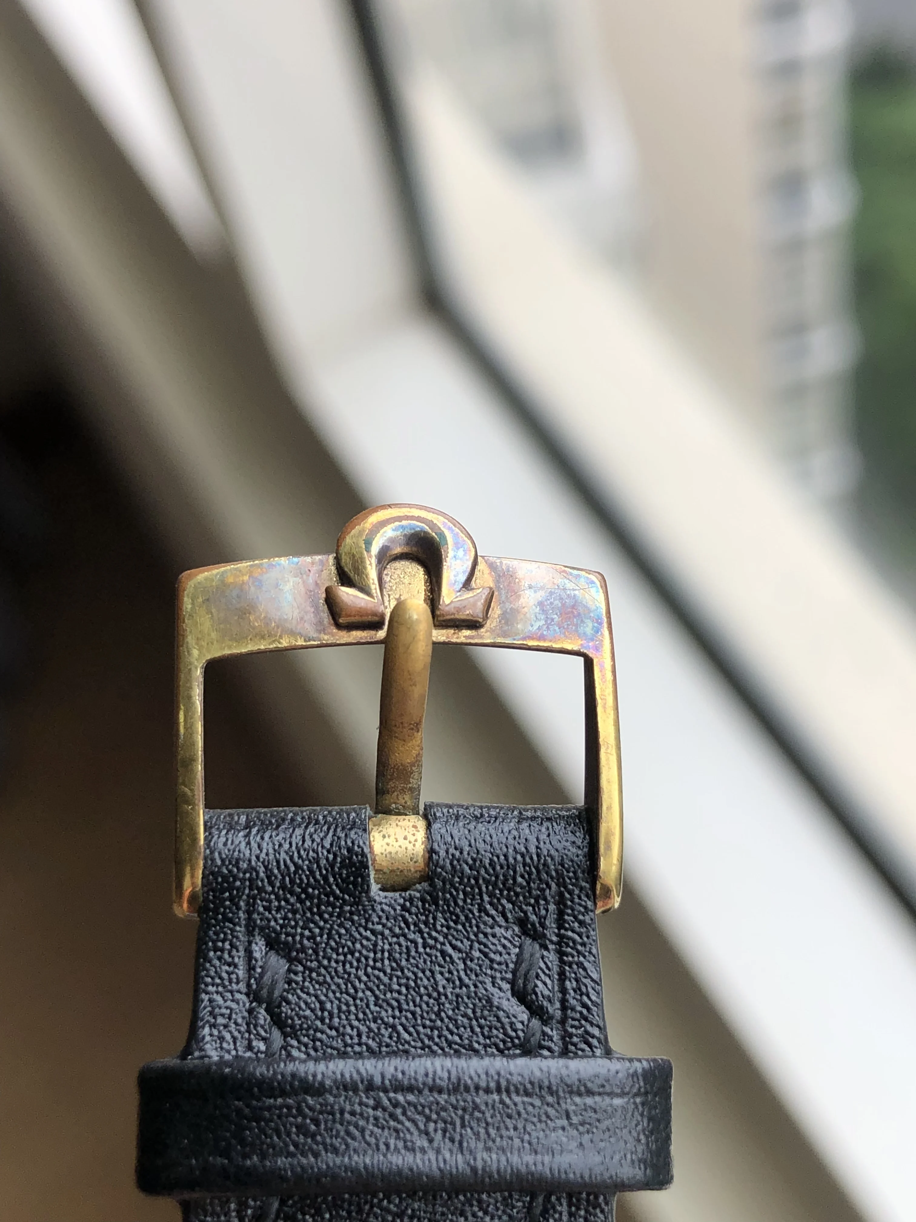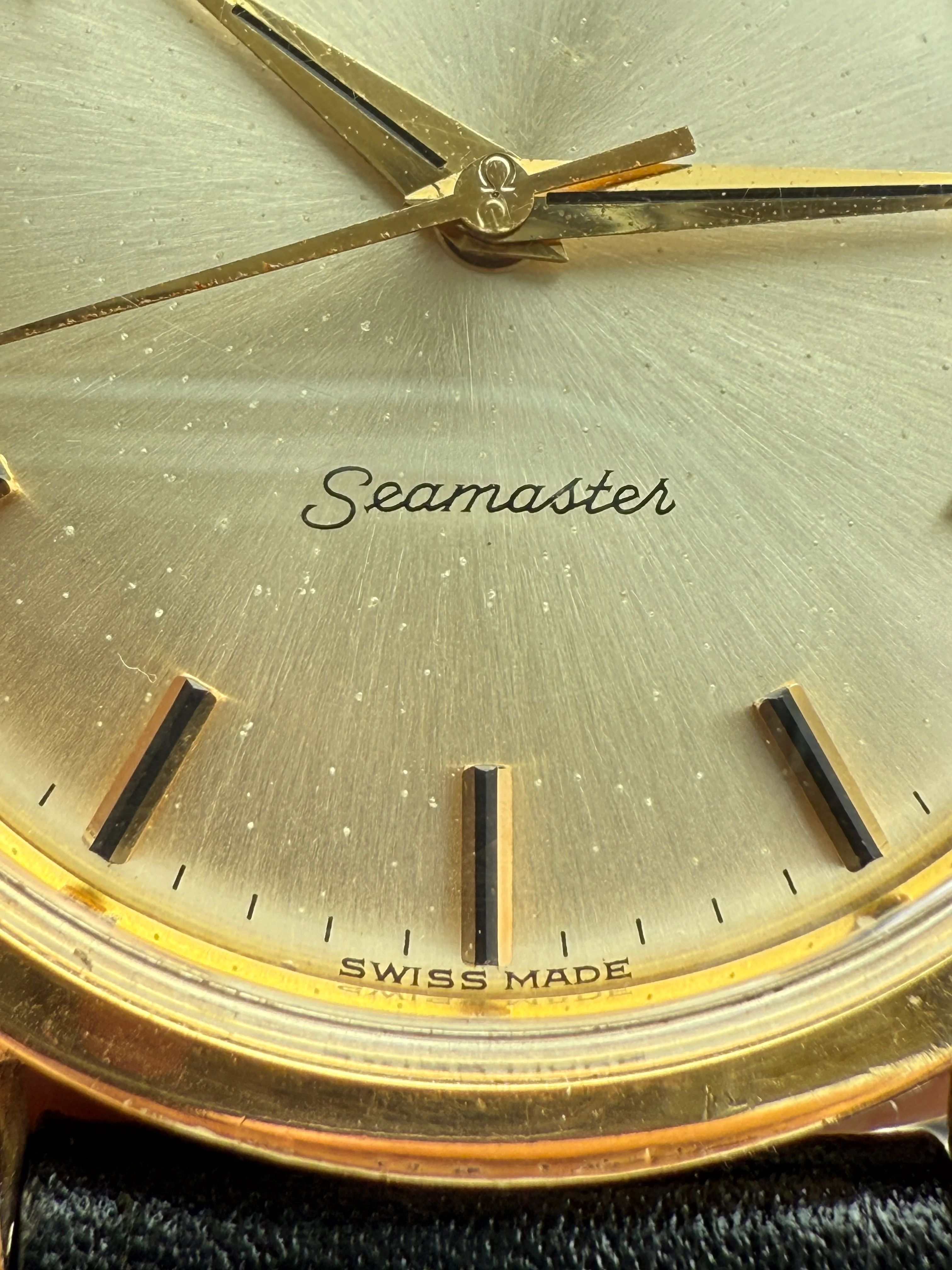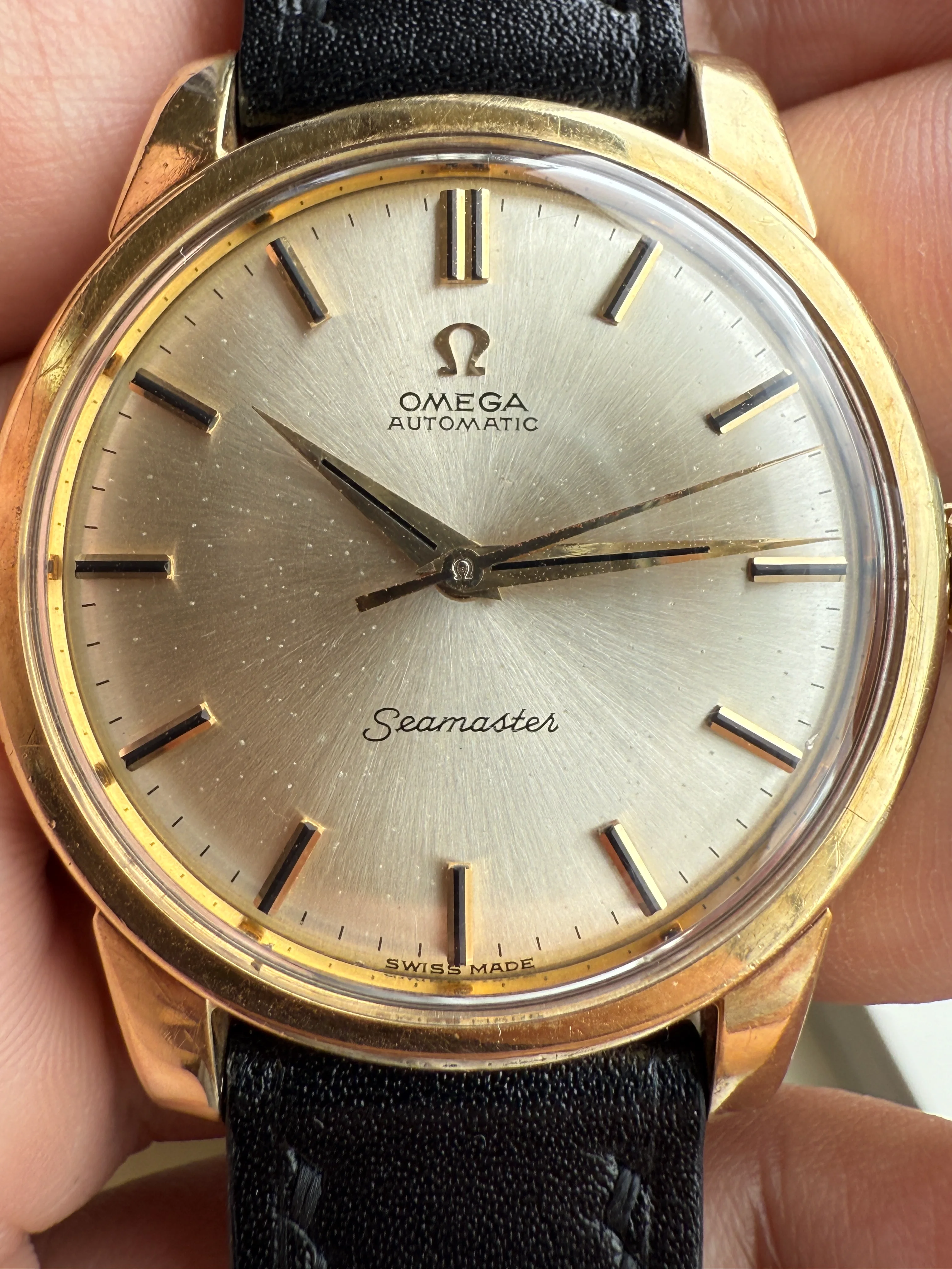 - Strap/buckle: Black handmade leather strap with smart pins. Original gold plated Omega buckle in fair condition with clear signs of wear.