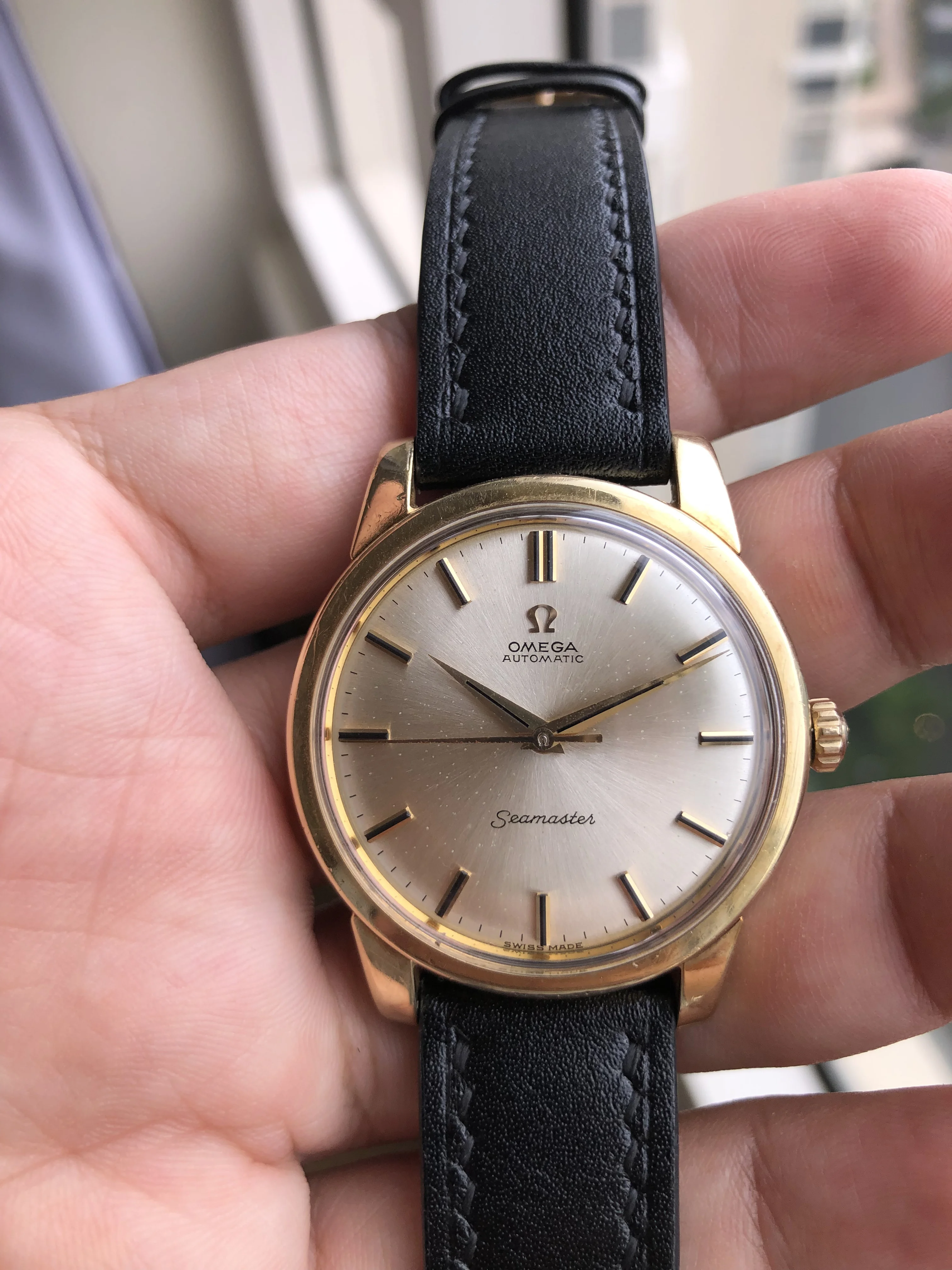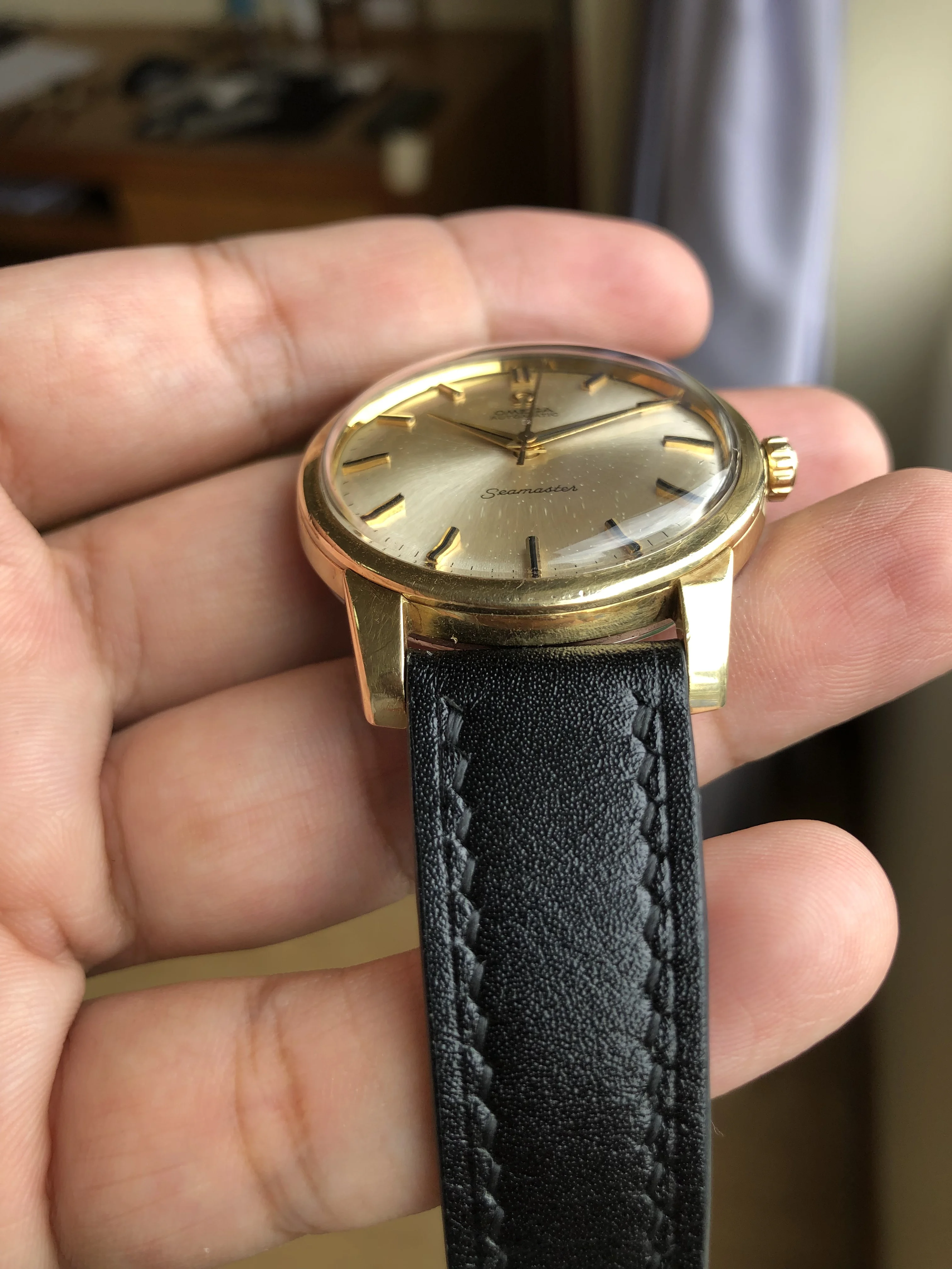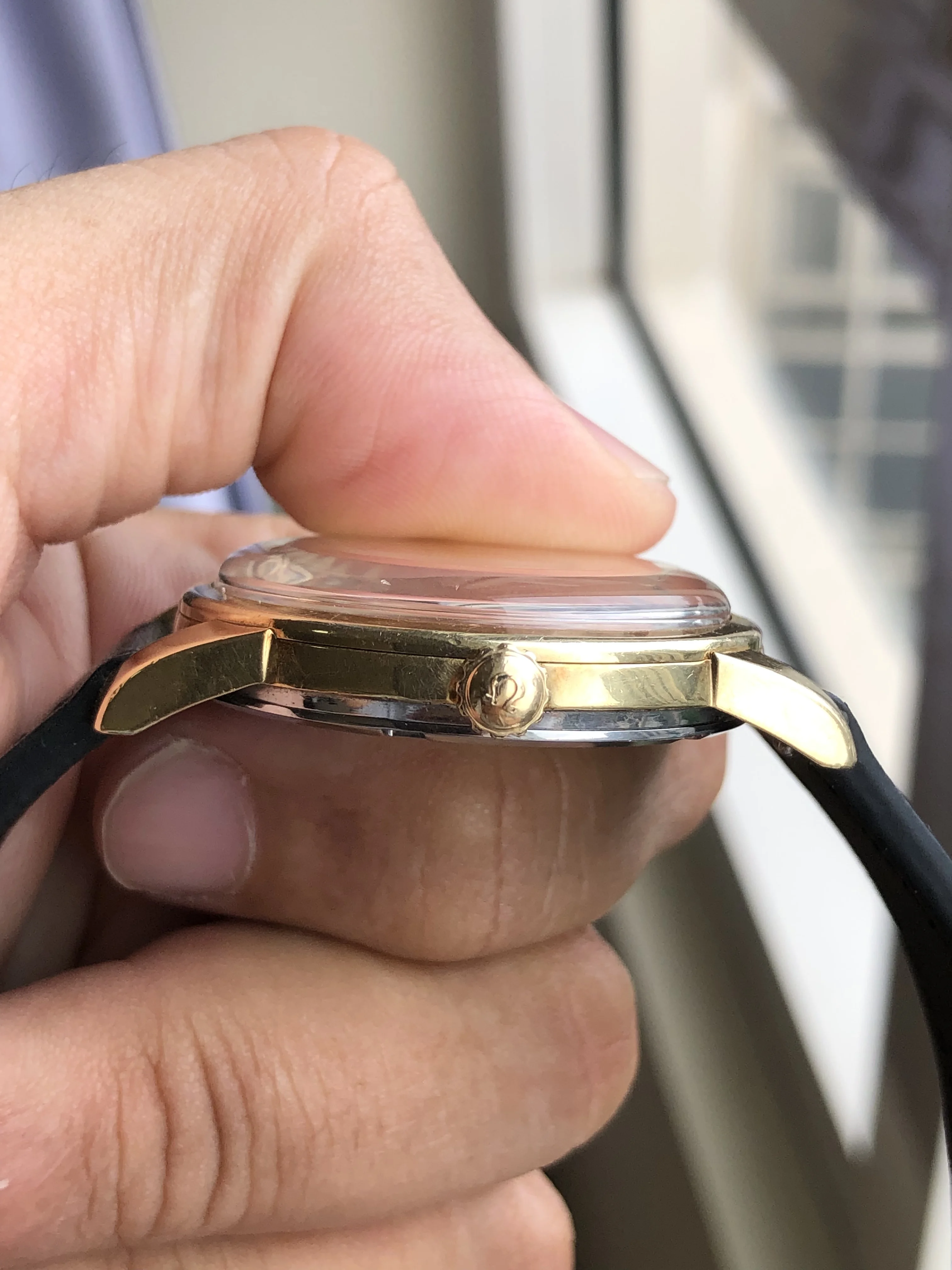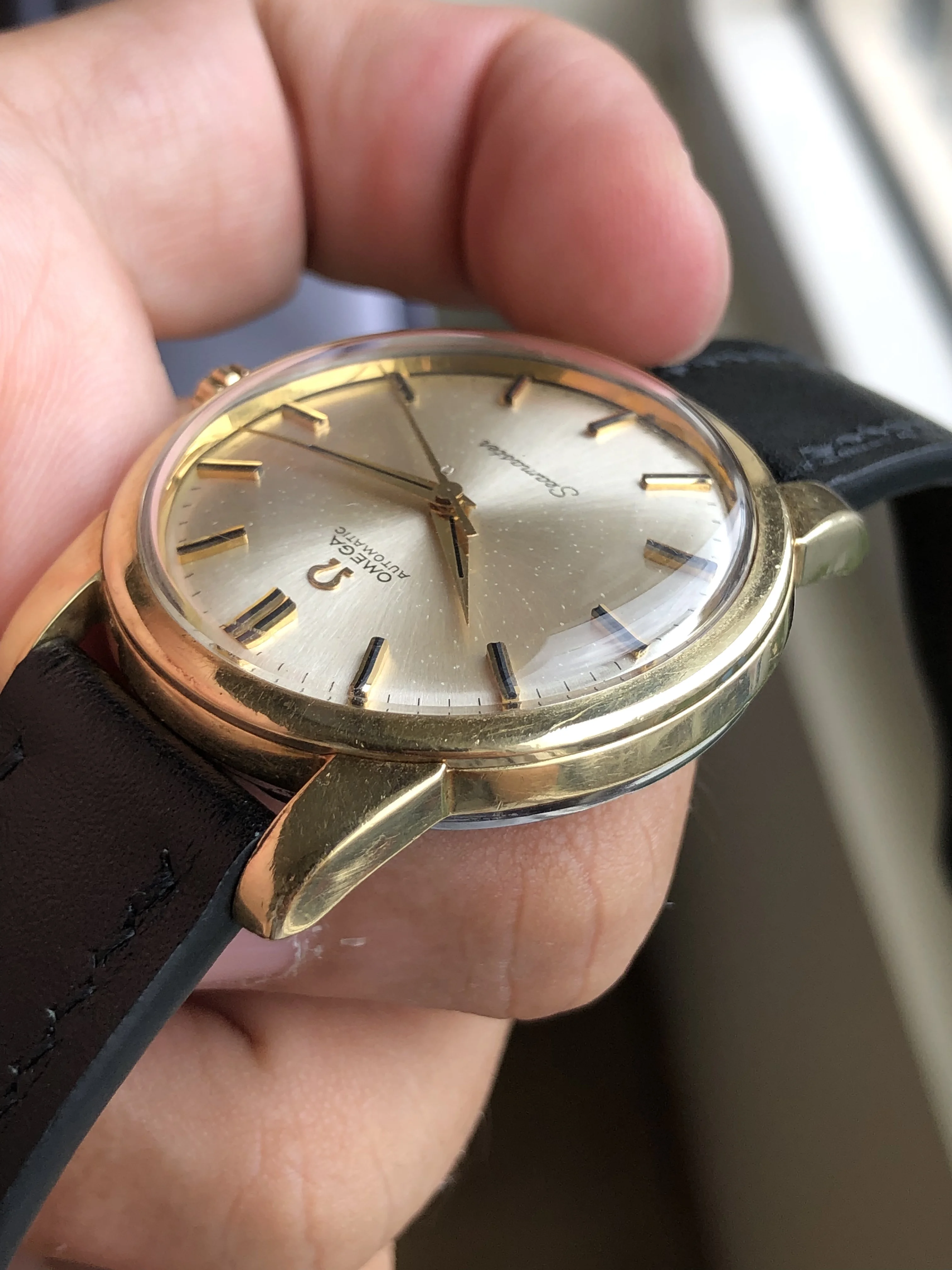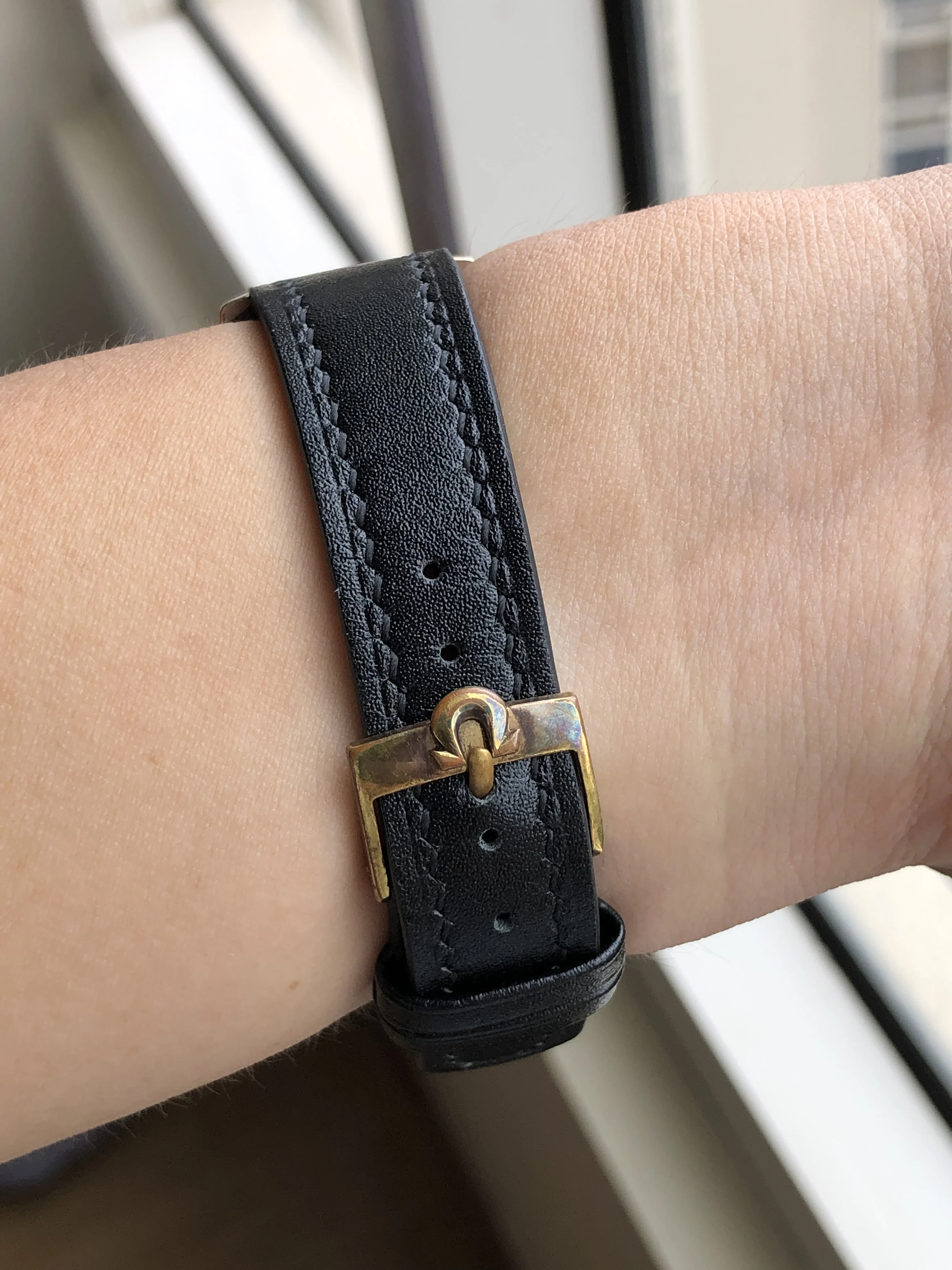- Strap/buckle: Black handmade leather strap with smart pins. Original gold plated Omega buckle in fair condition with clear signs of wear.