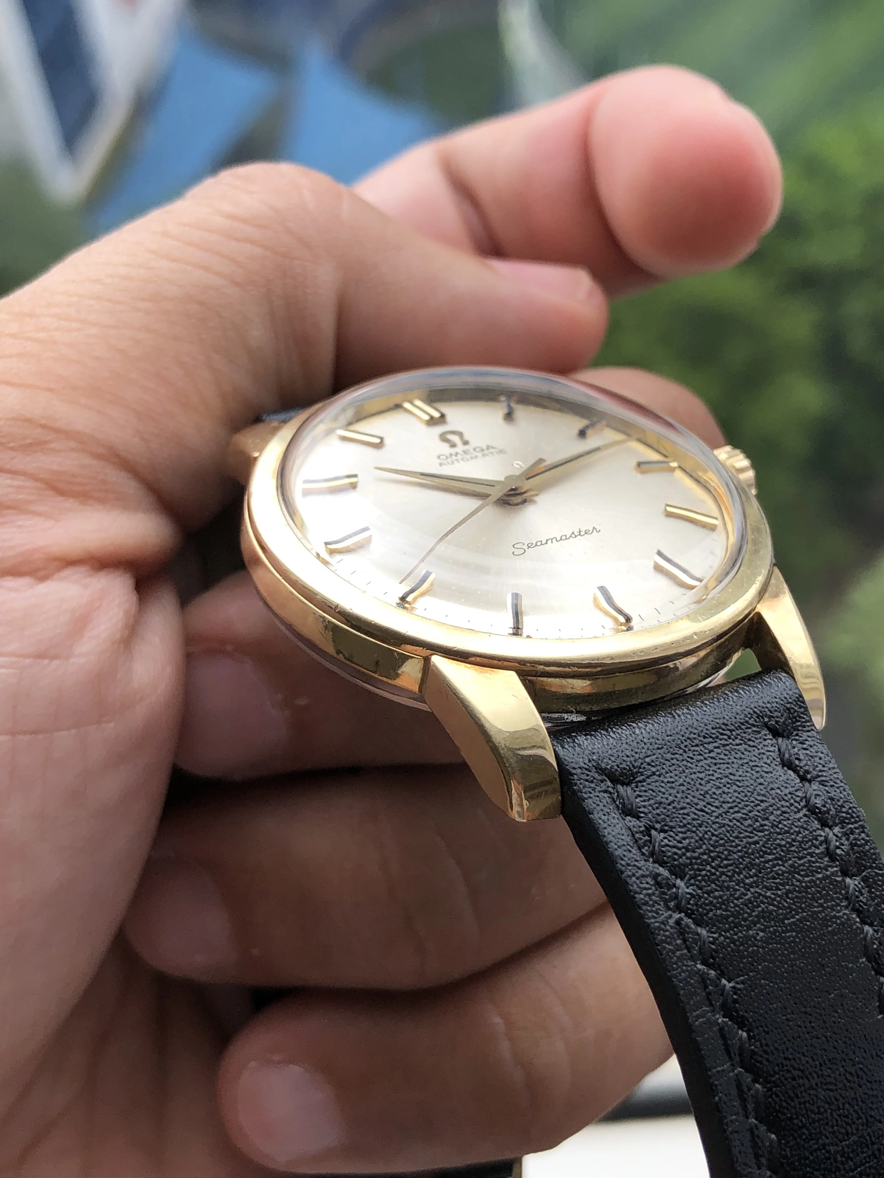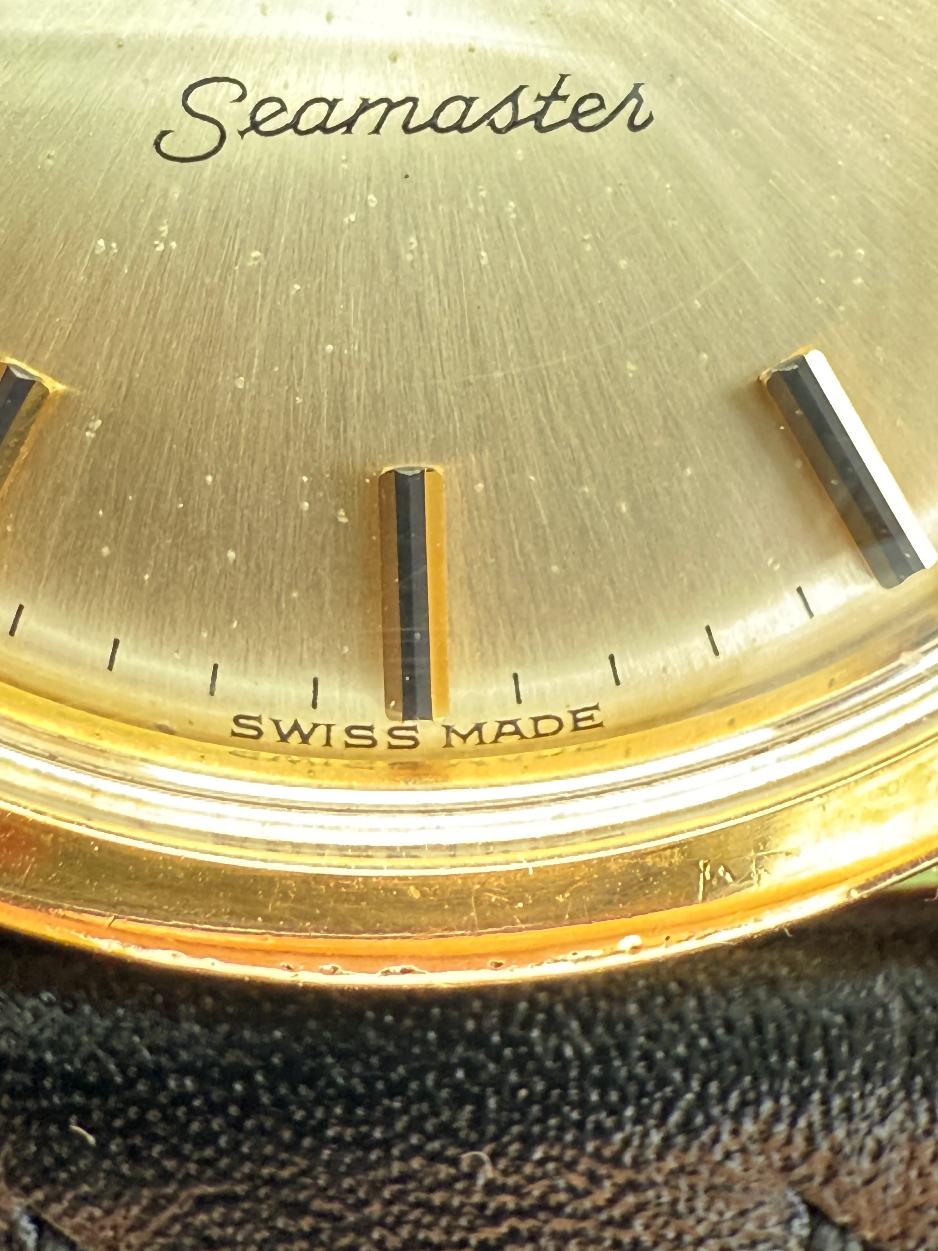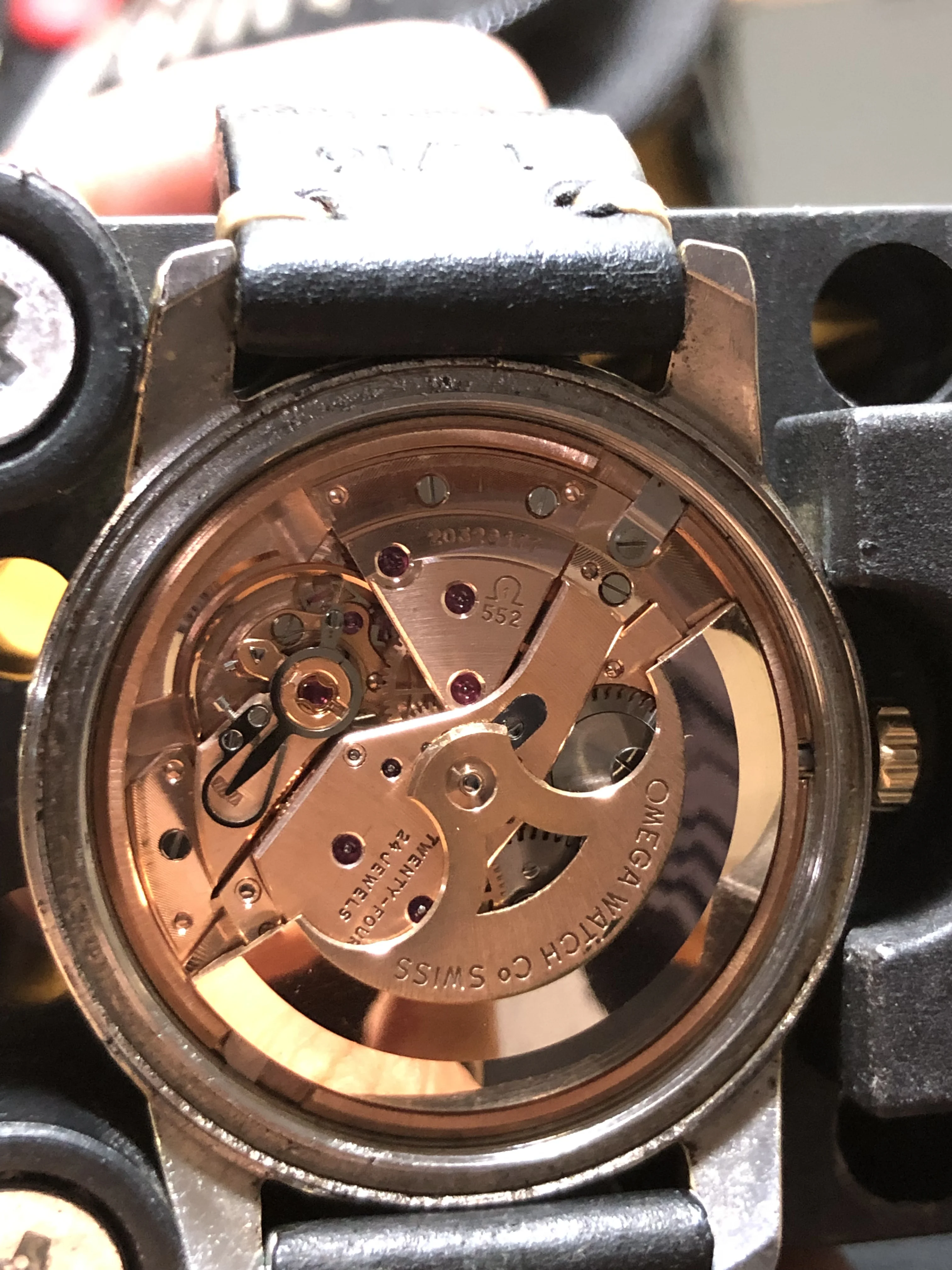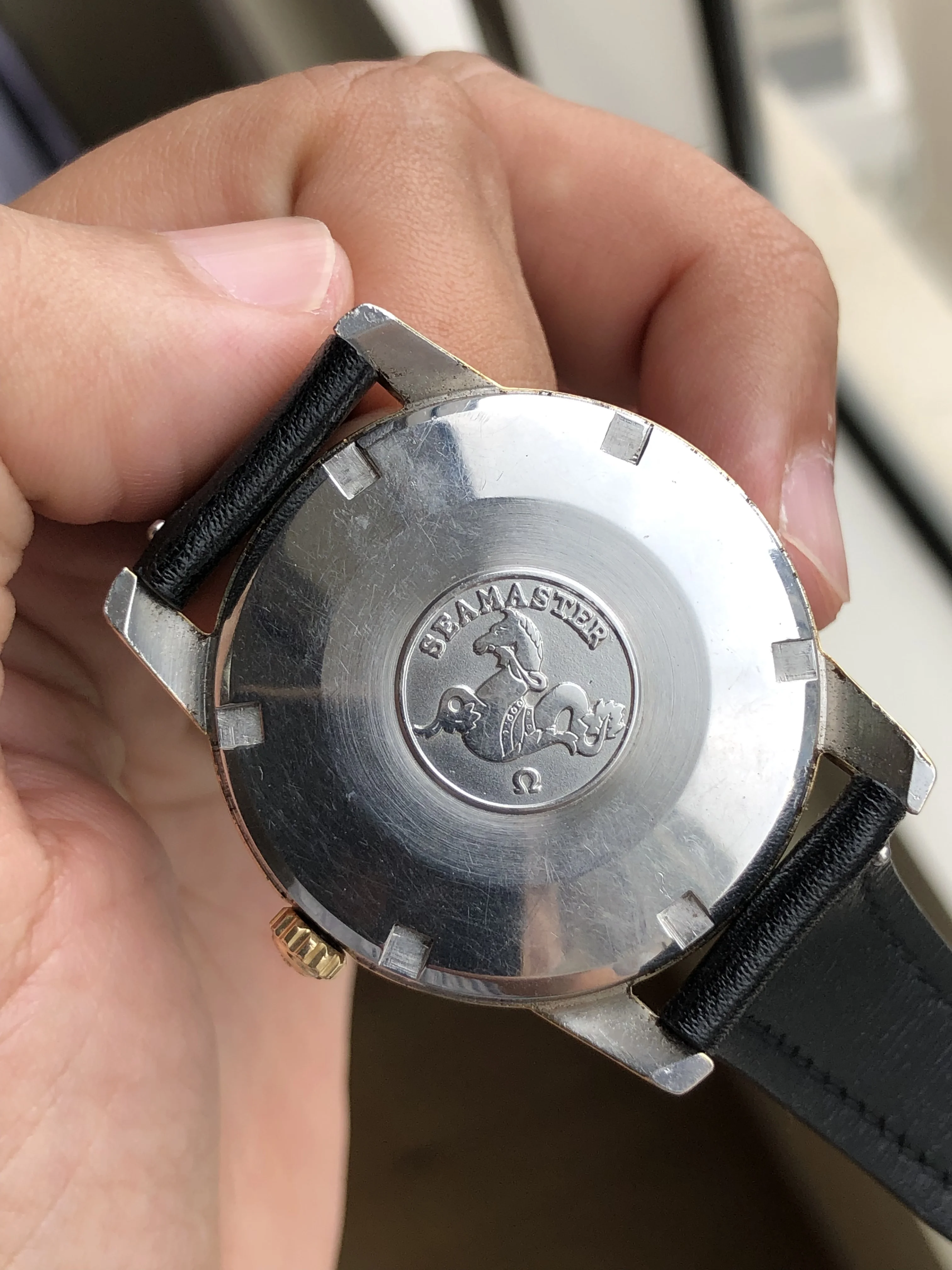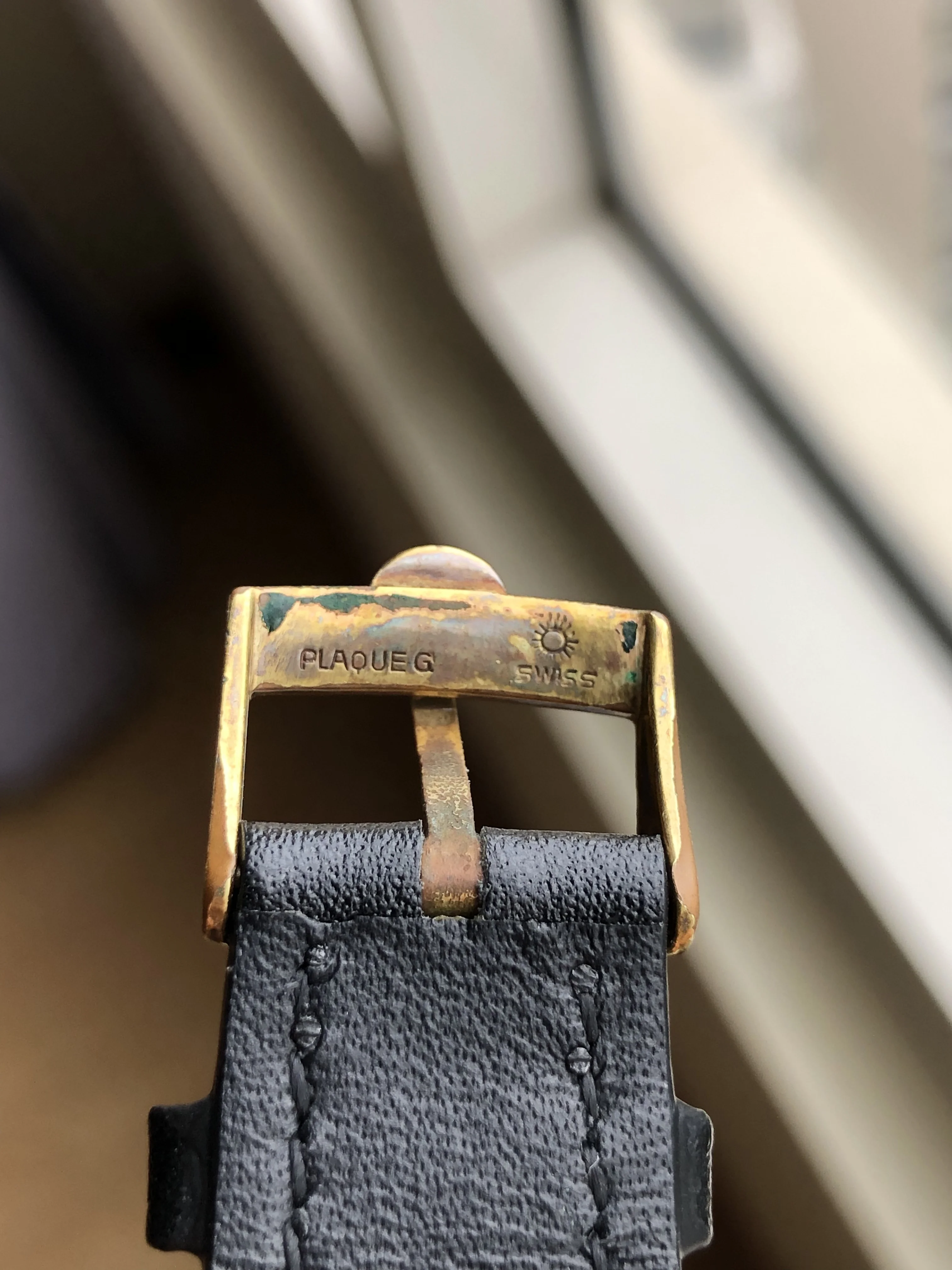 - Strap/buckle: Black handmade leather strap with smart pins. Original gold plated Omega buckle in fair condition with clear signs of wear.