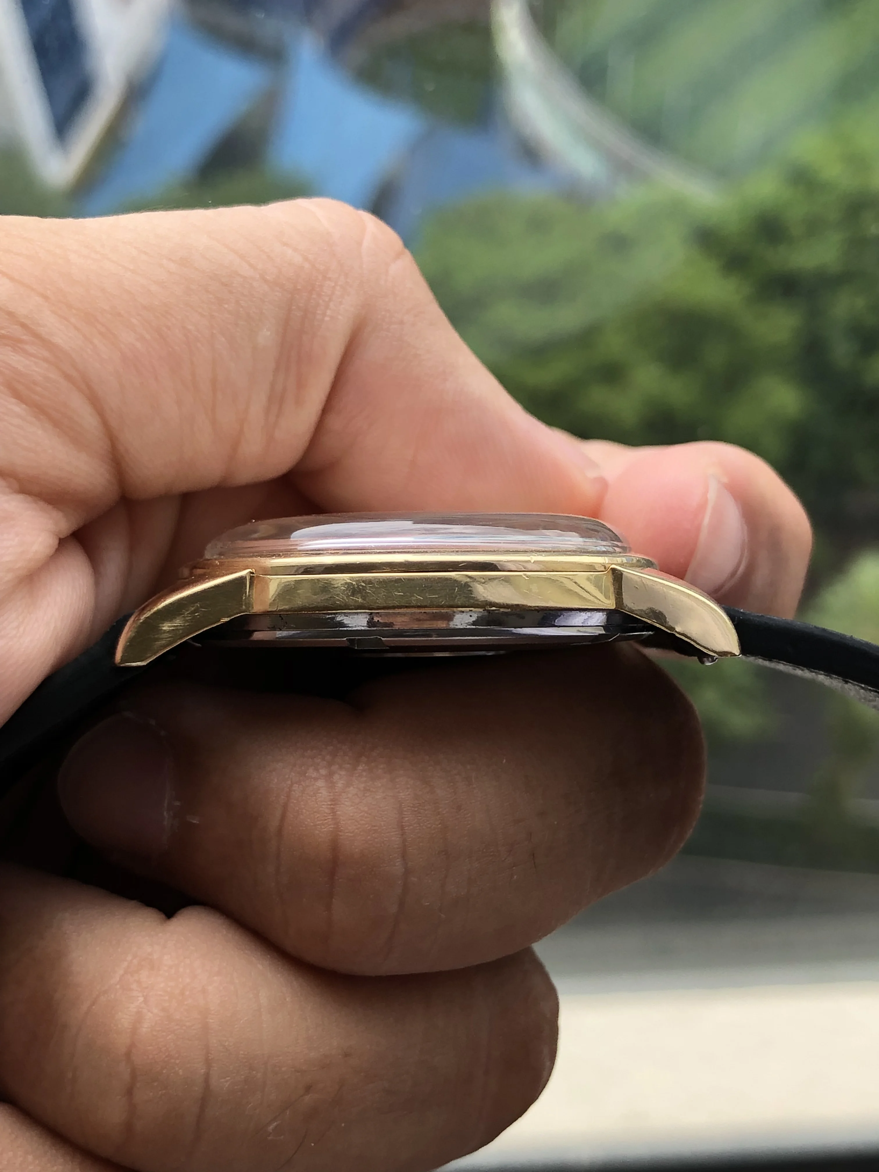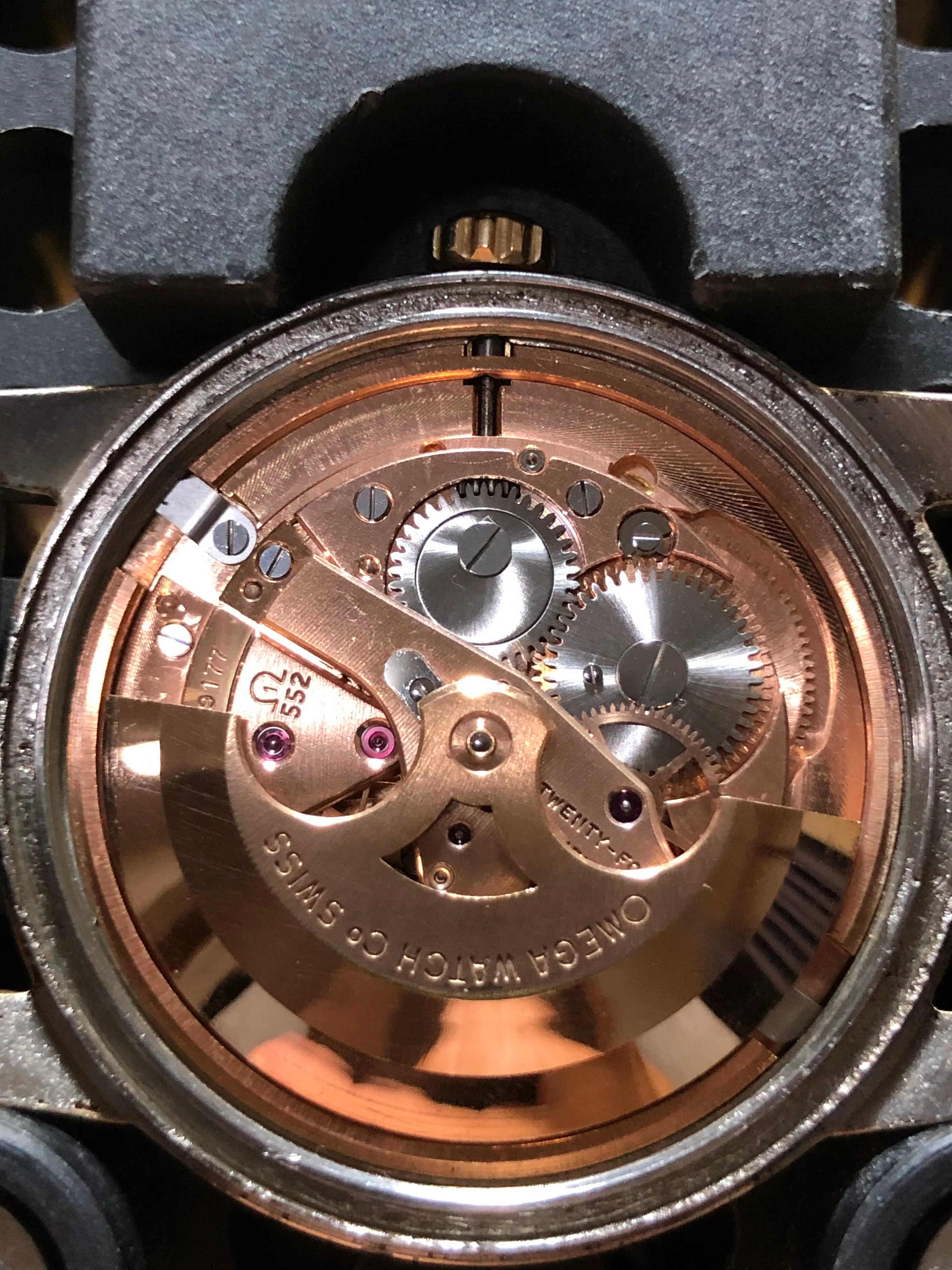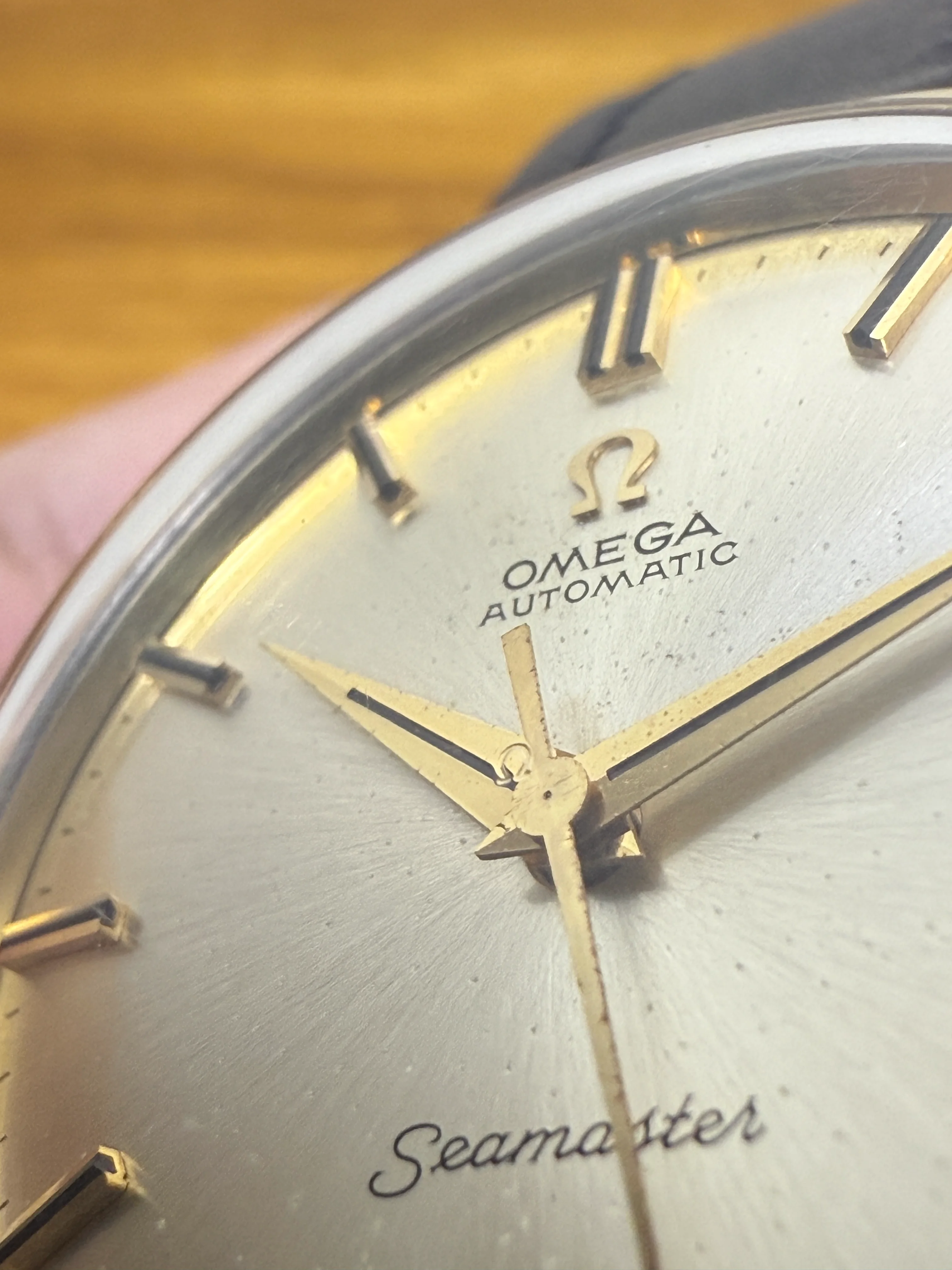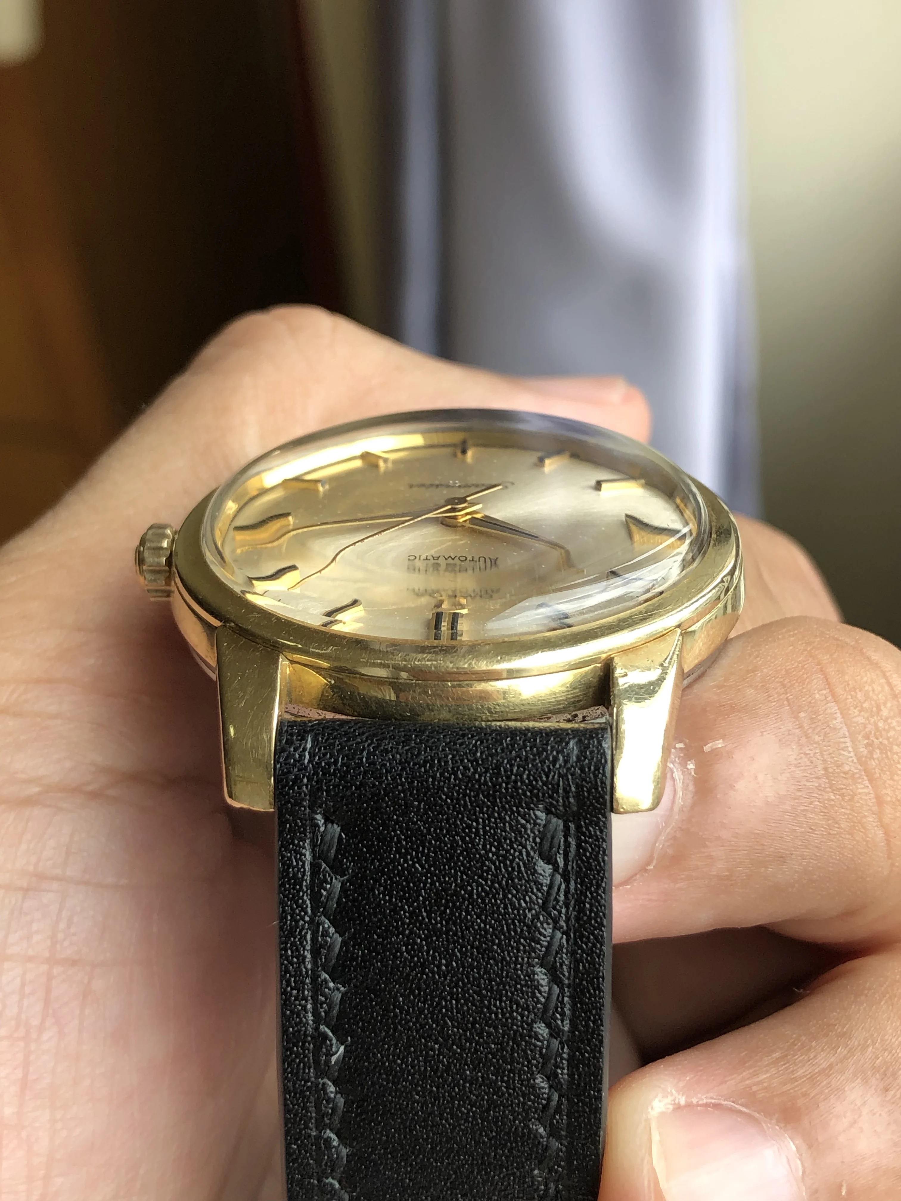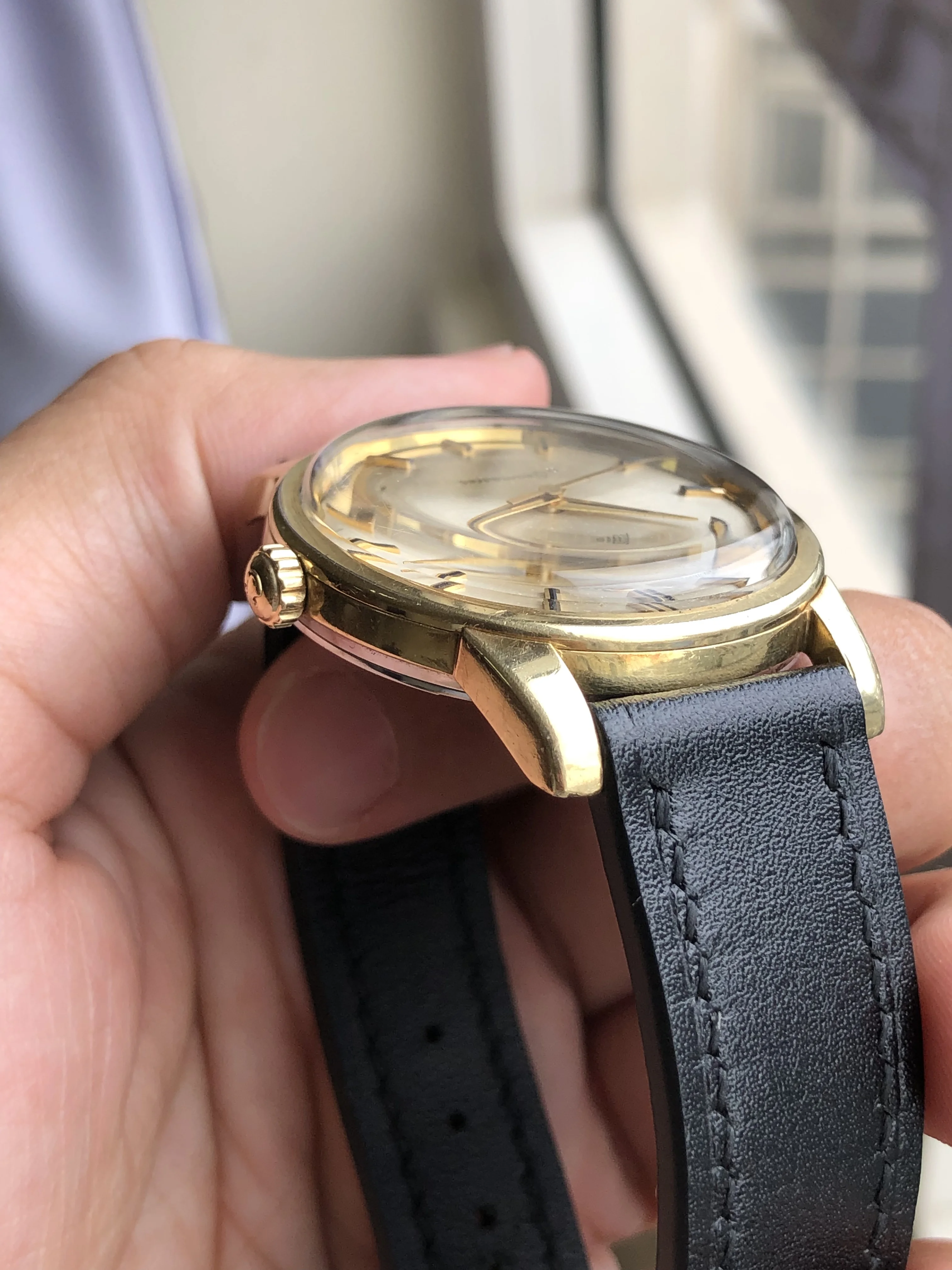 - Strap/buckle: Black handmade leather strap with smart pins. Original gold plated Omega buckle in fair condition with clear signs of wear.