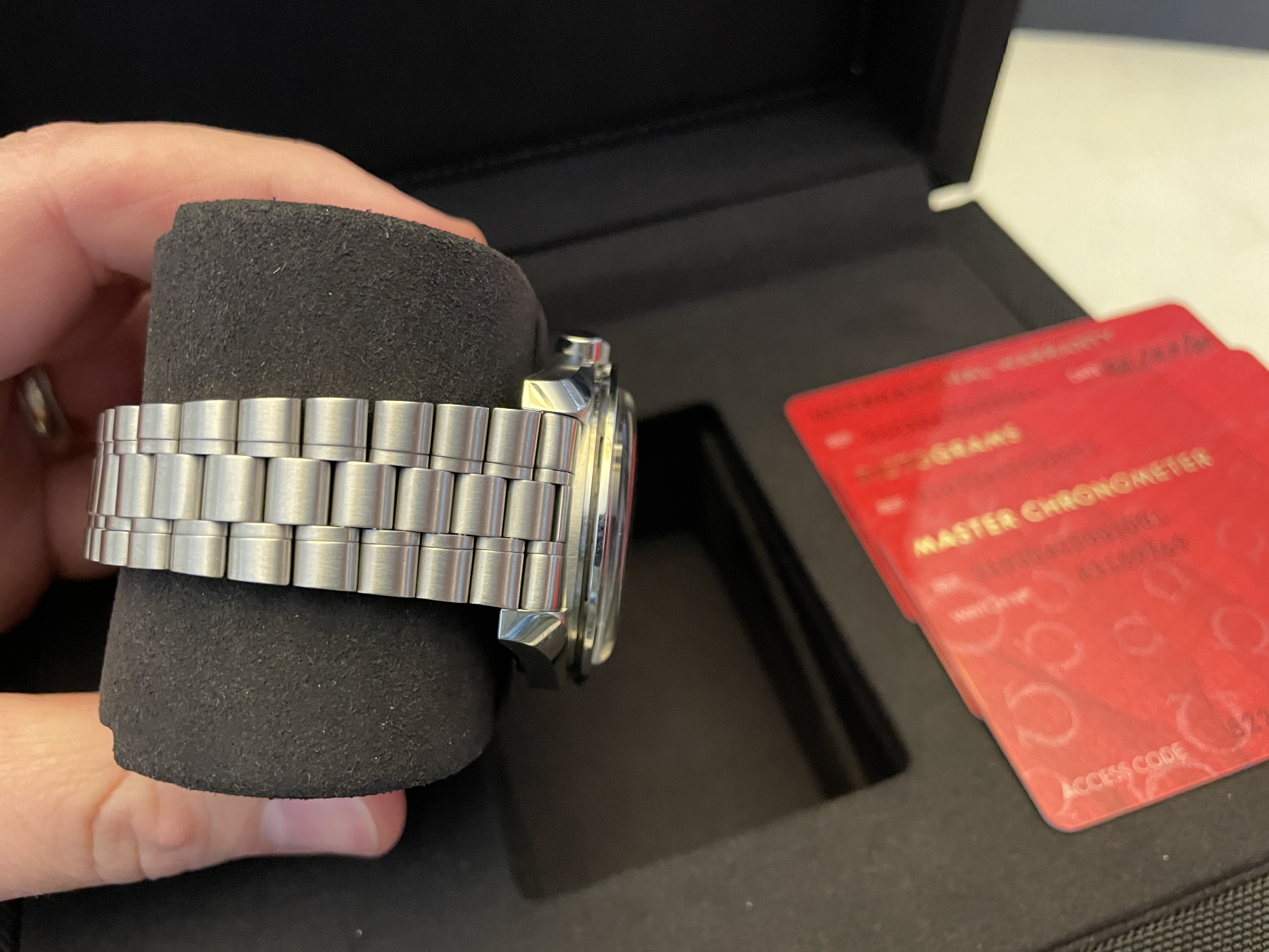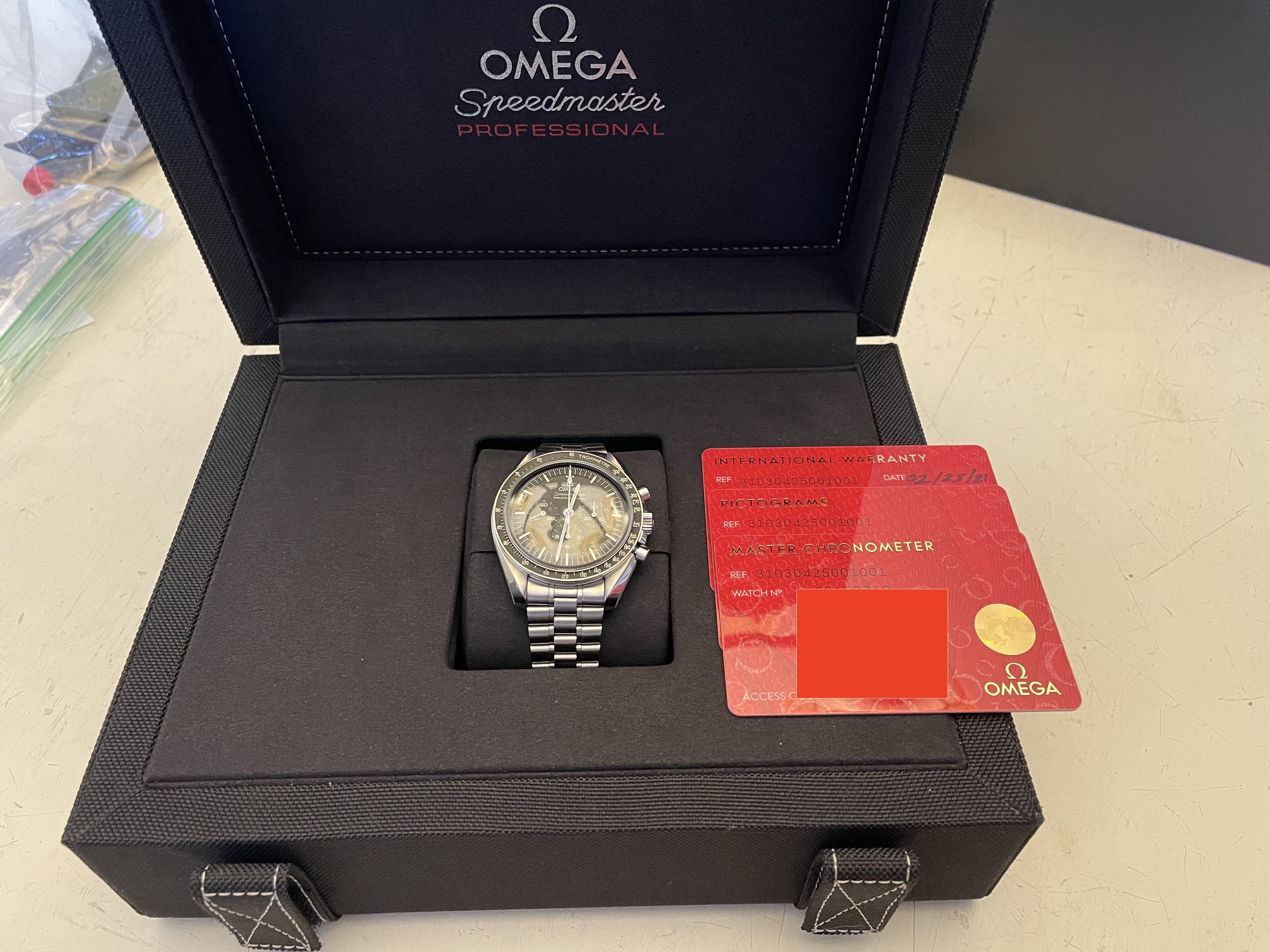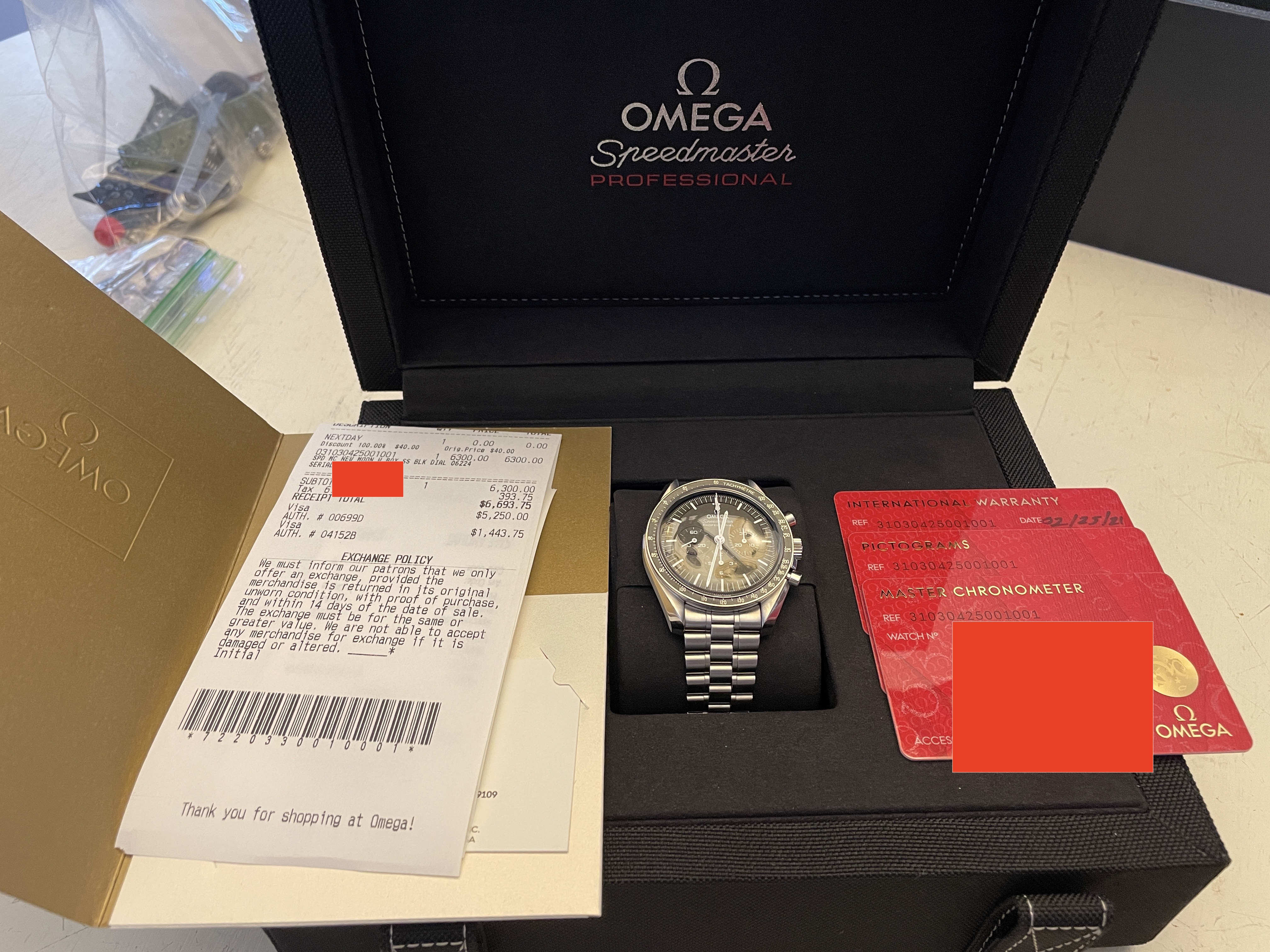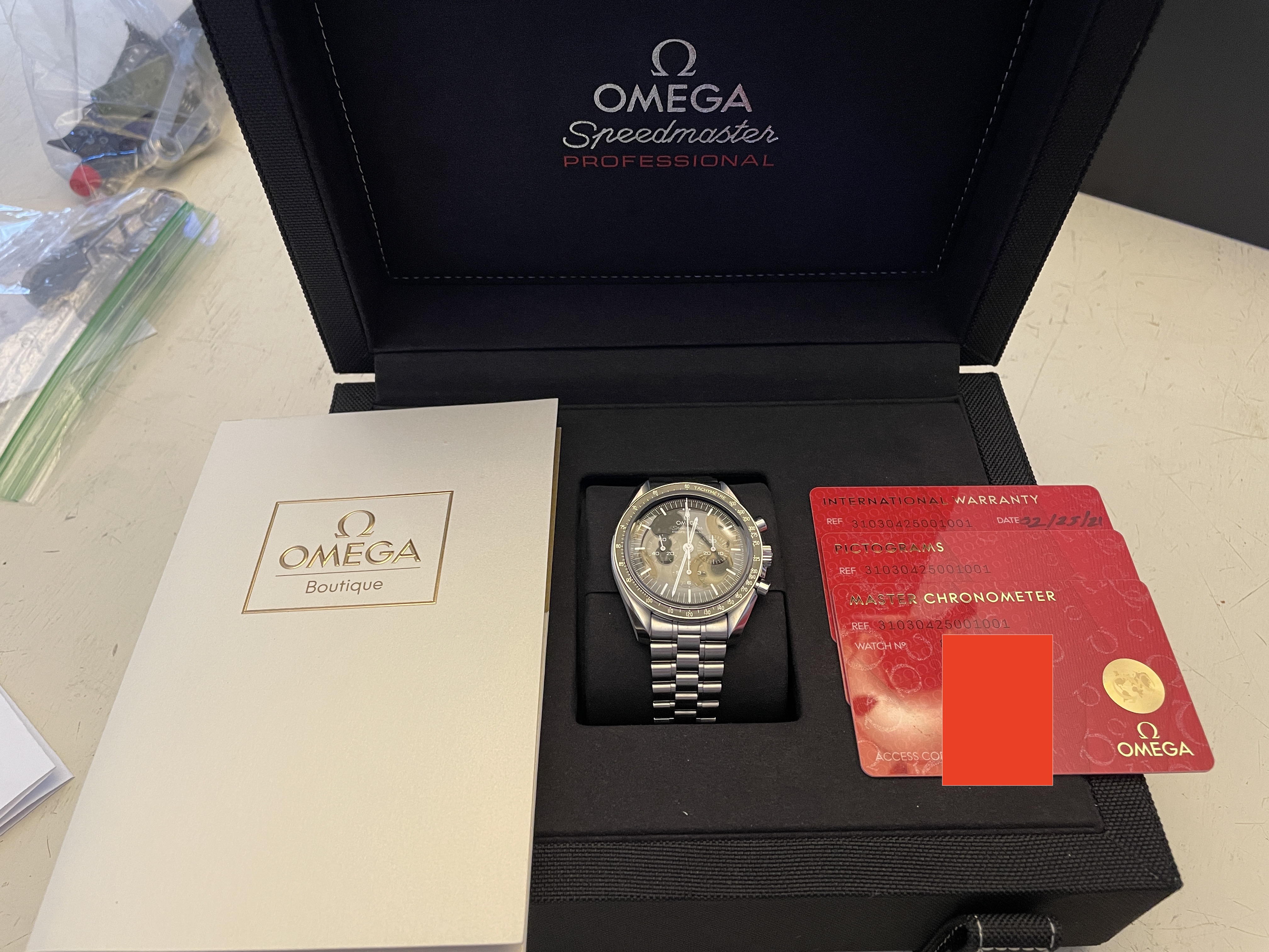 My wife and I purchased two of these last week and she just isn't in love with it as much as I am with mine. I'm selling hers so she can purchase something else. Comes with the box, manuals, all three OEM cards, Omega boutique receipt, stamped warranty (February 2021), outer box, extra links from bracelet resizing, etc. etc. etc.