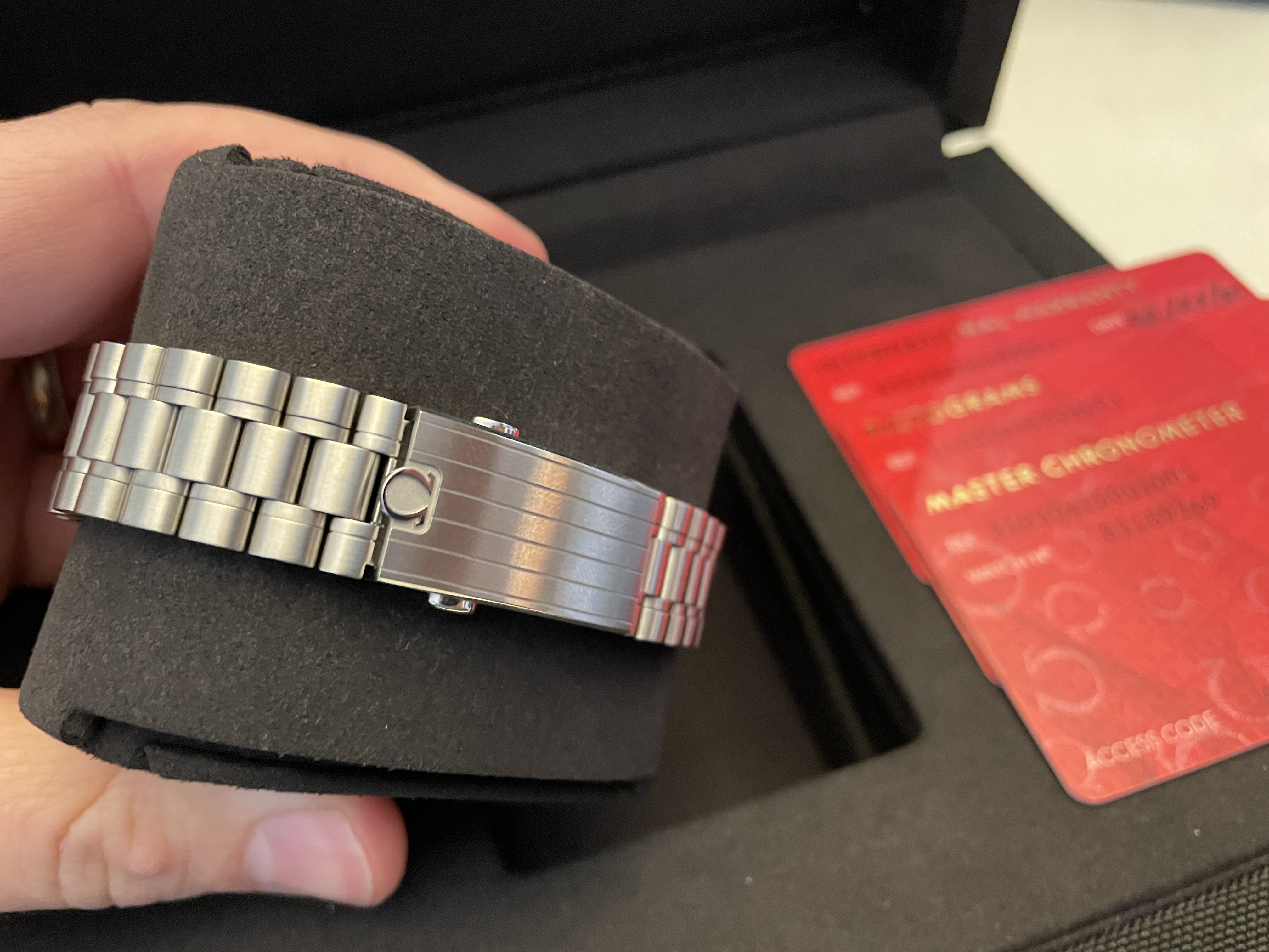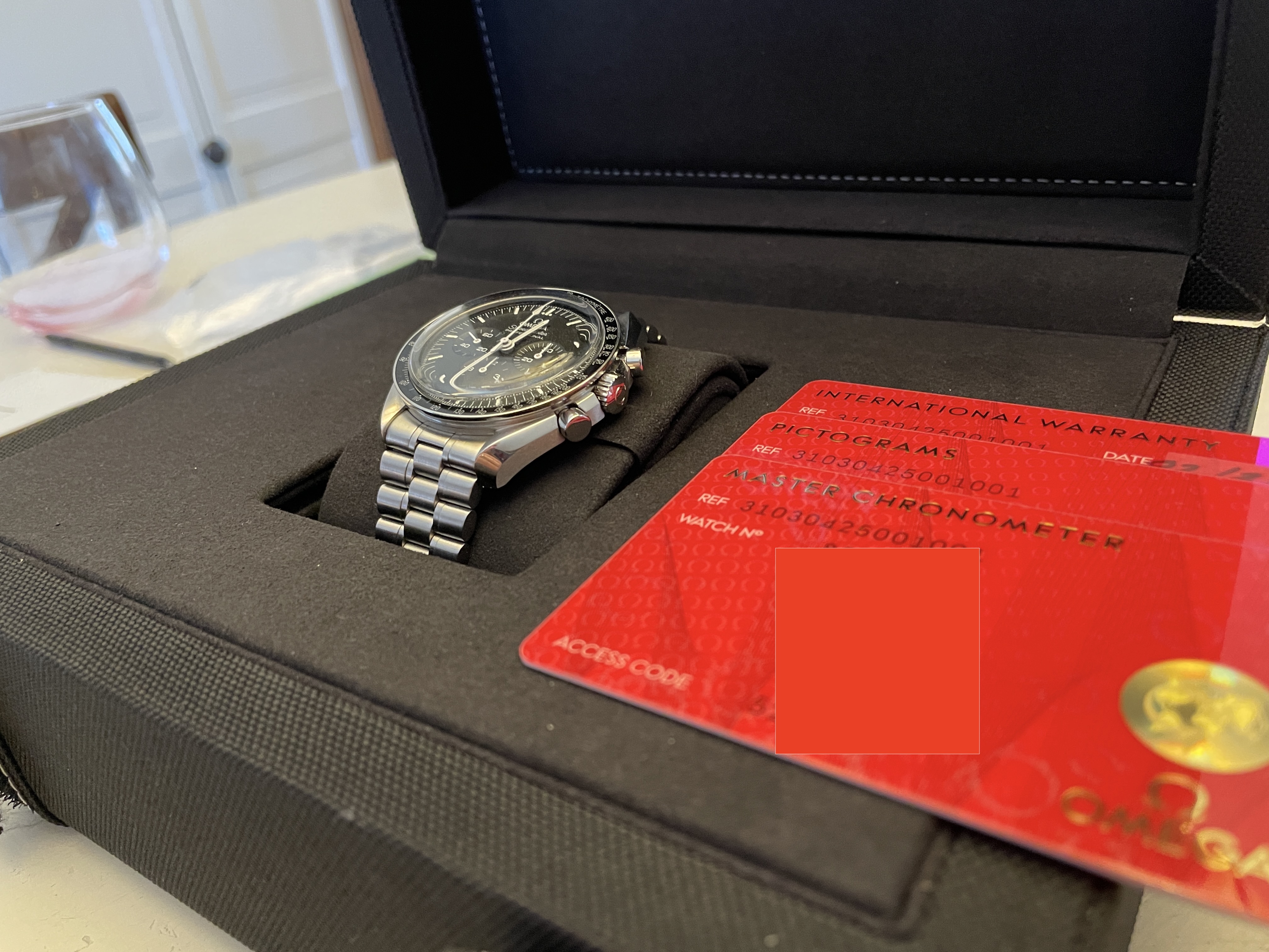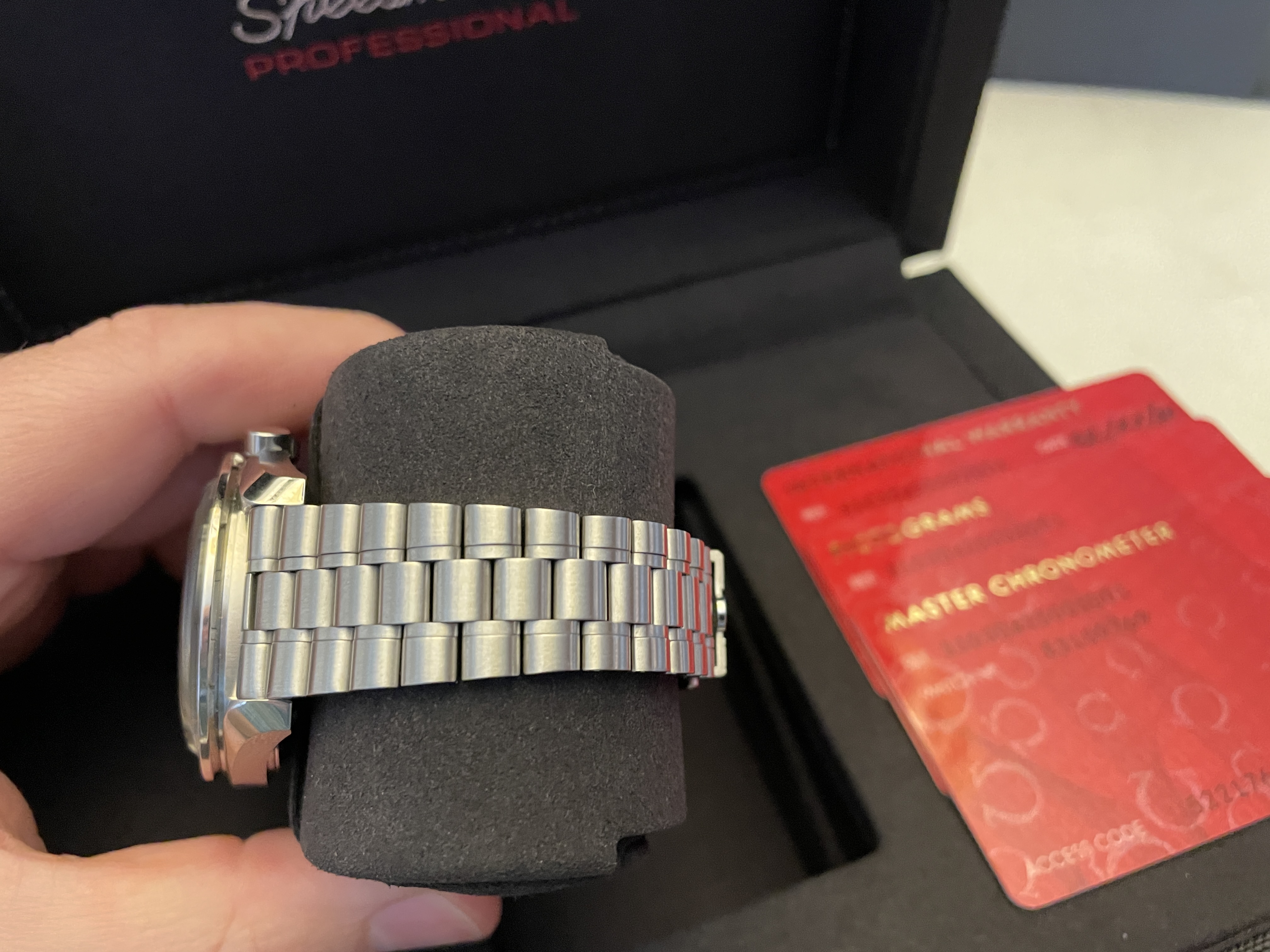 My wife and I purchased two of these last week and she just isn't in love with it as much as I am with mine. I'm selling hers so she can purchase something else. Comes with the box, manuals, all three OEM cards, Omega boutique receipt, stamped warranty (February 2021), outer box, extra links from bracelet resizing, etc. etc. etc.