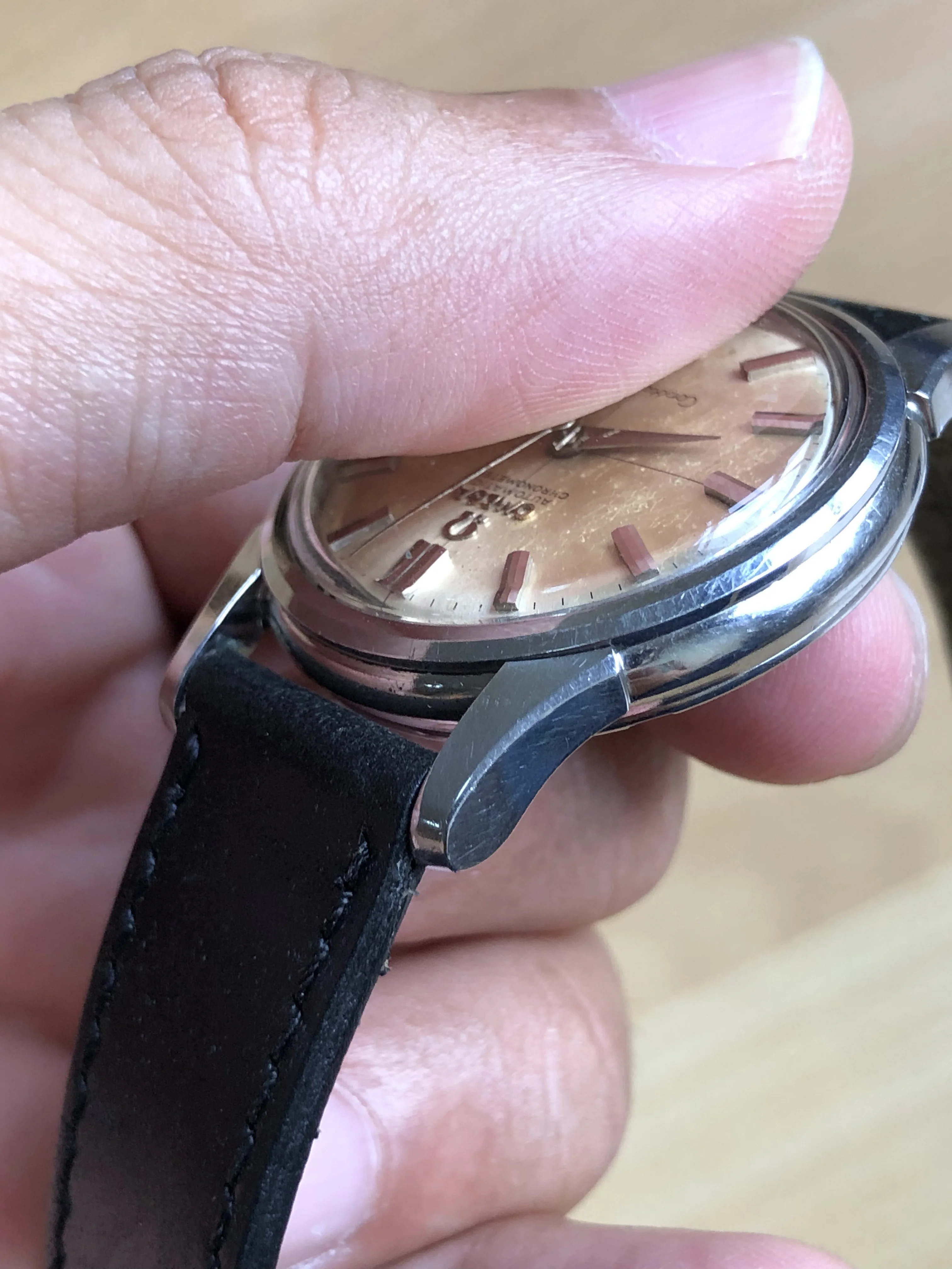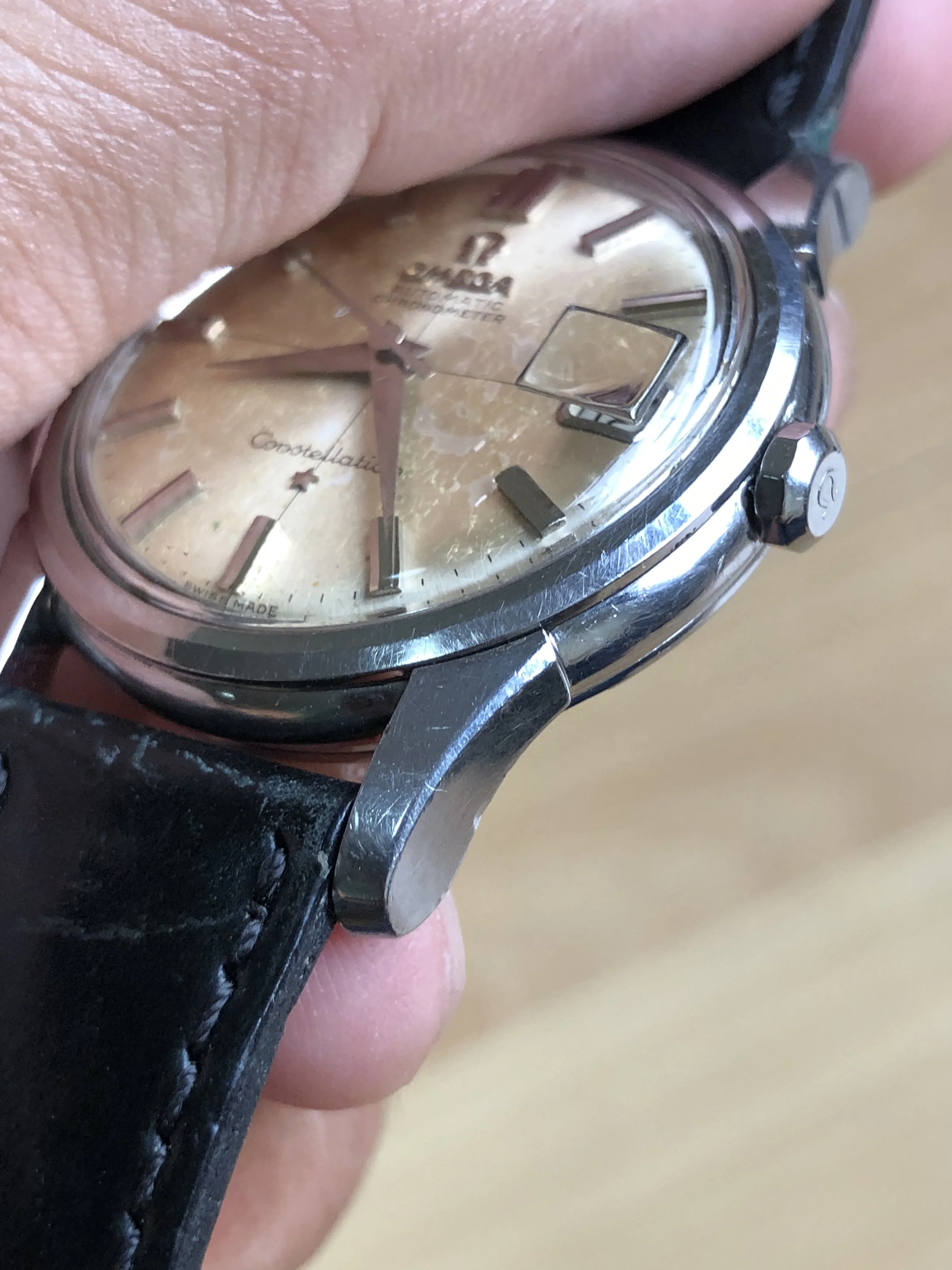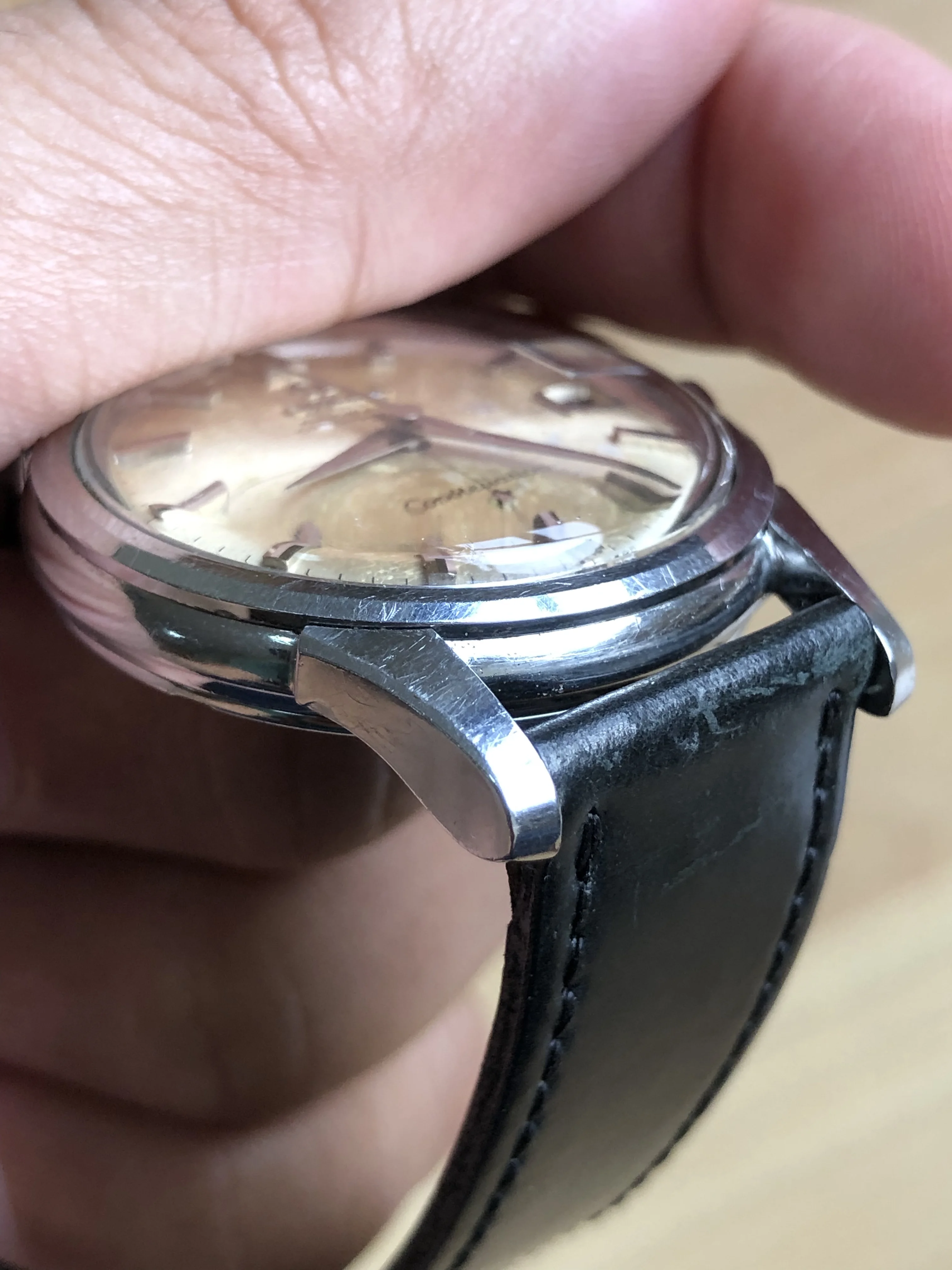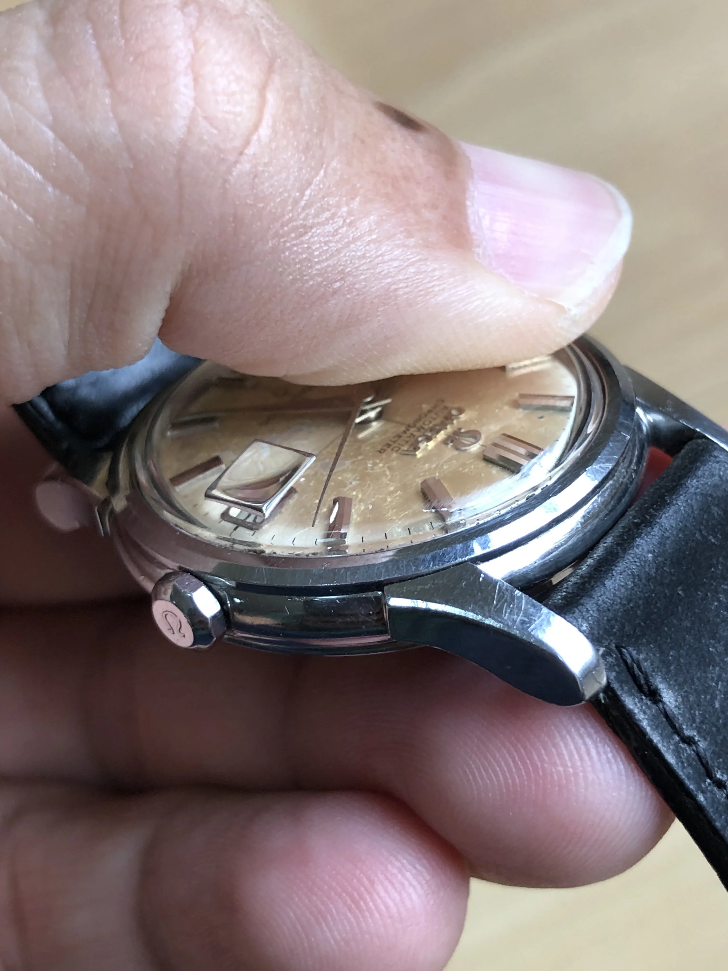- Dial: Original champagne cross-hair sunburst dial, has some damaged as showed in photos below. Applied Omega logo as well as an faceted date-aperture frame; onyx inserted hour markers; dauphine hands; no lume, no onyx or black paint on hands and hour markers; all the prints are visible; there are some oxidation on hour markers and hands.