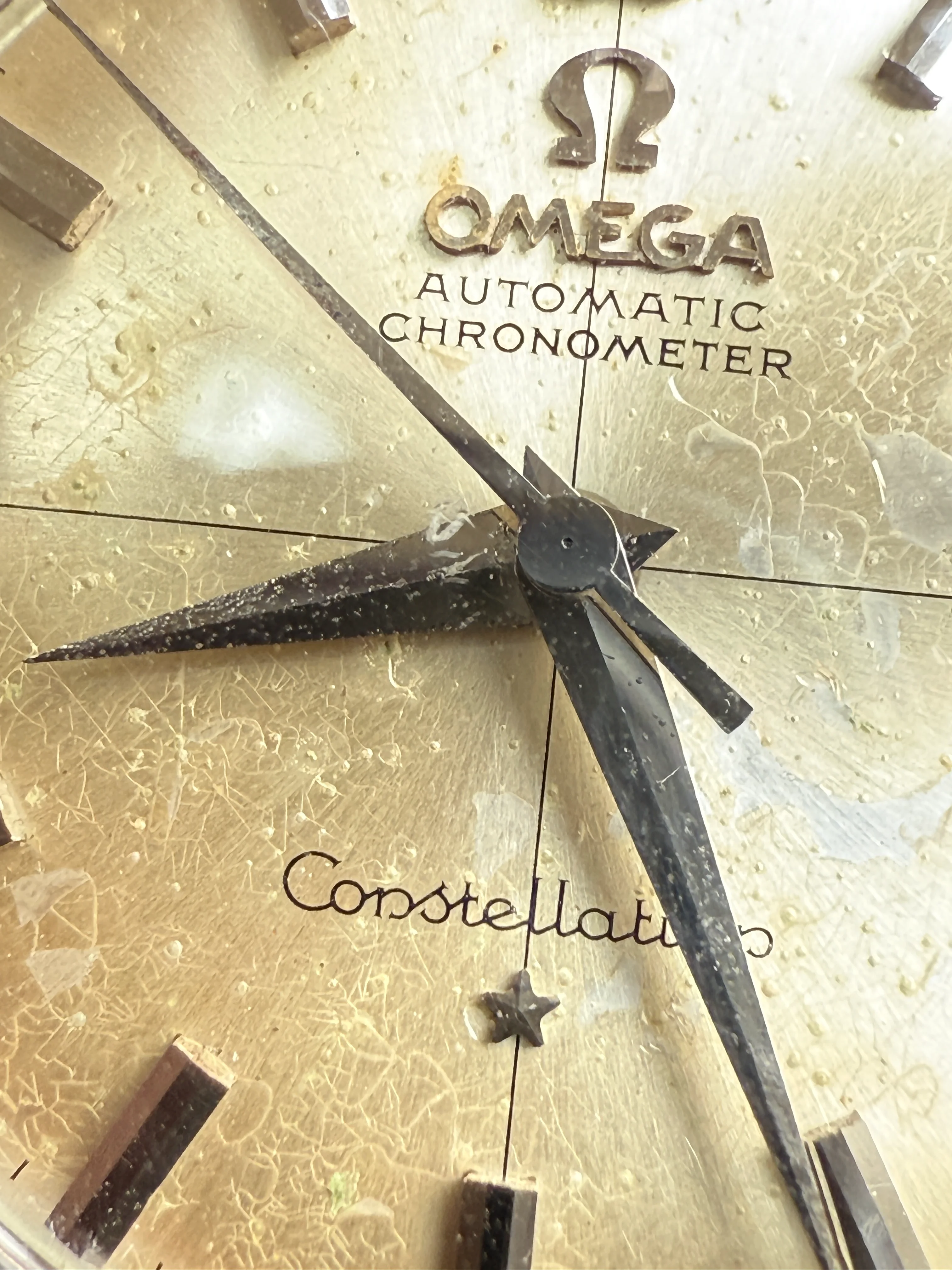 A stainless steel Omega Constellation 14393, 34.5mm, damaged original champagne cross-hair sunburst dial.