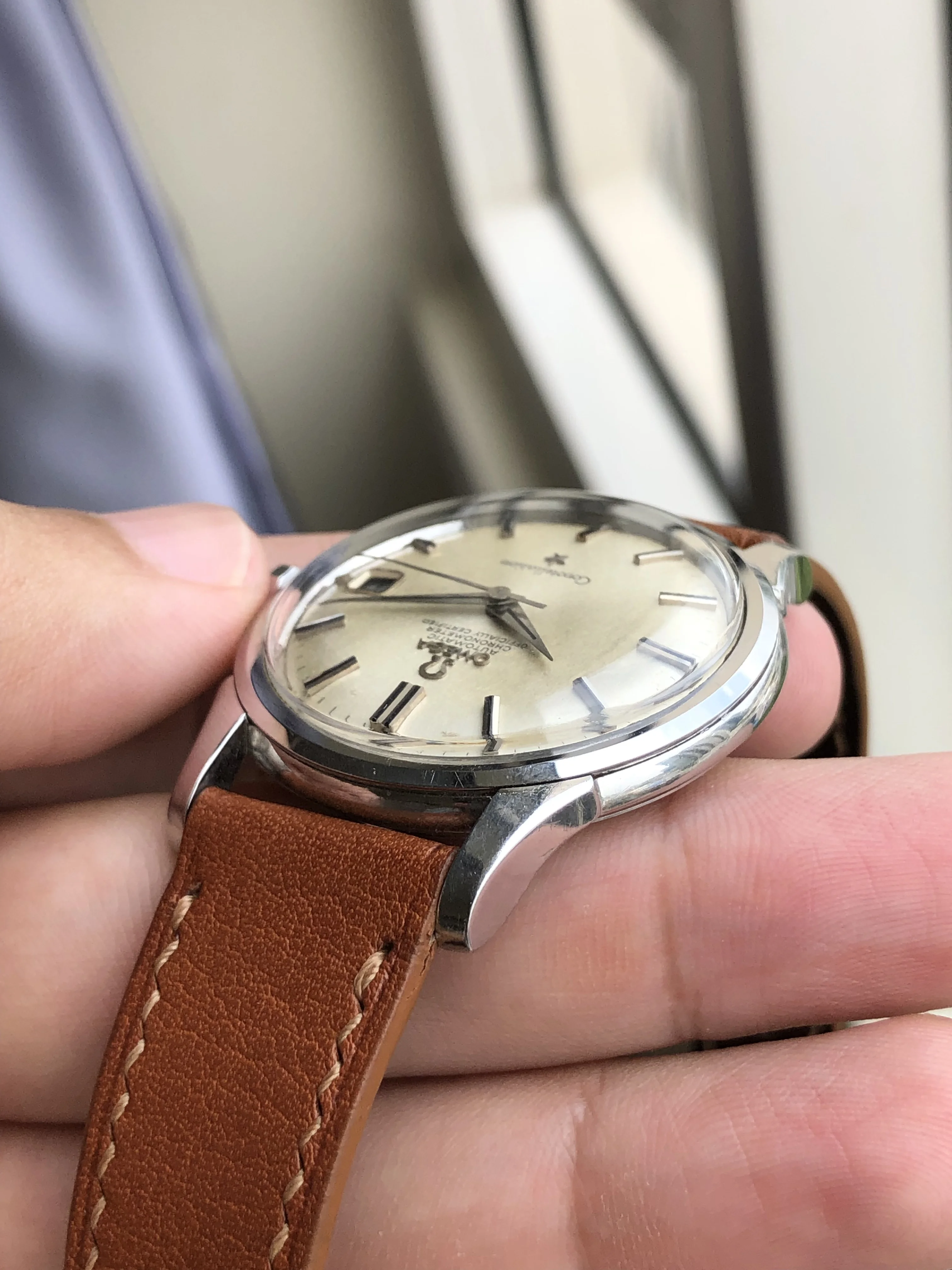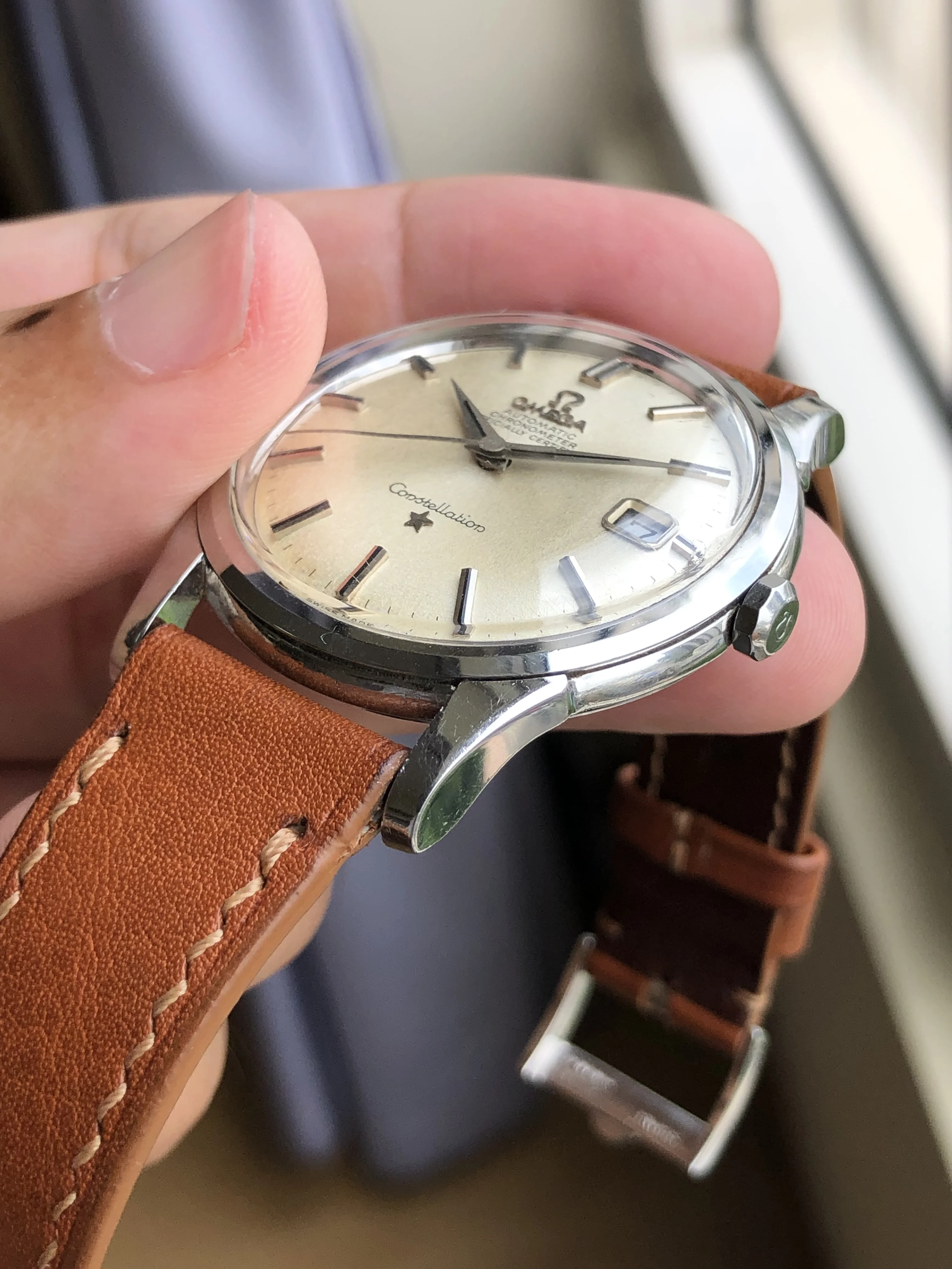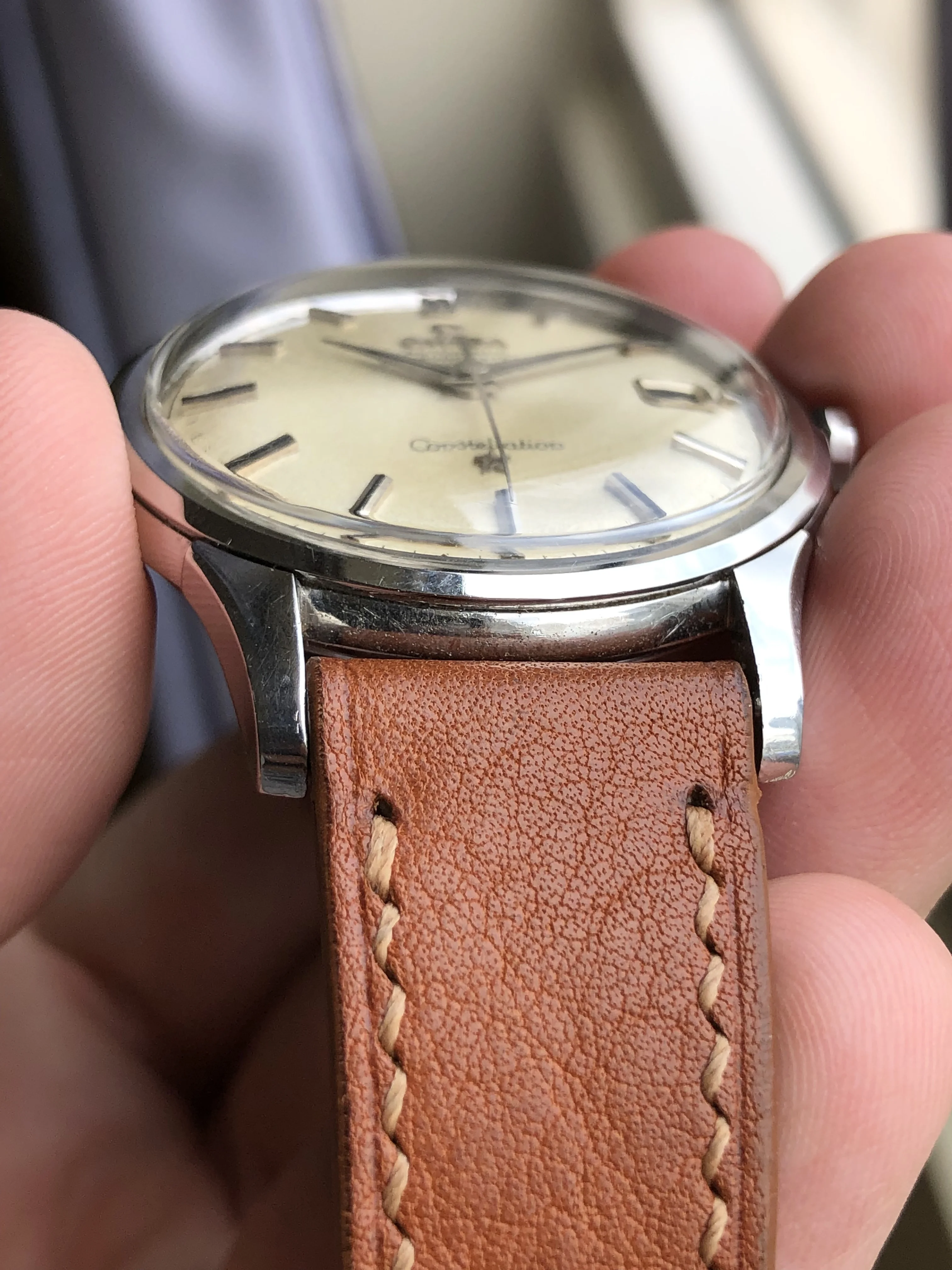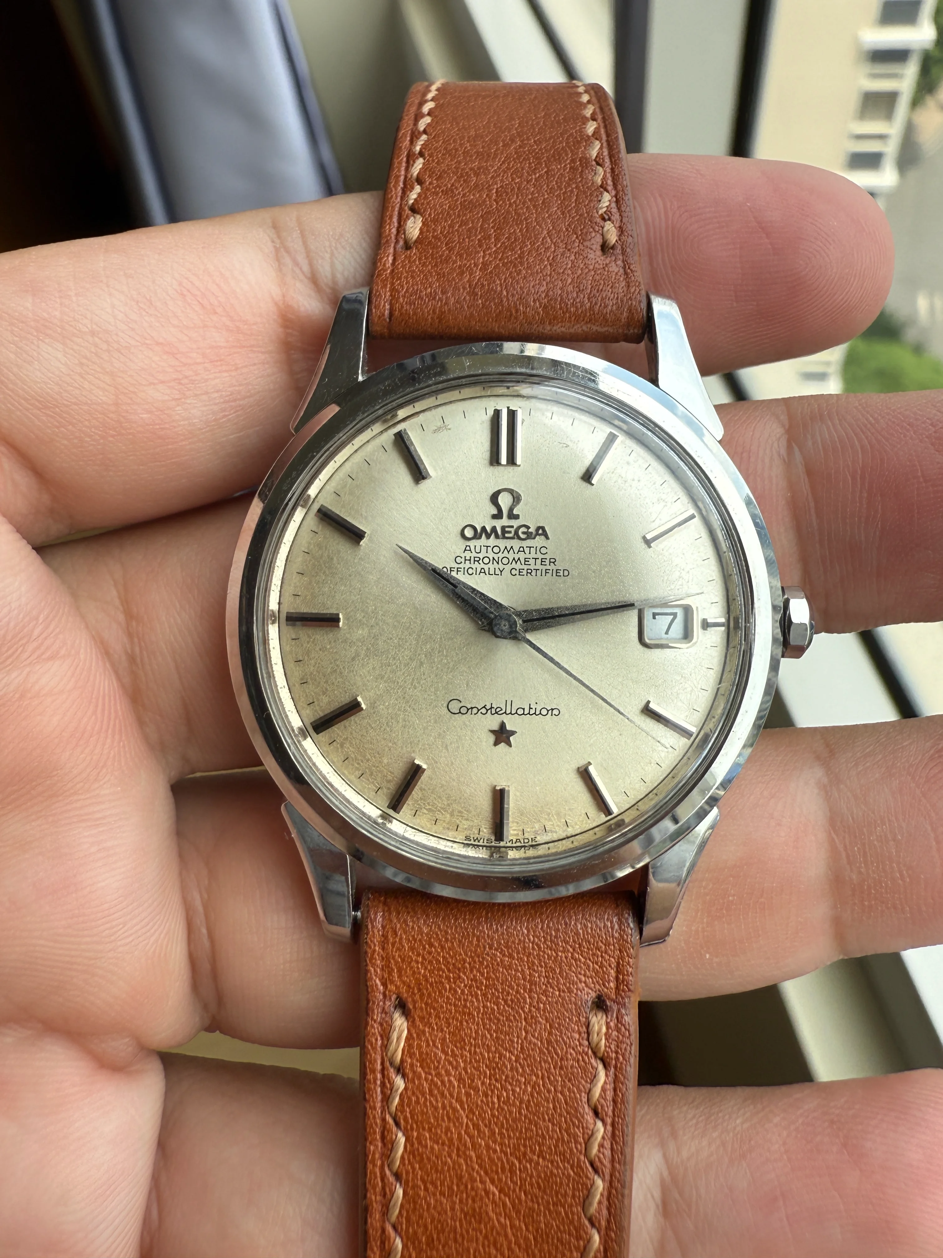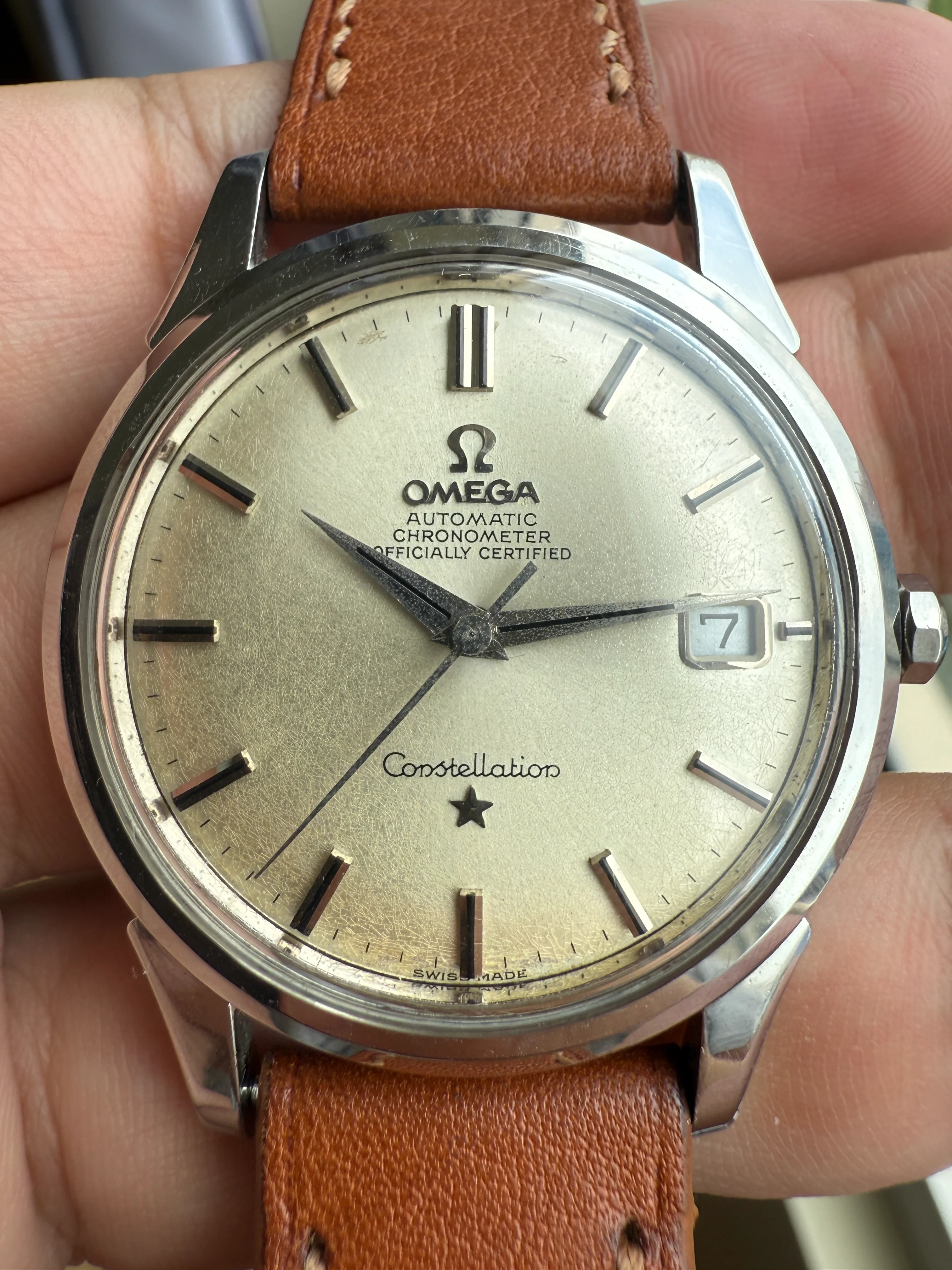 A very nice stainless steel Omega Constellation 168.001, jumbo size 37mm, beautiful aged dial, handmade leather strap, original Omega buckle, serviced recently, shipping with insurance in EU included.