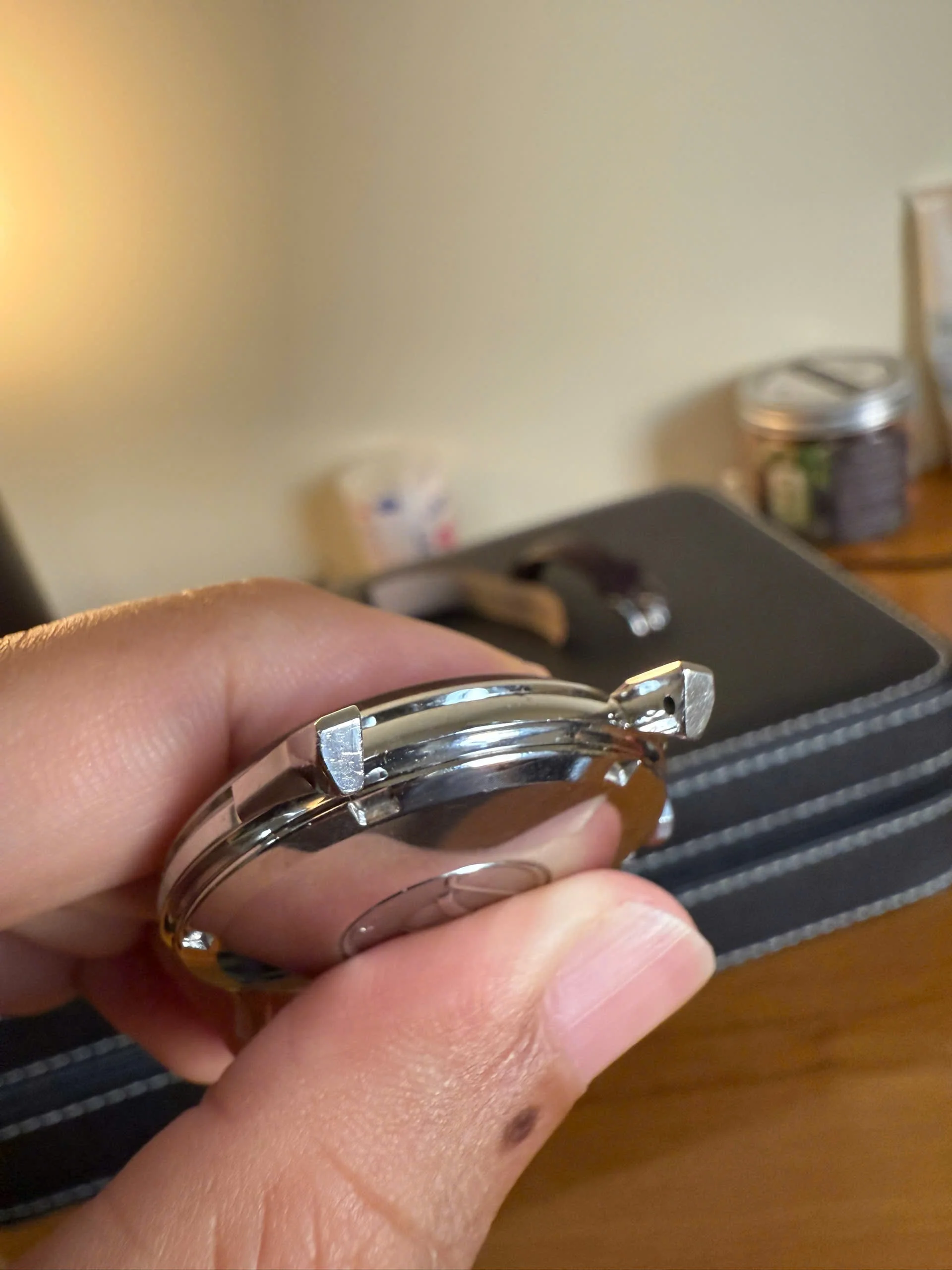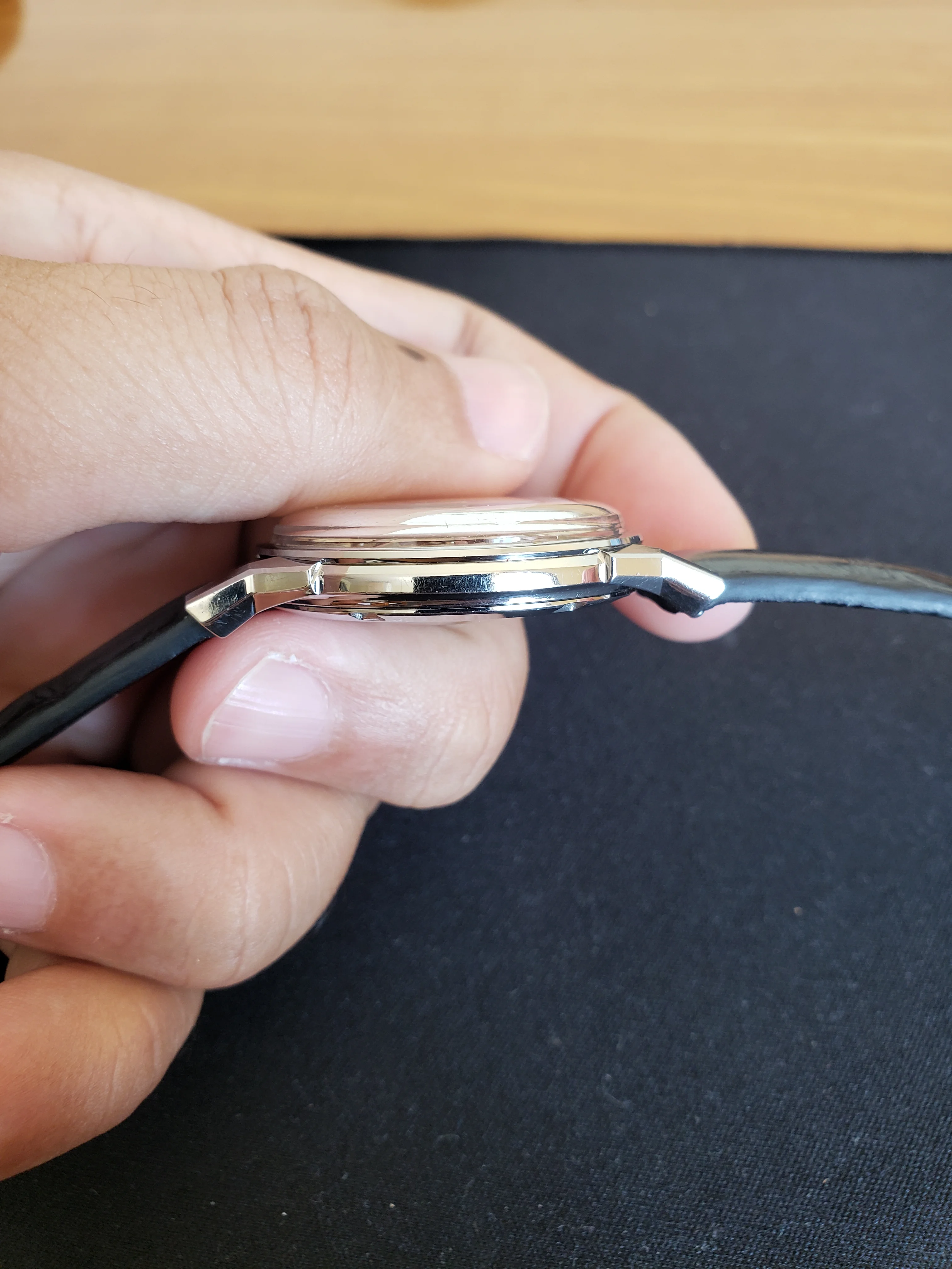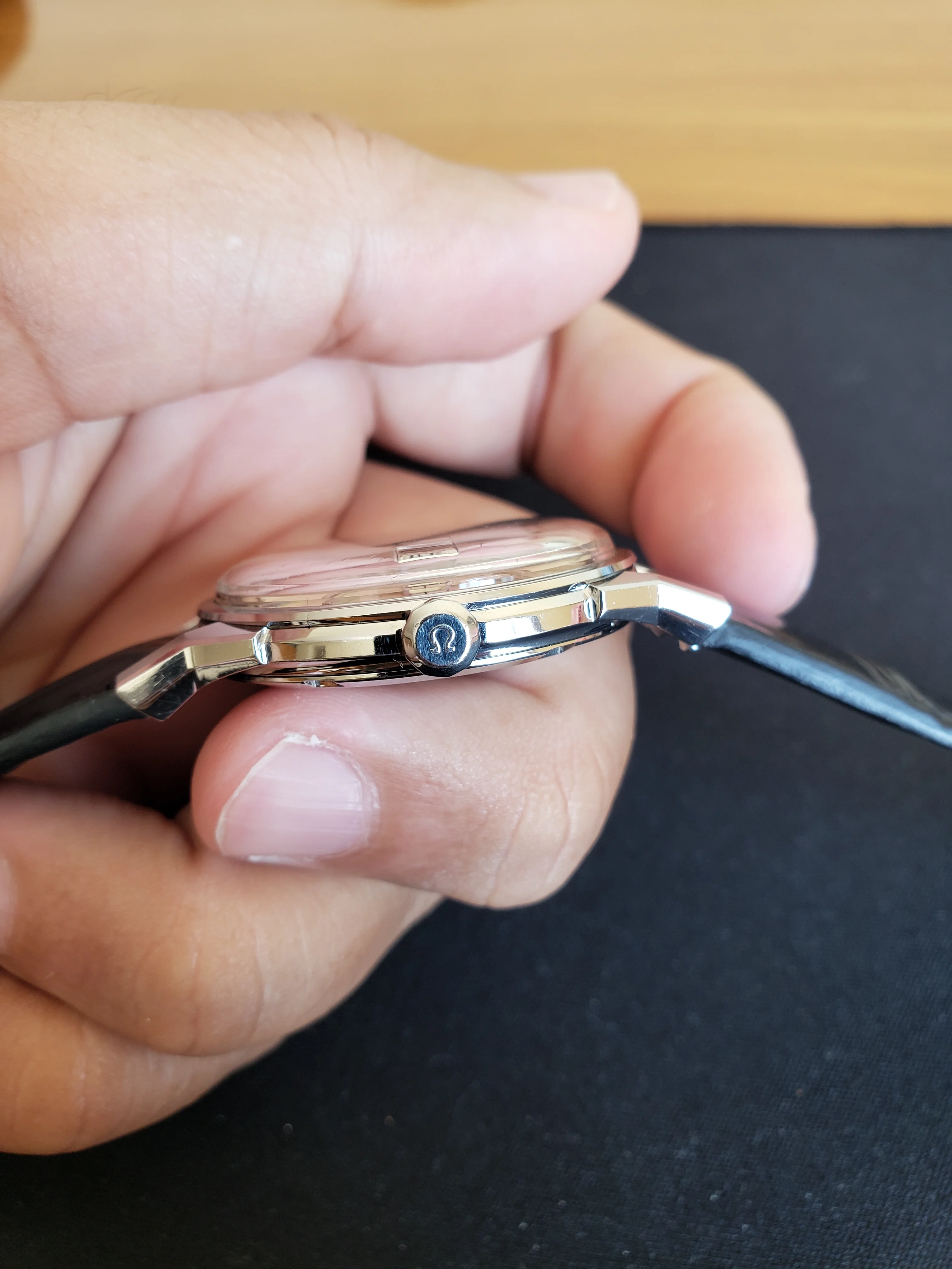 - Dial: Original white cross-hair sunburst dial, slightly domed, there are spots on the dial that can be seen in the photos below. Applied Omega logo as well as an faceted date-aperture frame; solid facet hour markers; dauphine hands (hands may be polished before IMO); no lume, no onyx or black paint on hands and hour markers; prints, hands, hour markers are all good.