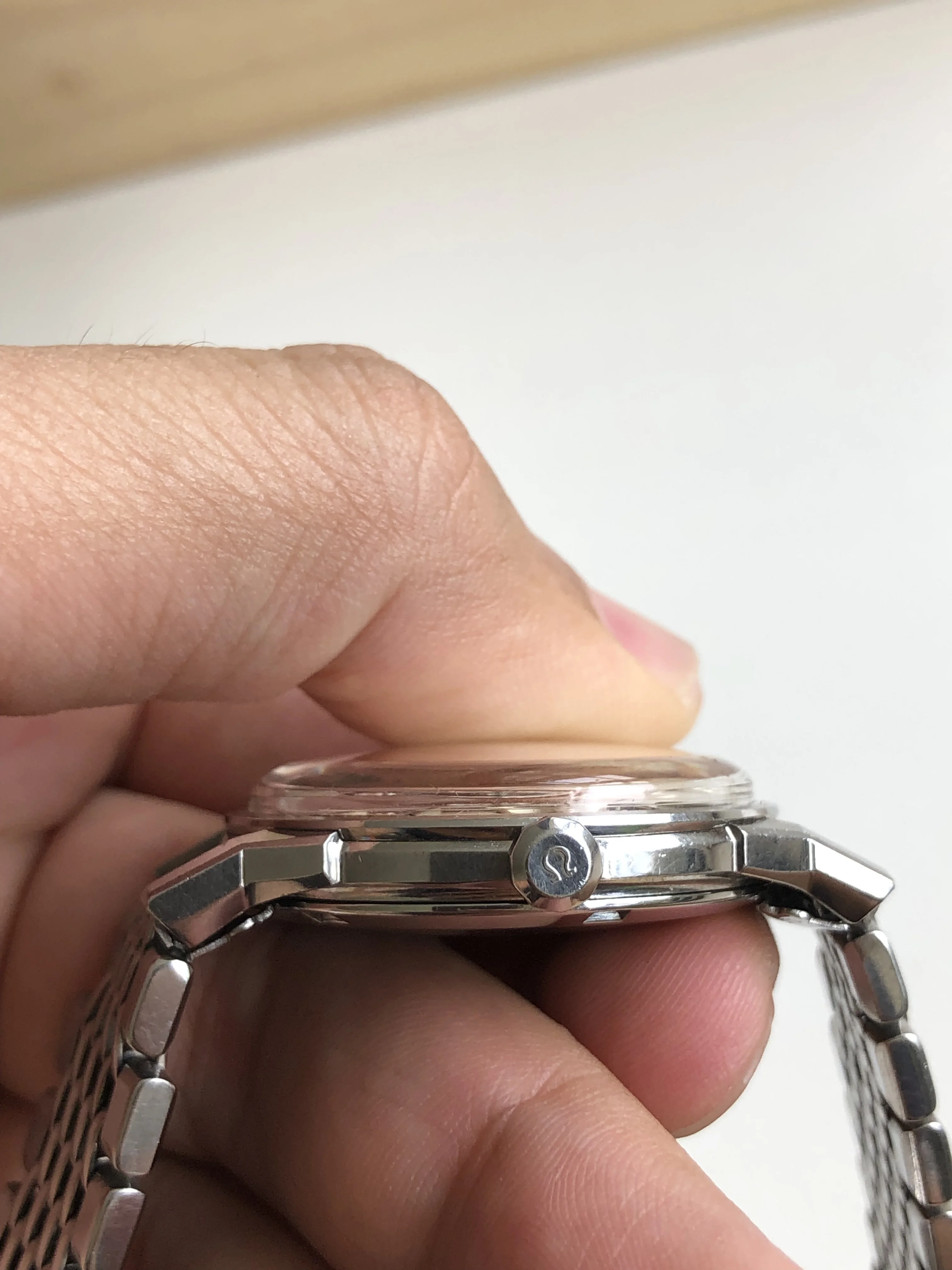 - Case: The diameter is 34.5mm without the crown. Original case in good condition with hairline scratches. Original thin Omega ten-sides crown.