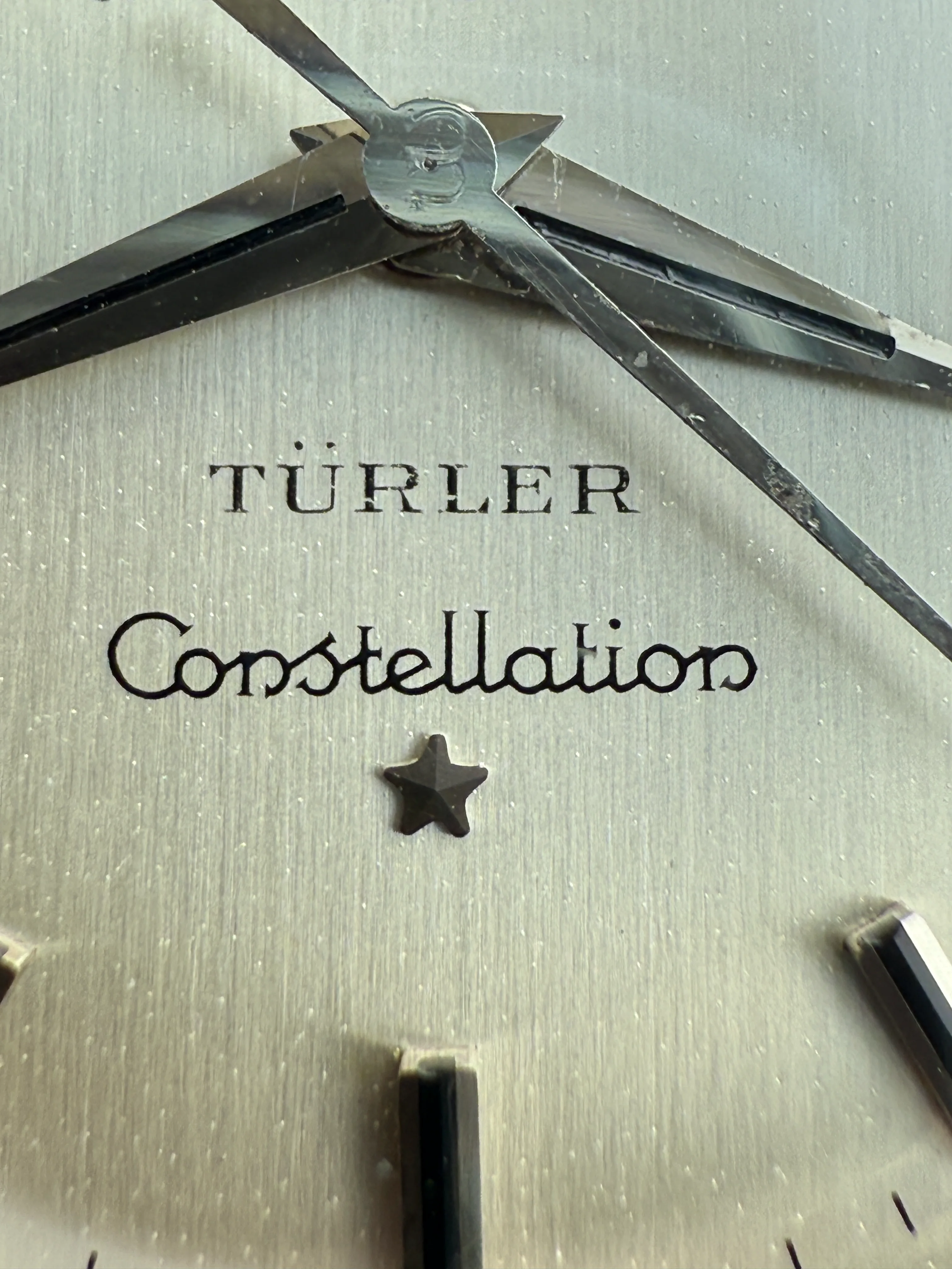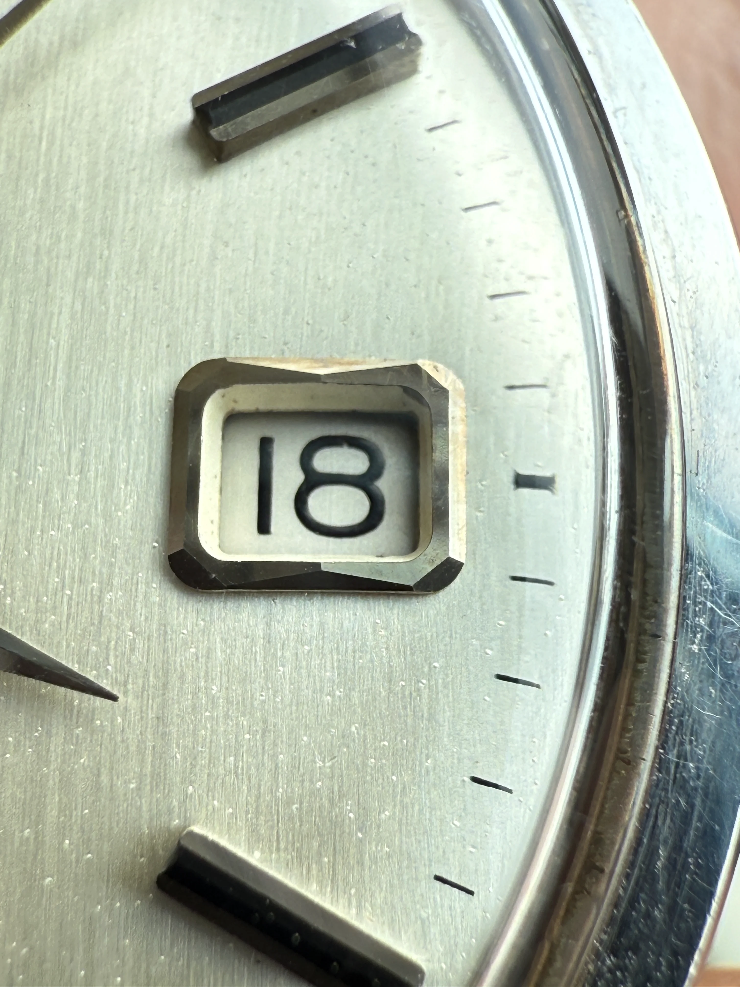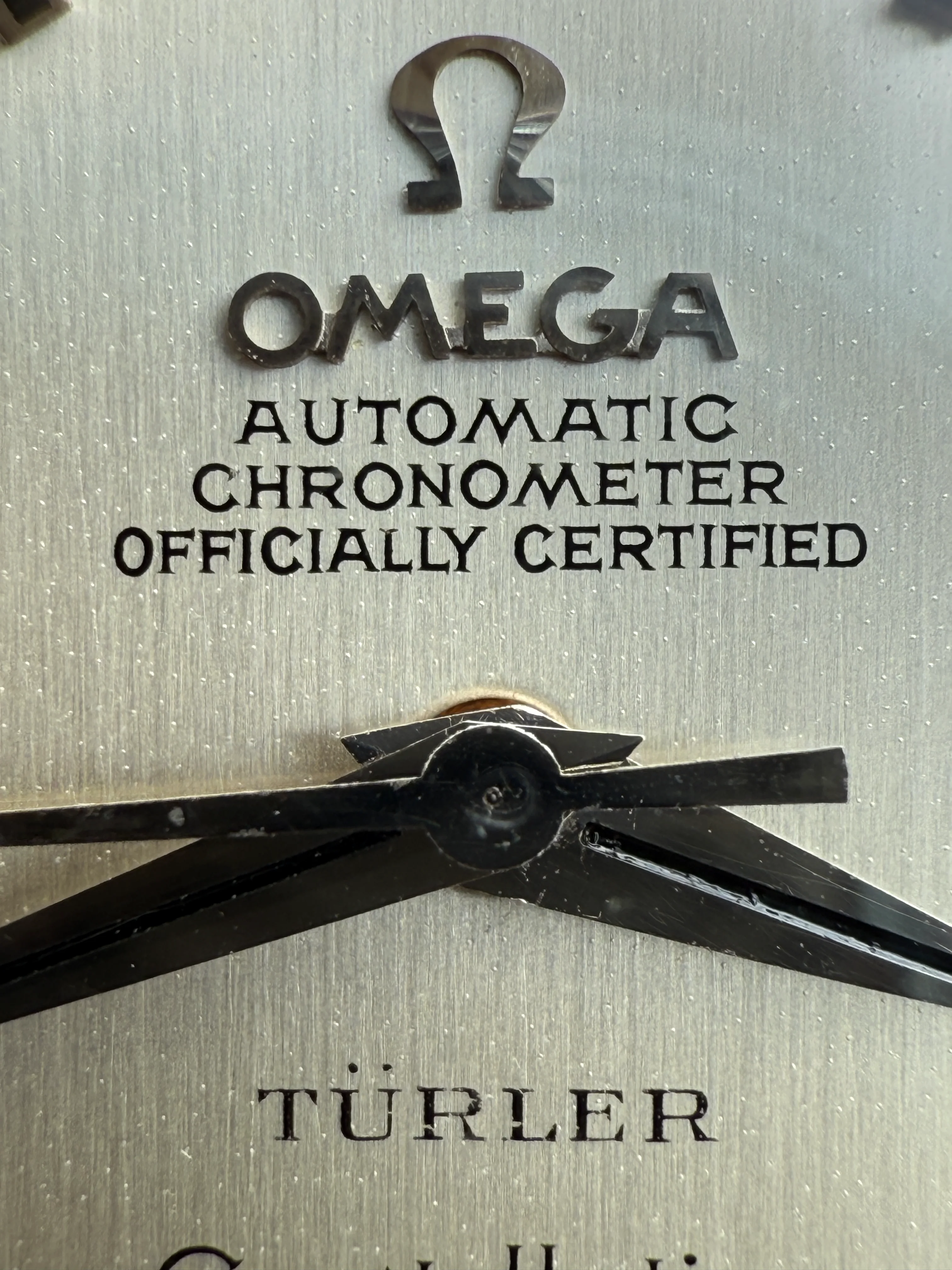 - Dial: Original white vertical brushed dial in very good condition, no damage of any kind, slightly domed, double-stamped “Turler”. Applied Omega logo as well as an faceted date-aperture frame; onyx inserted hour markers; dauphine hands; prints, hands, hour markers are all very good.