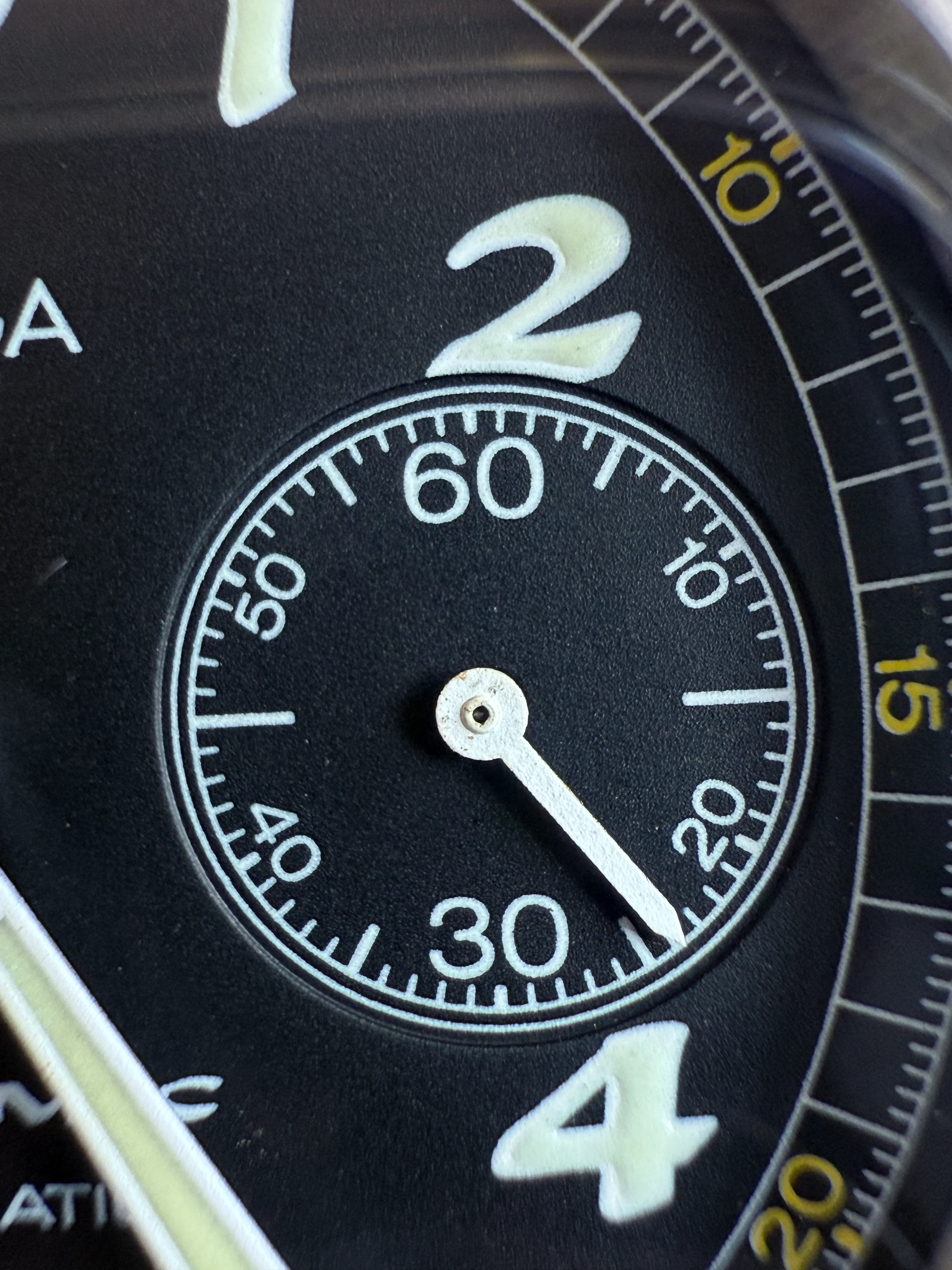 - Dial: Original matte black dial in great condition. Yellow chronograph hands, white hour, minute and second hands; two sub-dials at 3 and 9; large luminous Arabic numerals as hour markers; prints, hands, hour markers and lume are all good and functioning. One of the most beautiful dial IMO.