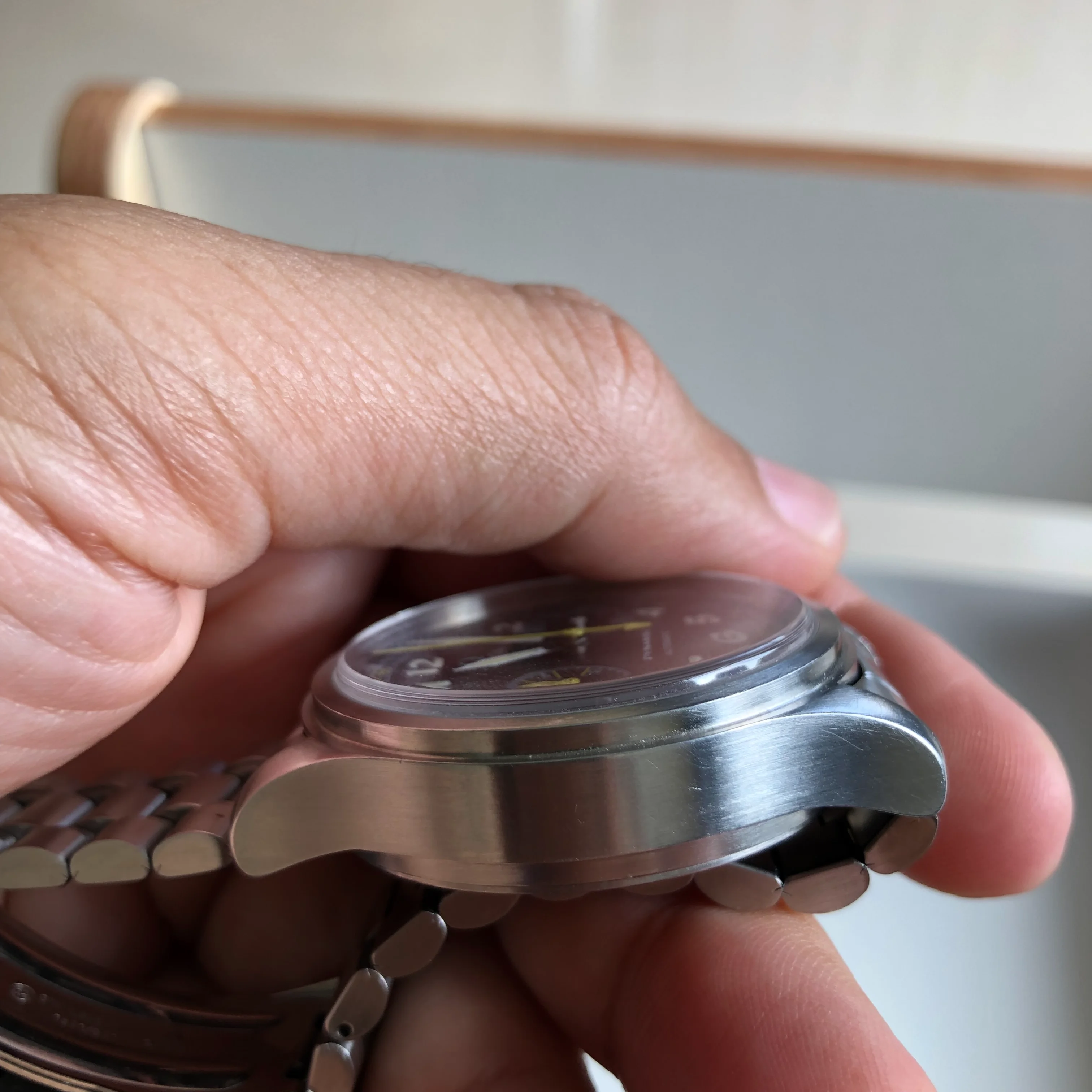 - Case: The diameter is 38mm without the crown. Original case with hairline scratches. Original big screw down crown and two pushers.